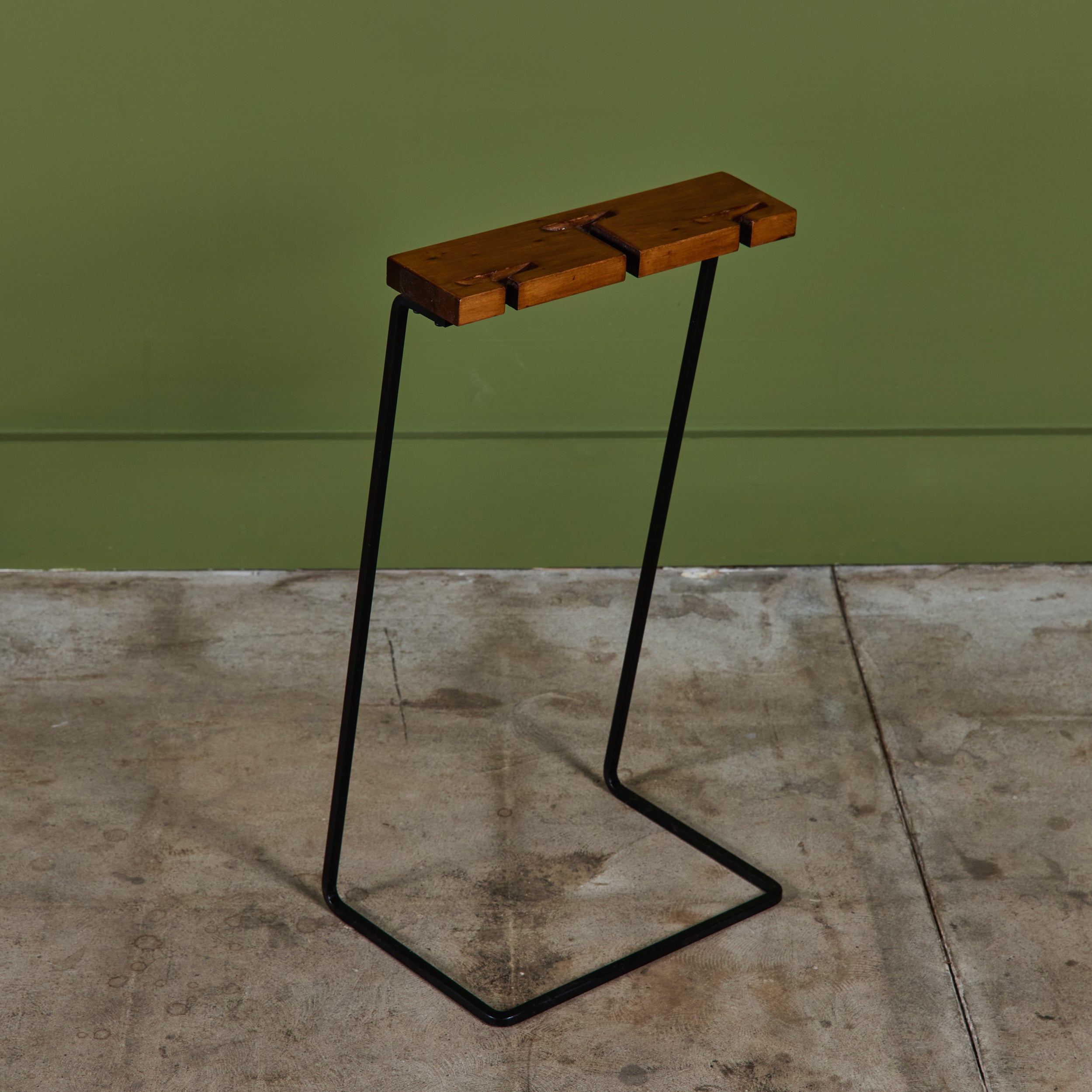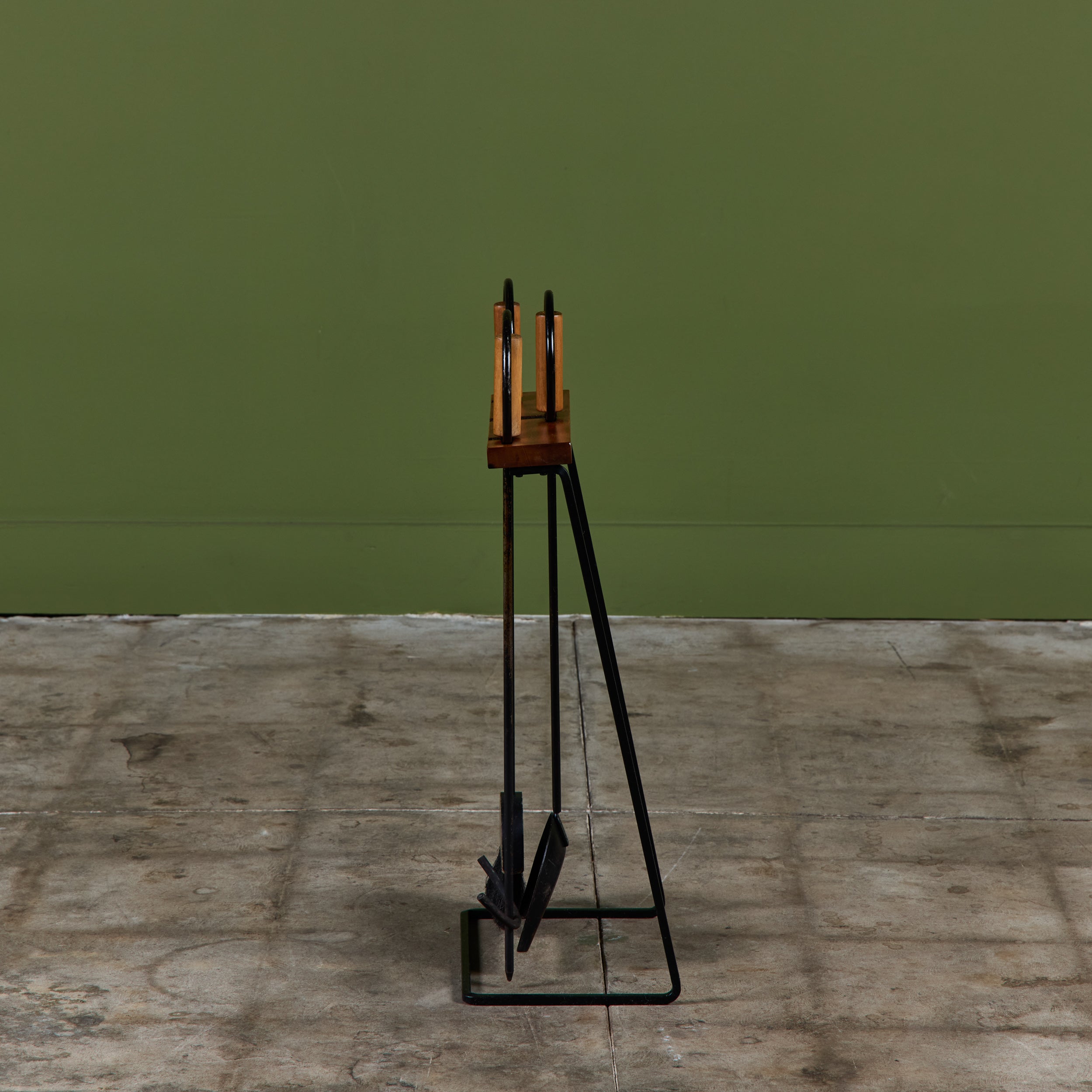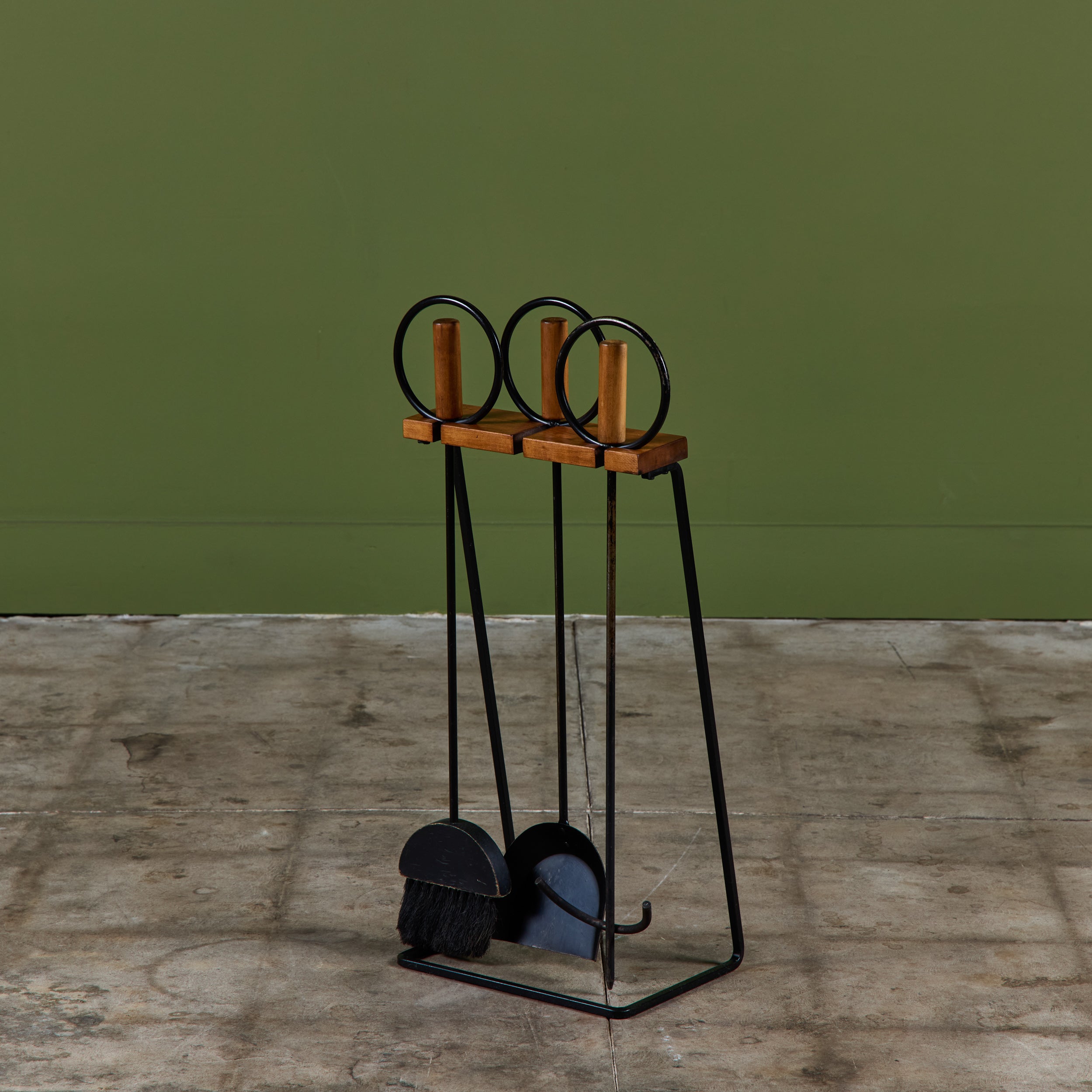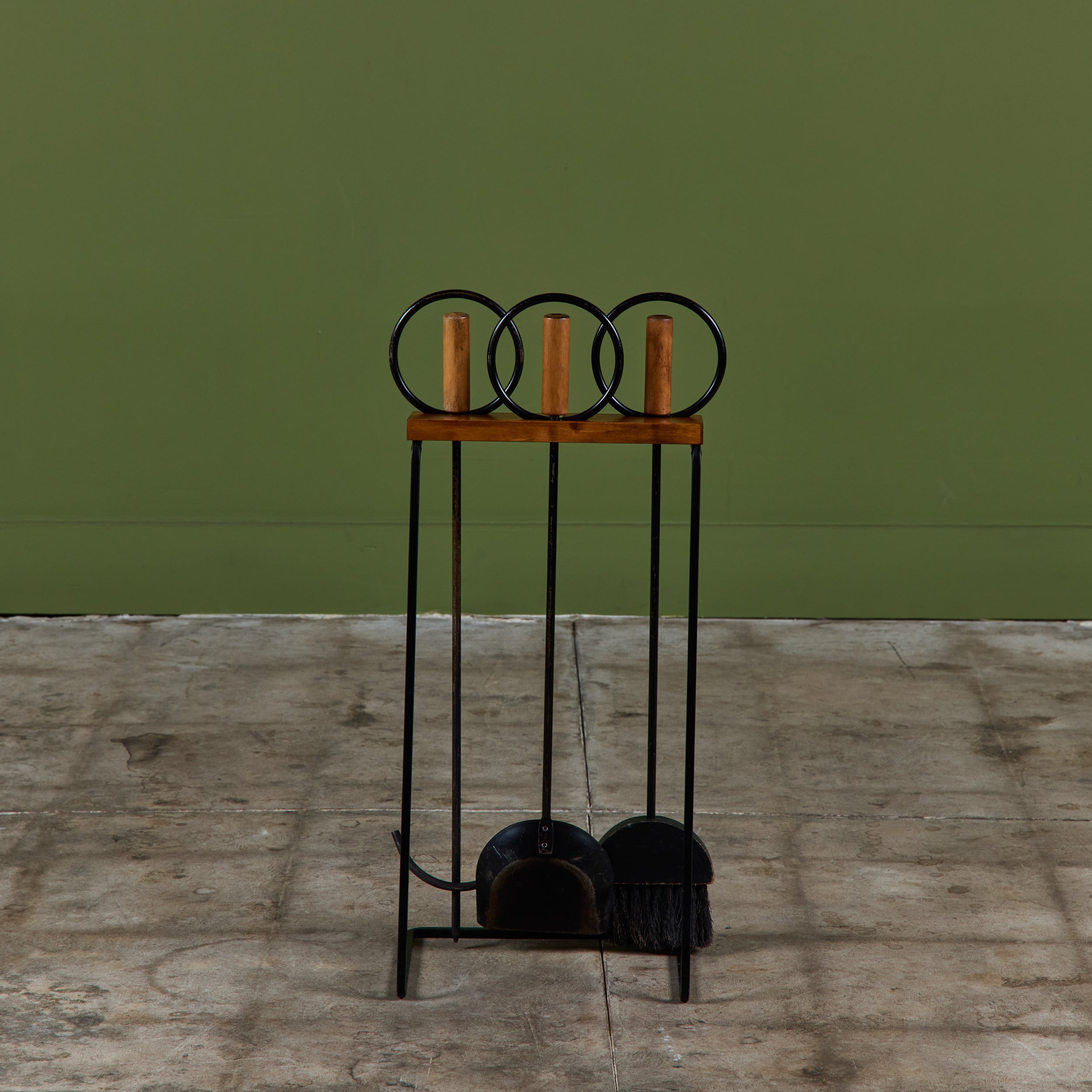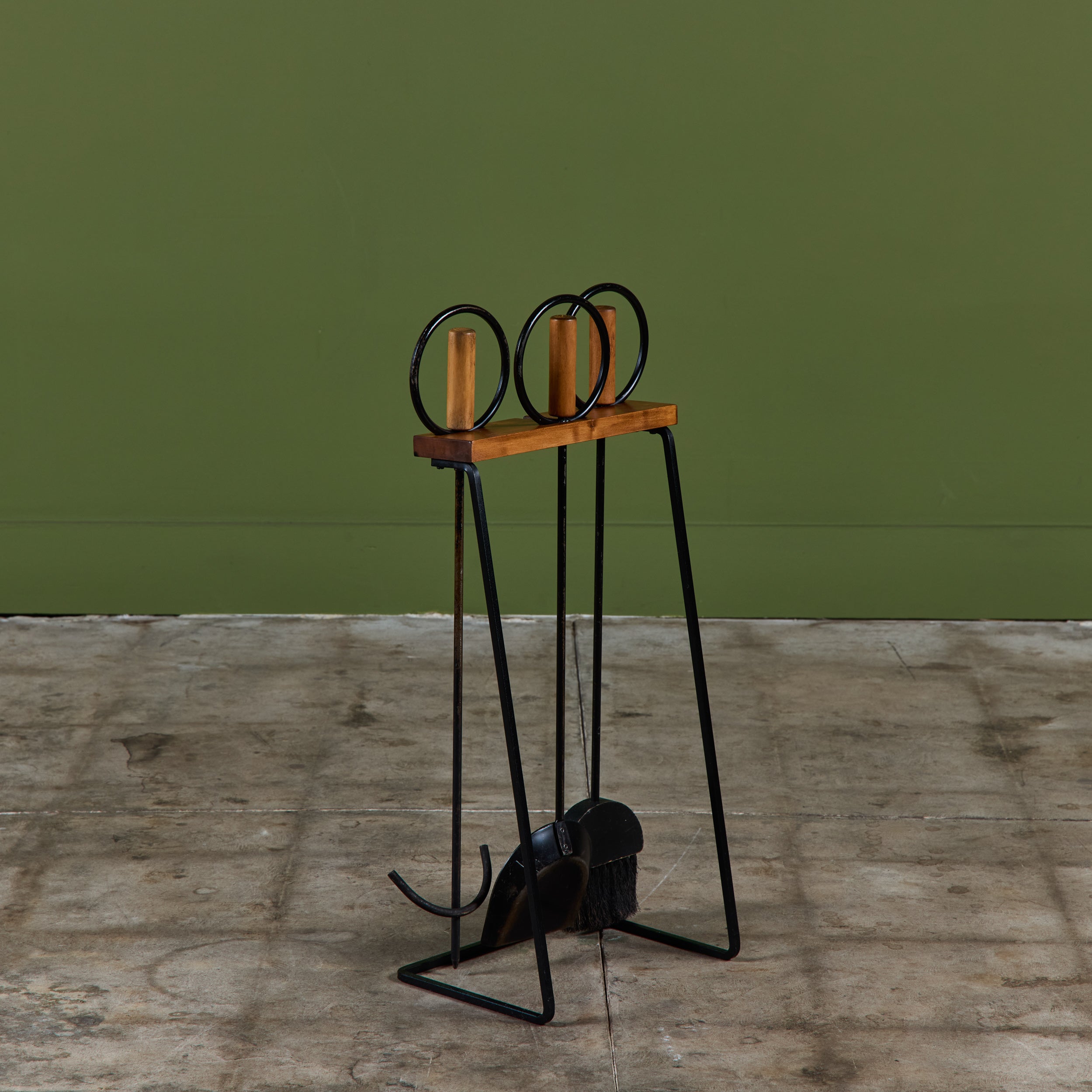 Three piece set of fireplace tools with stand. The set features three tools, a shovel, broom and poker. Each handle has a wood rod and circular wrought iron detail. All elements rest on a cantilever wood and iron stand.