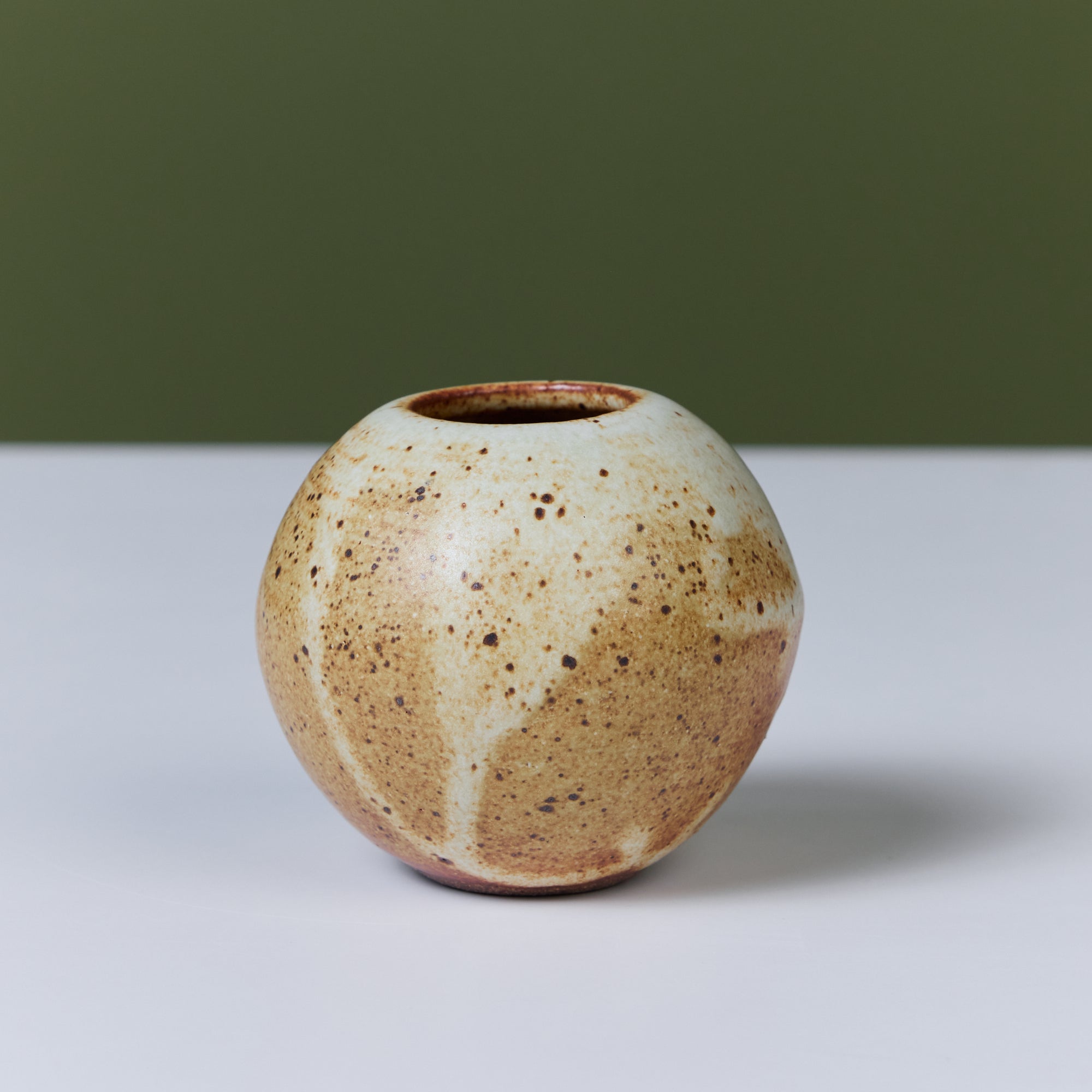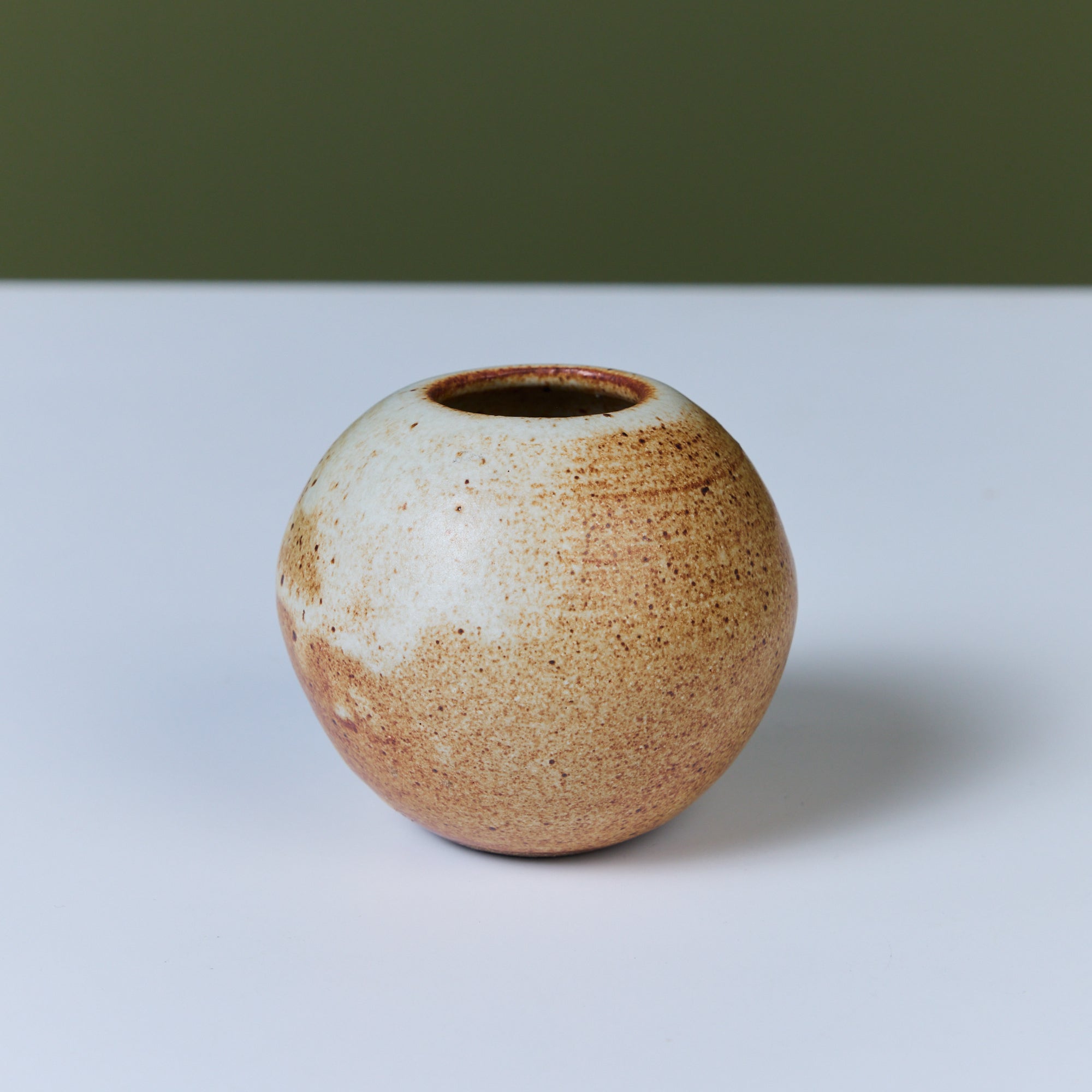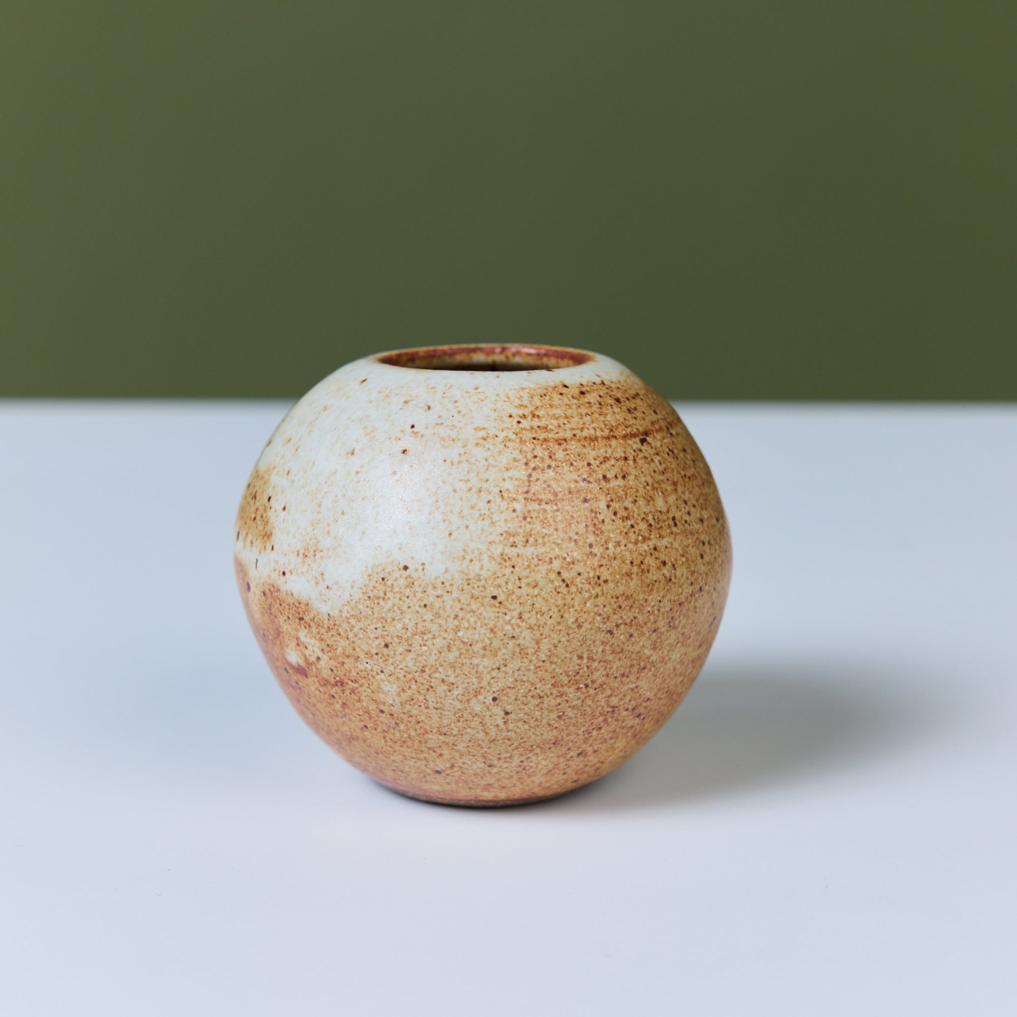 Round studio pottery vase emphasizes natural textures and minimalist form with a multi-tonal, speckled earth-tone glaze. It transitions from a creamy, matte white at the top to a warm, sandy tan base. The dark iron spotting (speckles) is likely a result of the clay body's mineral content reacting with the heat of the kiln.