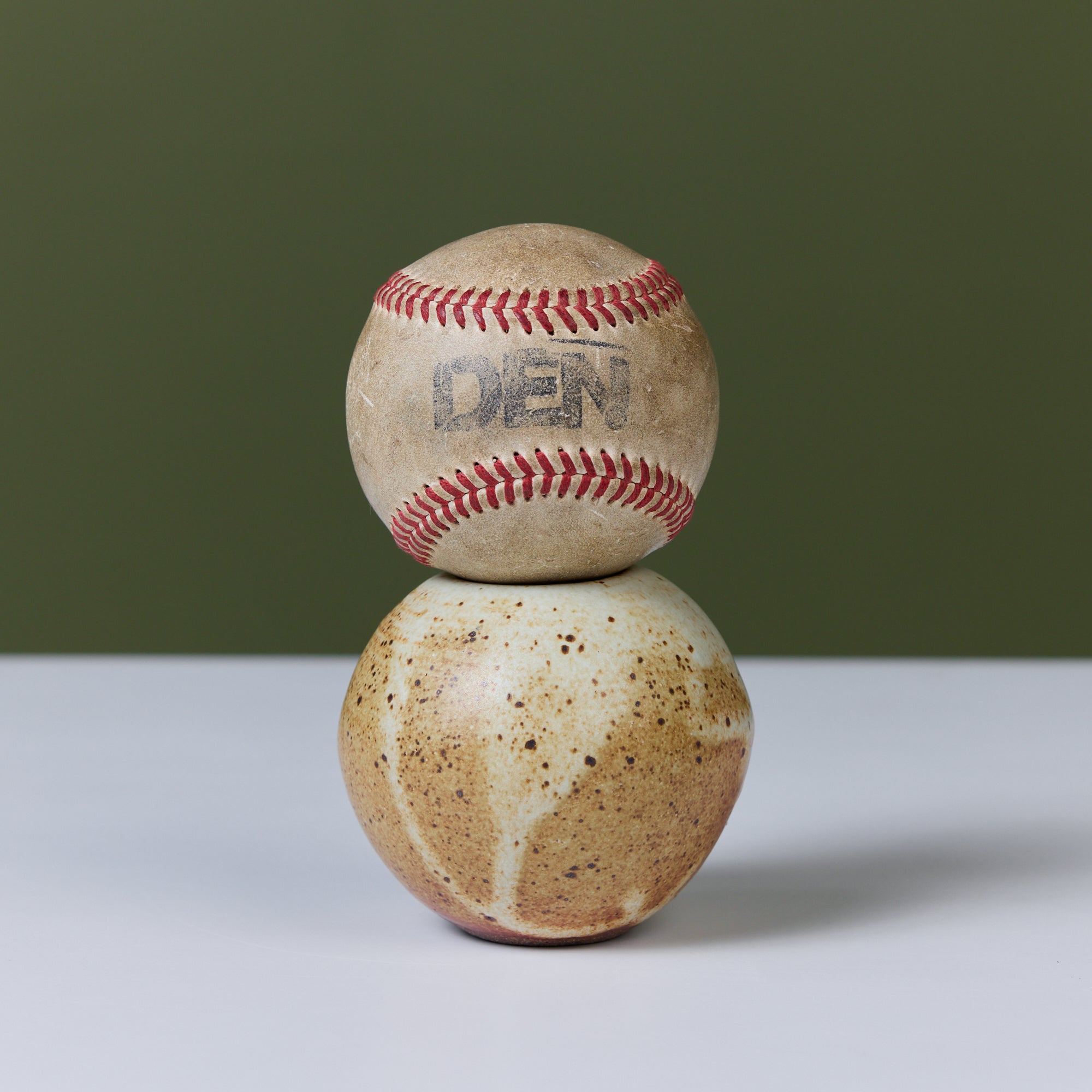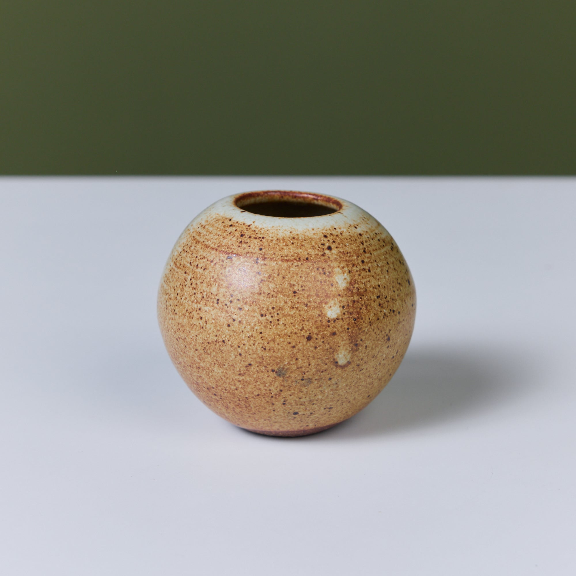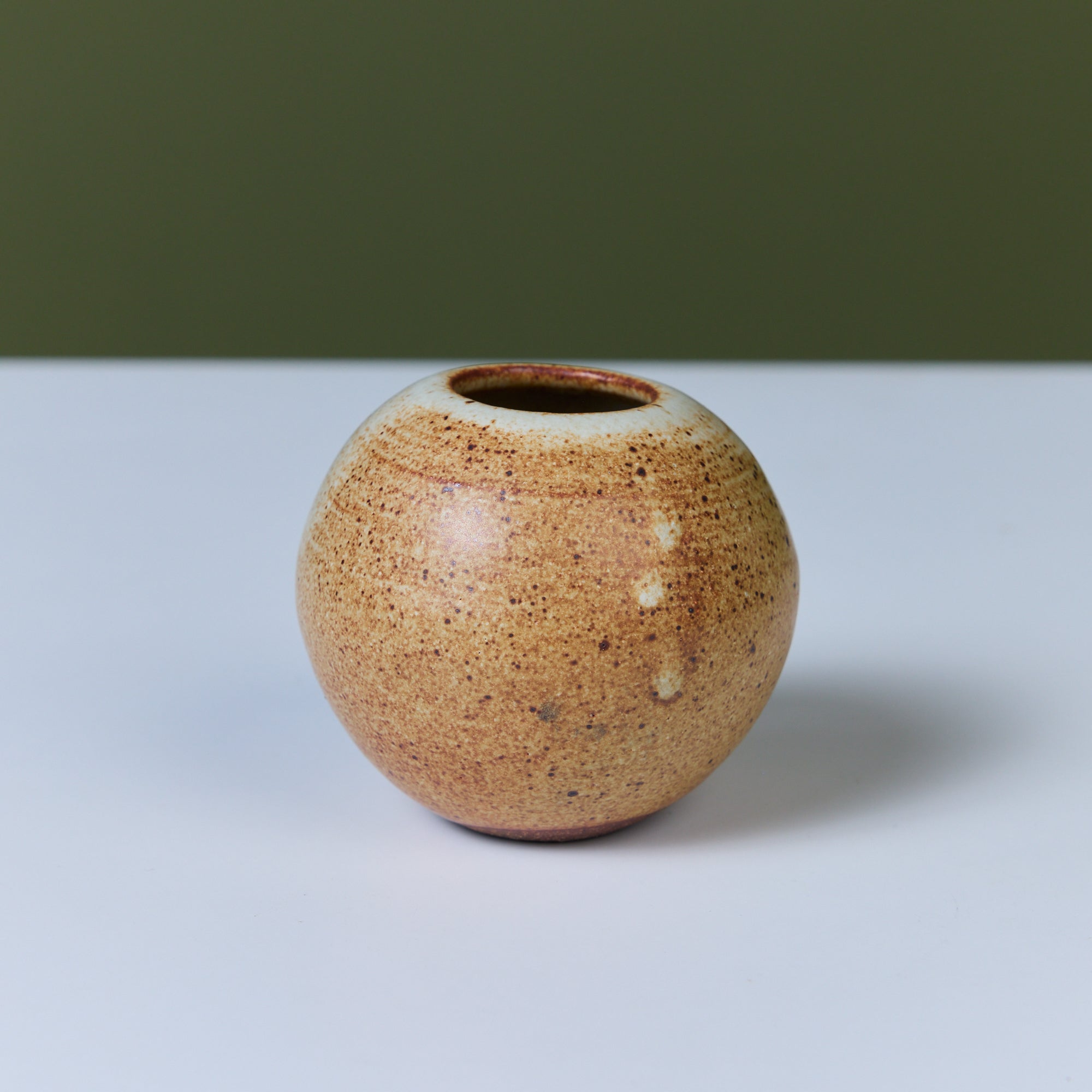 Round studio pottery vase emphasizes natural textures and minimalist form with a multi-tonal, speckled earth-tone glaze. It transitions from a creamy, matte white at the top to a warm, sandy tan base. The dark iron spotting (speckles) is likely a result of the clay body's mineral content reacting with the heat of the kiln.