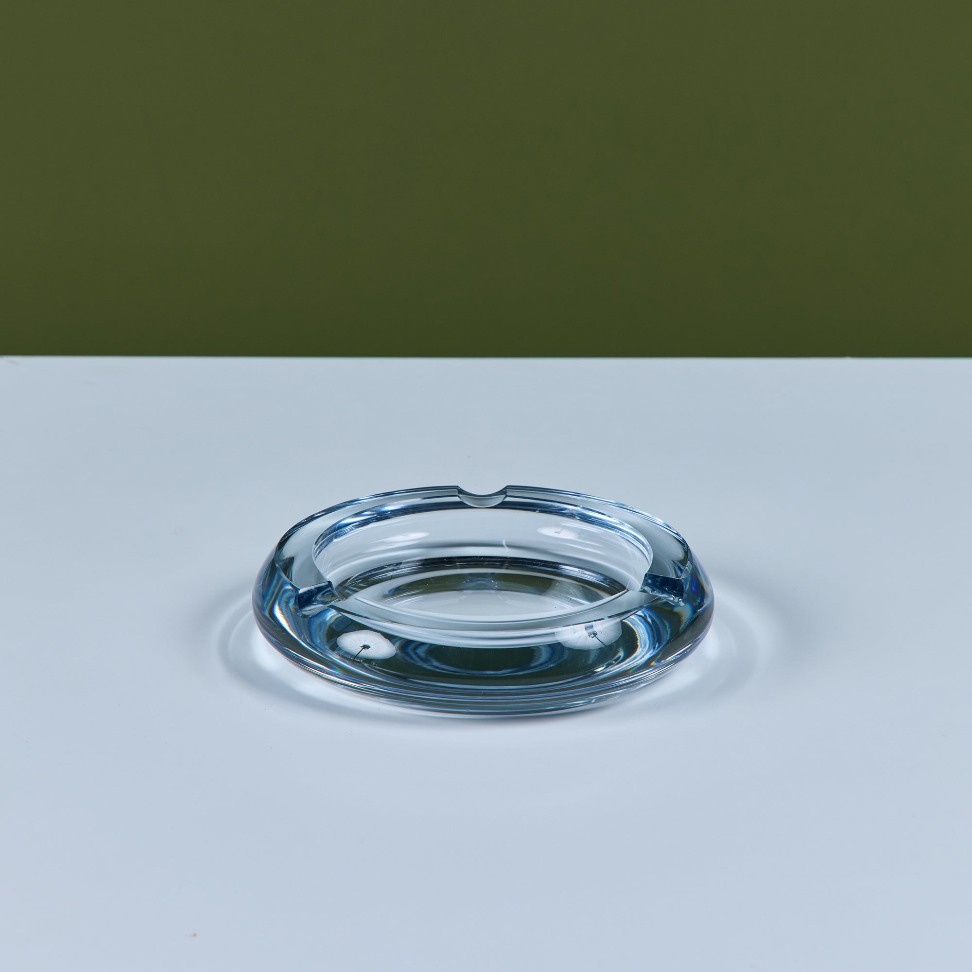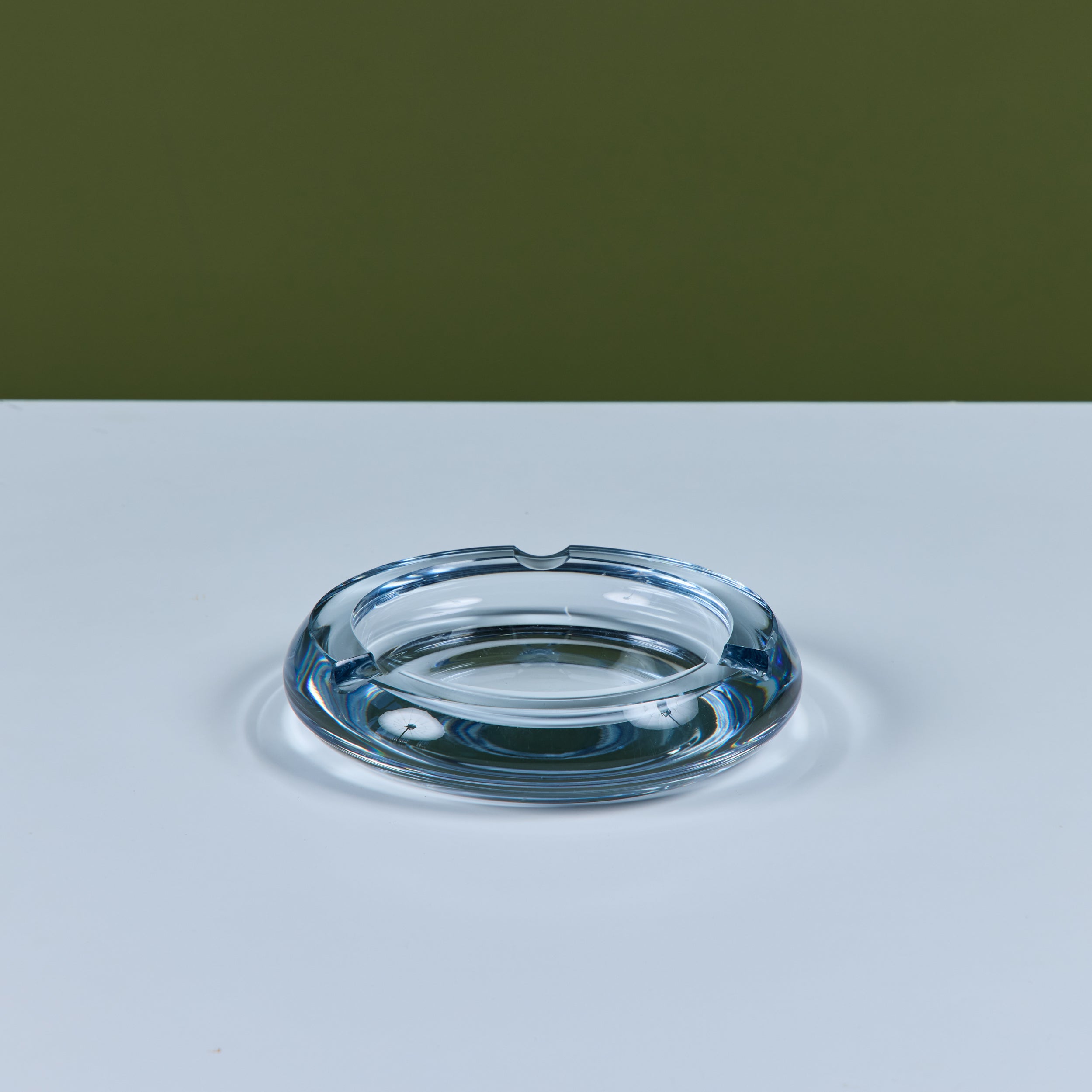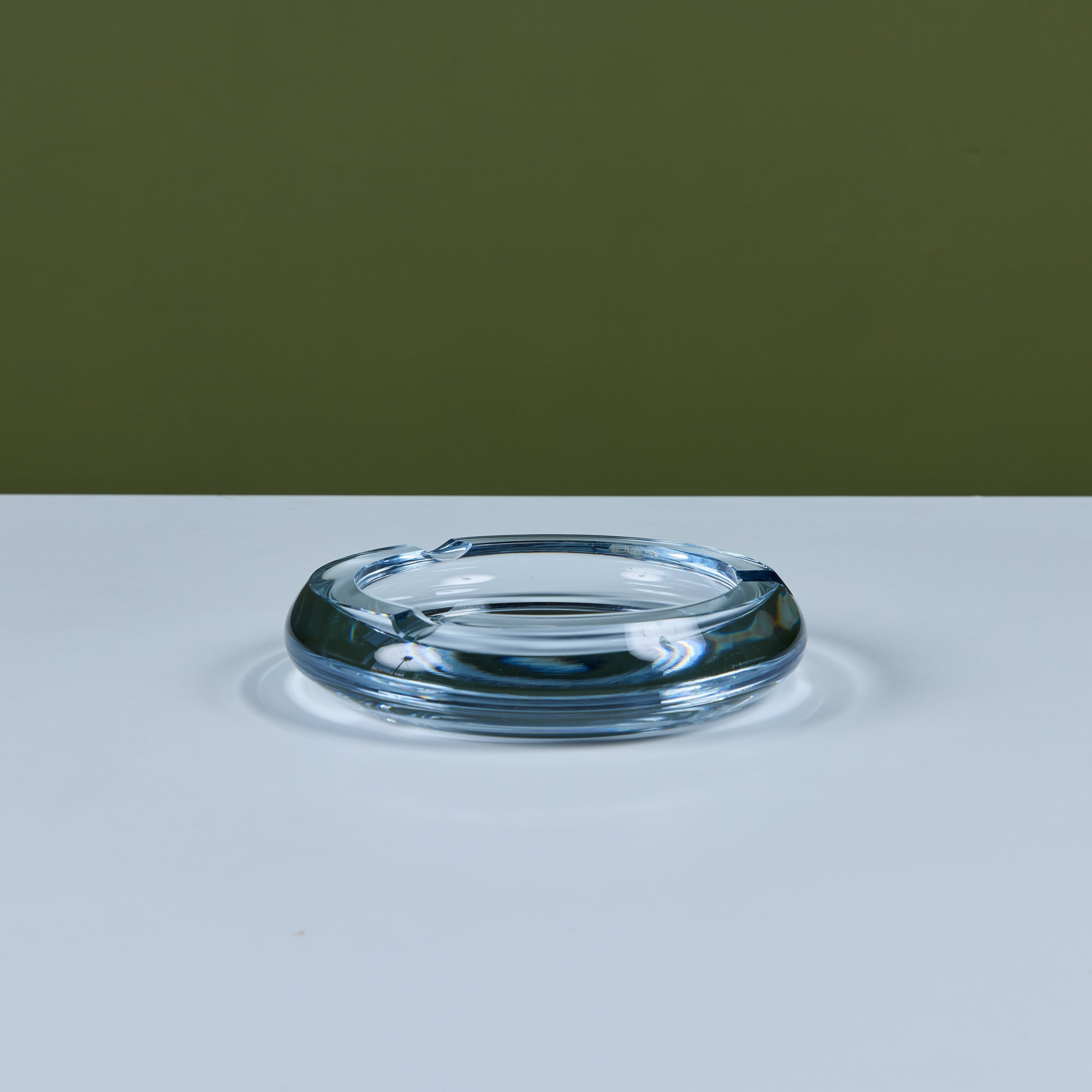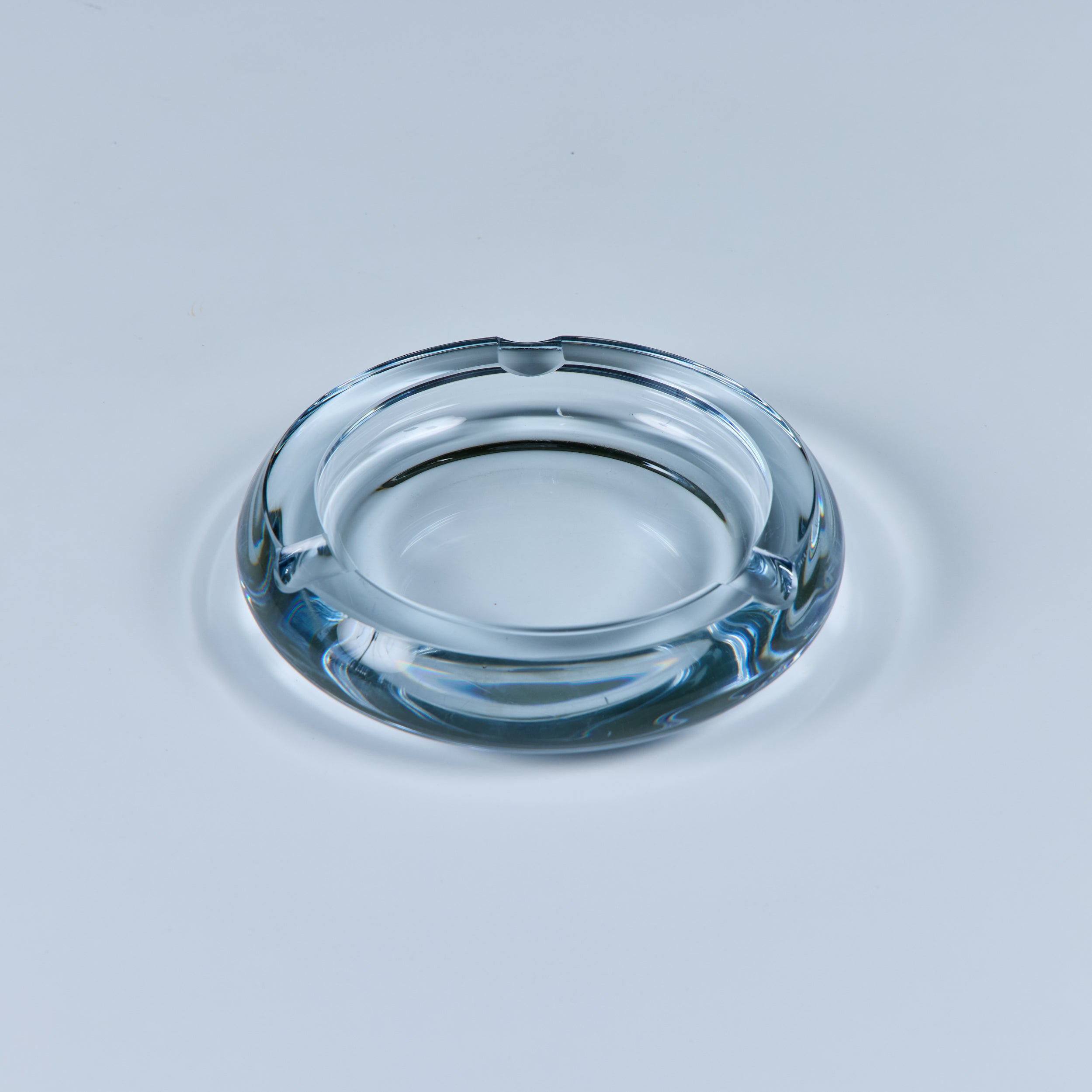 Glass ashtray by Swedish company Strömbergshyttan Glass, c.1960s. This piece, features a round clear thick glass with three notches and a deep well. Perfect for its intended use or as a minimalist catchall.