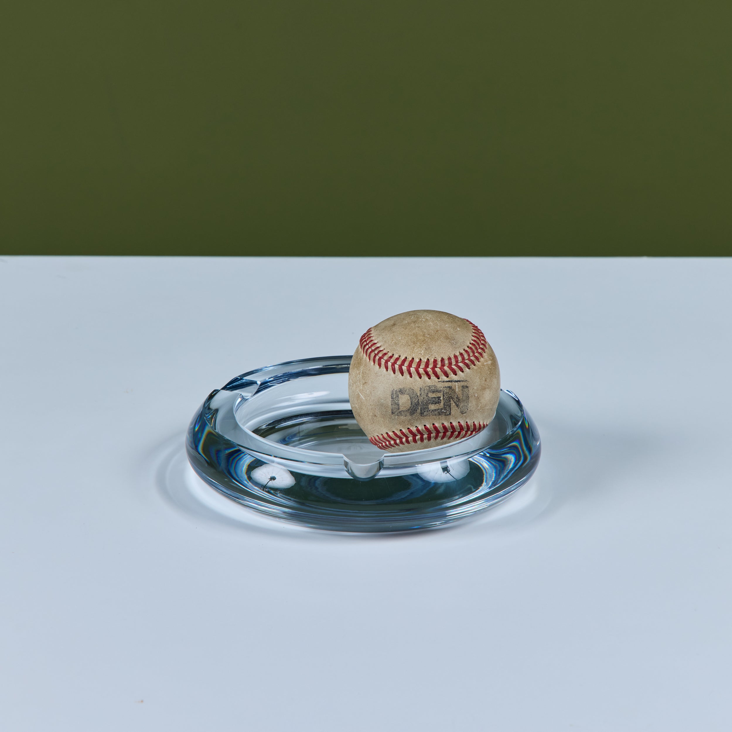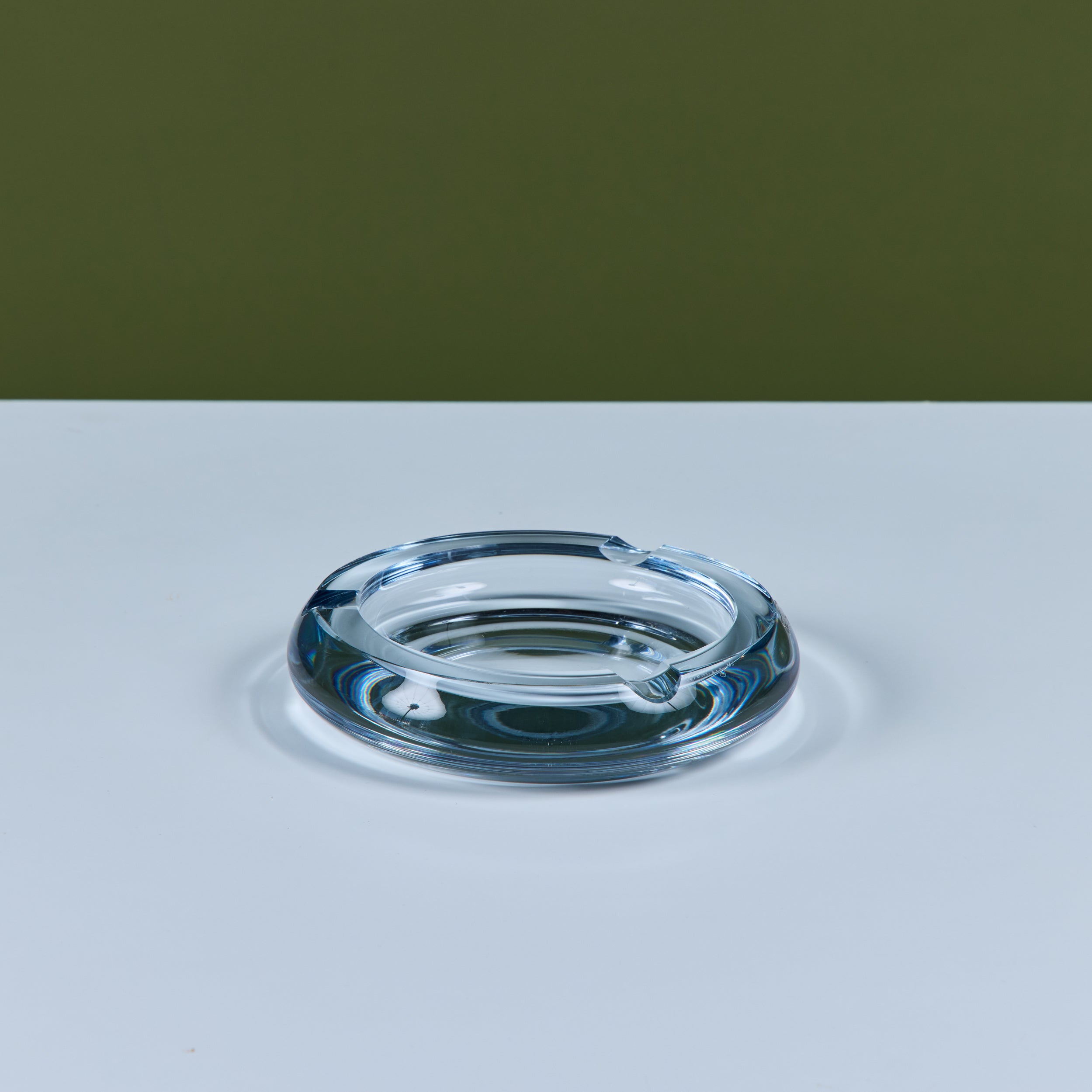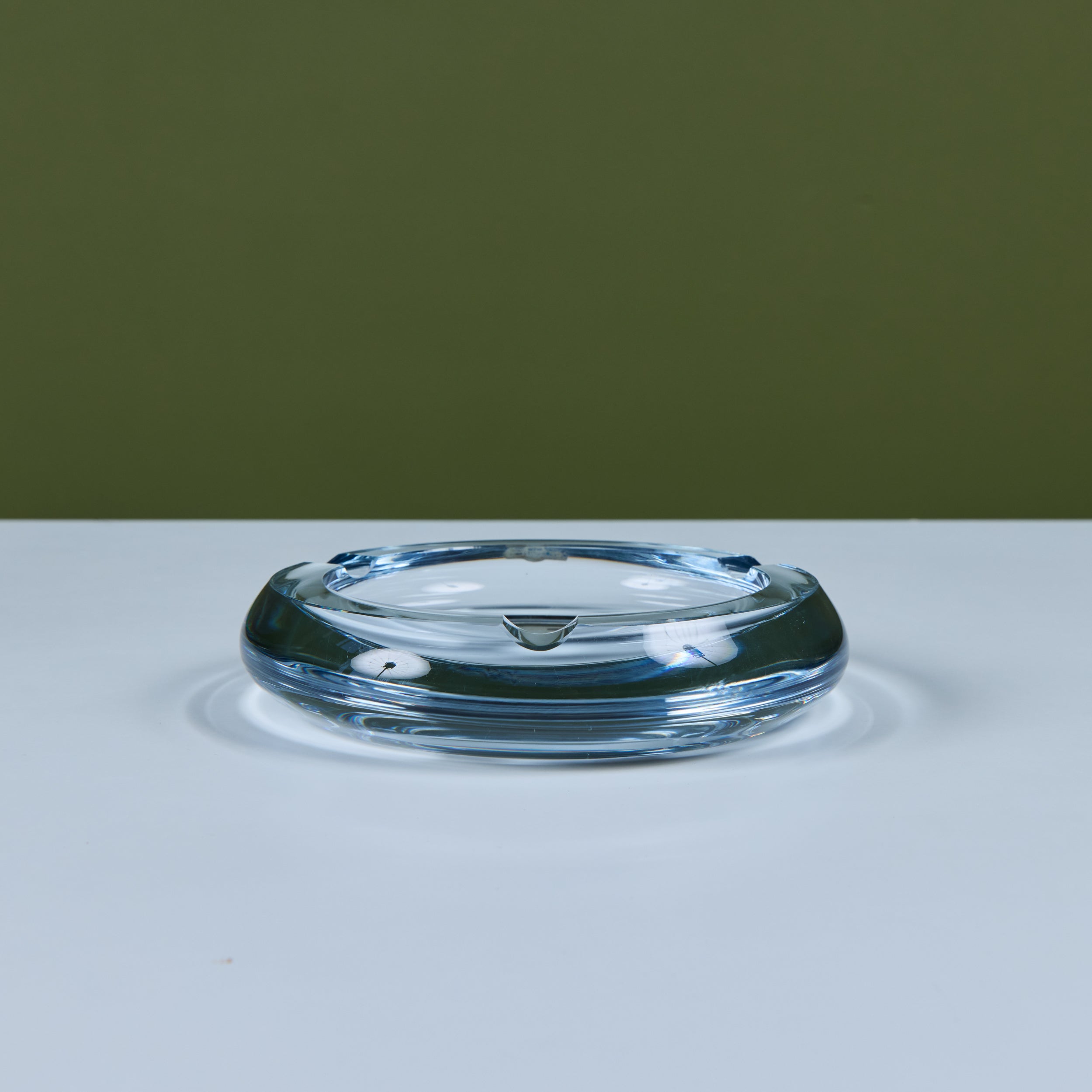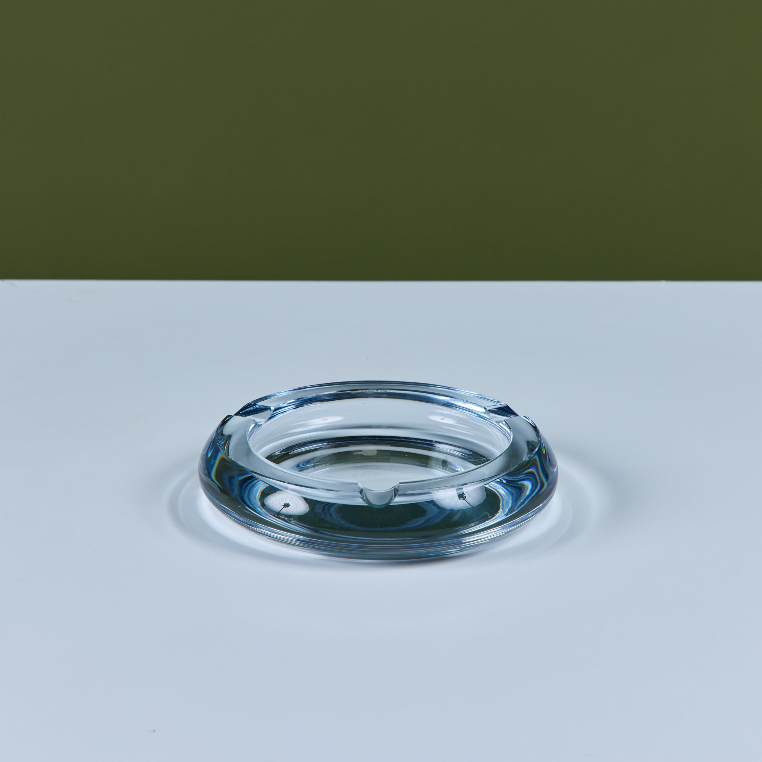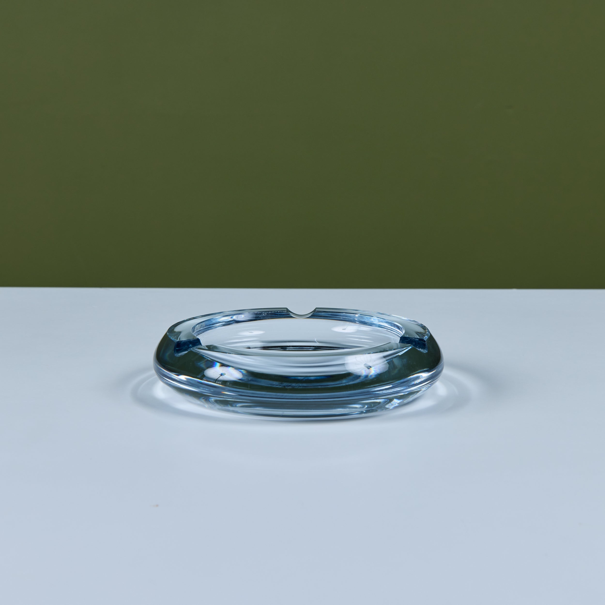 Glass ashtray by Swedish company Strömbergshyttan Glass, c.1960s. This piece, features a round clear thick glass with three notches and a deep well. Perfect for its intended use or as a minimalist catchall.
