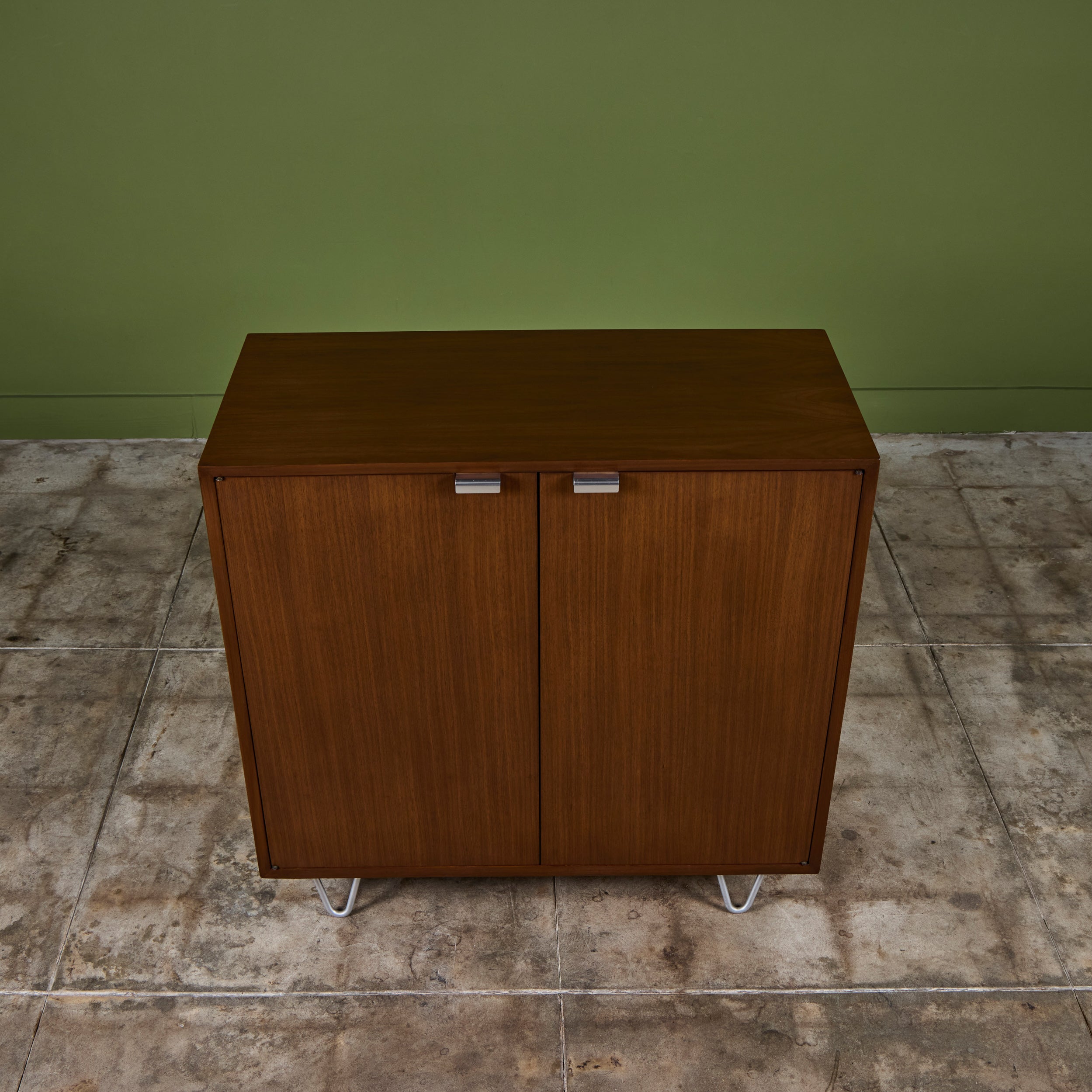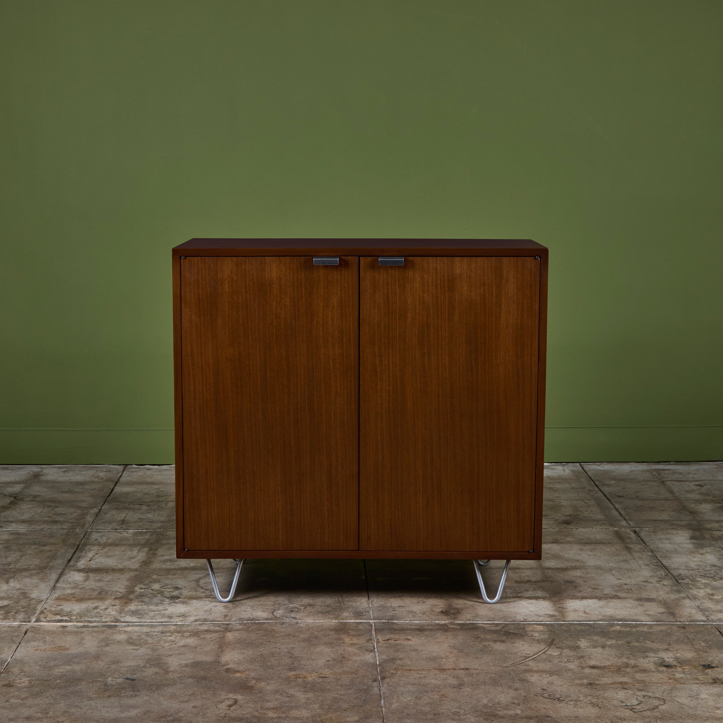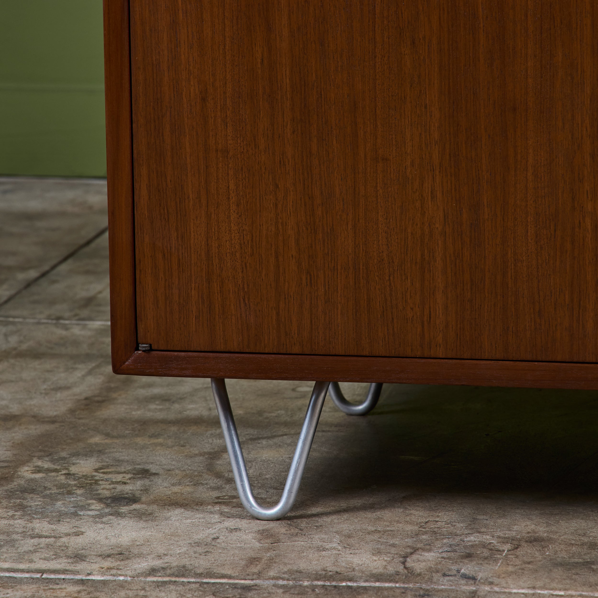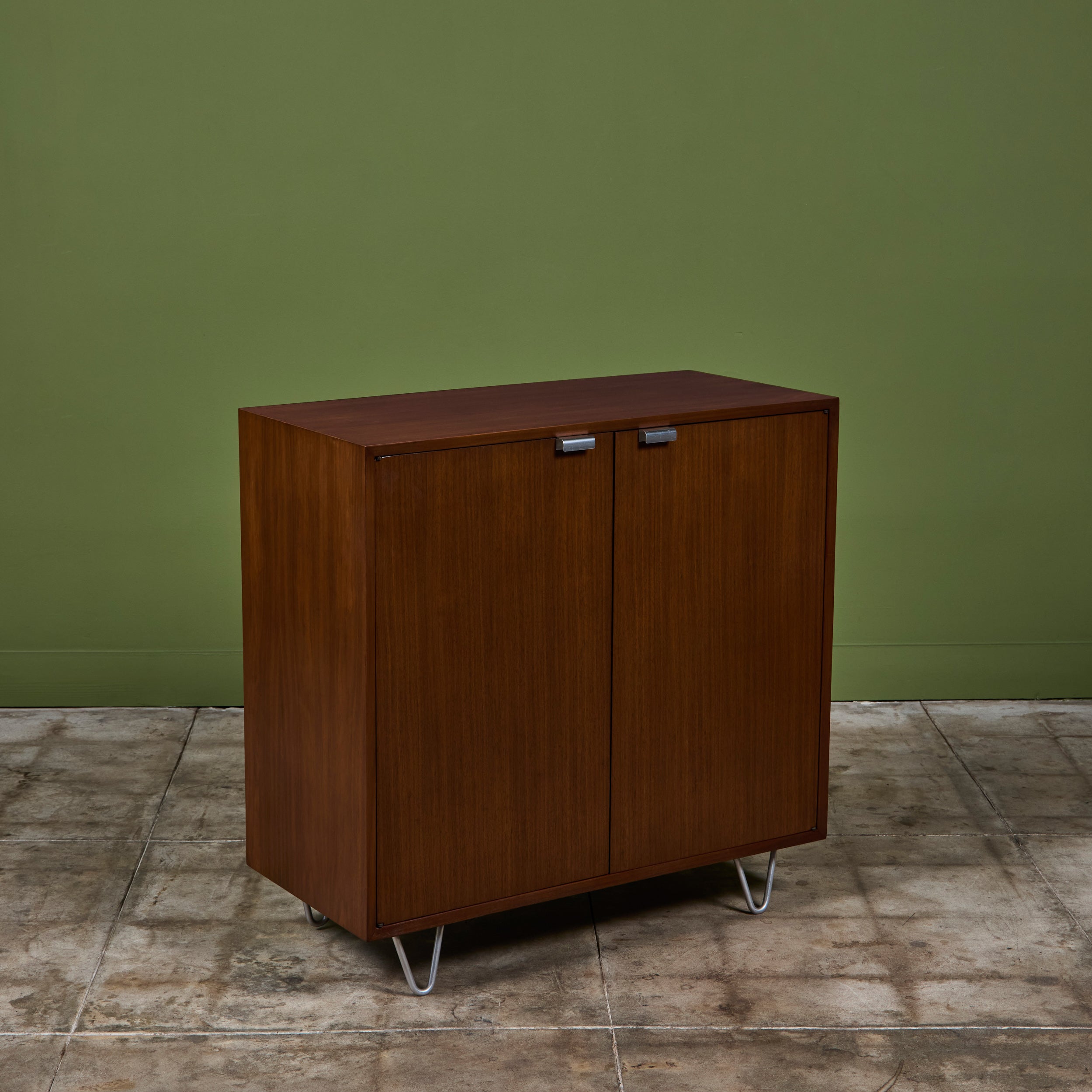 George Nelson BSC cabinet for Herman Miller, c.1950's, USA. The design features a two door walnut cabinet with interior shelves. Each cabinet door has a polished aluminum pull. The case sits atop four steel hairpin legs.