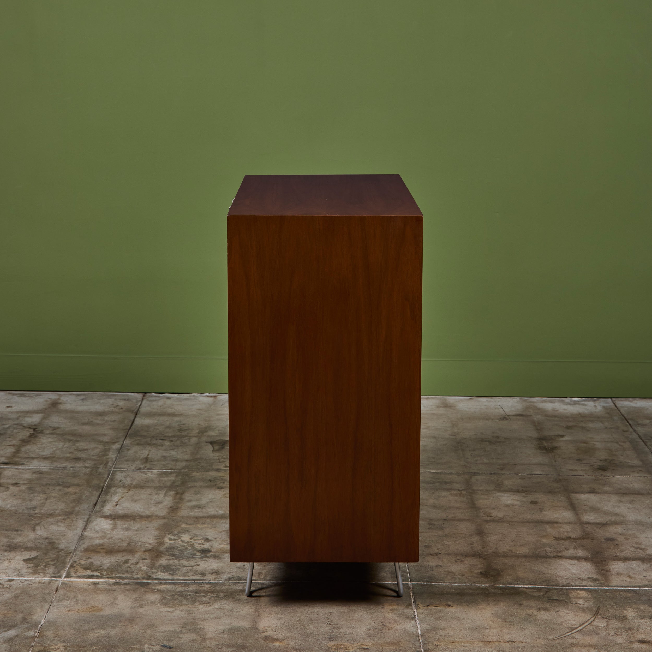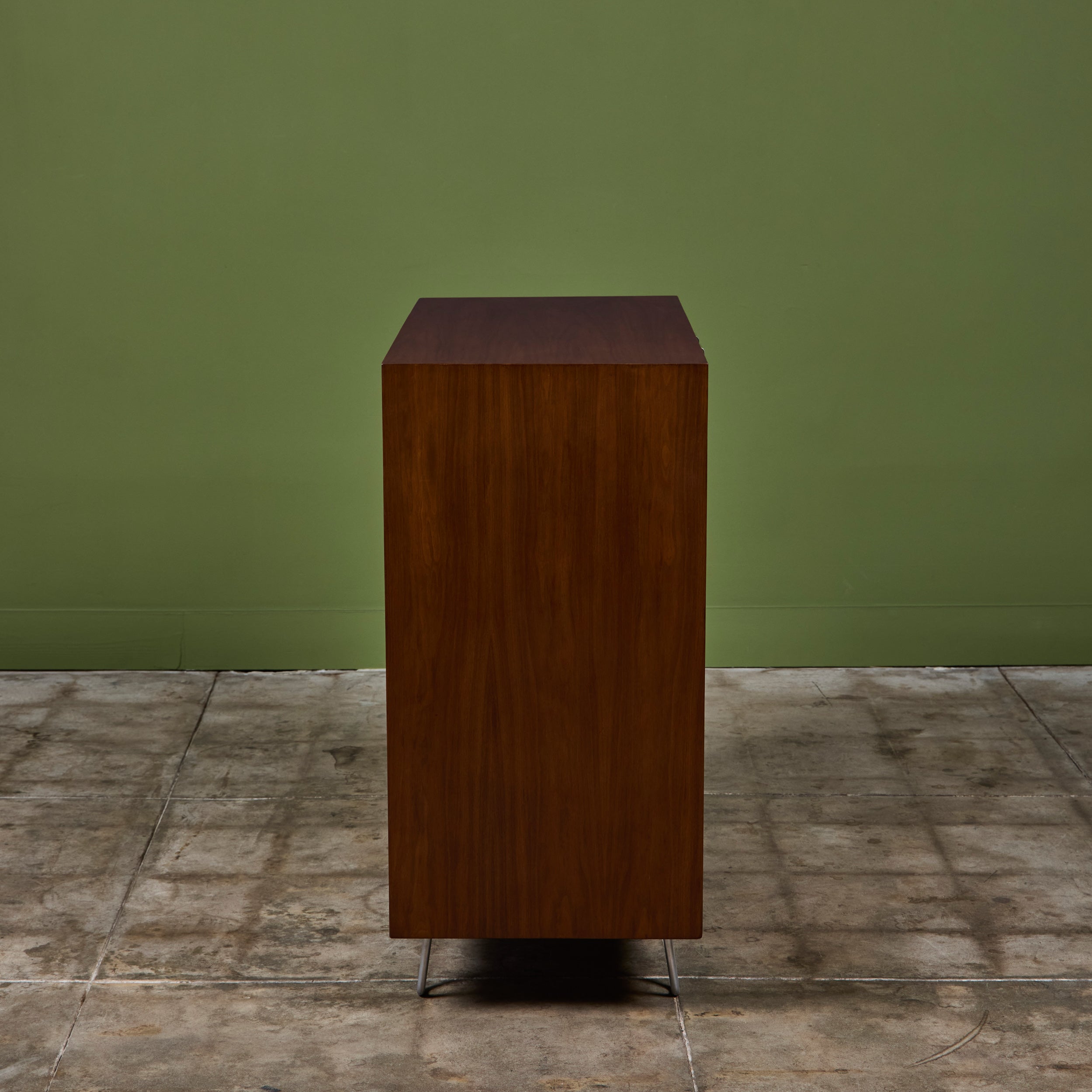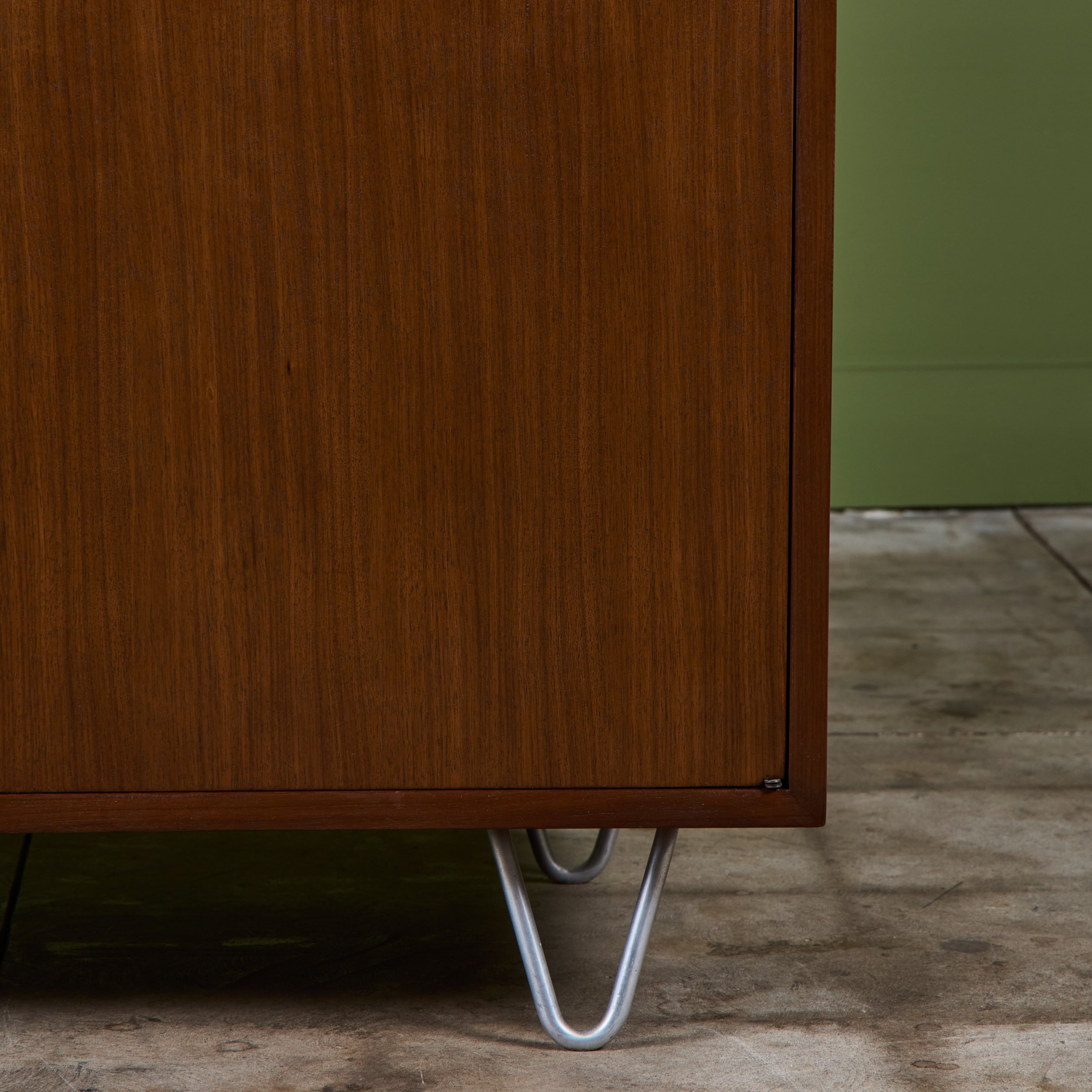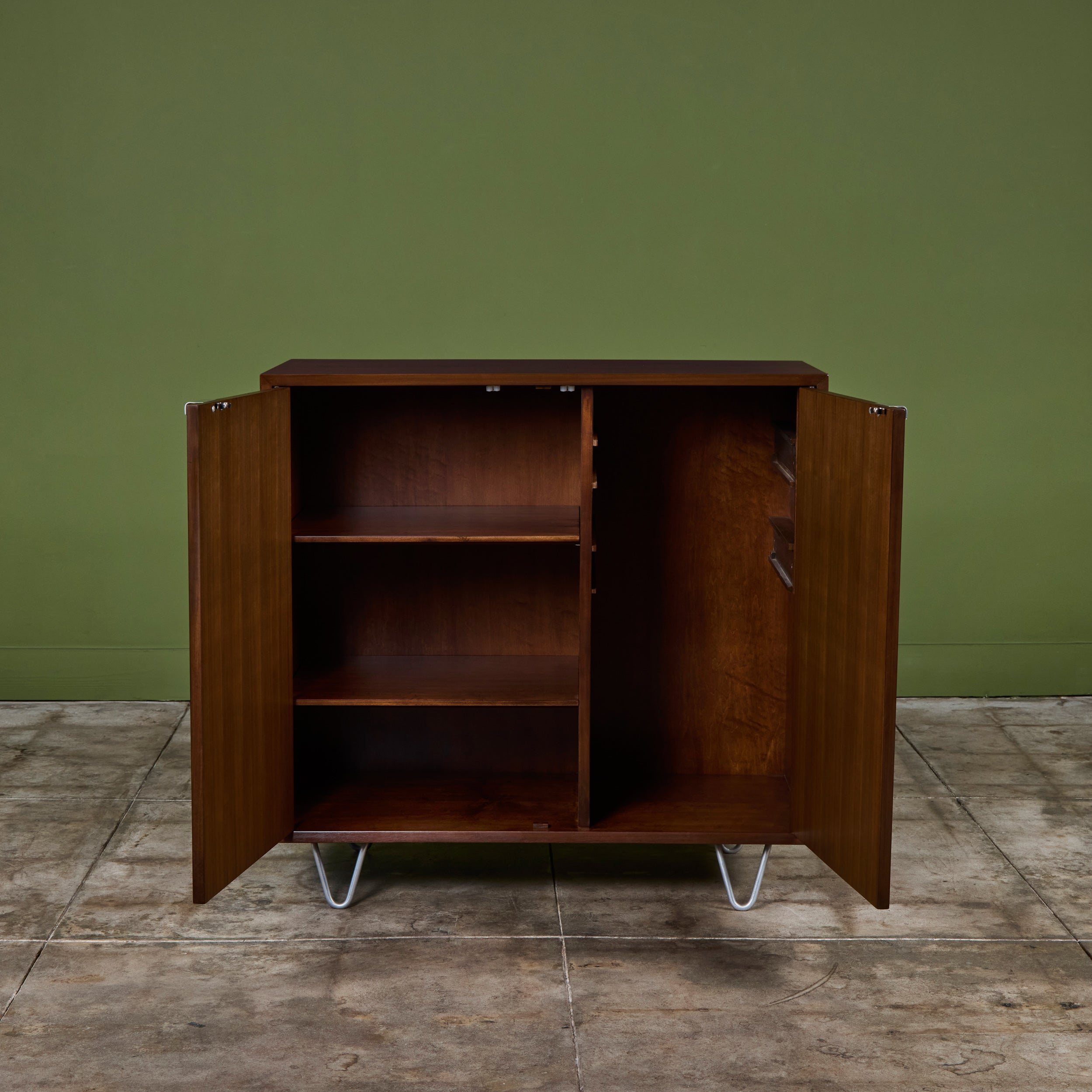George Nelson BSC cabinet for Herman Miller, c.1950's, USA. The design features a two door walnut cabinet with interior shelves. Each cabinet door has a polished aluminum pull. The case sits atop four steel hairpin legs.
