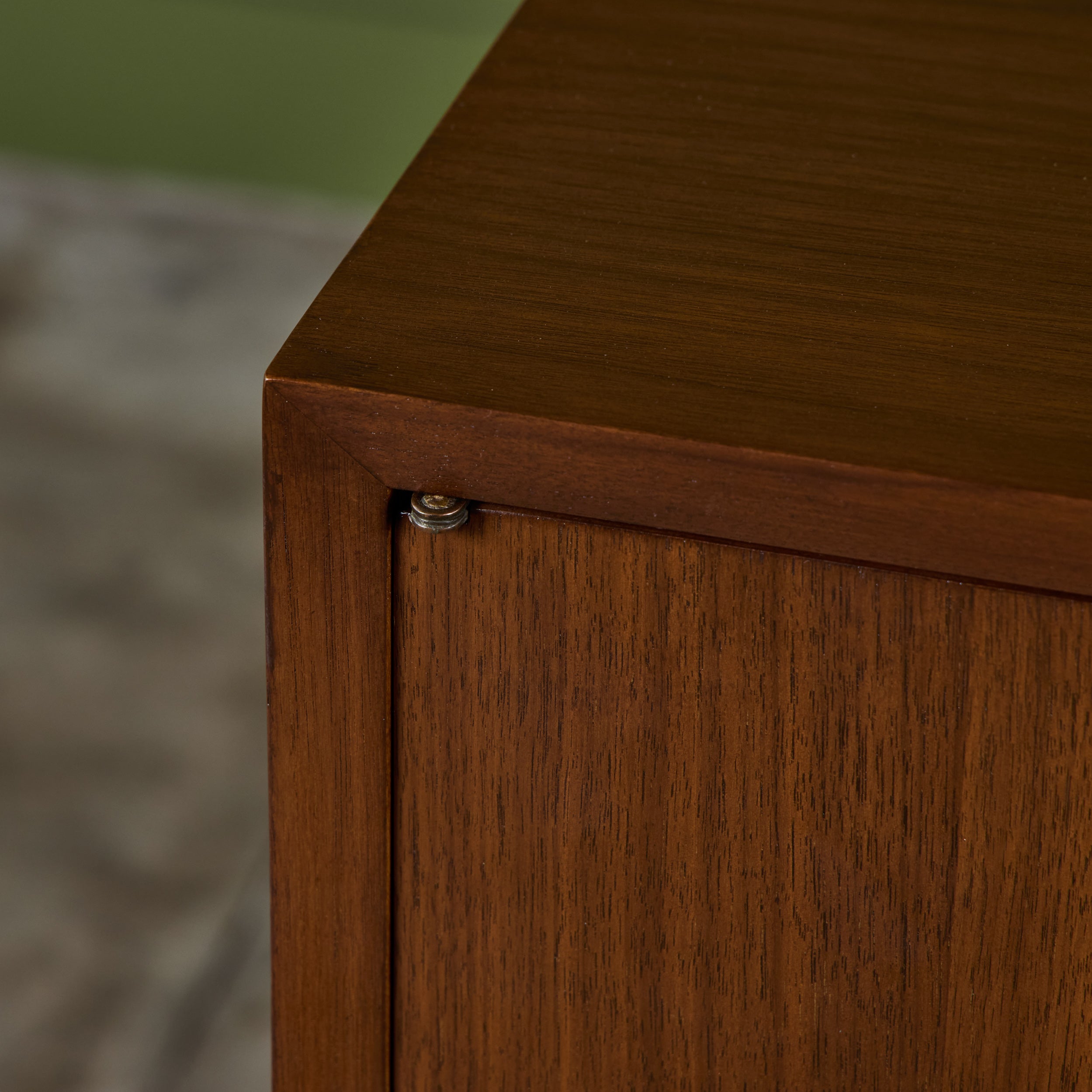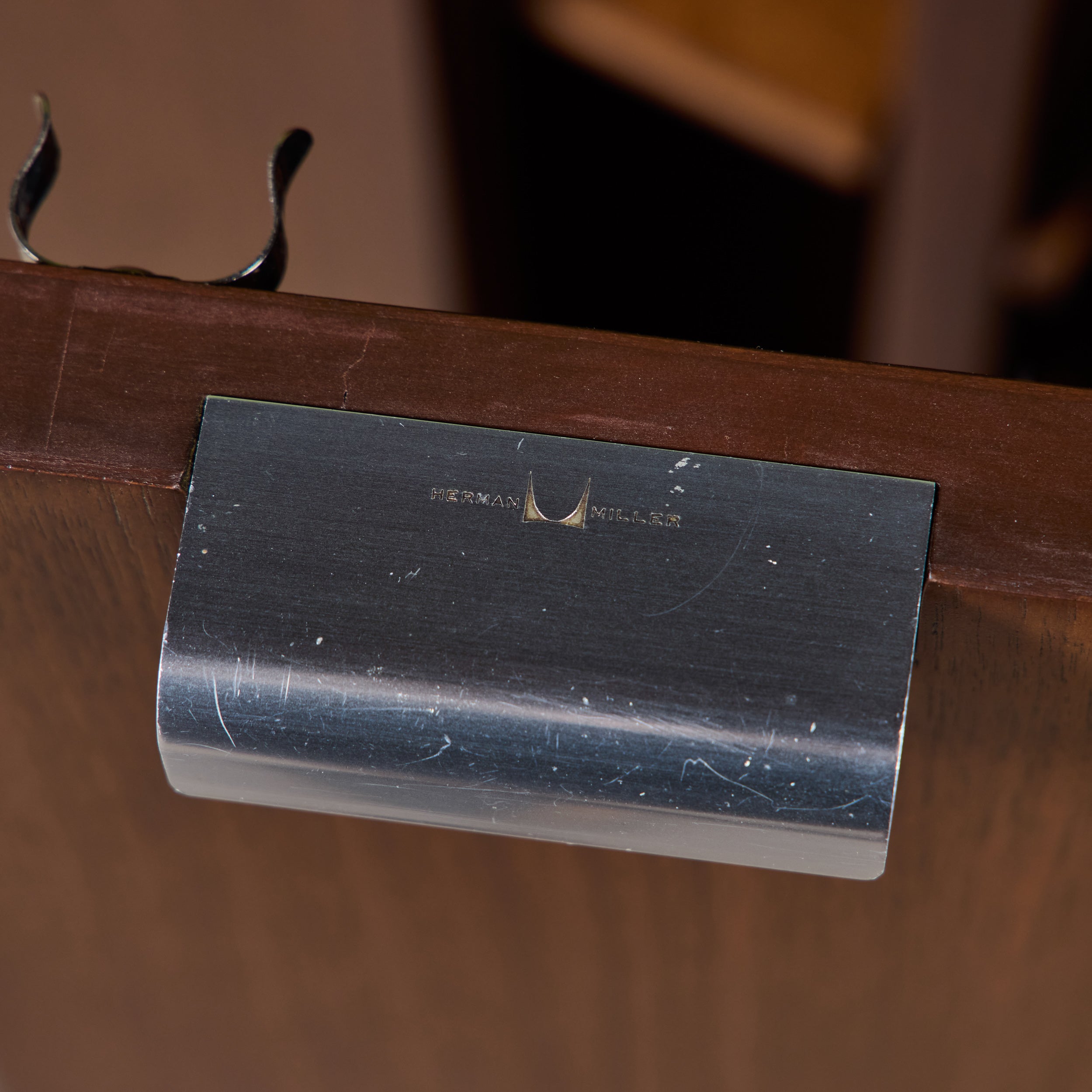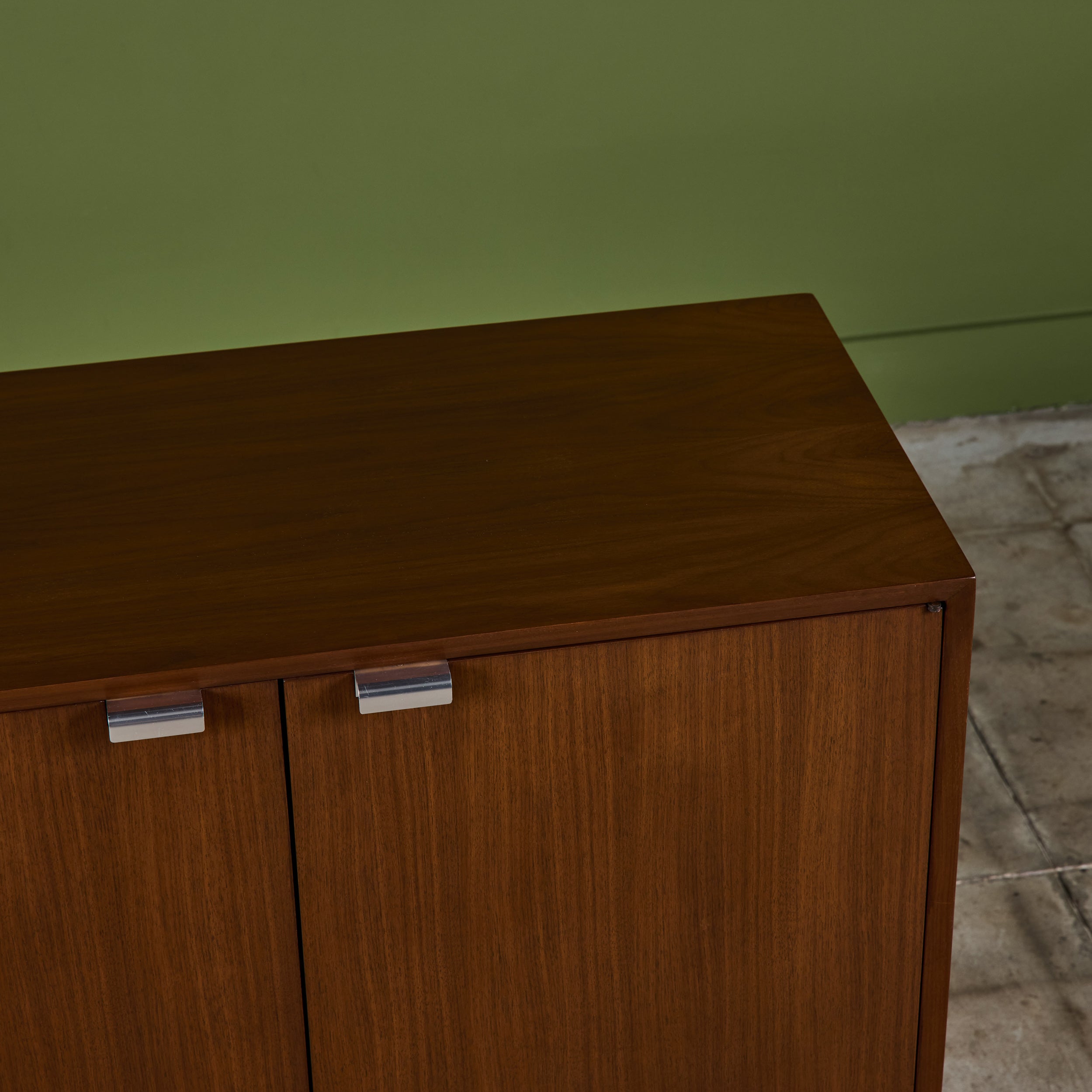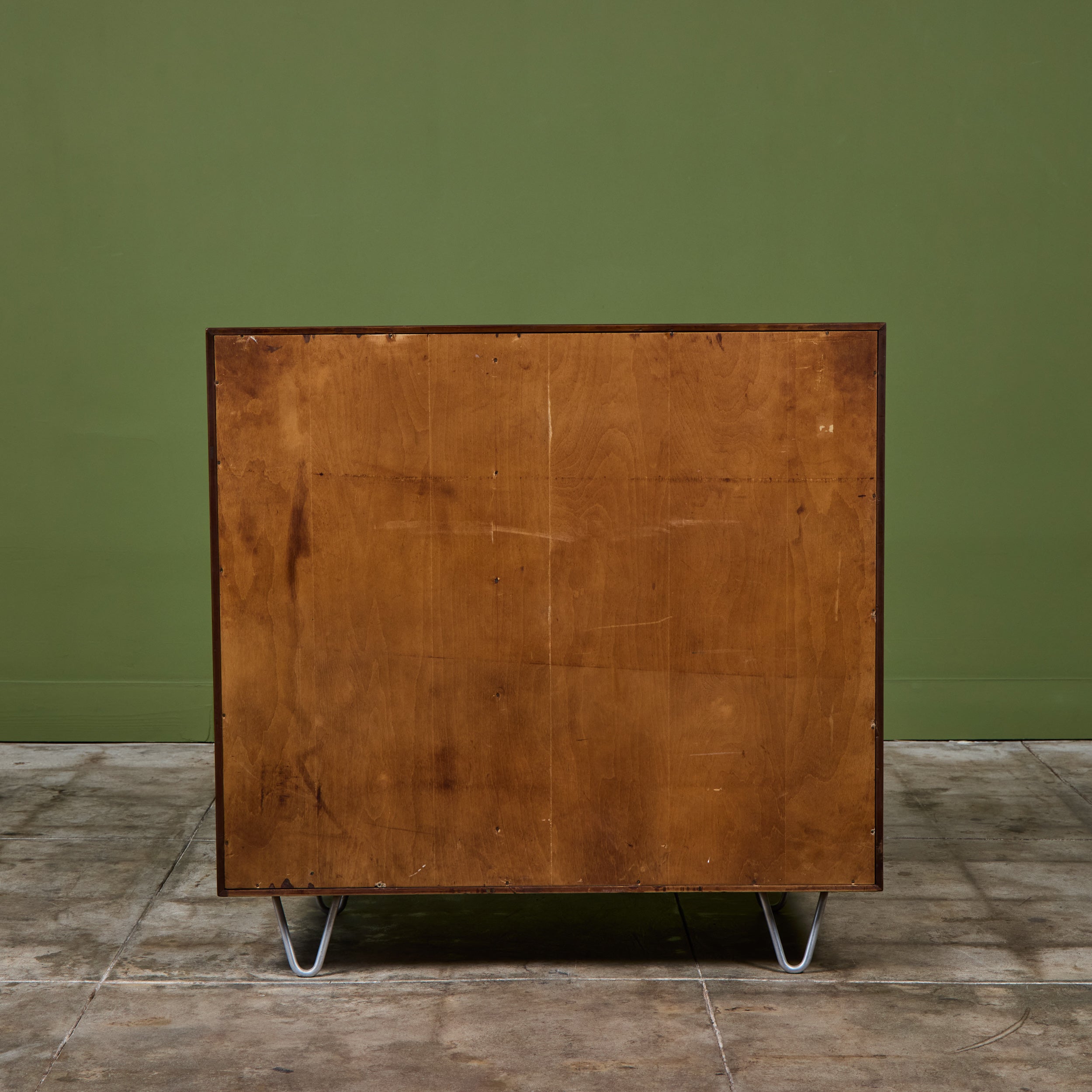 George Nelson BSC cabinet for Herman Miller, c.1950's, USA. The design features a two door walnut cabinet with interior shelves. Each cabinet door has a polished aluminum pull. The case sits atop four steel hairpin legs.
