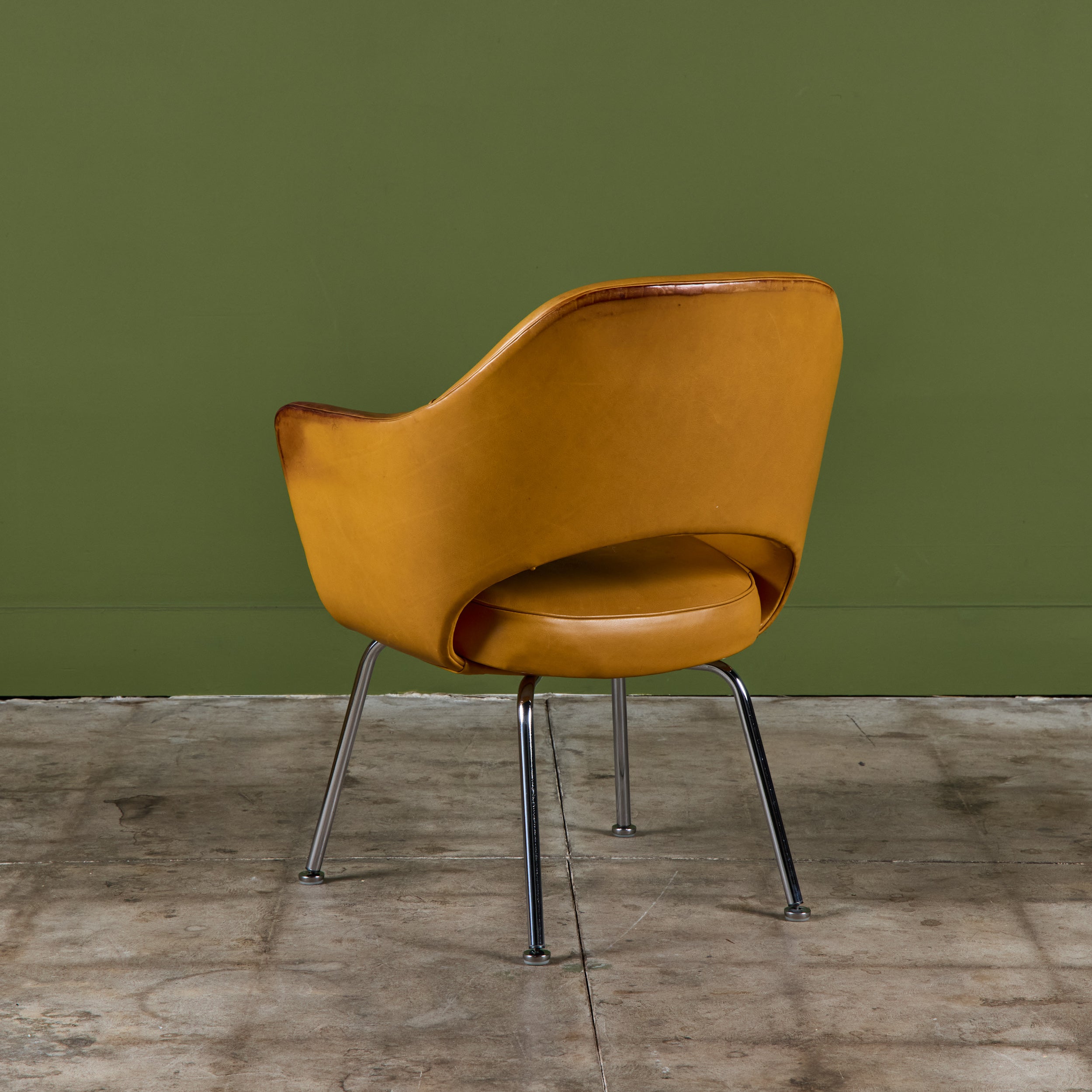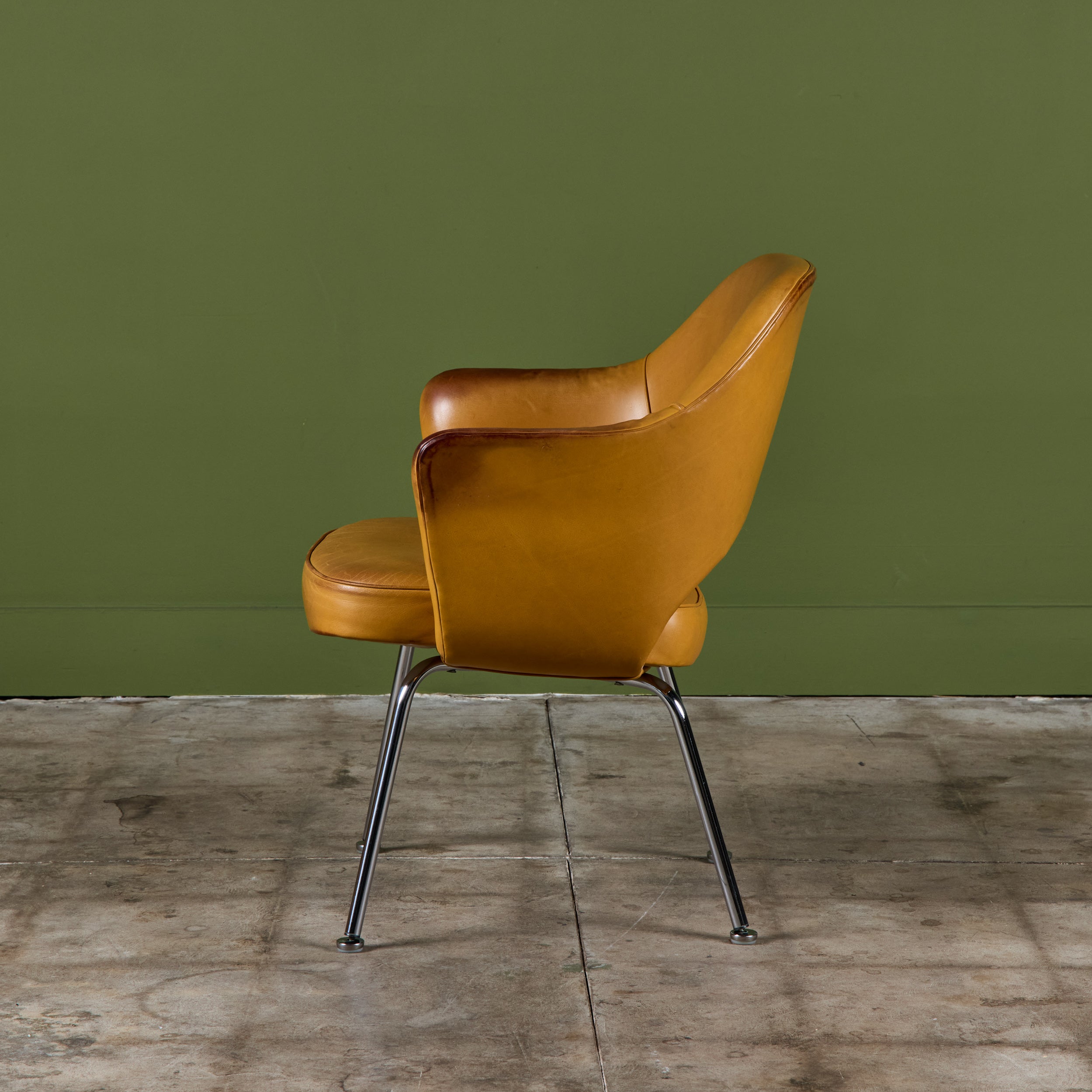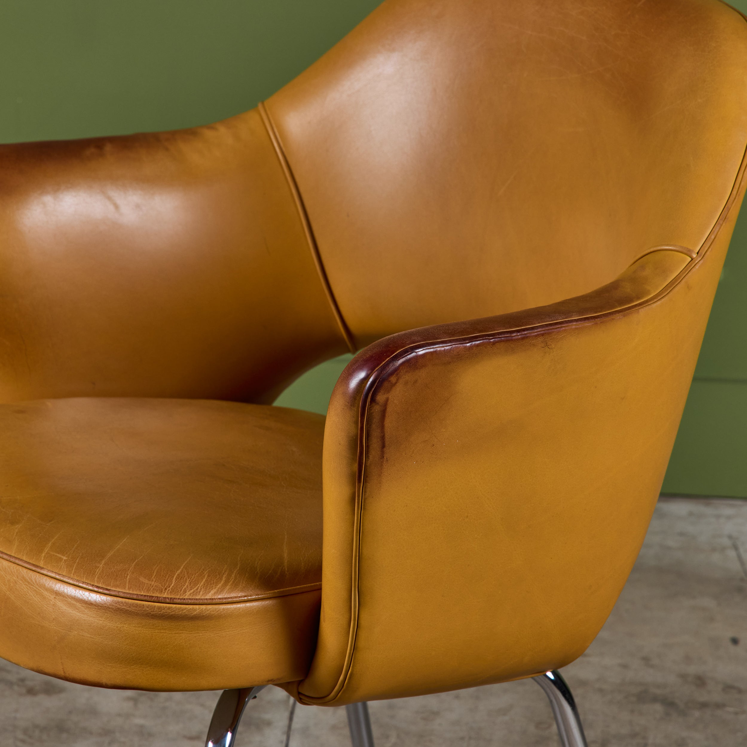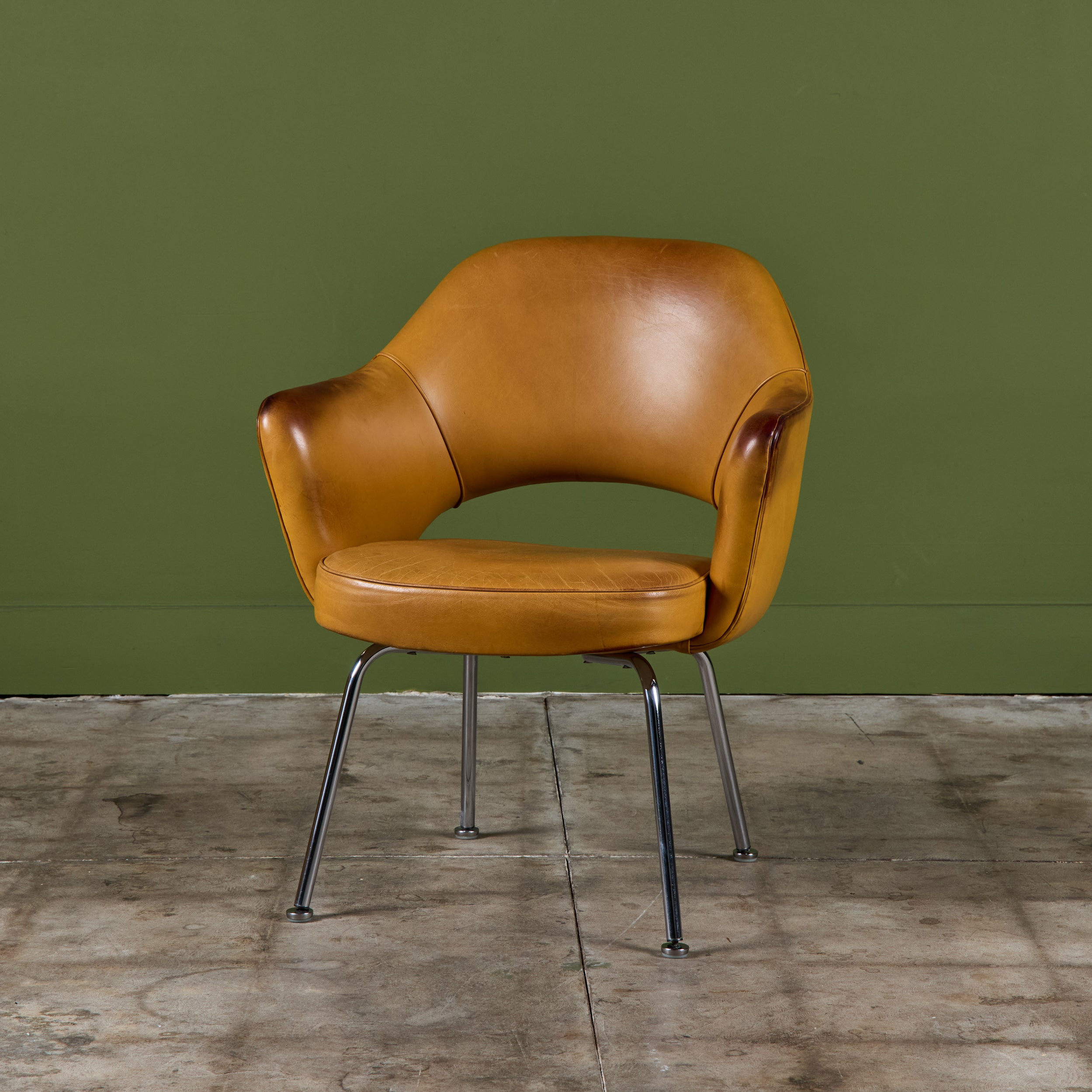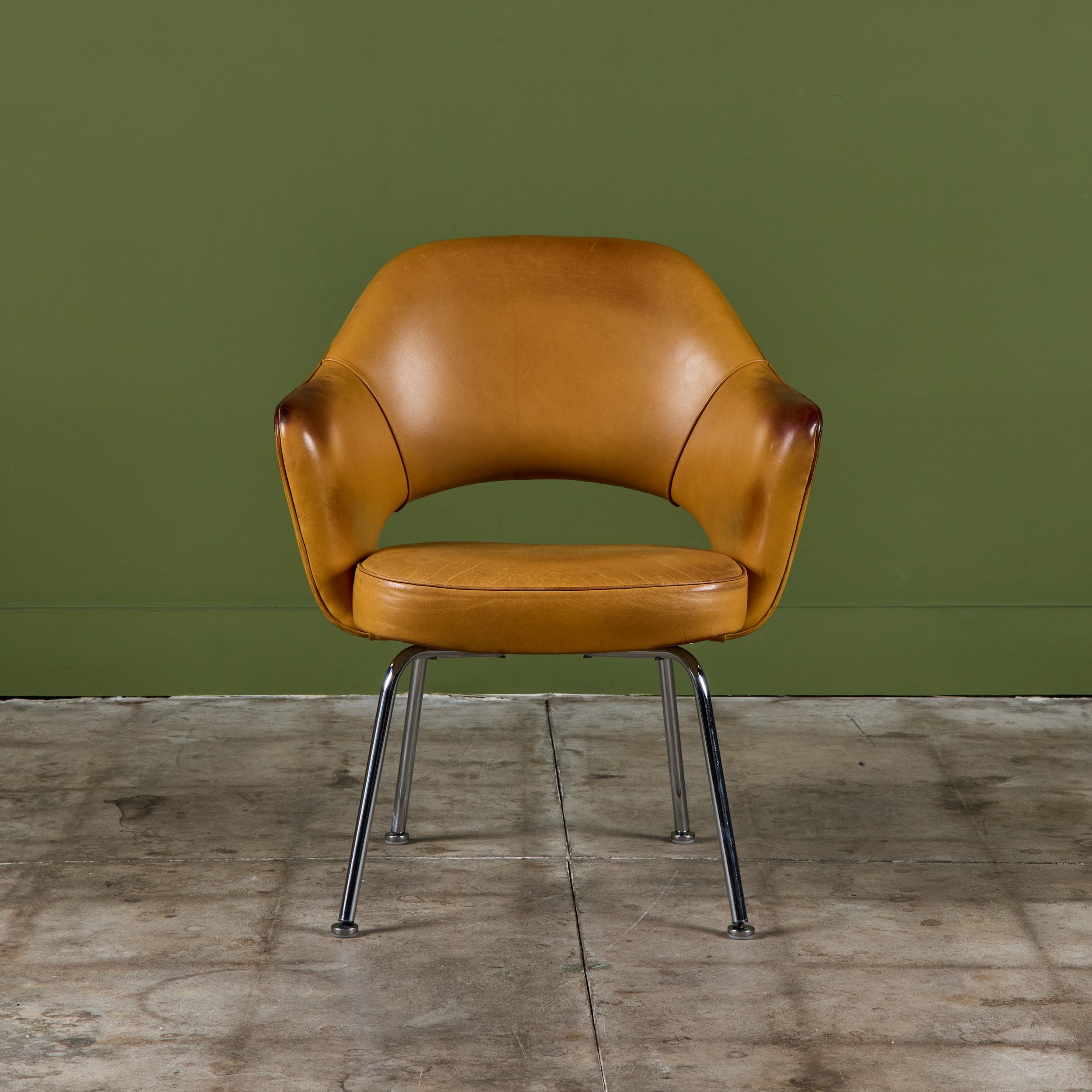 Eero Saarinen’s 'executive' armchair for Knoll originally designed in the 1950s is an enduring design. First seen in an office setting this piece is now often featured as a dining chair. The chair is upholstered in the original tan leather which now shows a perfect aged patina with polished chrome legs.