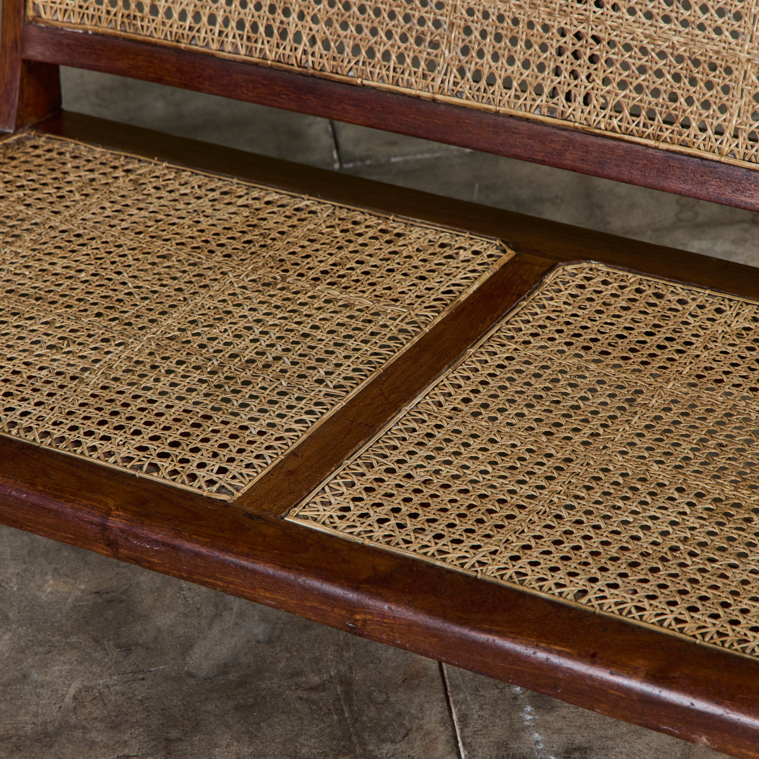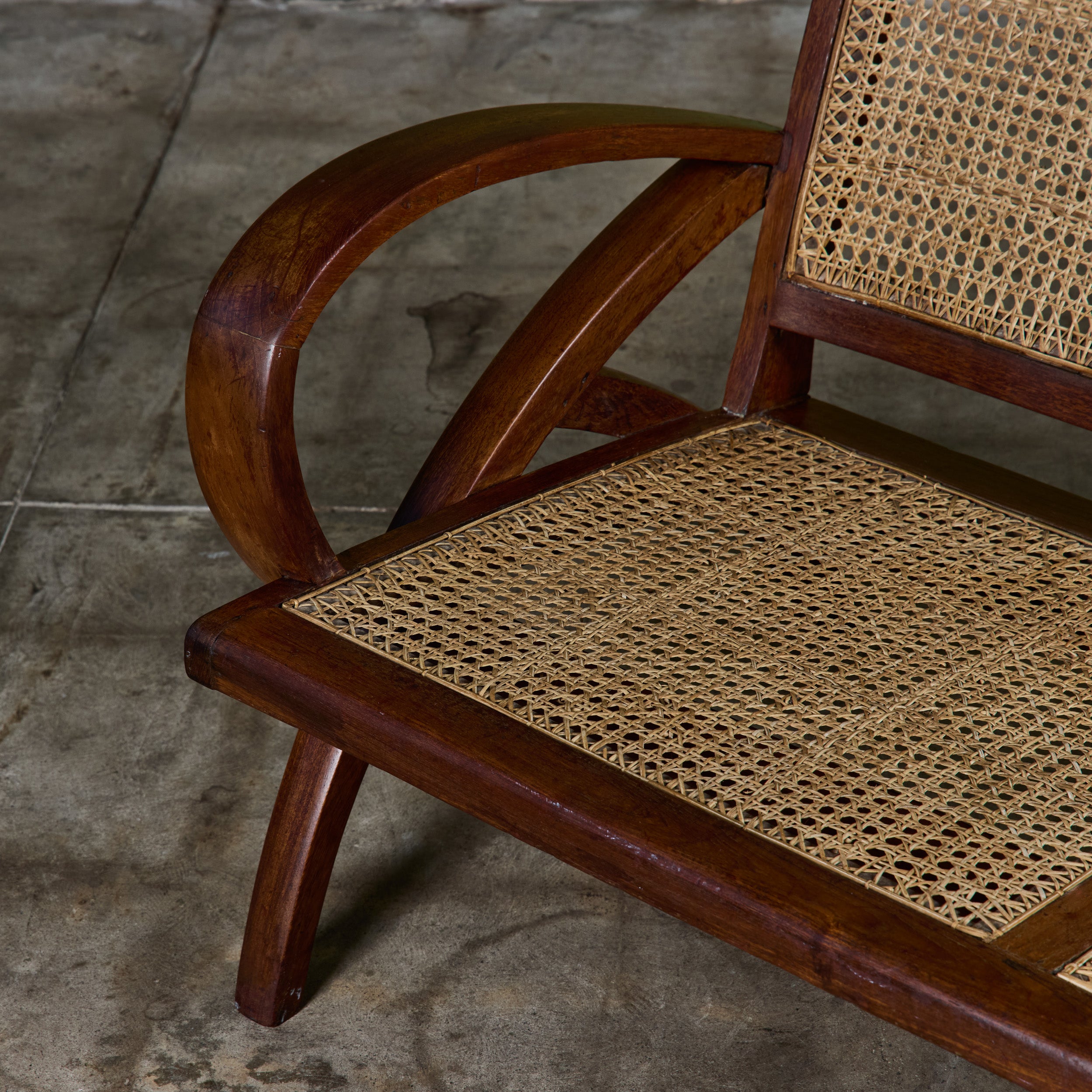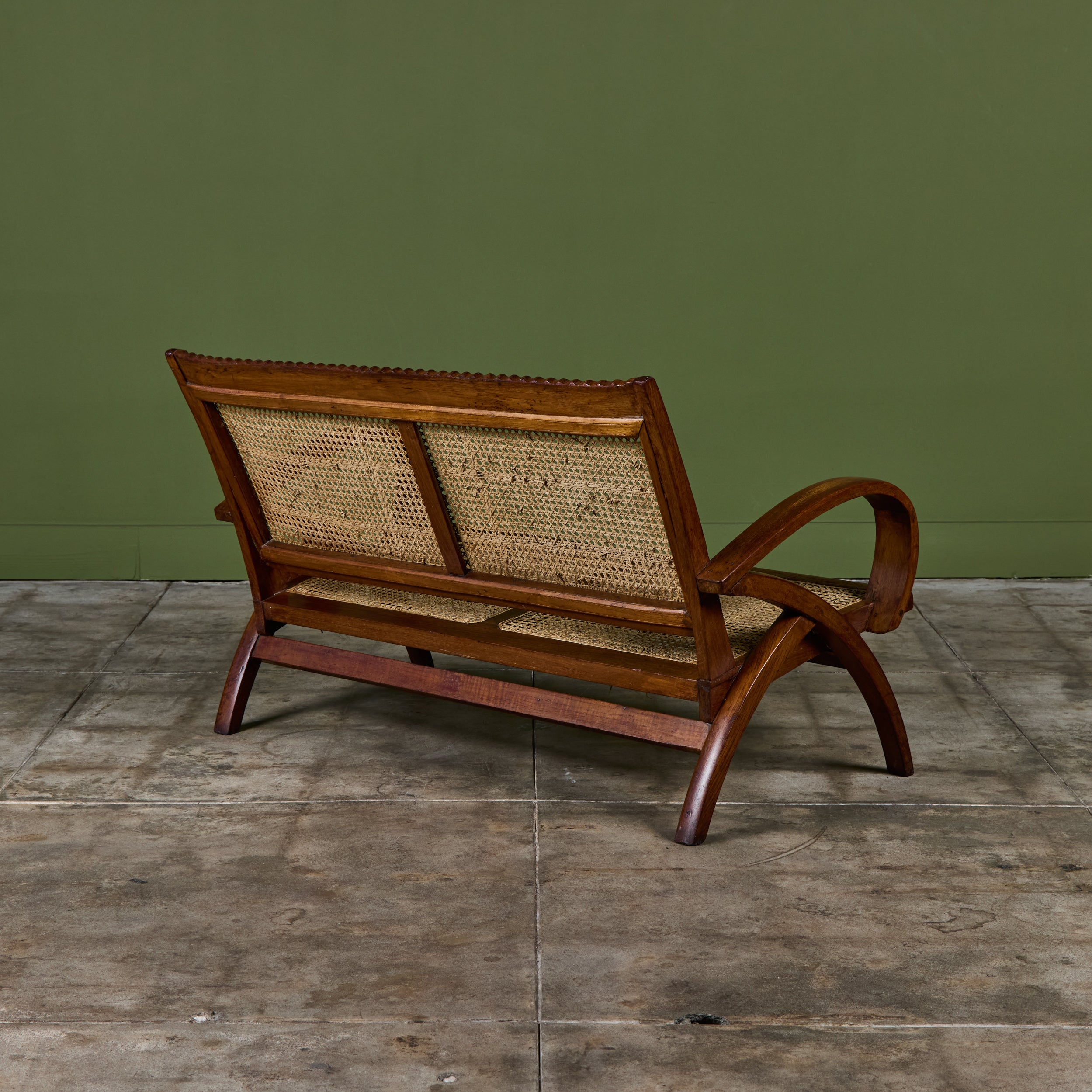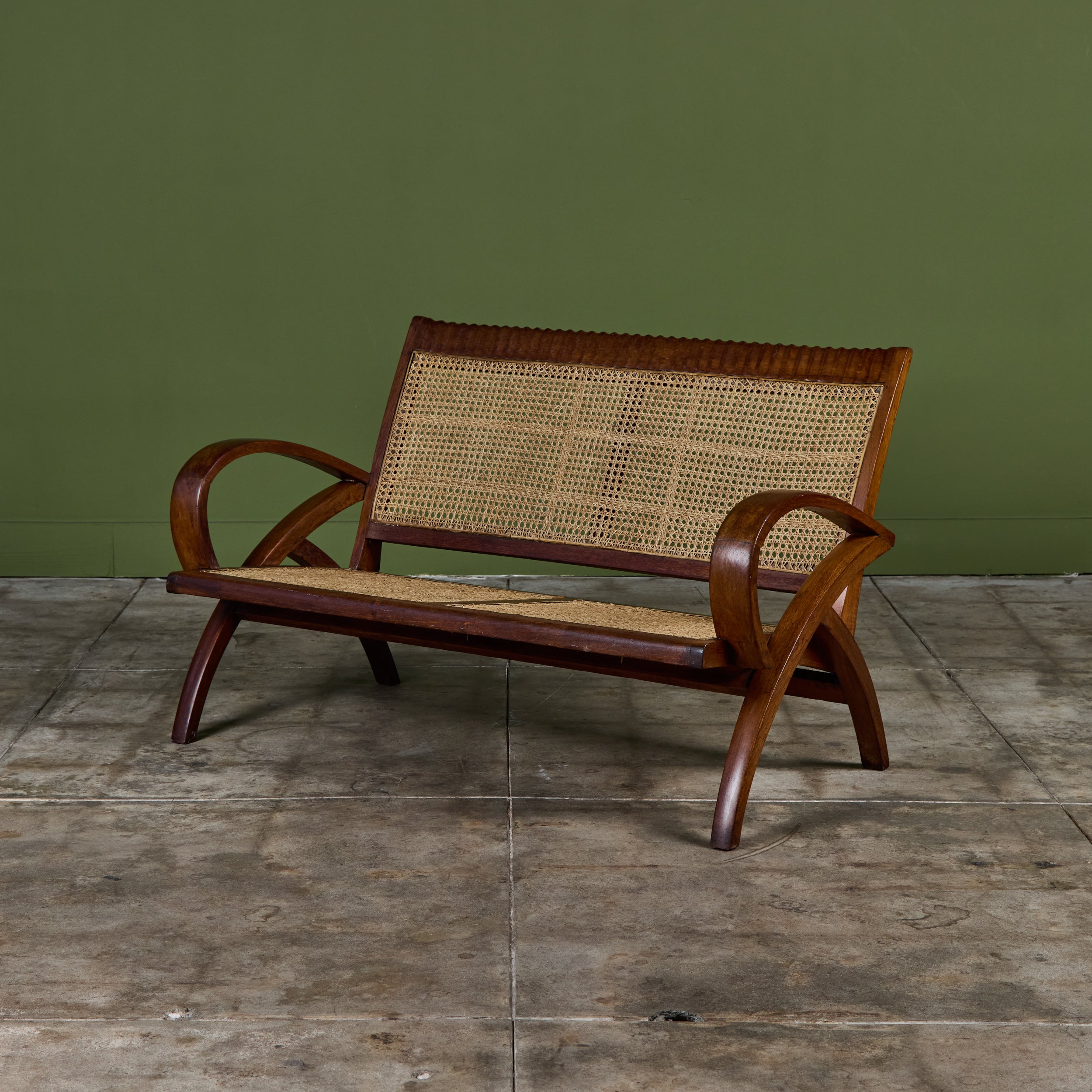 Sculptural mahogany French loveseat with curved armrests and cane seat and seat back.