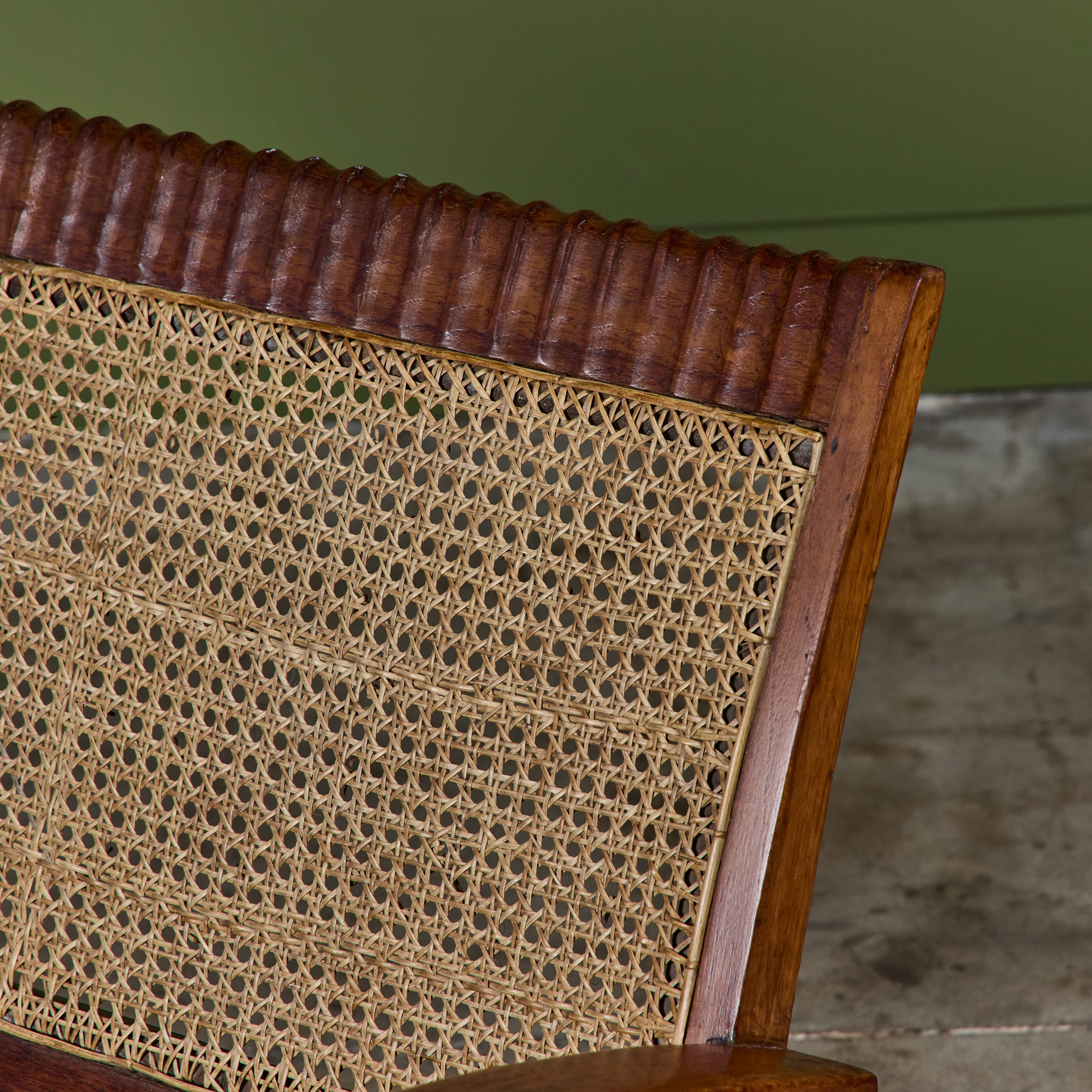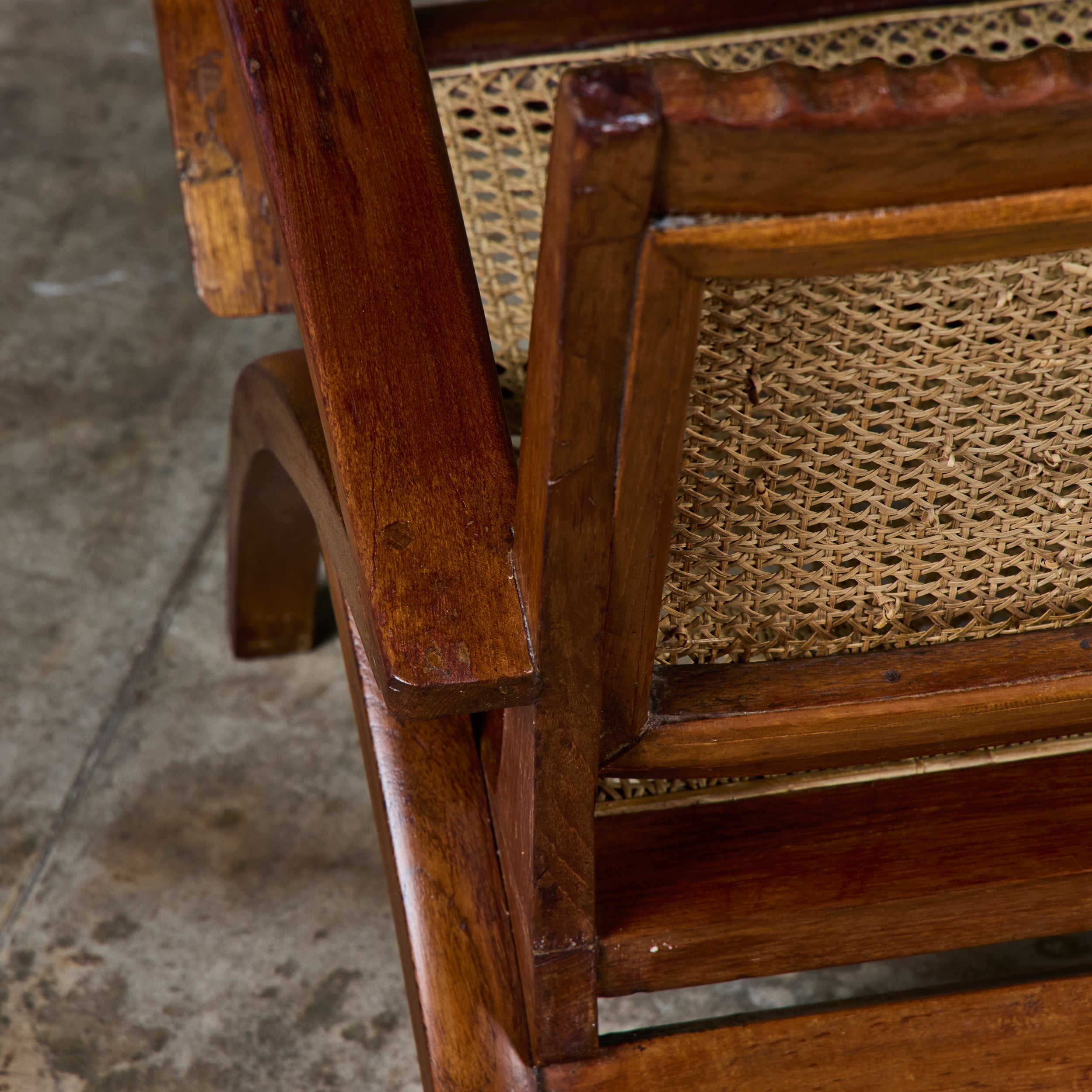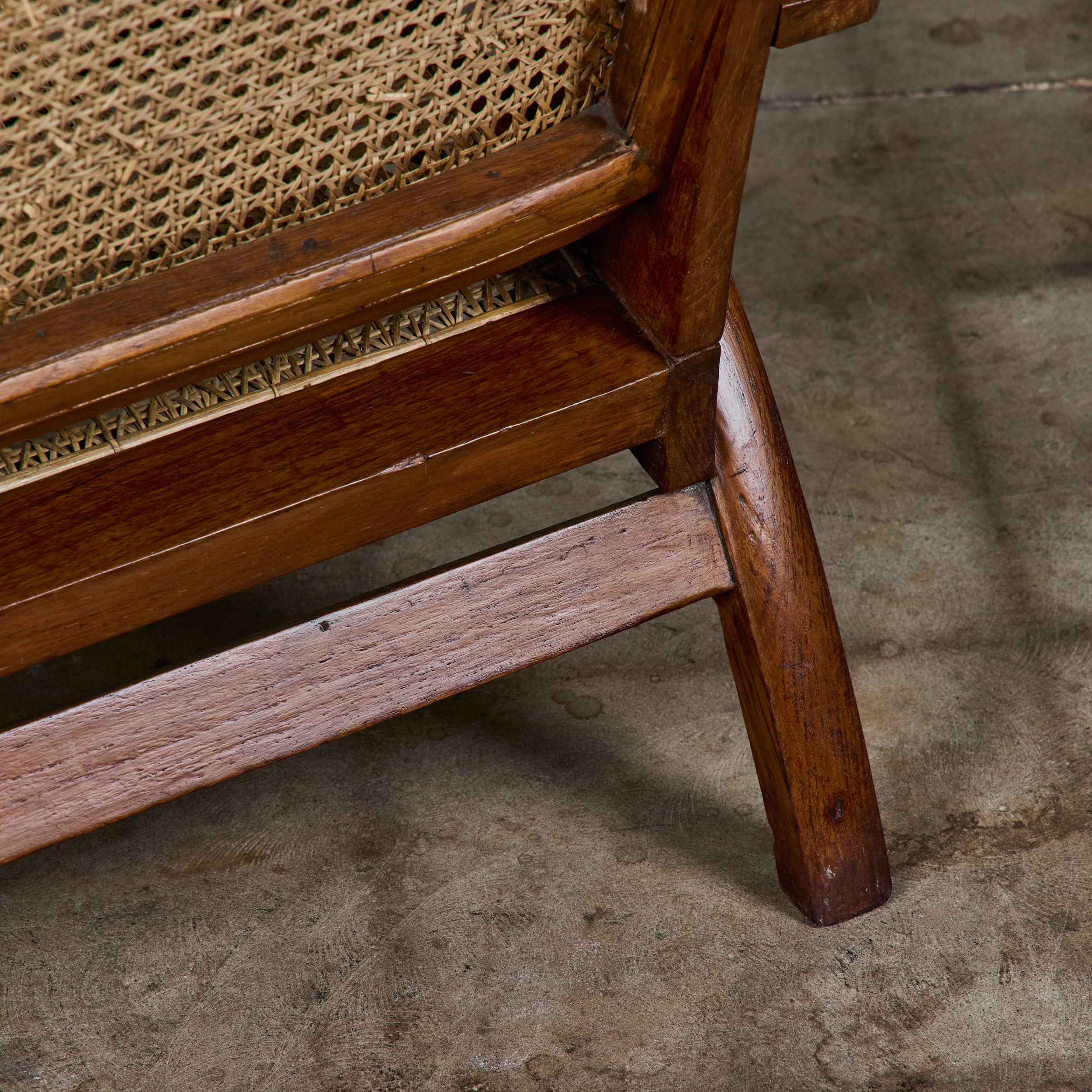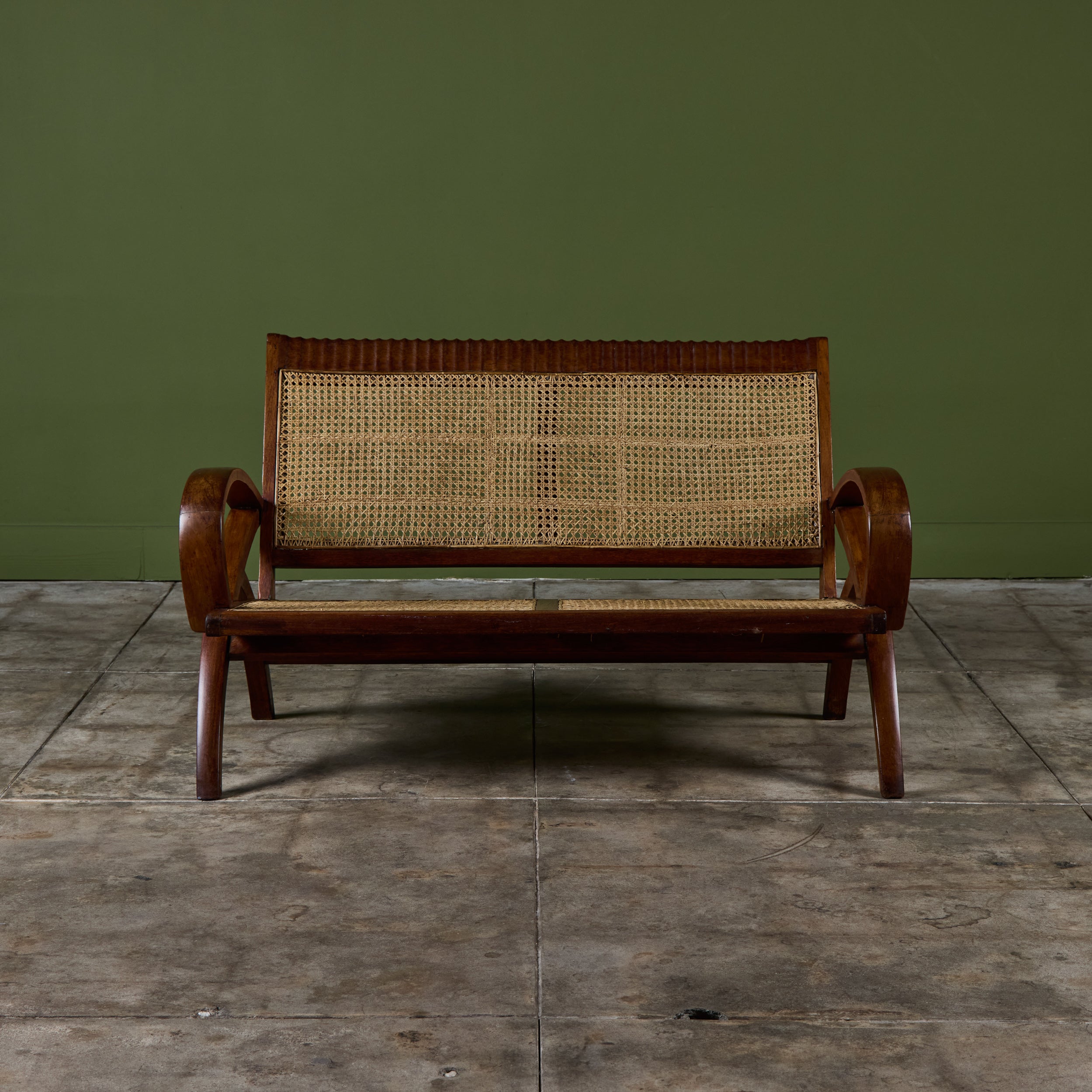 Sculptural mahogany French loveseat with curved armrests and cane seat and seat back.