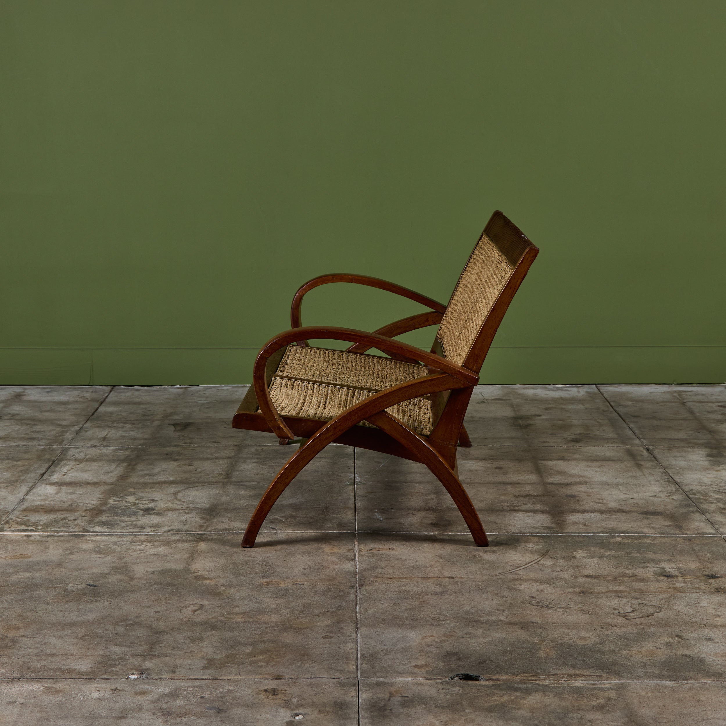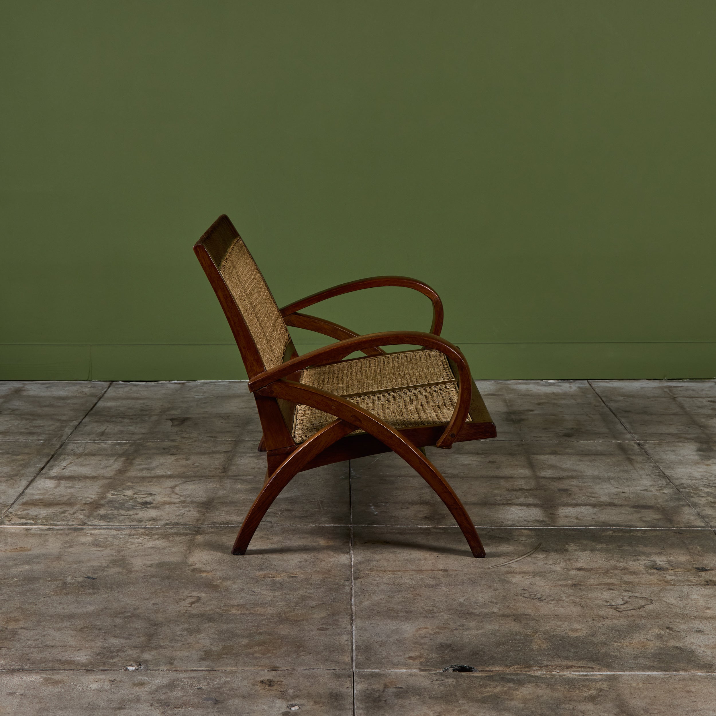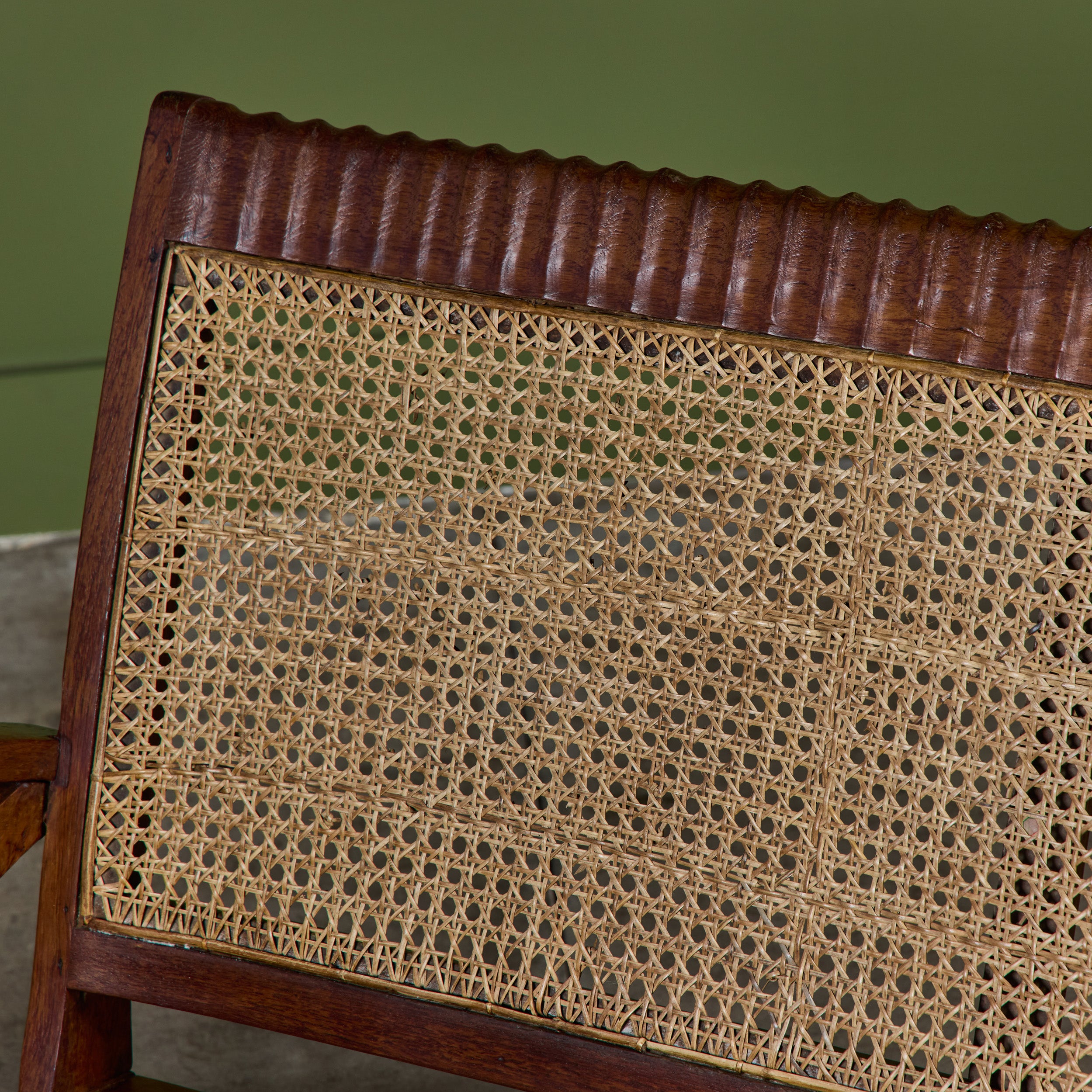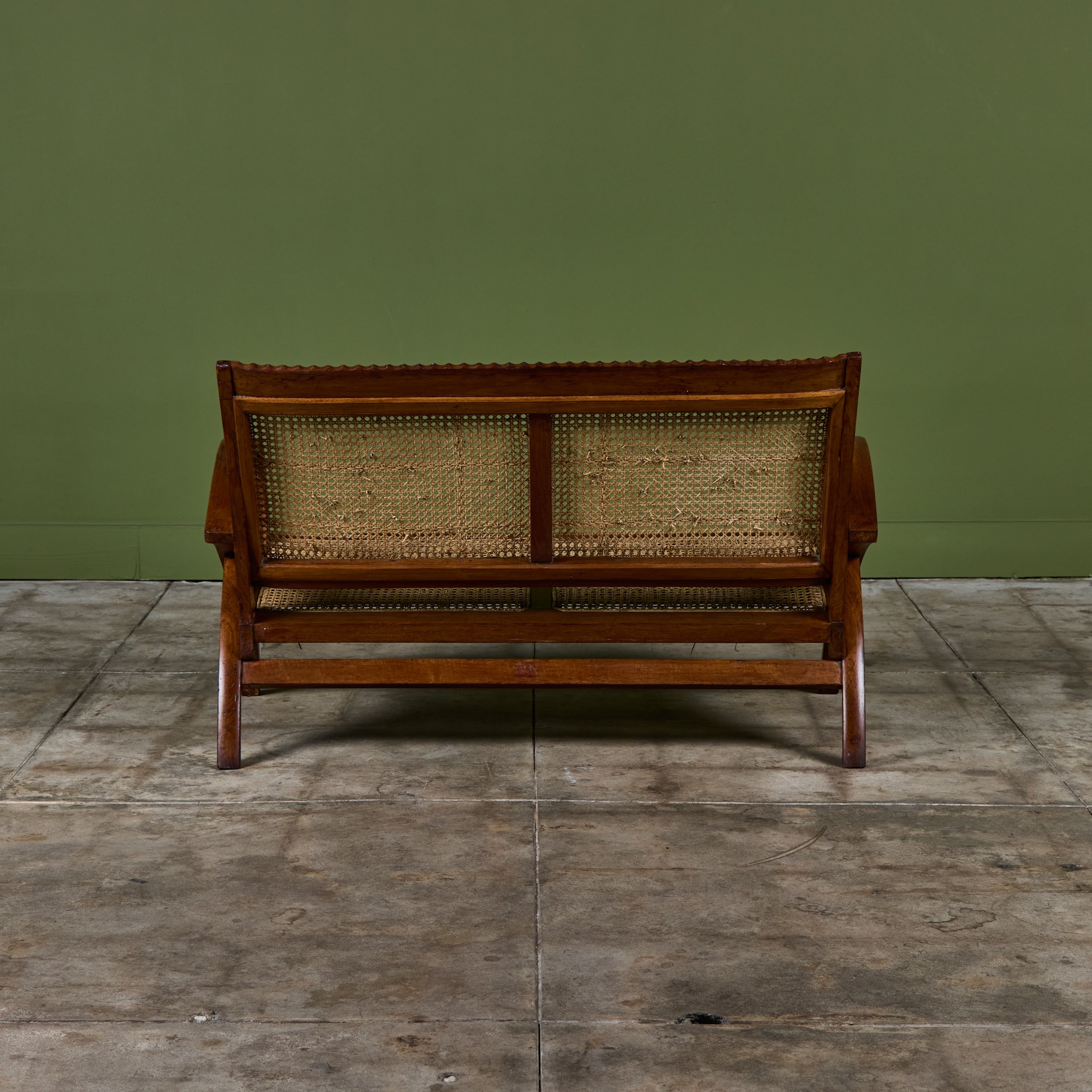 Sculptural mahogany French loveseat with curved armrests and cane seat and seat back.