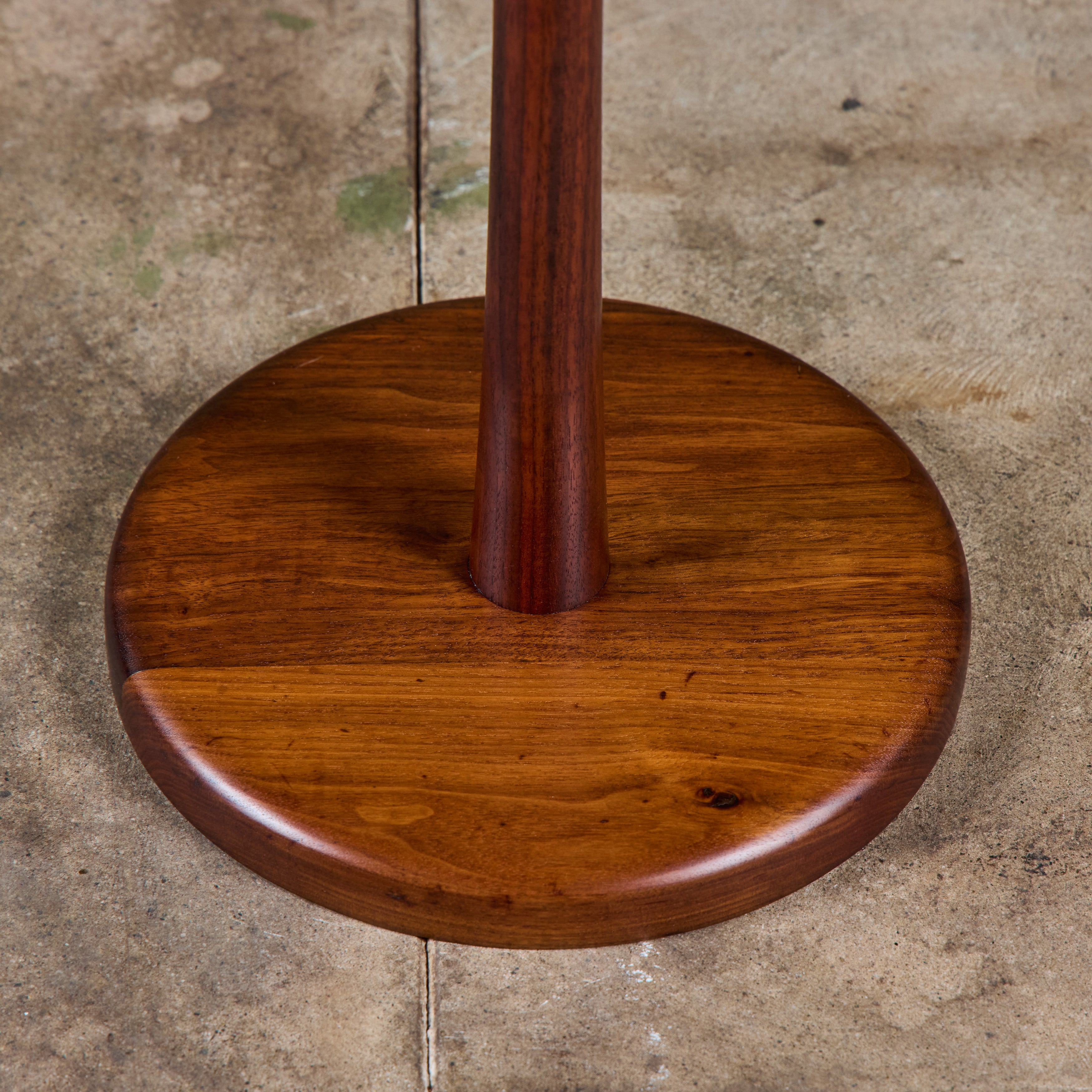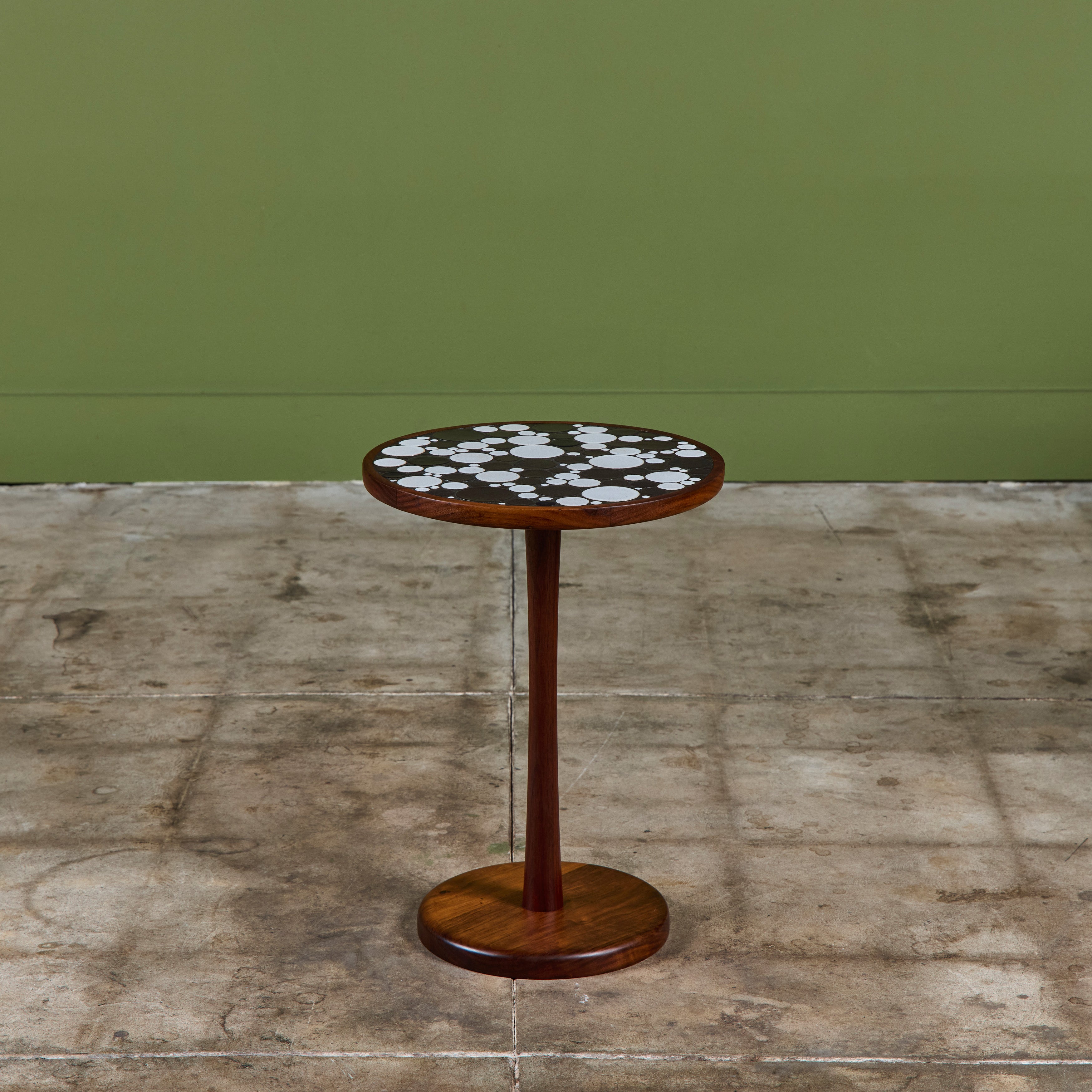 Round side table by Gordon & Jane Martz. The table top is inlaid with ceramic coin tiles in a black and white matte glaze. The frame, base and pedestal of the table are all solid walnut.