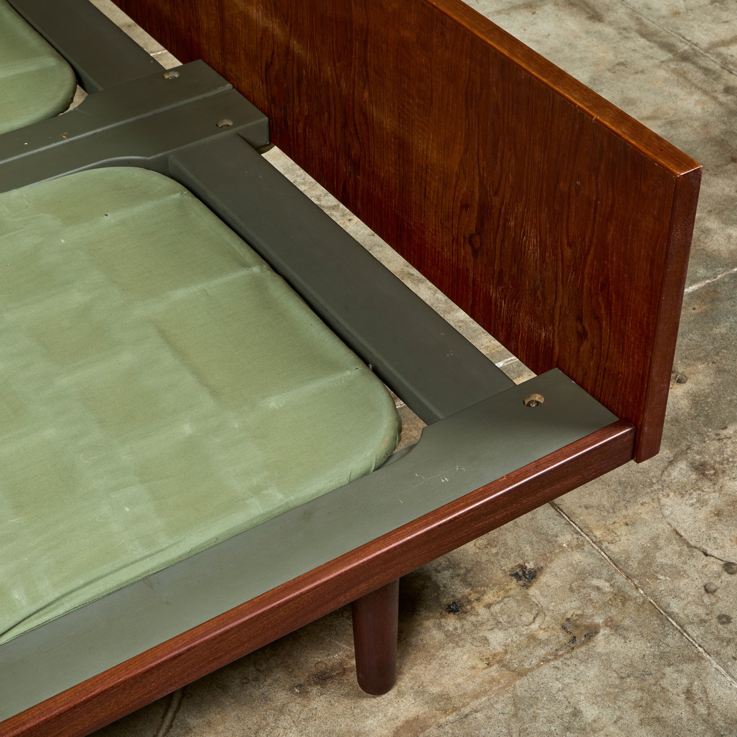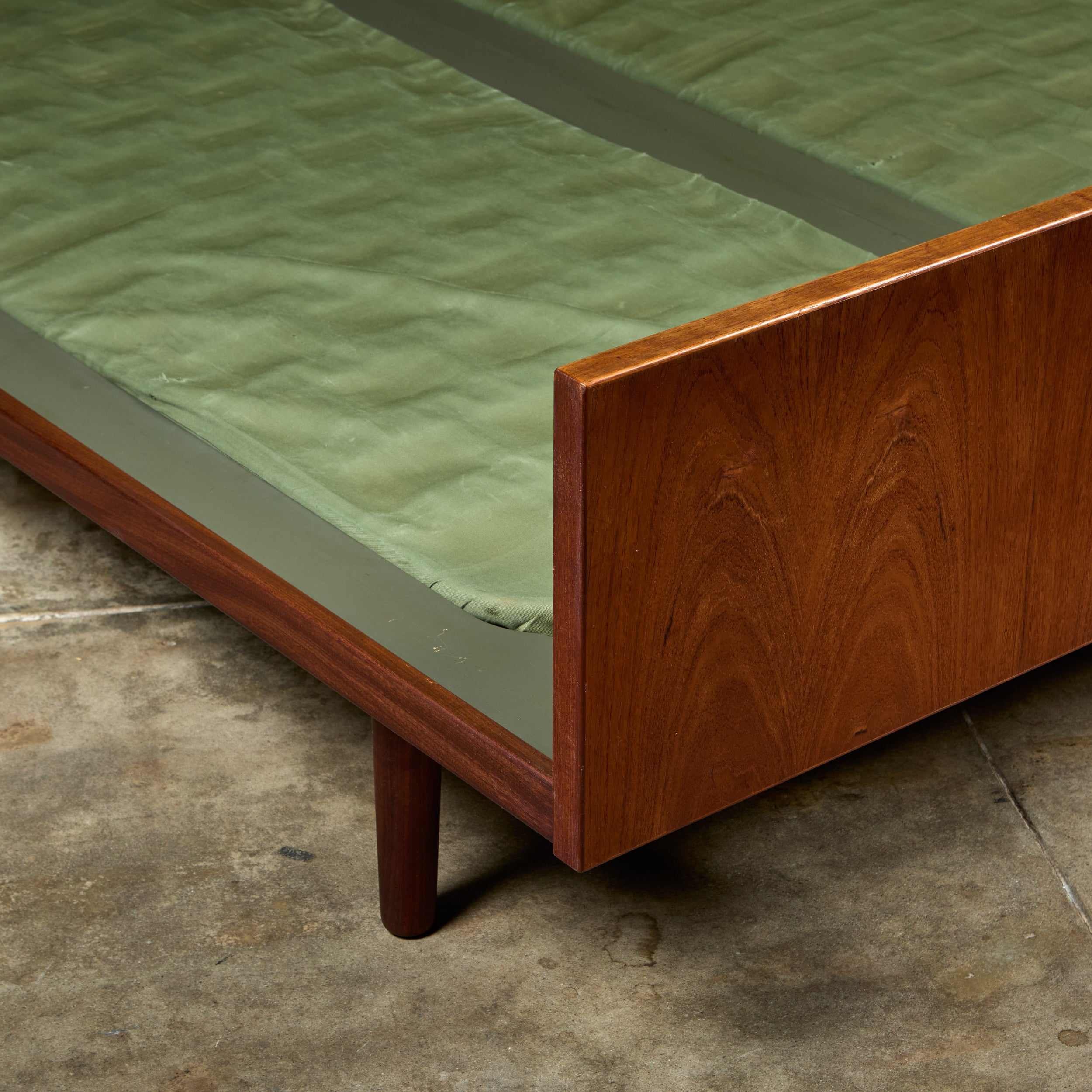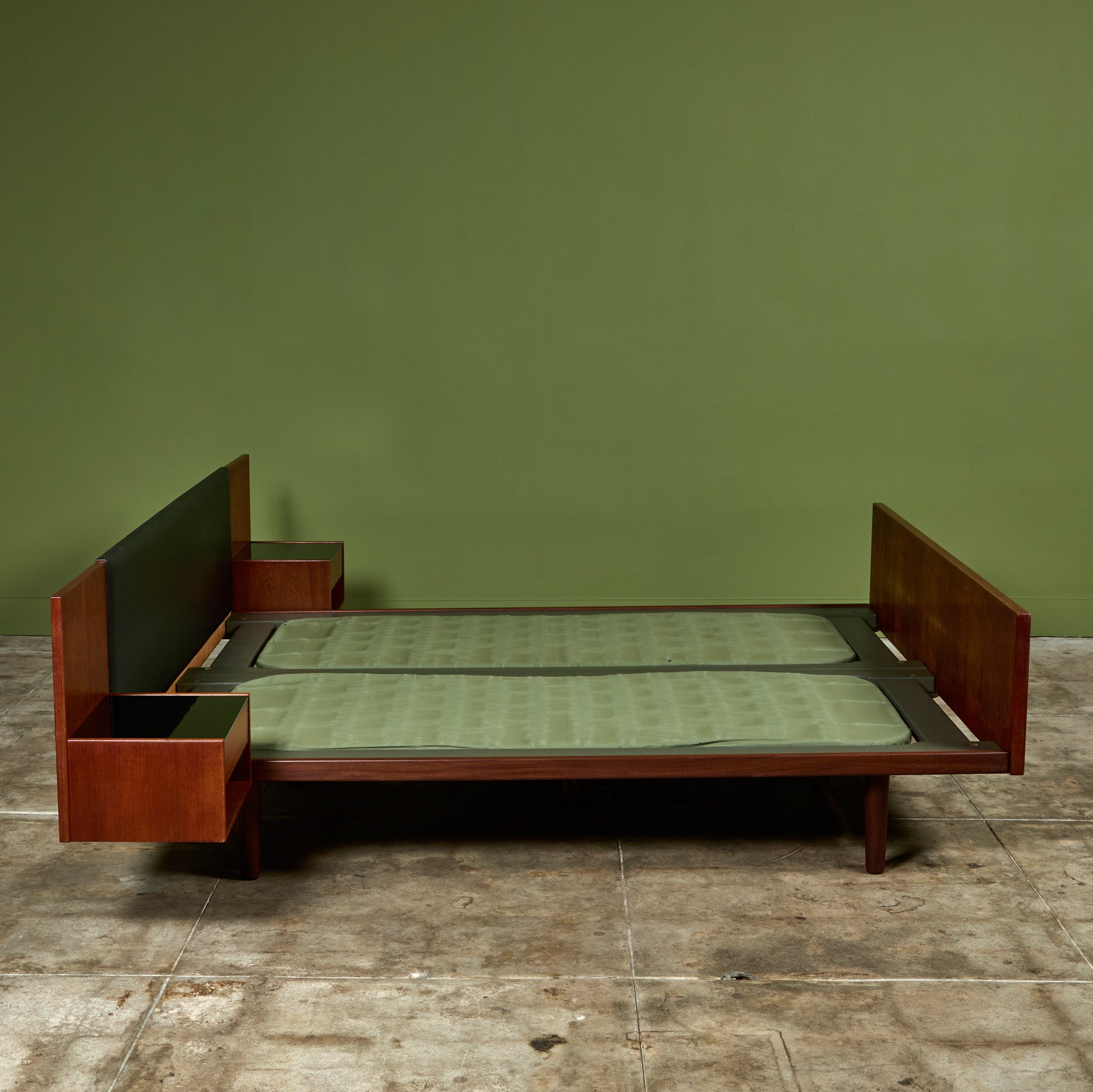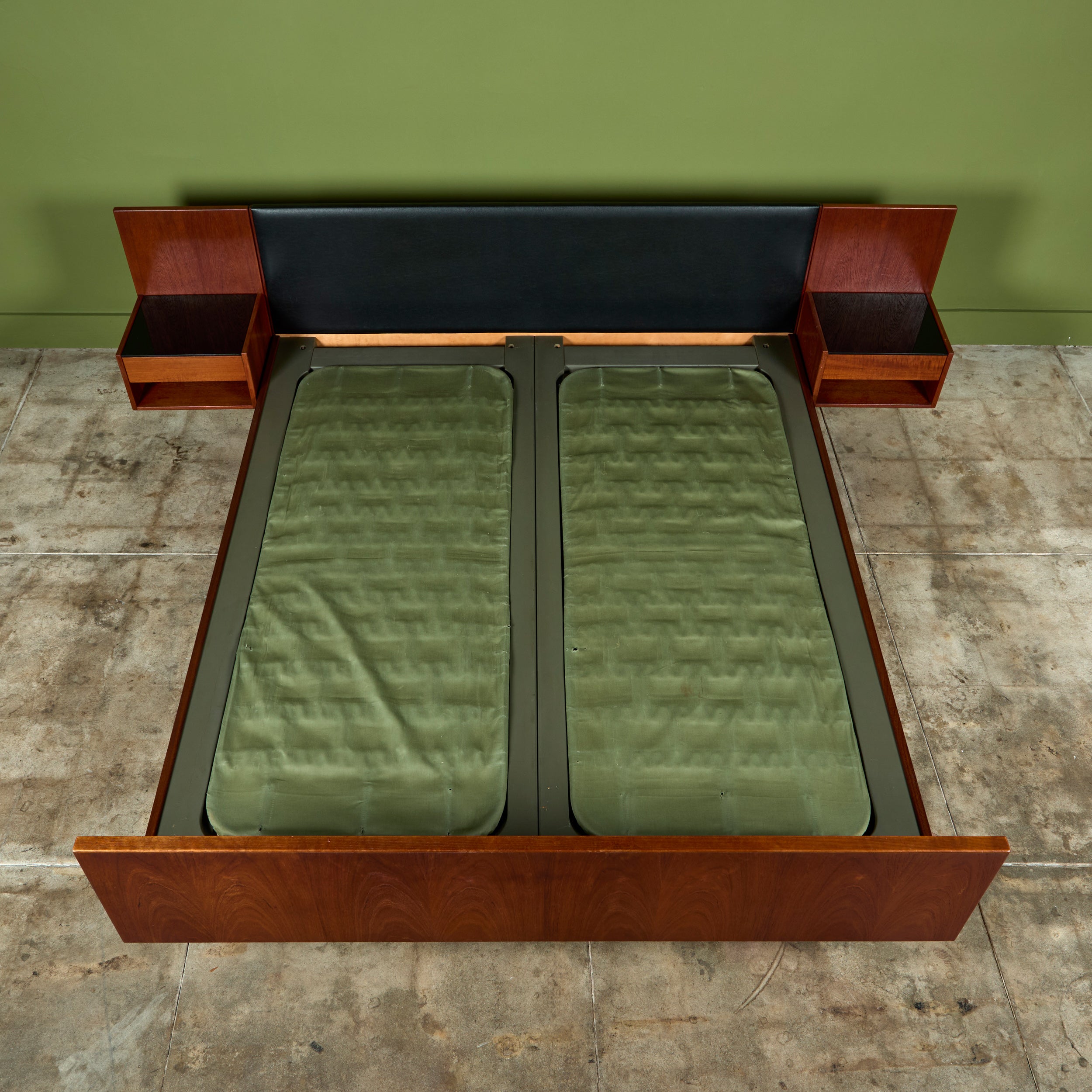 European queen size teak bed frame designed by Hans Wegner for Getama c.1950s, Denmark. The bed features a naugahyde headboard with attached nightstands. The nightstands each offer a single drawer and shelf for storage along with a black glass table top. The bed also has a teak footboard and rests upon teak dowel legs. The frame is for a European queen size mattress.