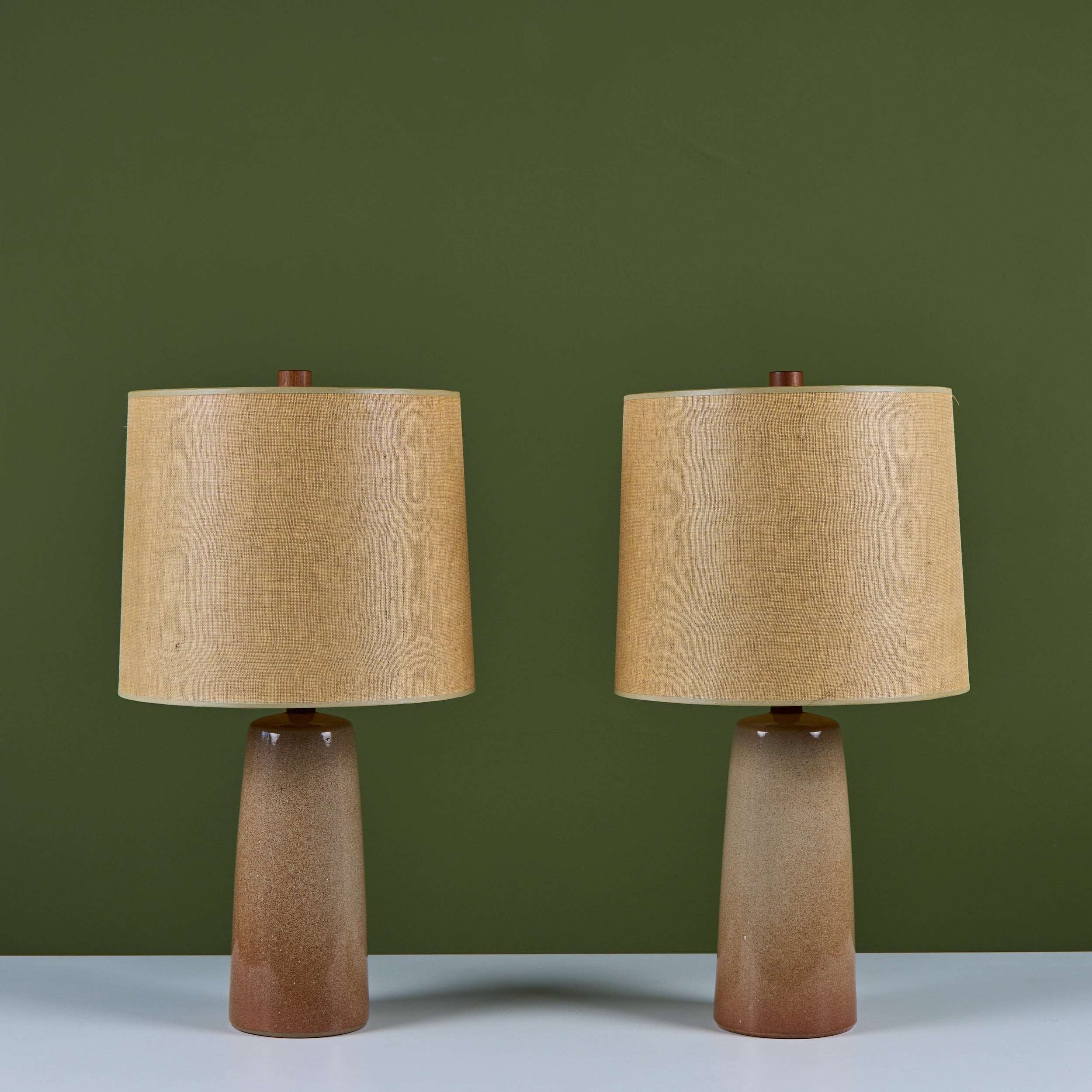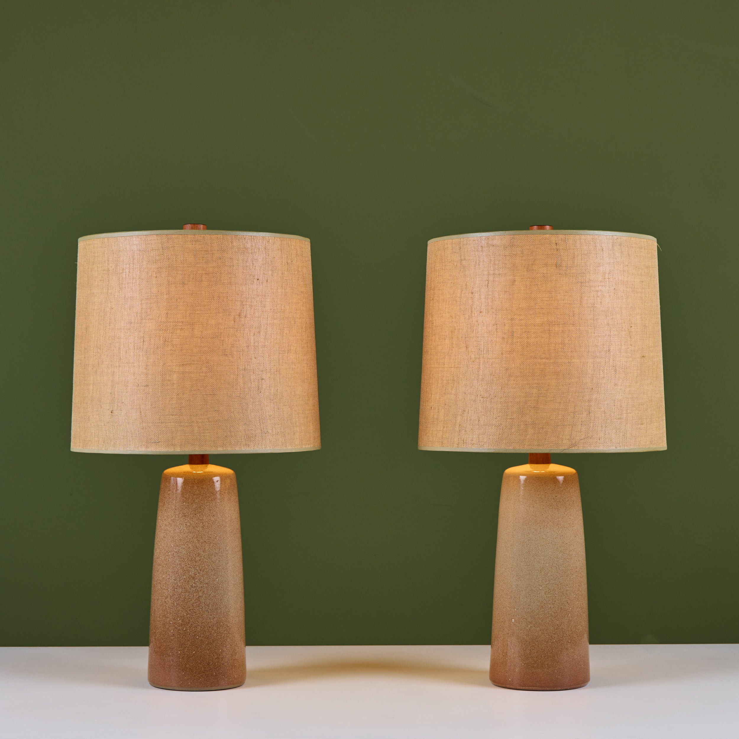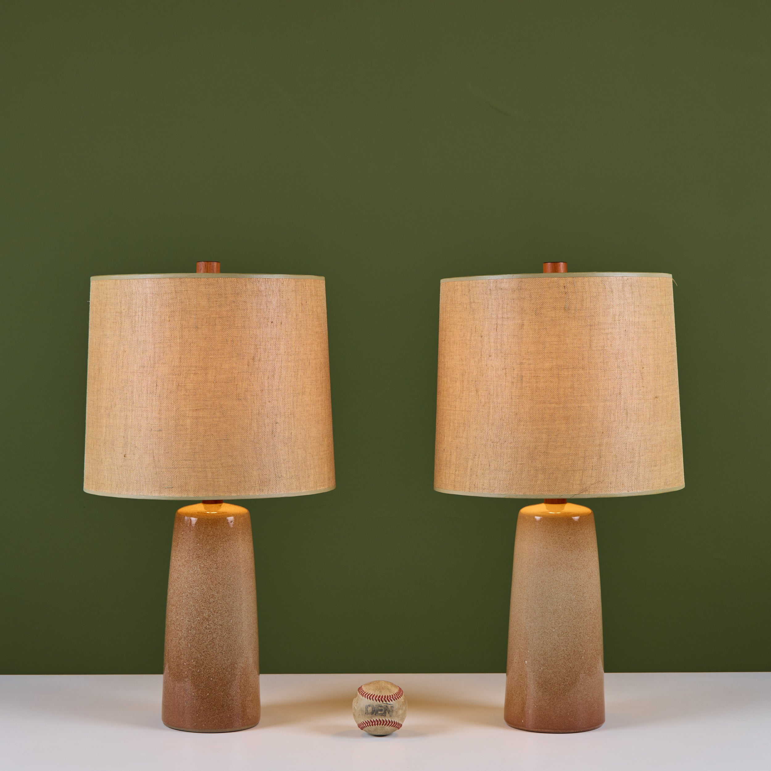 Pair of striking ceramic table lamps by husband-and-wife design team Gordon and Jane Martz. Produced by their family company, Marshall Studios in Indiana beginning in 1957. The lamps feature a speckle cream and tan glaze with walnut finial. They have their original shades and have been newly rewired.