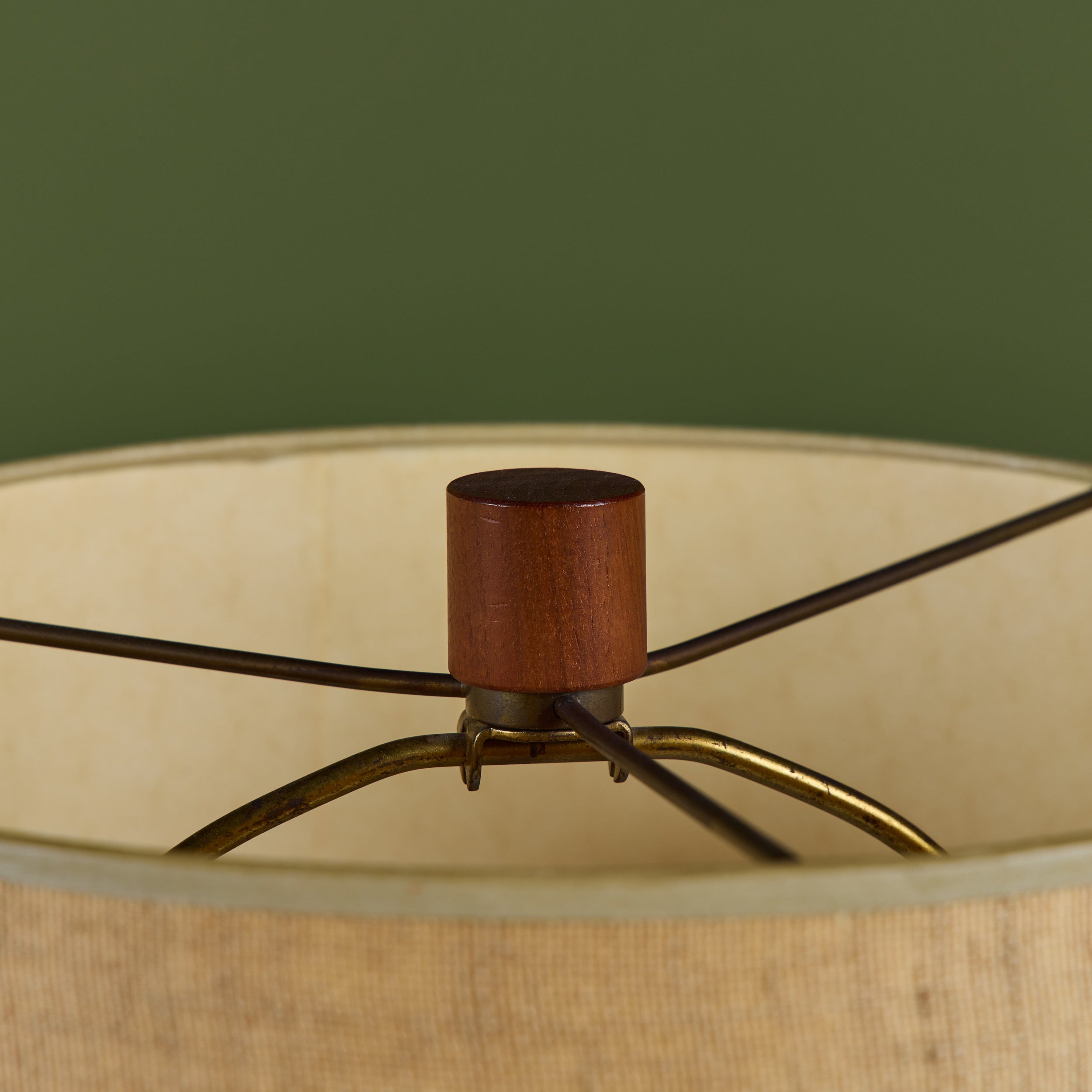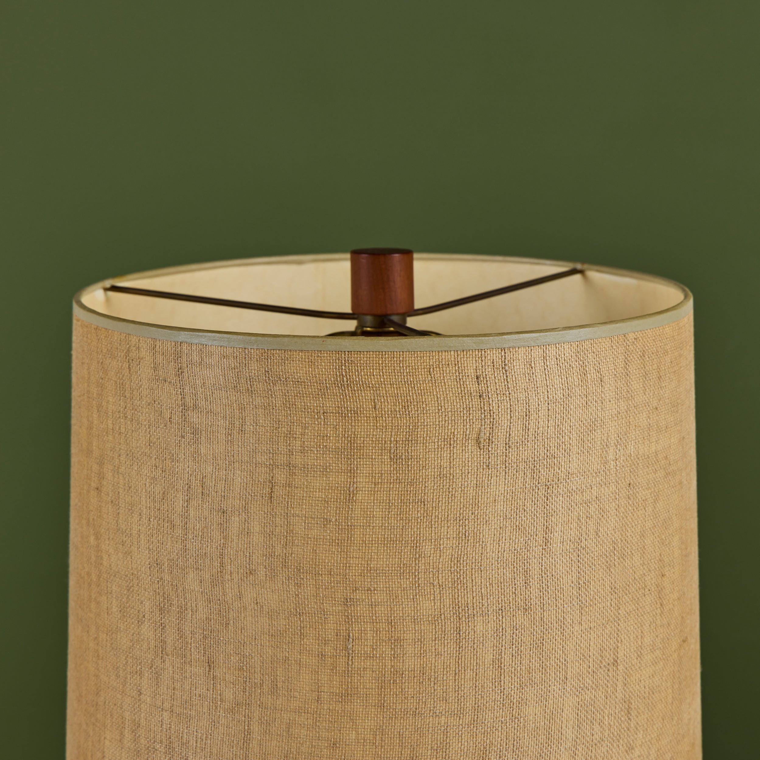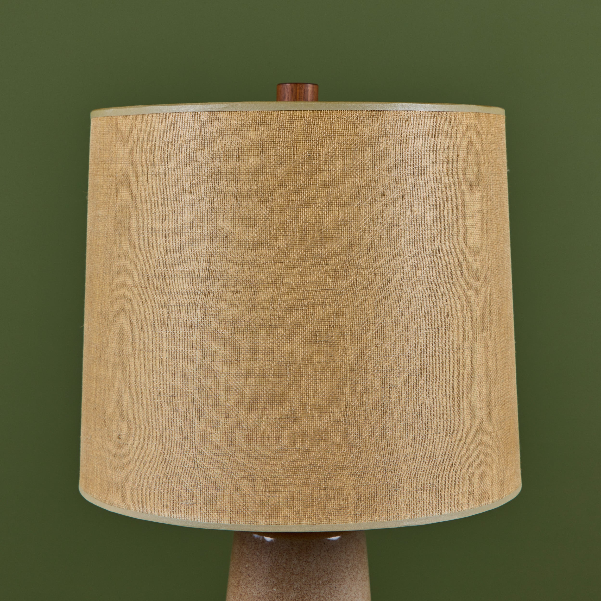 Pair of striking ceramic table lamps by husband-and-wife design team Gordon and Jane Martz. Produced by their family company, Marshall Studios in Indiana beginning in 1957. The lamps feature a speckle cream and tan glaze with walnut finial. They have their original shades and have been newly rewired.