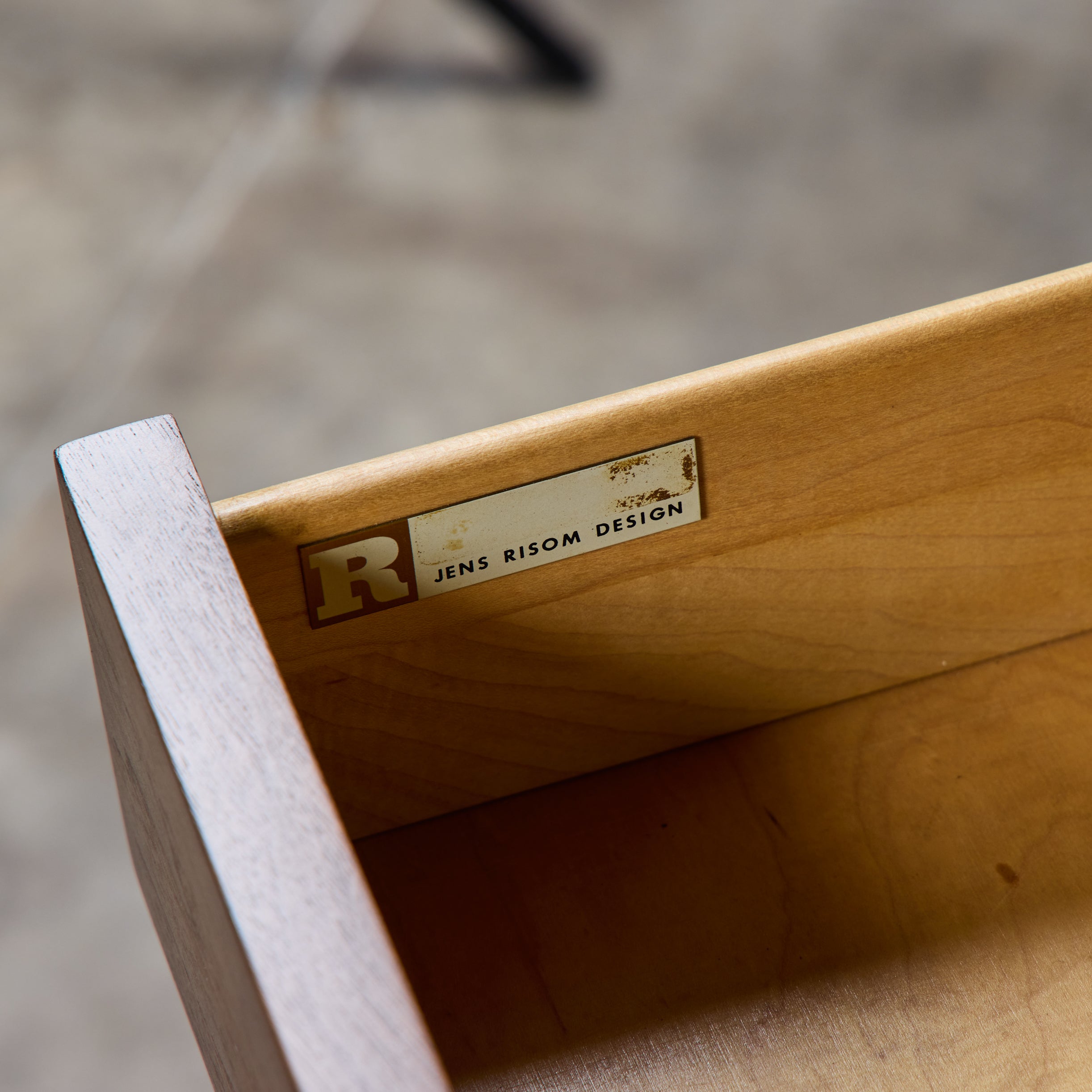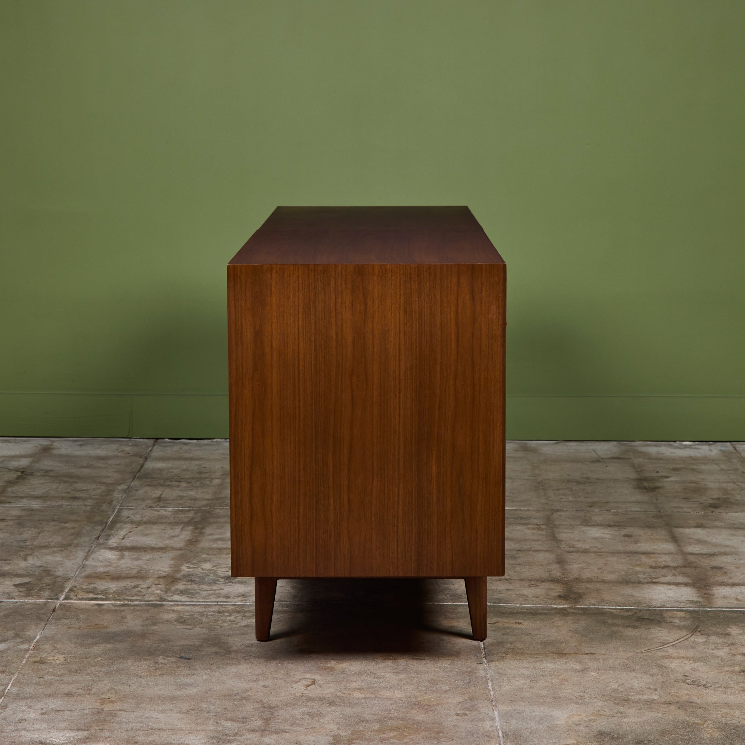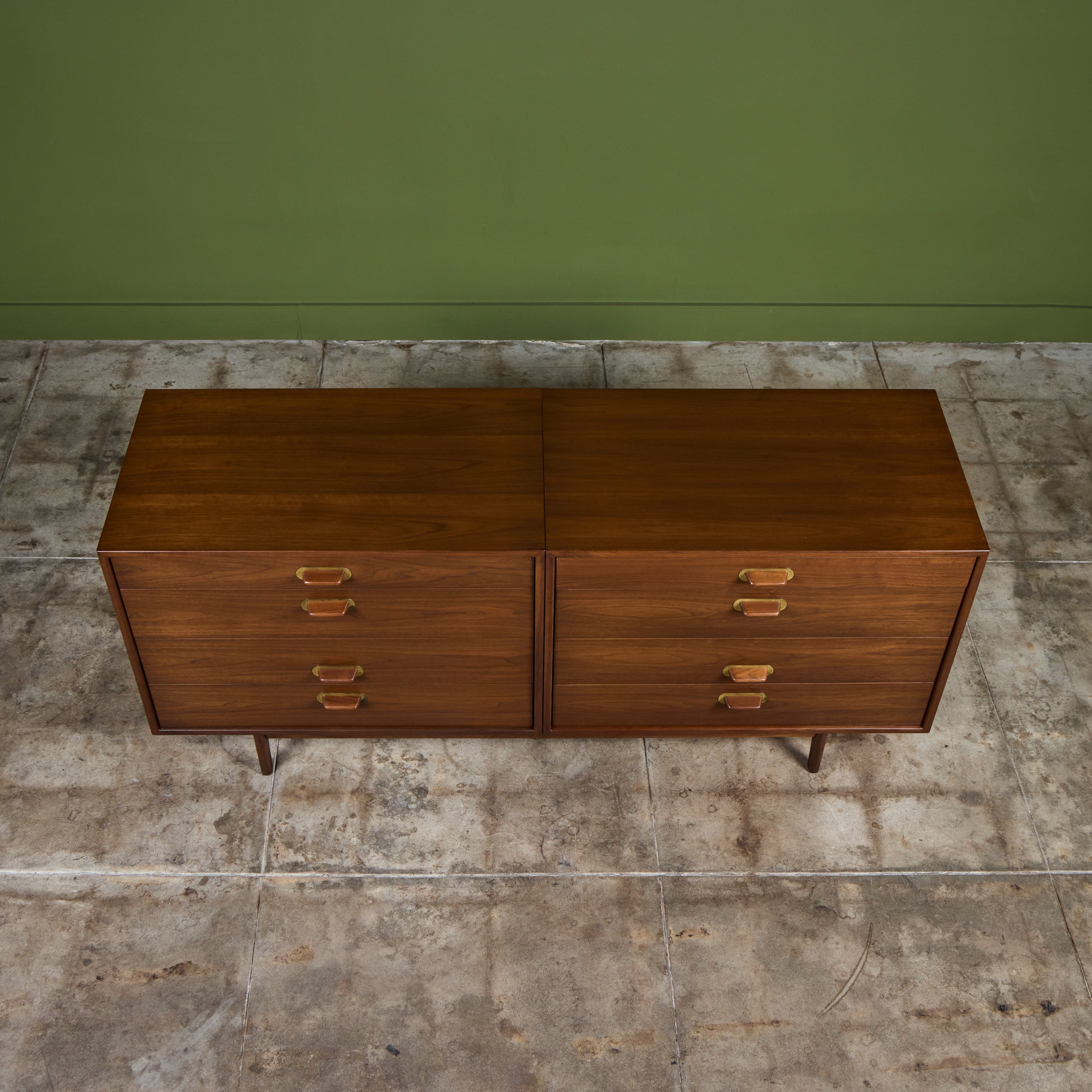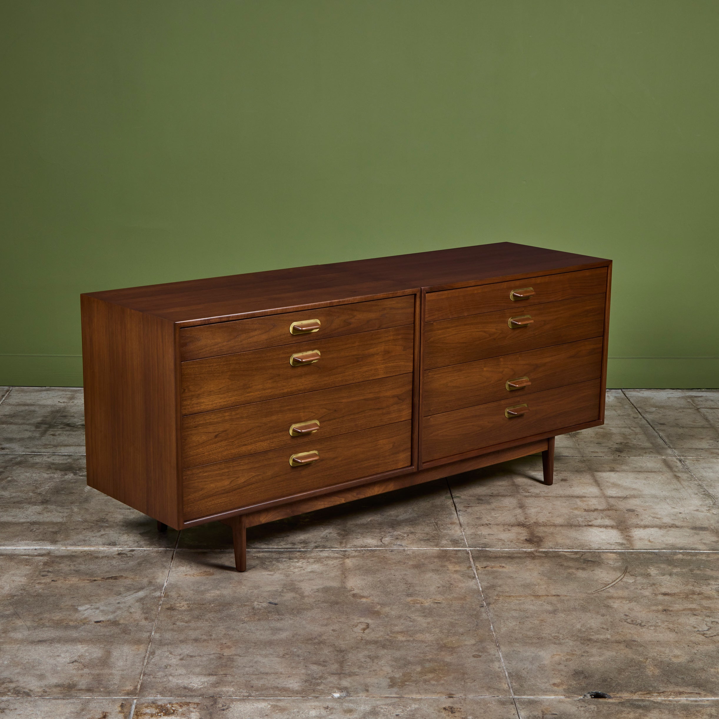 Designed by Jens Risom, c.1960s, USA. This eight drawer walnut dresser features two narrow top drawers and six larger drawers below. One of the narrow drawers has a fold down drawer front and can be used as a desk or vanity. The walnut handles have a brass plate detail. The dresser rests on four tapered legs.