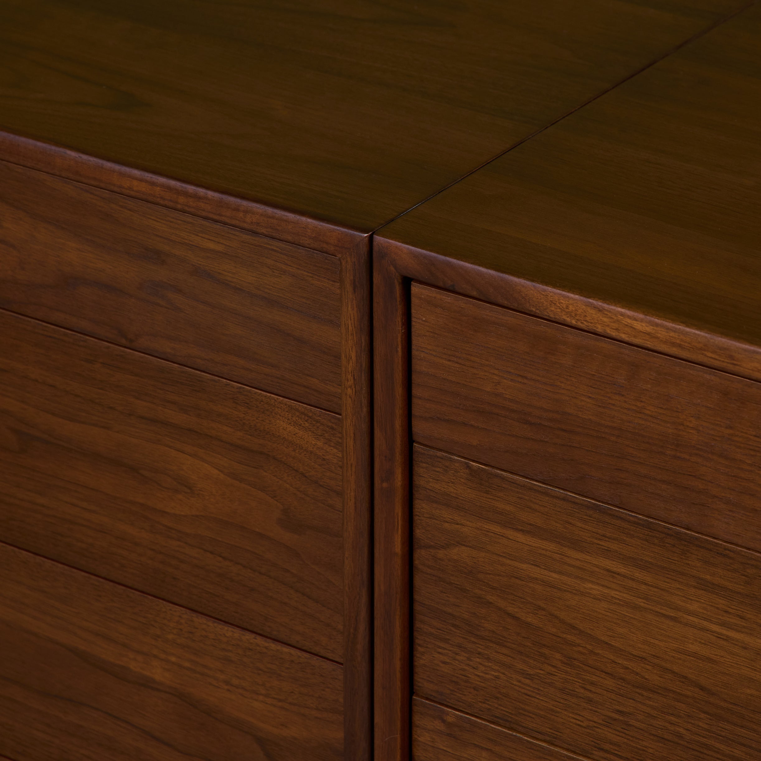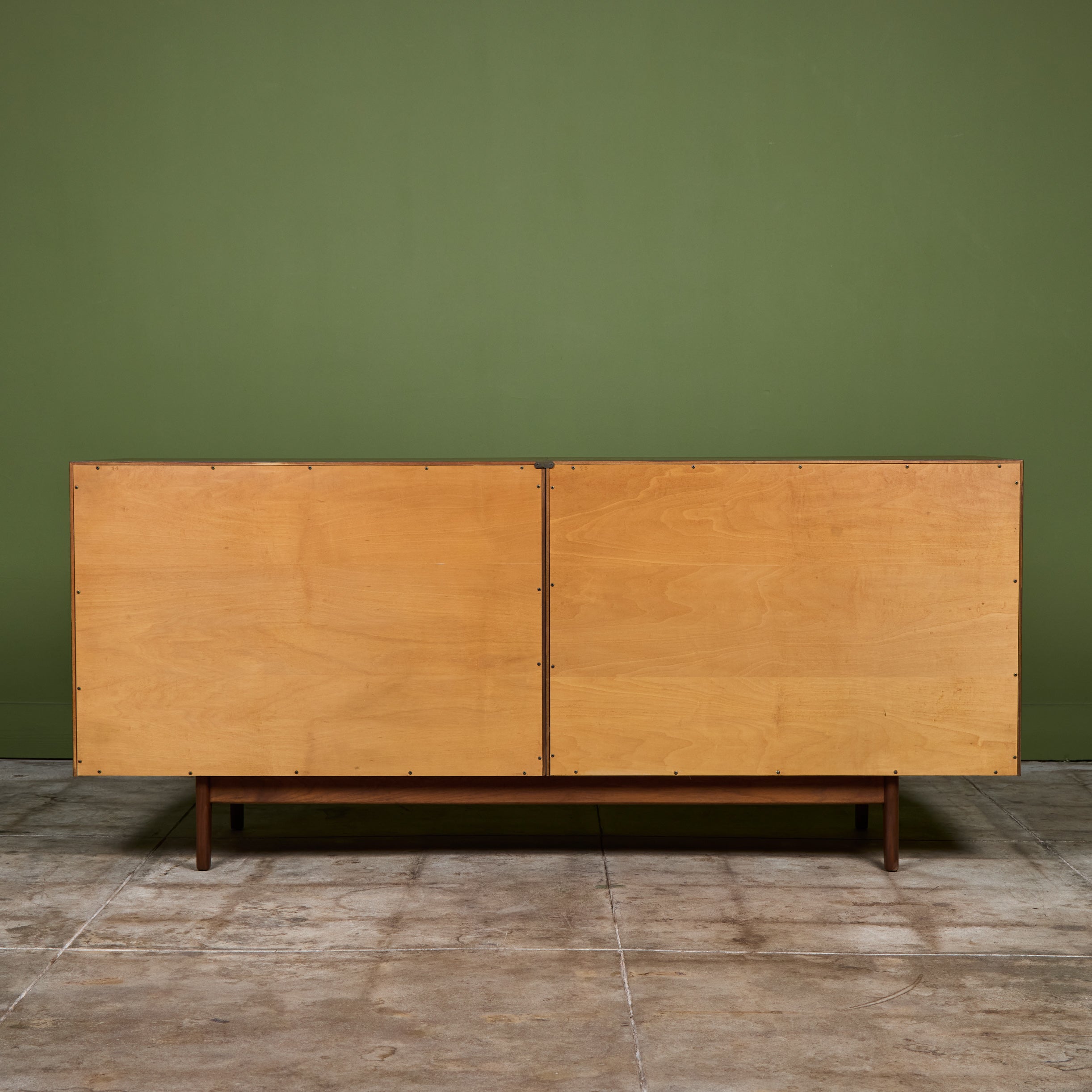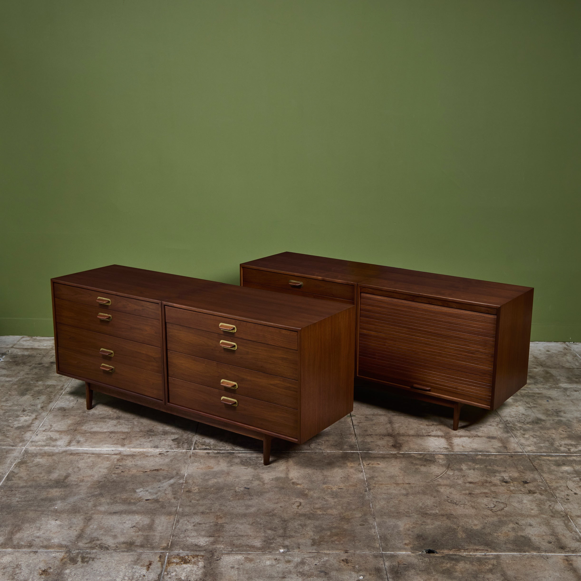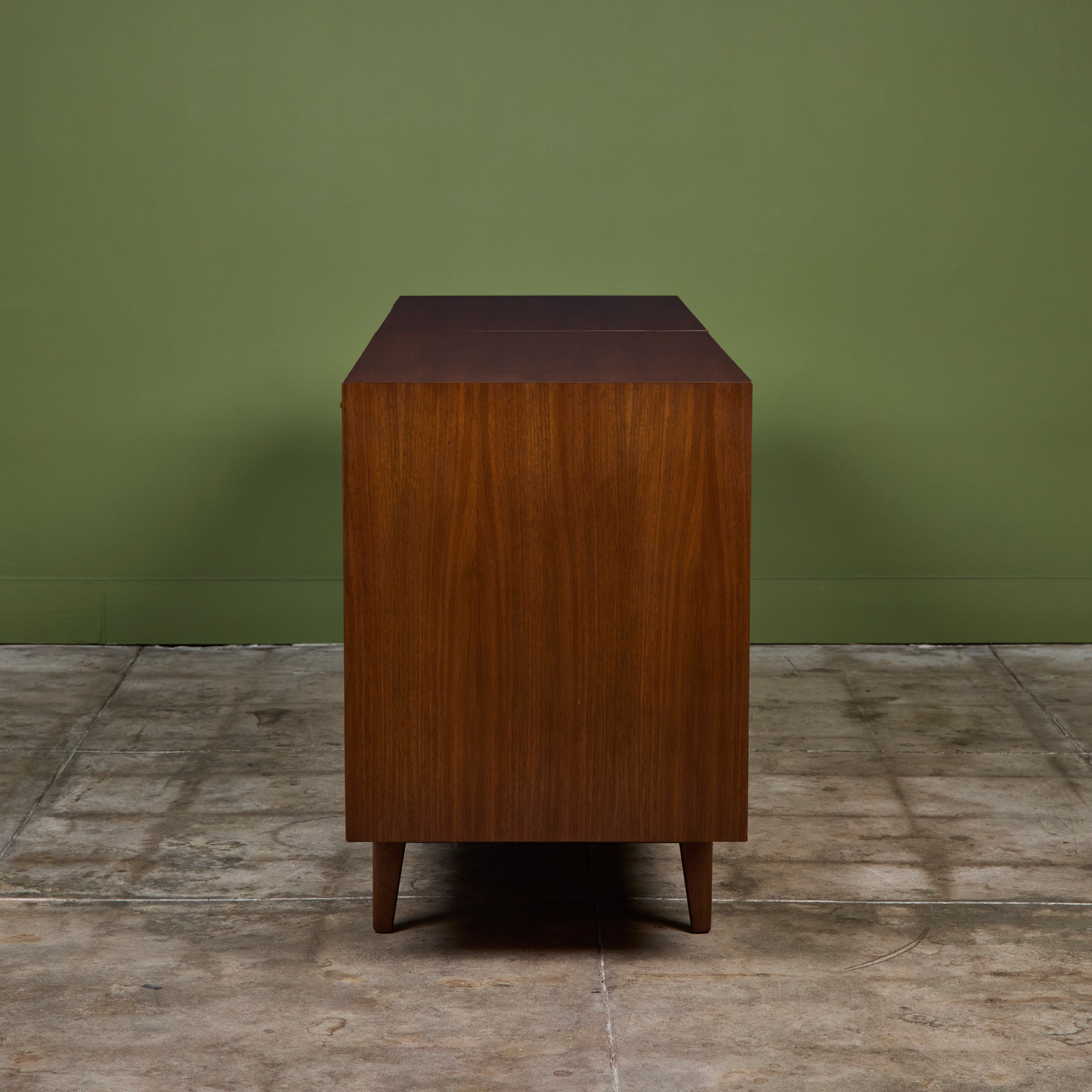 Designed by Jens Risom, c.1960s, USA. This eight drawer walnut dresser features two narrow top drawers and six larger drawers below. One of the narrow drawers has a fold down drawer front and can be used as a desk or vanity. The walnut handles have a brass plate detail. The dresser rests on four tapered legs.