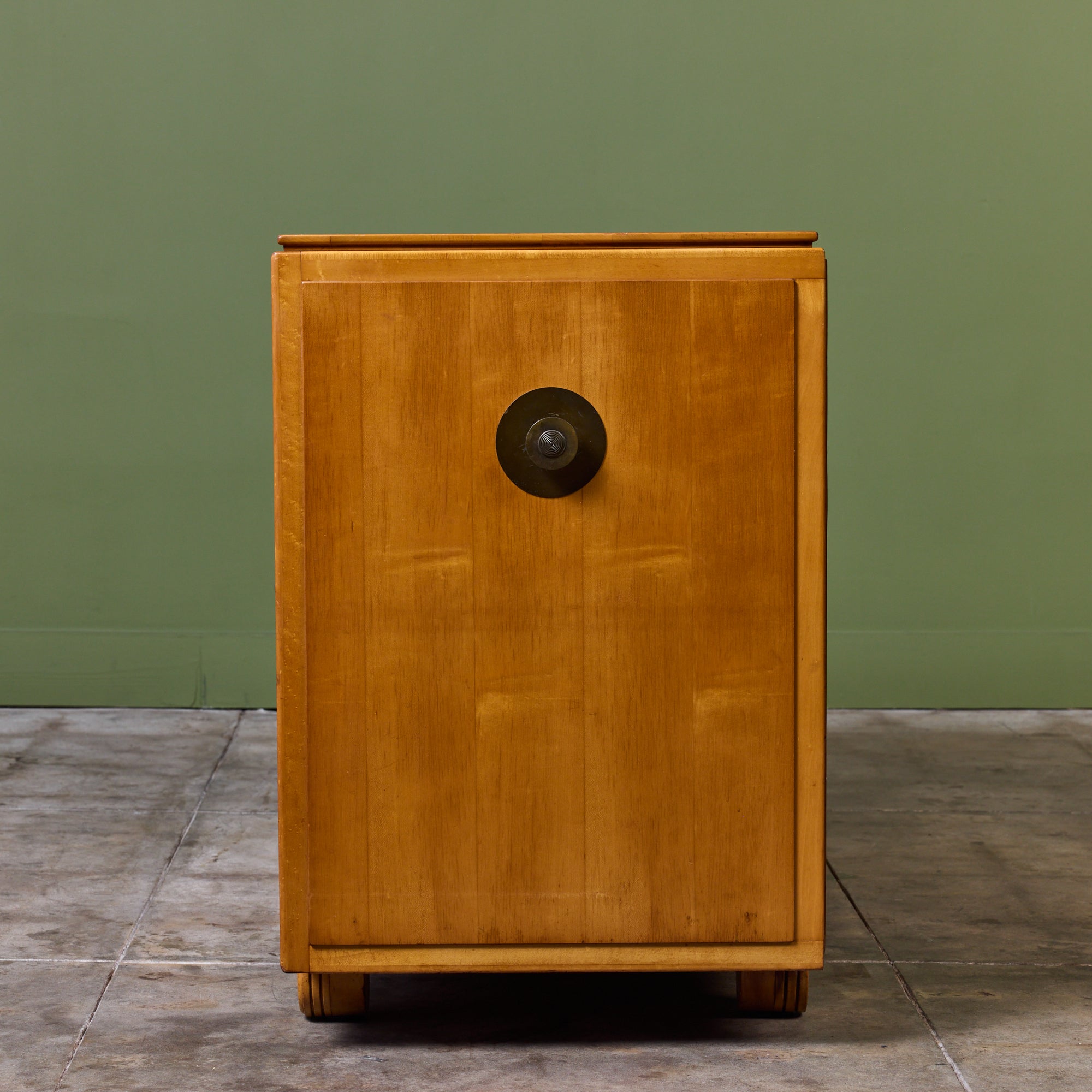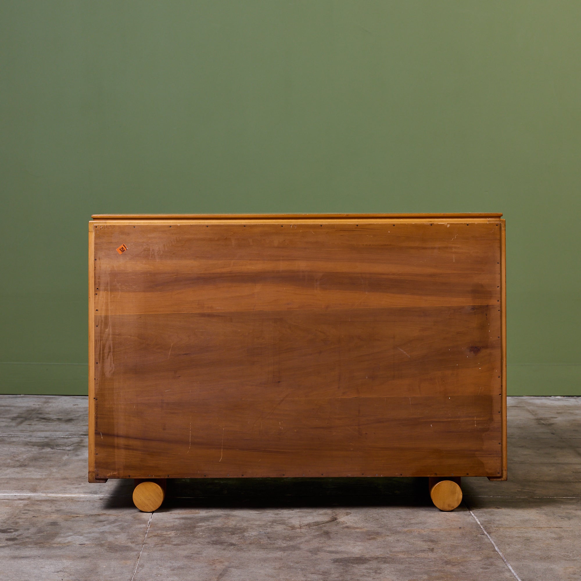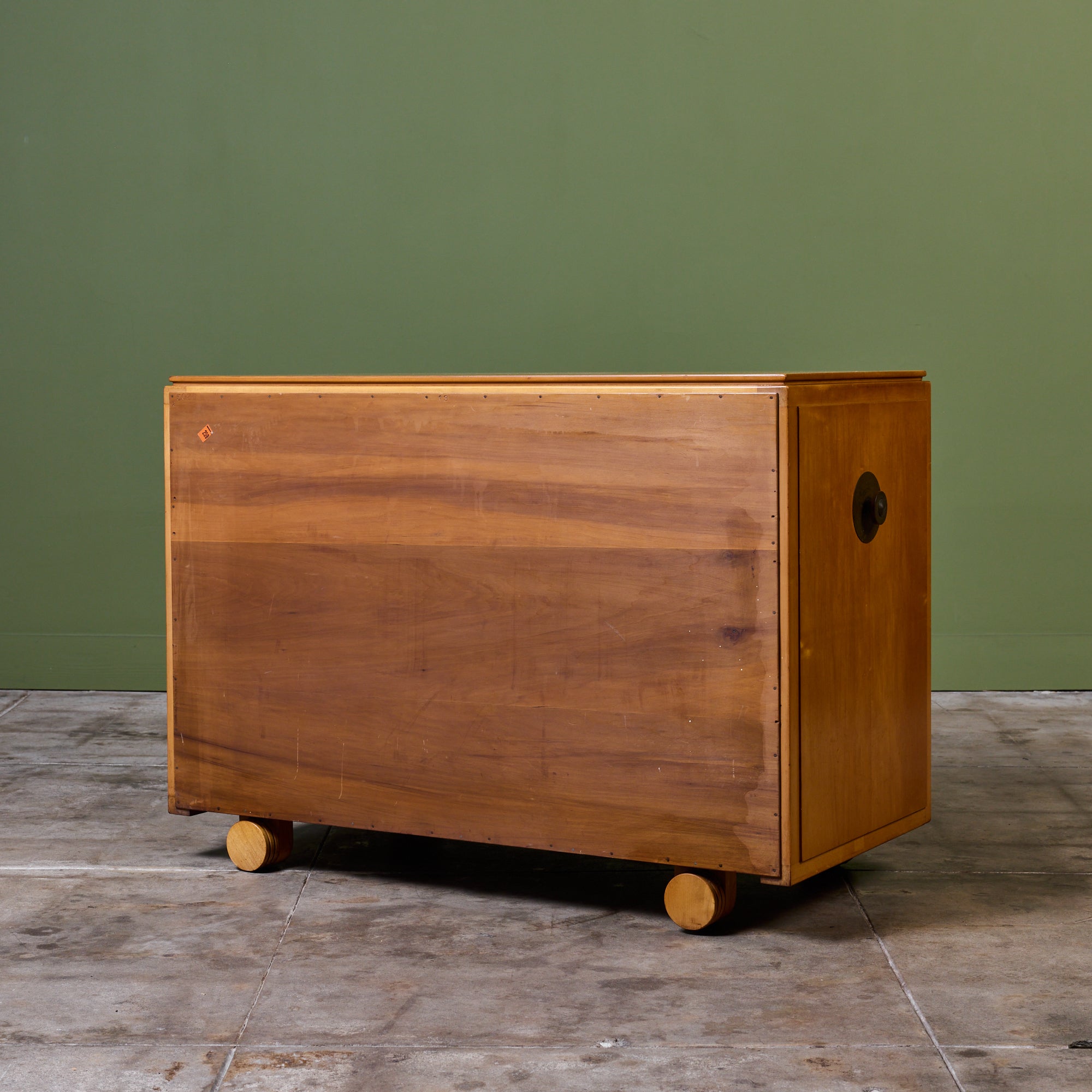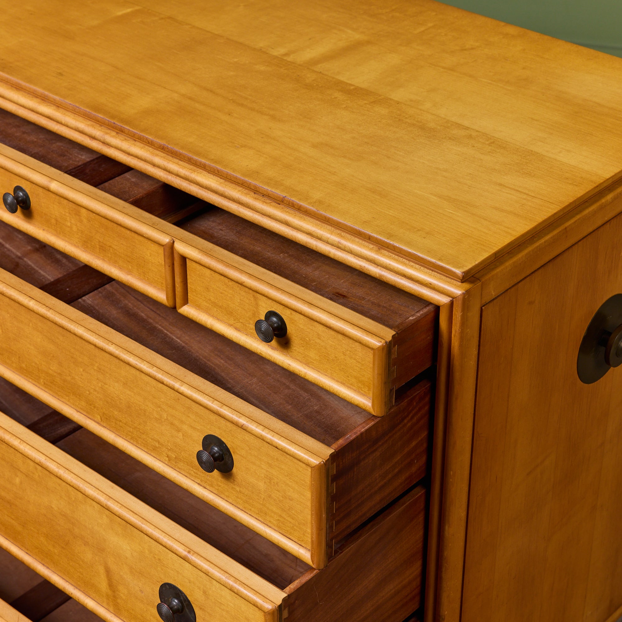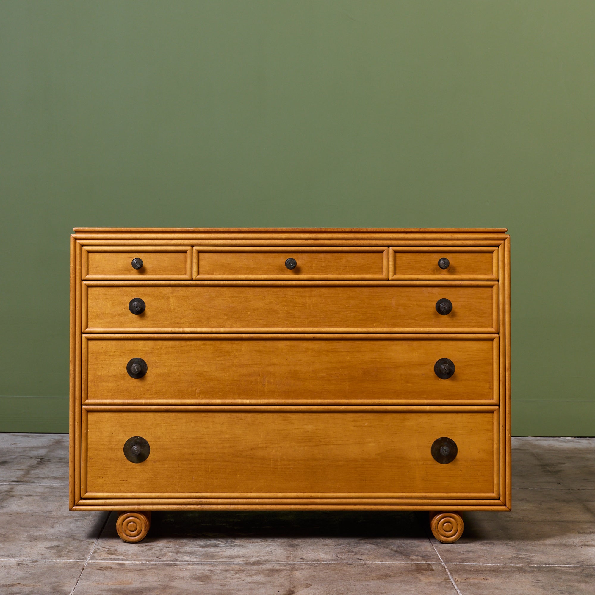 Maple dresser from the Johnson Furniture Company of Grand Rapids, Michigan. Known for their collaborations with modernist icons, like Paul Frankl and Eliel Saarinen. This piece embodies the functional elegance and structural integrity that defined the "Furniture City" during its golden era. The dresser features four drawers with the largest at the bottom. Each drawer is finished with a circular drawer pull, mimicking the dressers feet.
