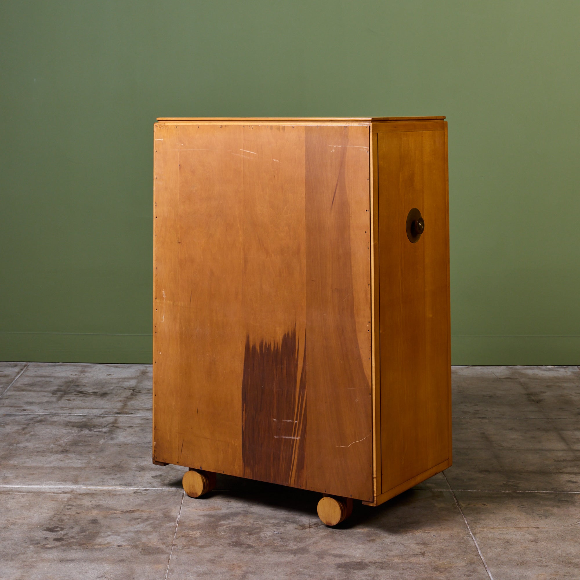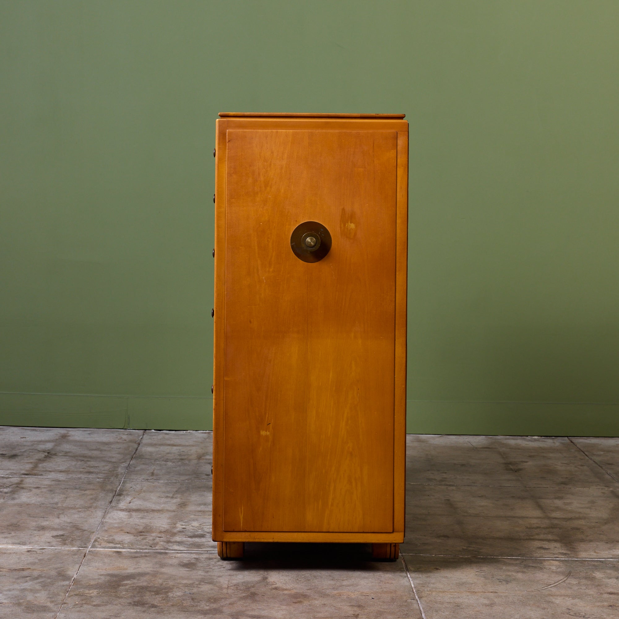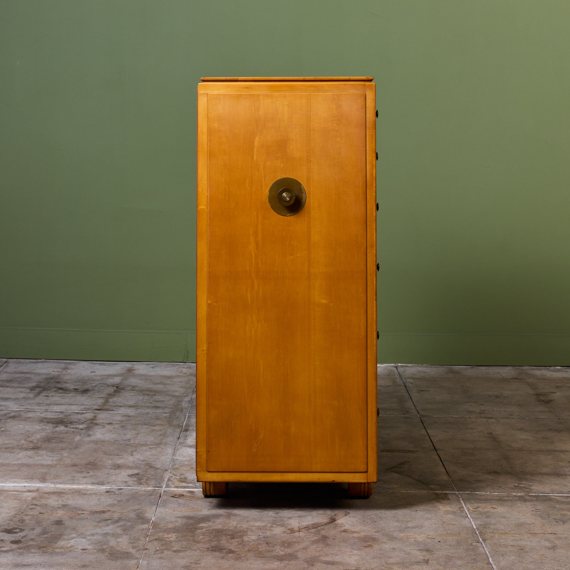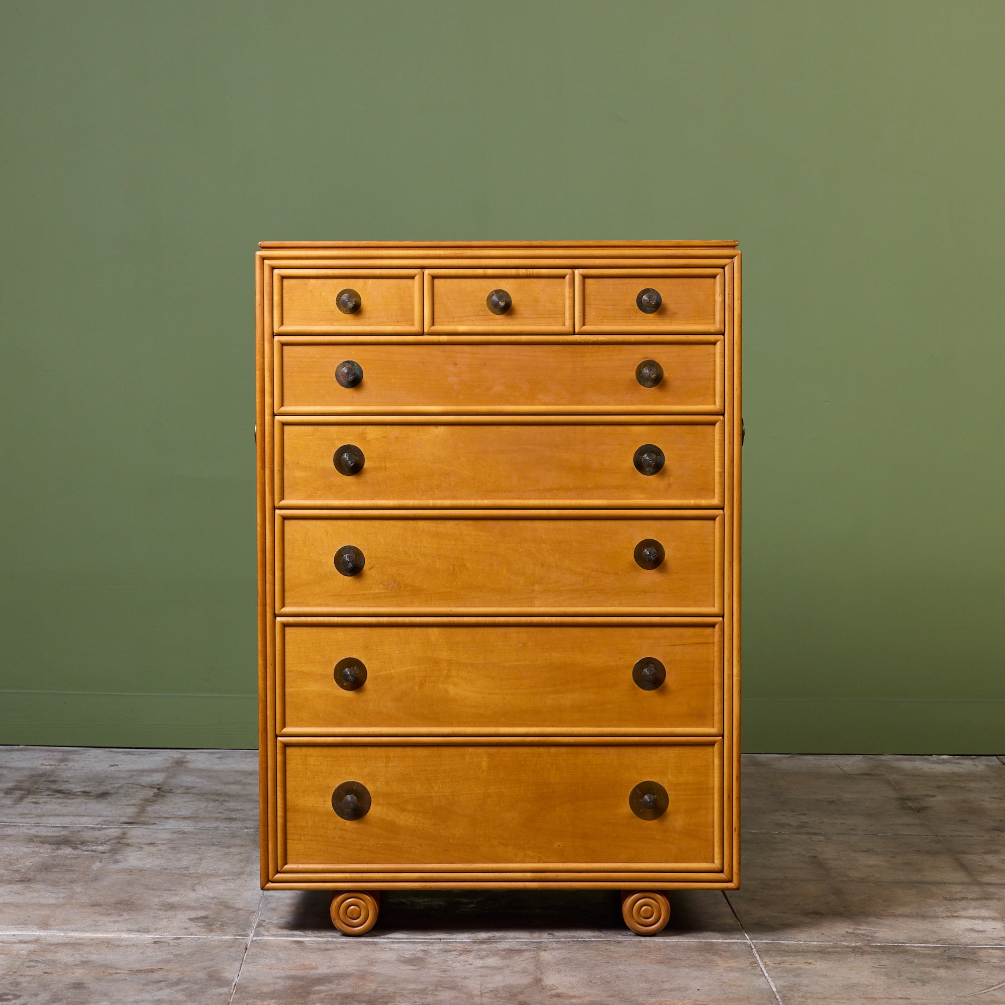 Maple highboy dresser from the Johnson Furniture Company of Grand Rapids, Michigan. Known for their collaborations with modernist icons, like Paul Frankl and Eliel Saarinen. This piece embodies the functional elegance and structural integrity that defined the "Furniture City" during its golden era. The dresser features six drawers with the largest at the bottom. Each drawer is finished with a circular drawer pull, mimicking the dressers feet.