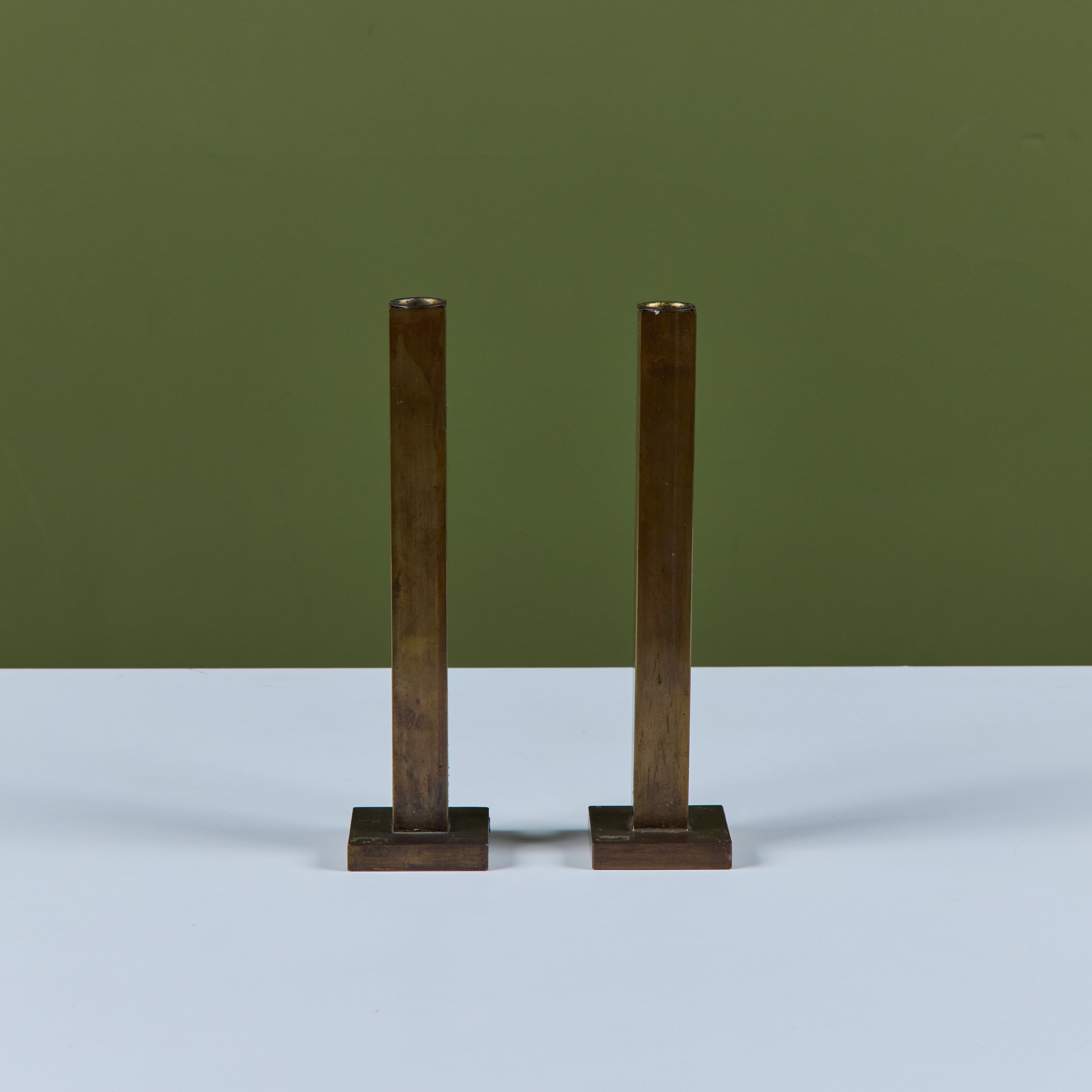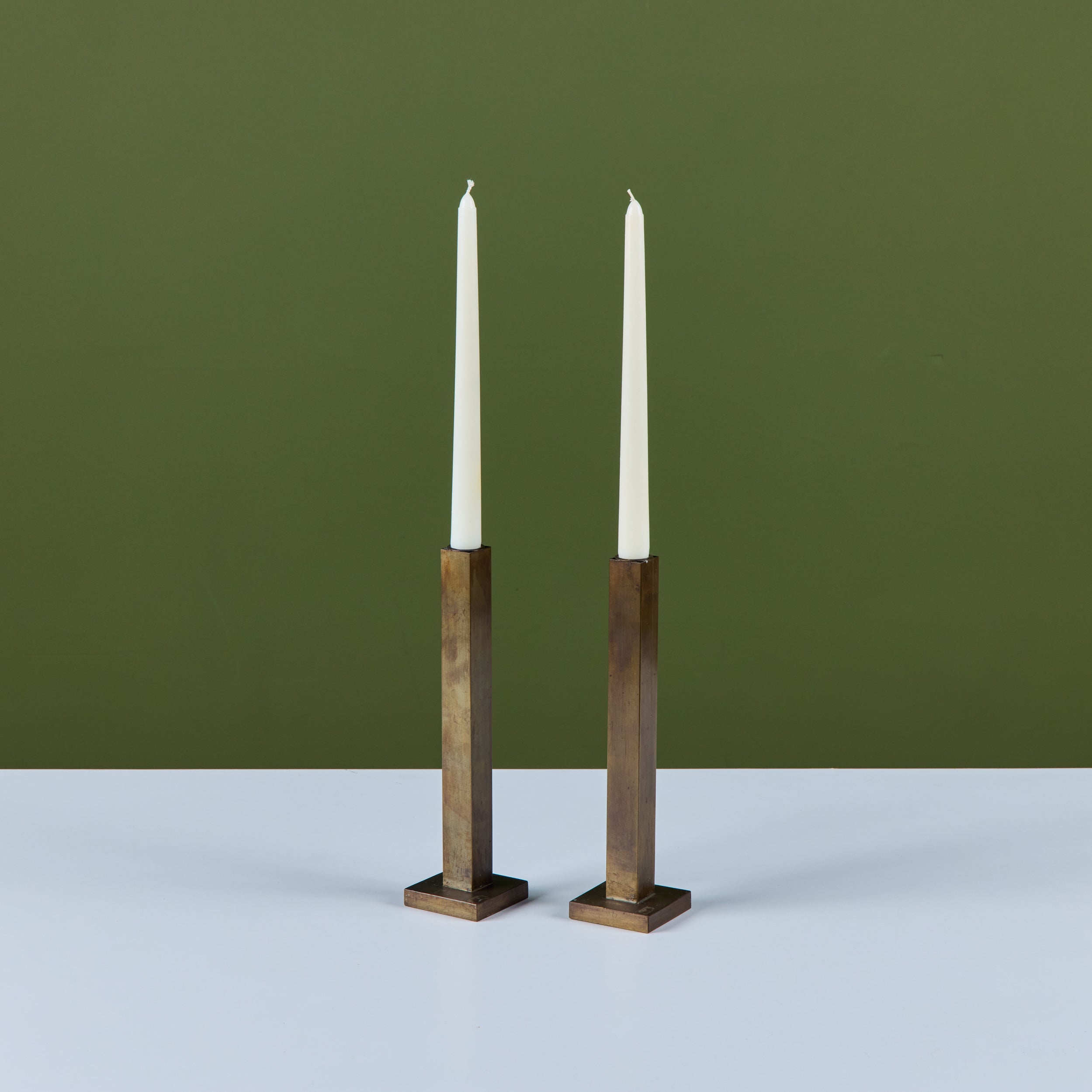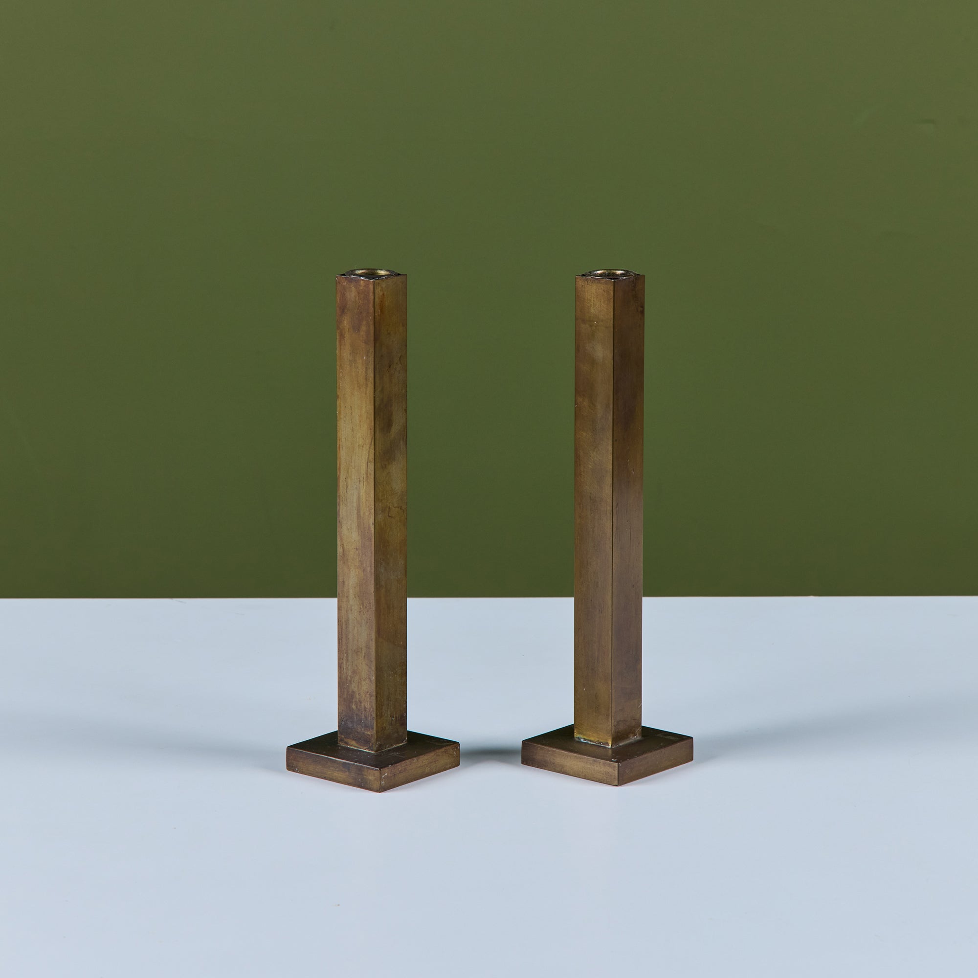 Pair of solid brass minimalist candlesticks by Canadian designer Martha Sturdy. The pair features a square tube stem on a square base.