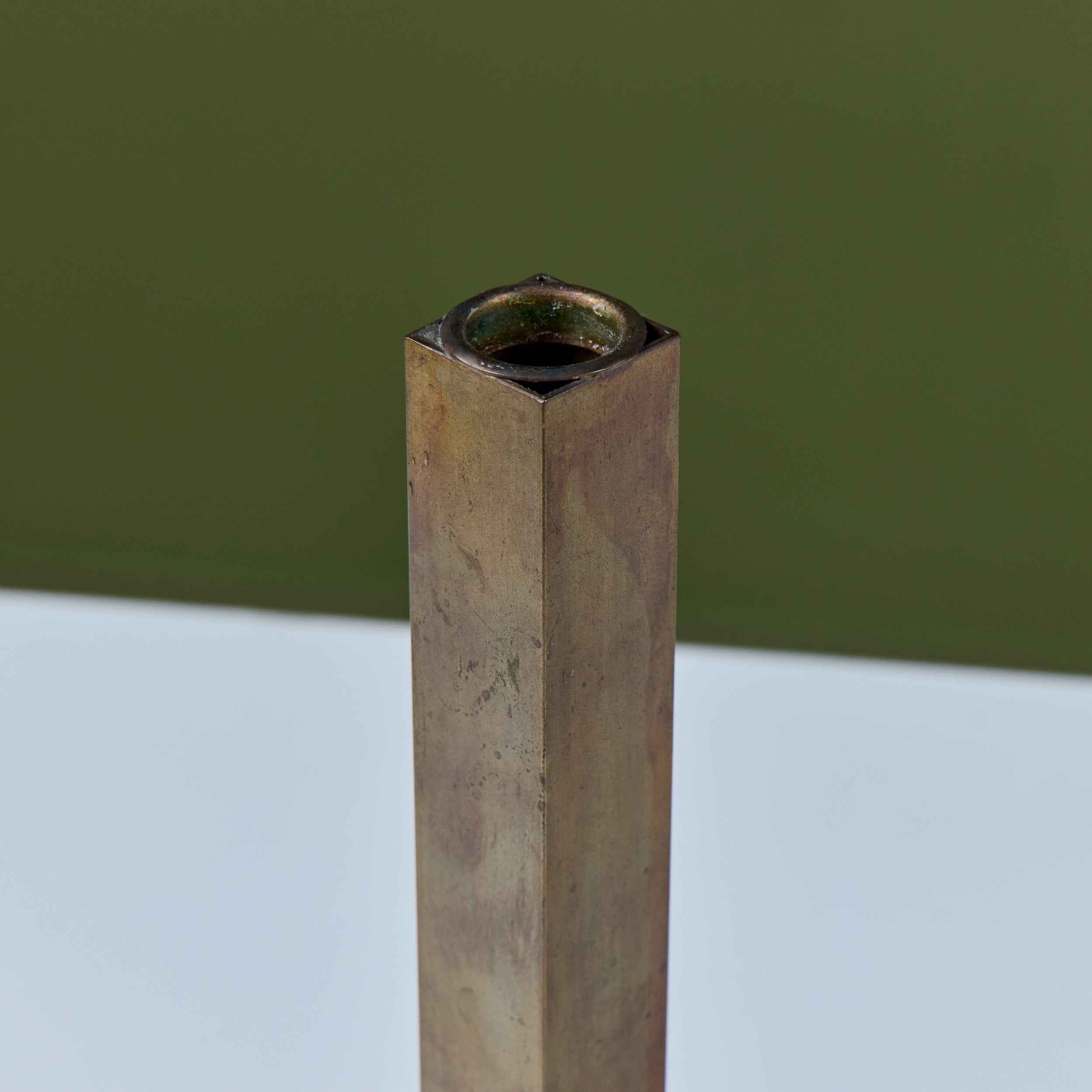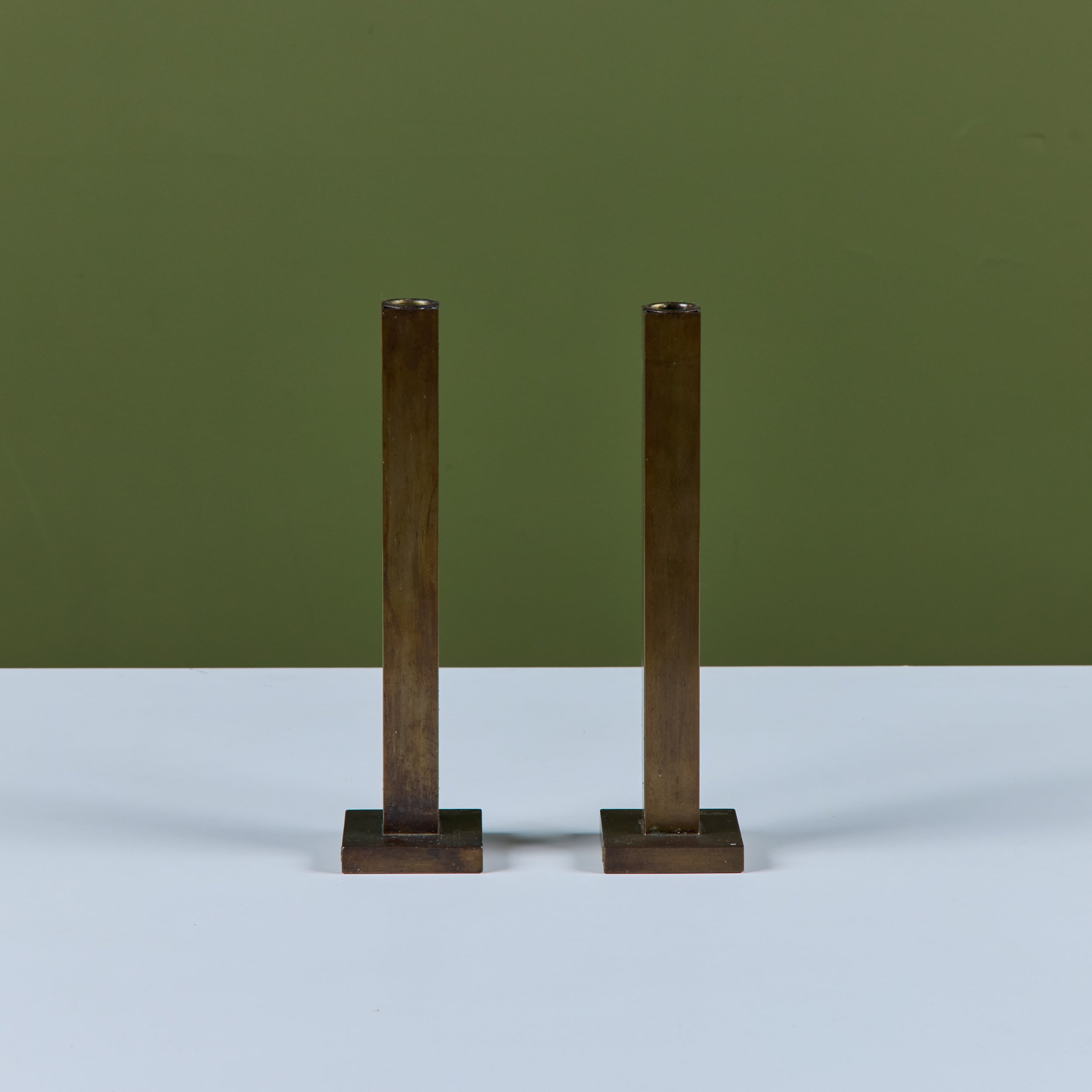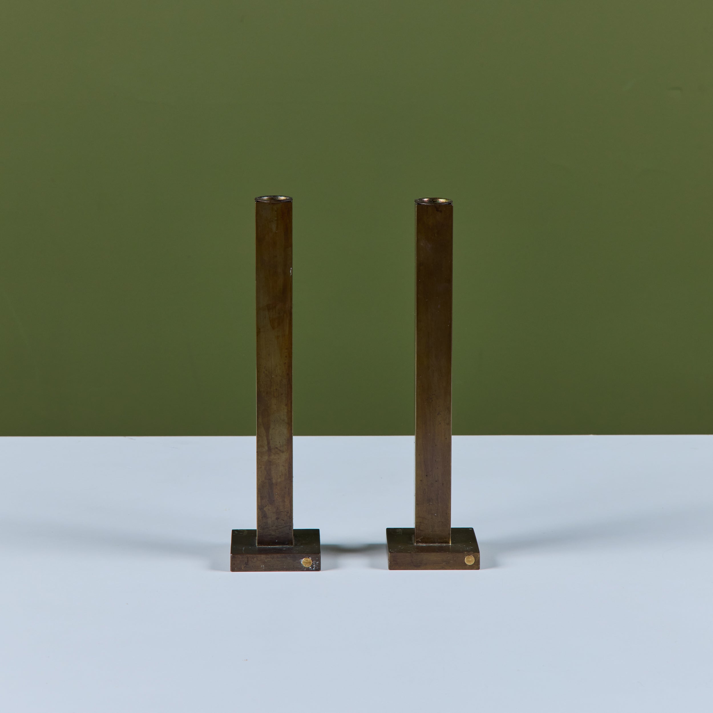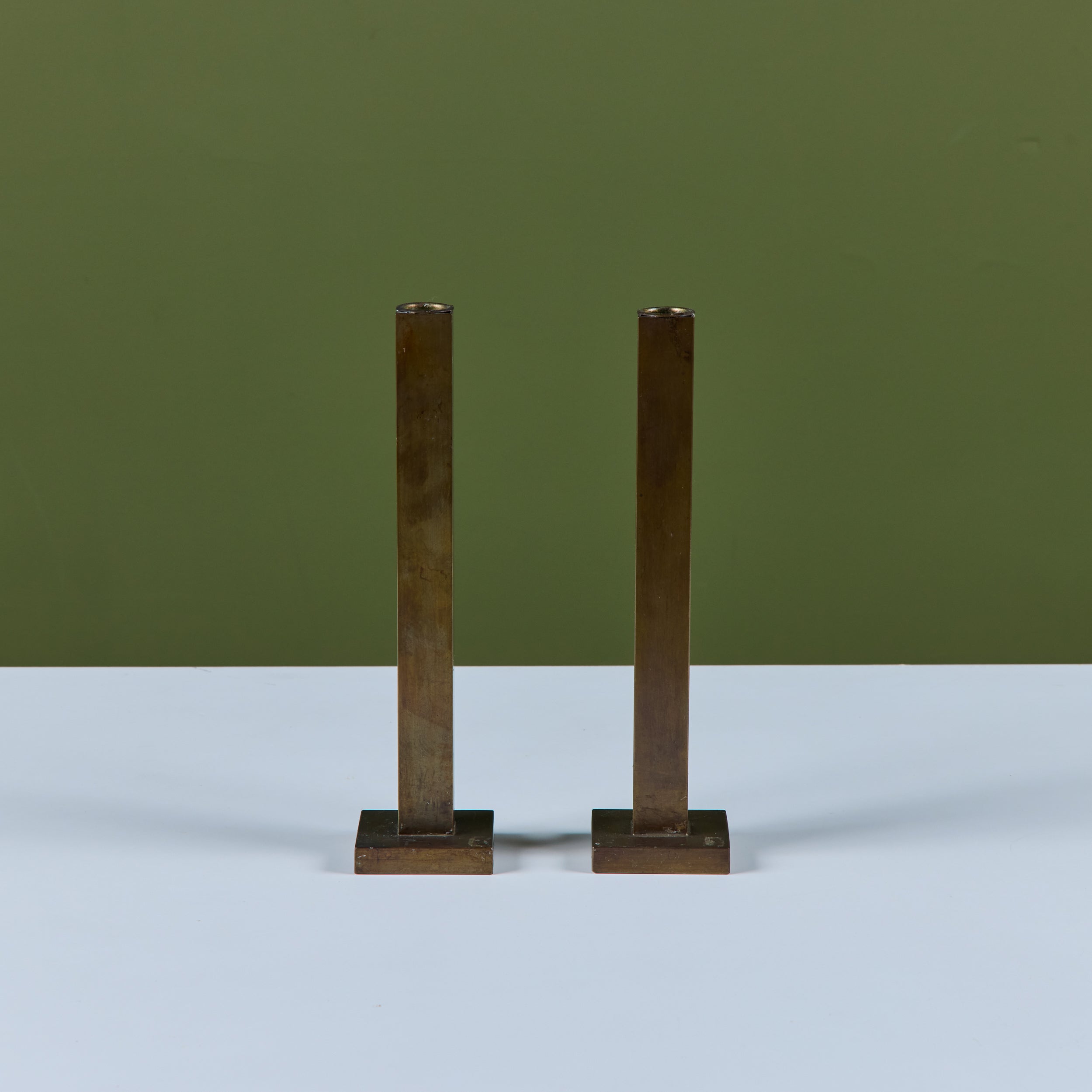 Pair of solid brass minimalist candlesticks by Canadian designer Martha Sturdy. The pair features a square tube stem on a square base.