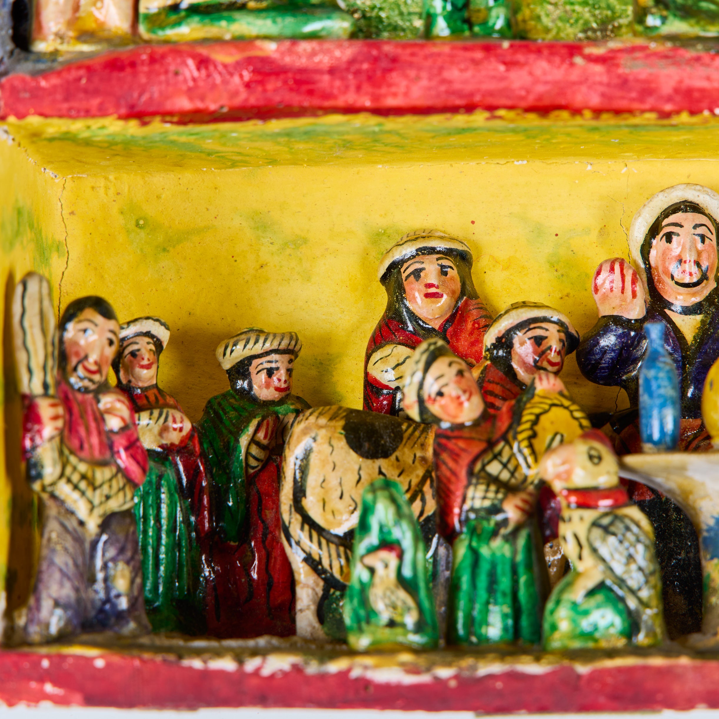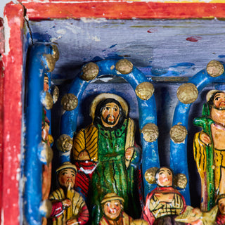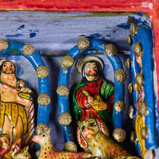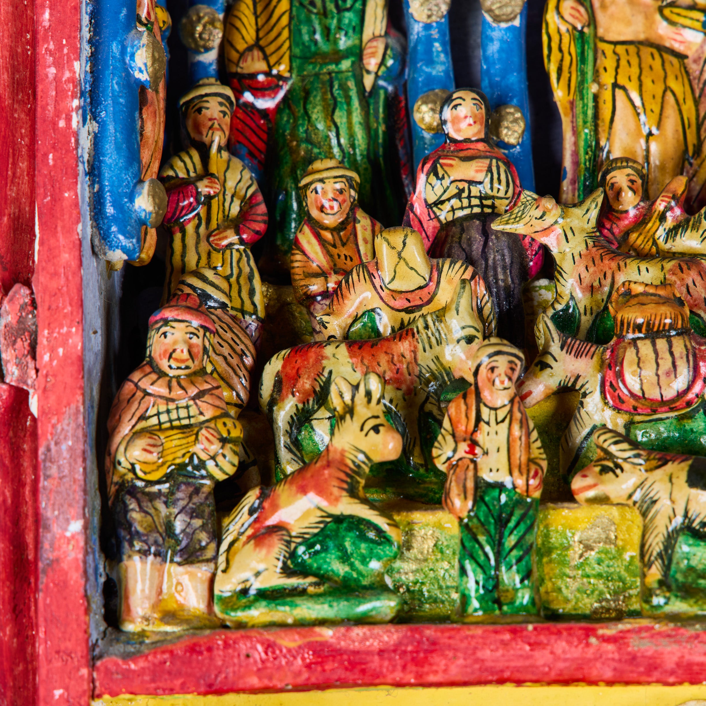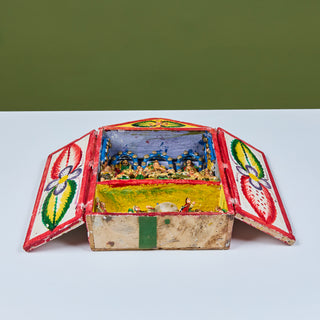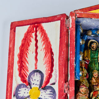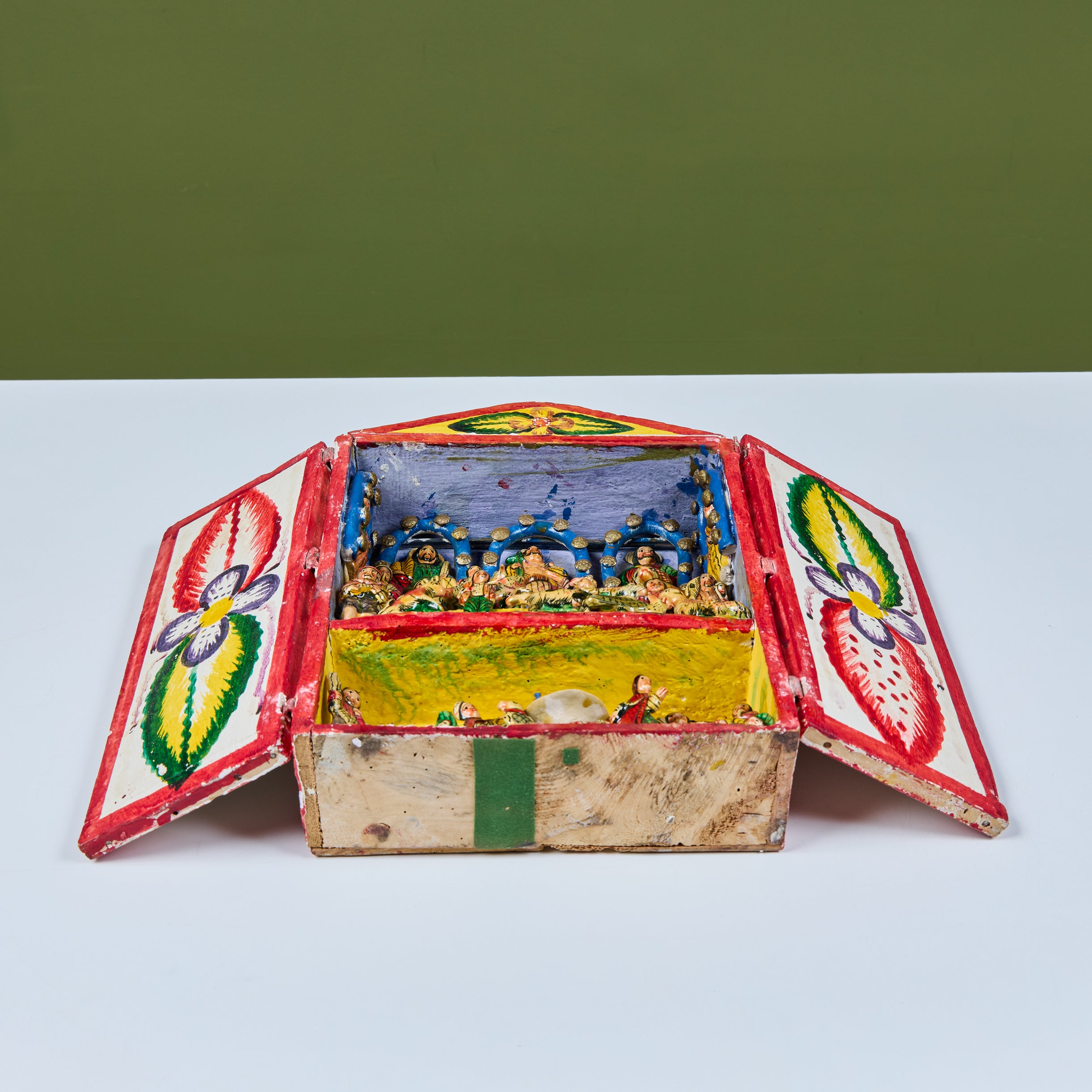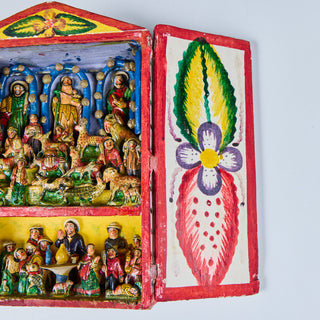 Peruvian retablo purchased from the Evelyn Ackerman estate. This colorful piece features two hinged doors with floral paintings. The interior showcases small ceramic figurines in what appears to be a village celebration of a nativity scene.