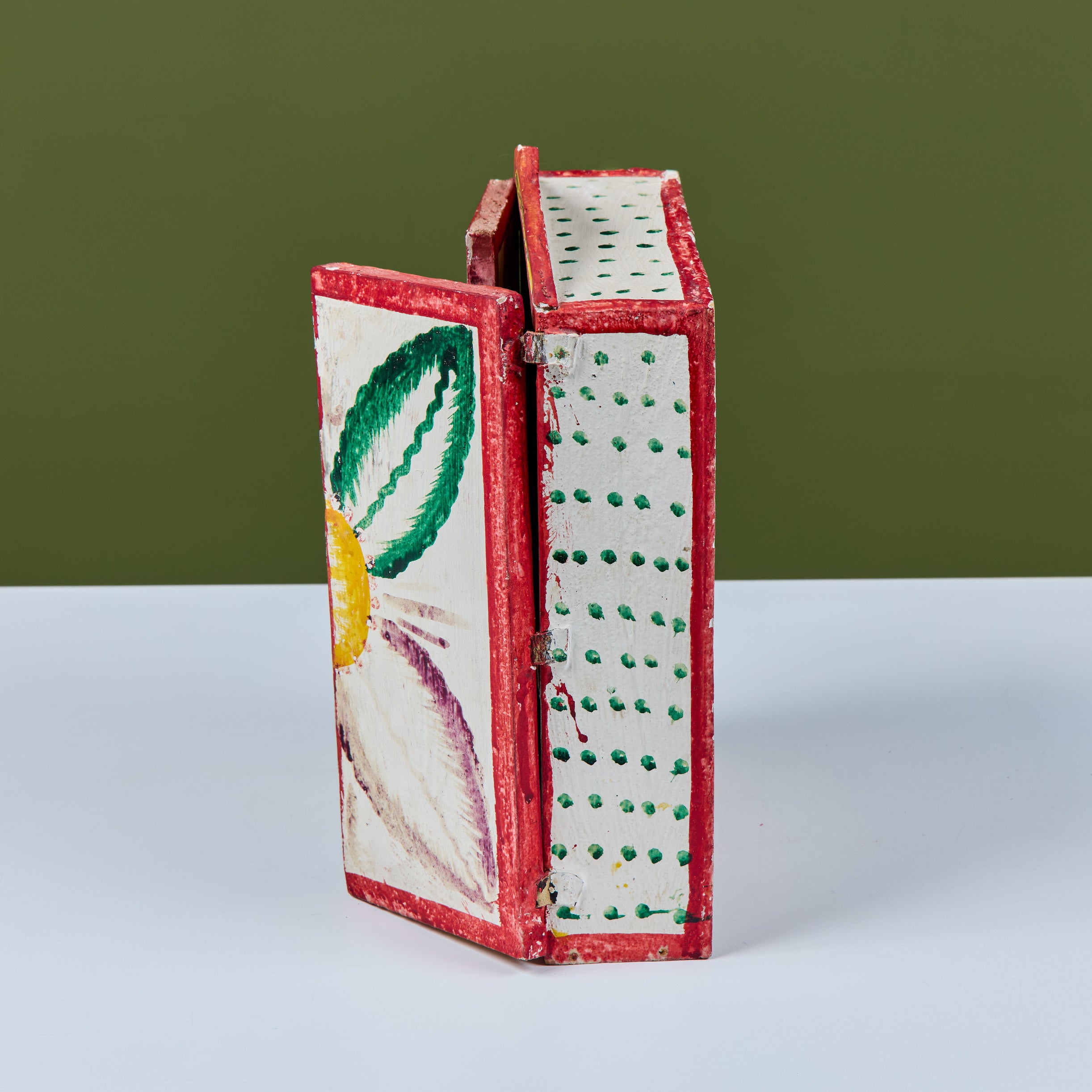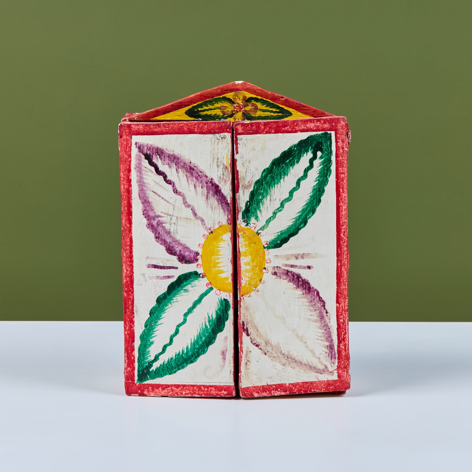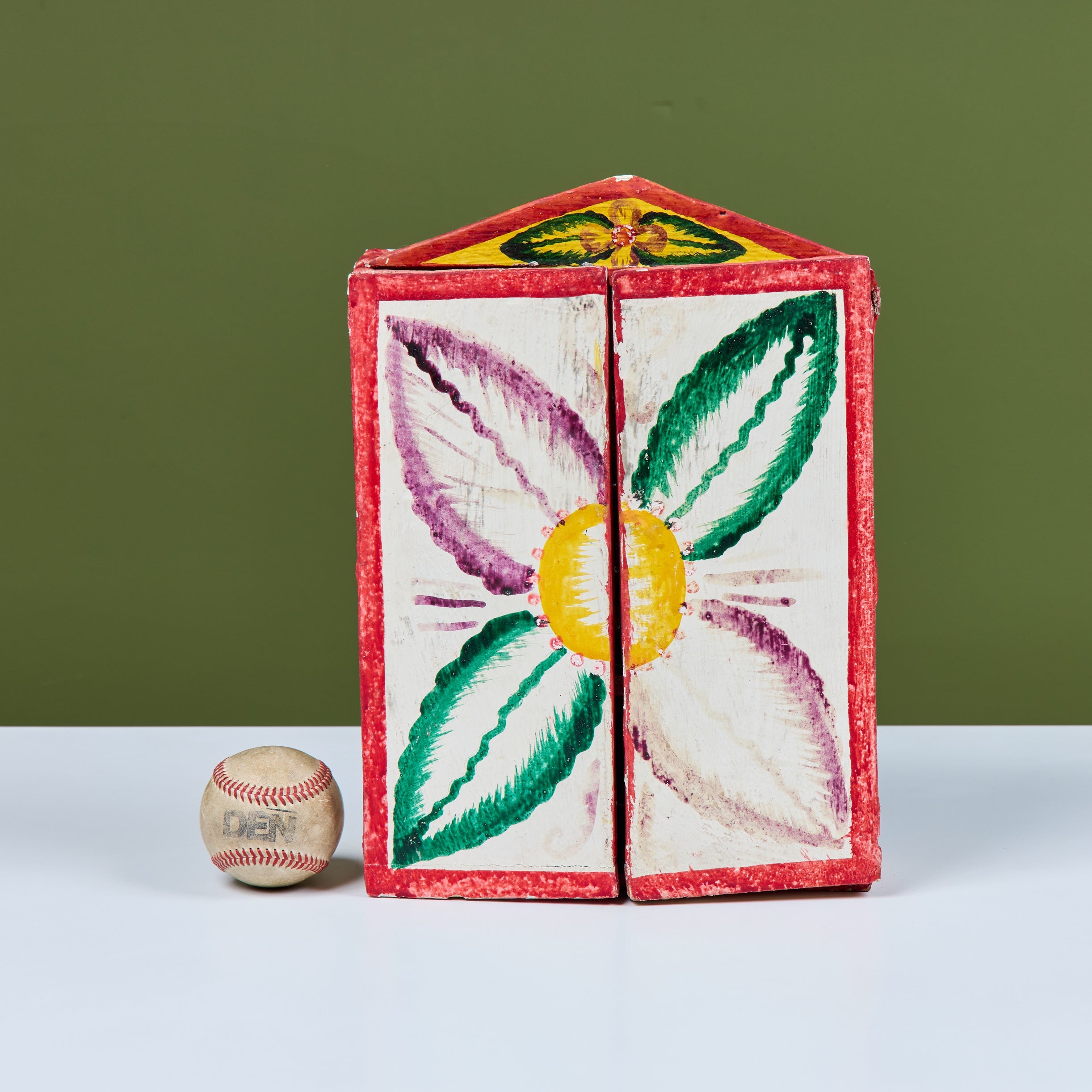 Peruvian retablo purchased from the Evelyn Ackerman estate. This colorful piece features two hinged doors with floral paintings. The interior showcases small ceramic figurines in what appears to be a village celebration of a nativity scene.