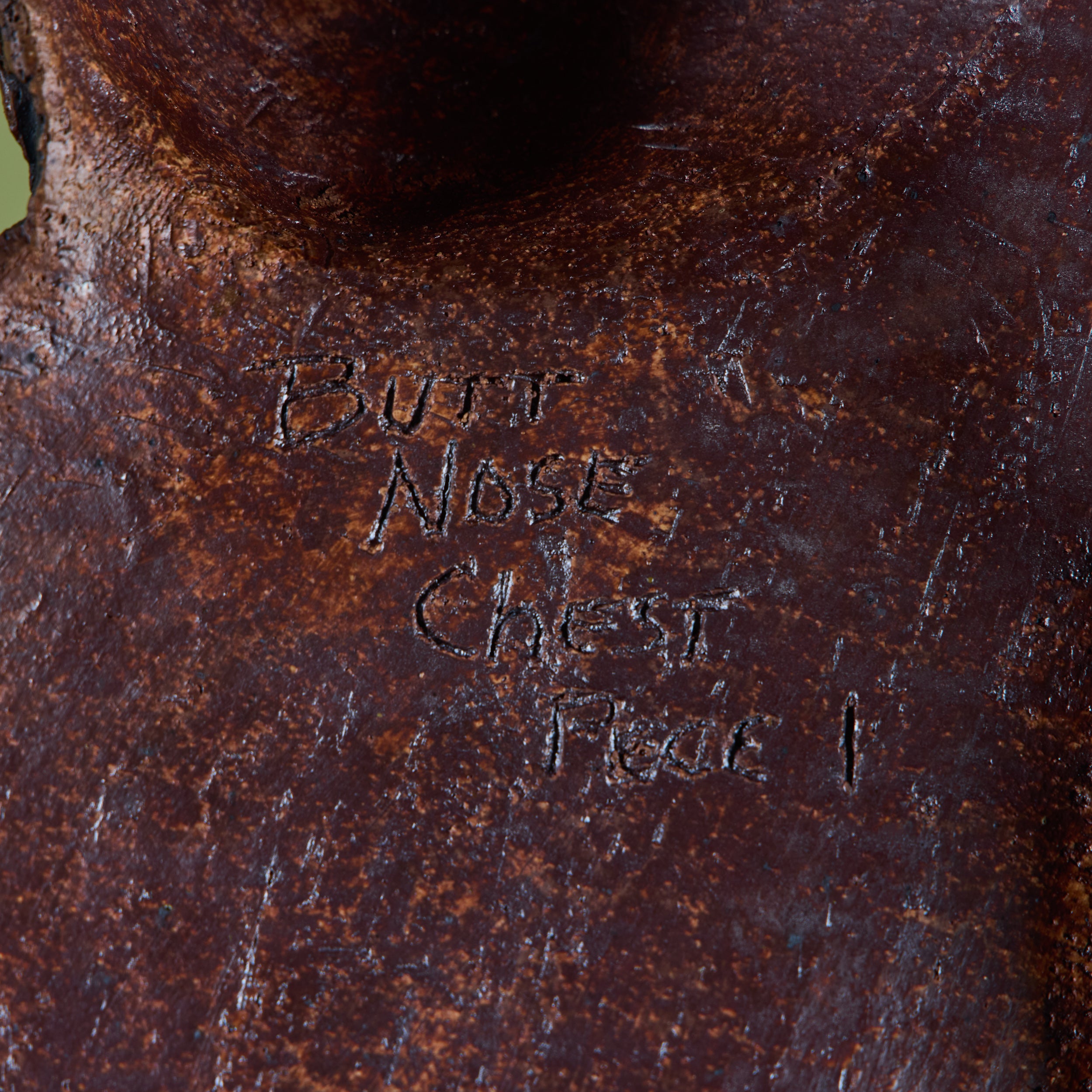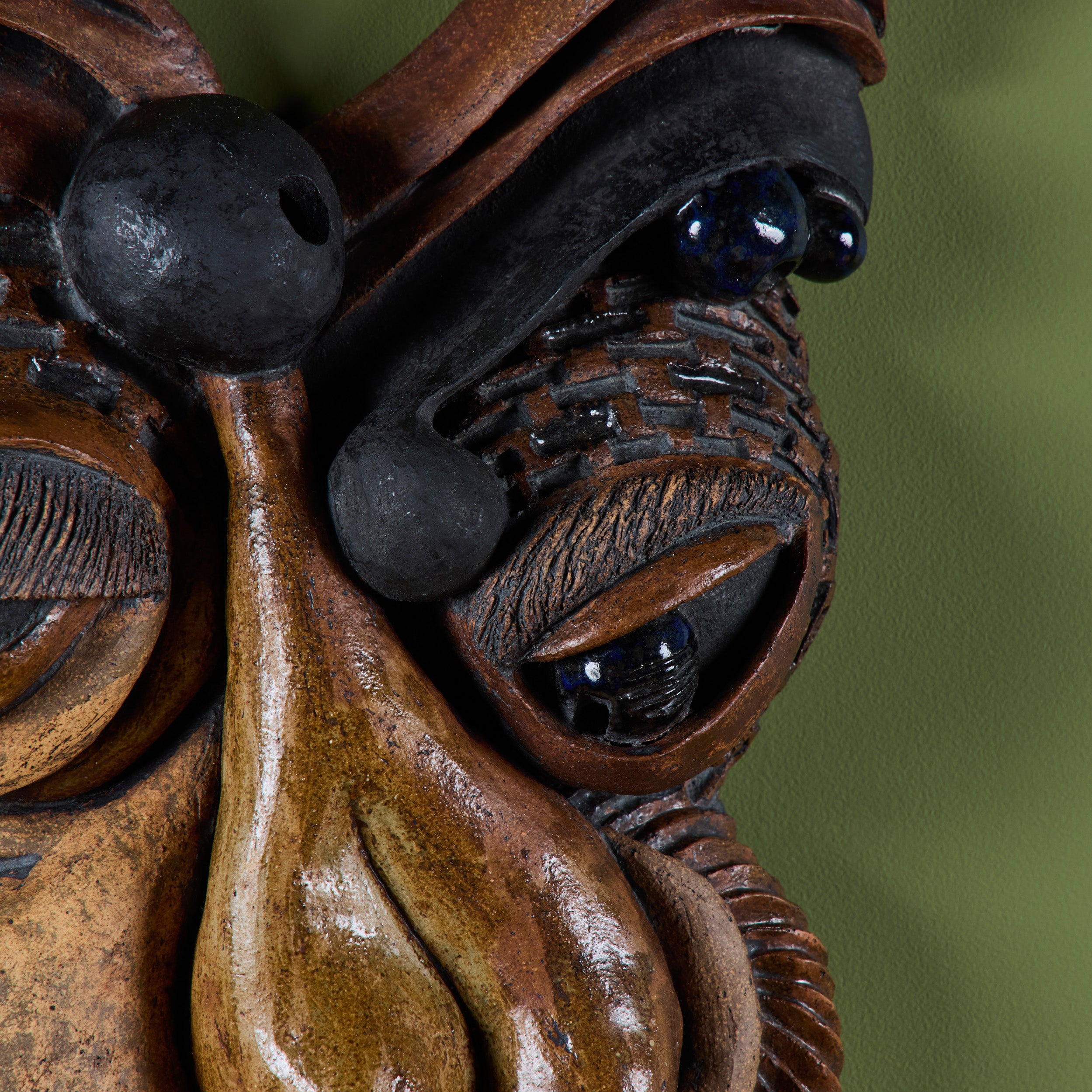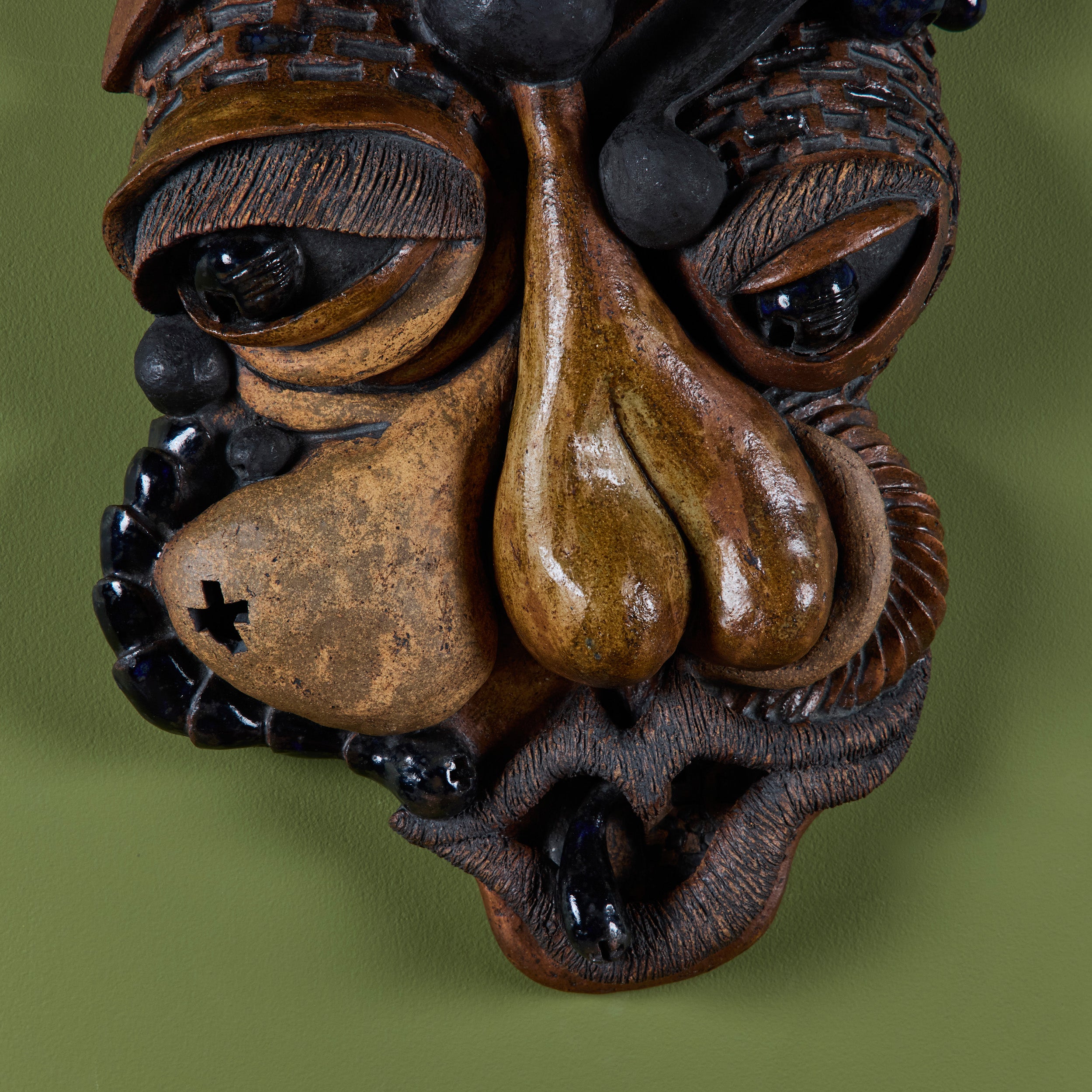 An archival piece from contemporary artist, Dale Wolfield. Wolfield is a New York native currently creating her one of a kind pieces in the Hudson Valley. She self describes her art as using "colored clay engobes in conjunction with relief carving & sgraffito on durable stoneware clay." This piece Looks like a face with a "butt" nose and has two leather straps which can be worn or wall mounted.