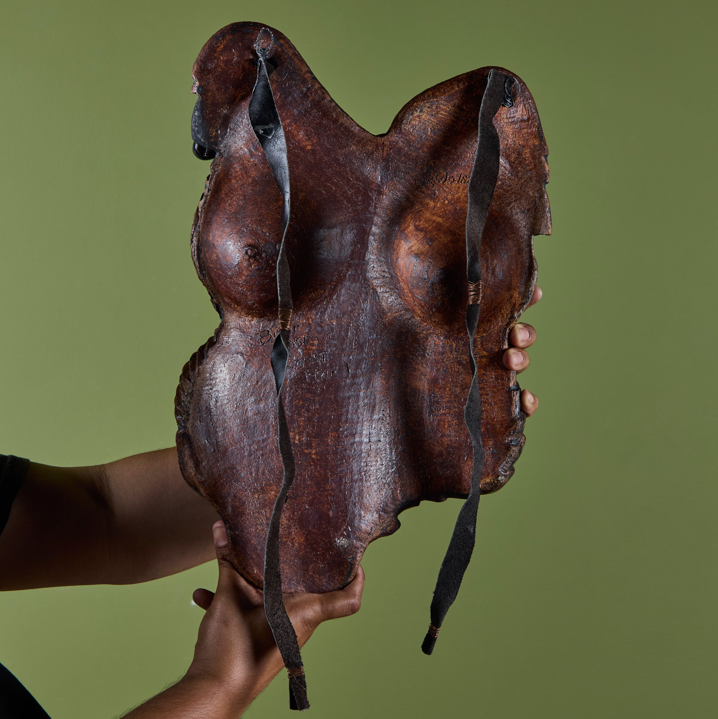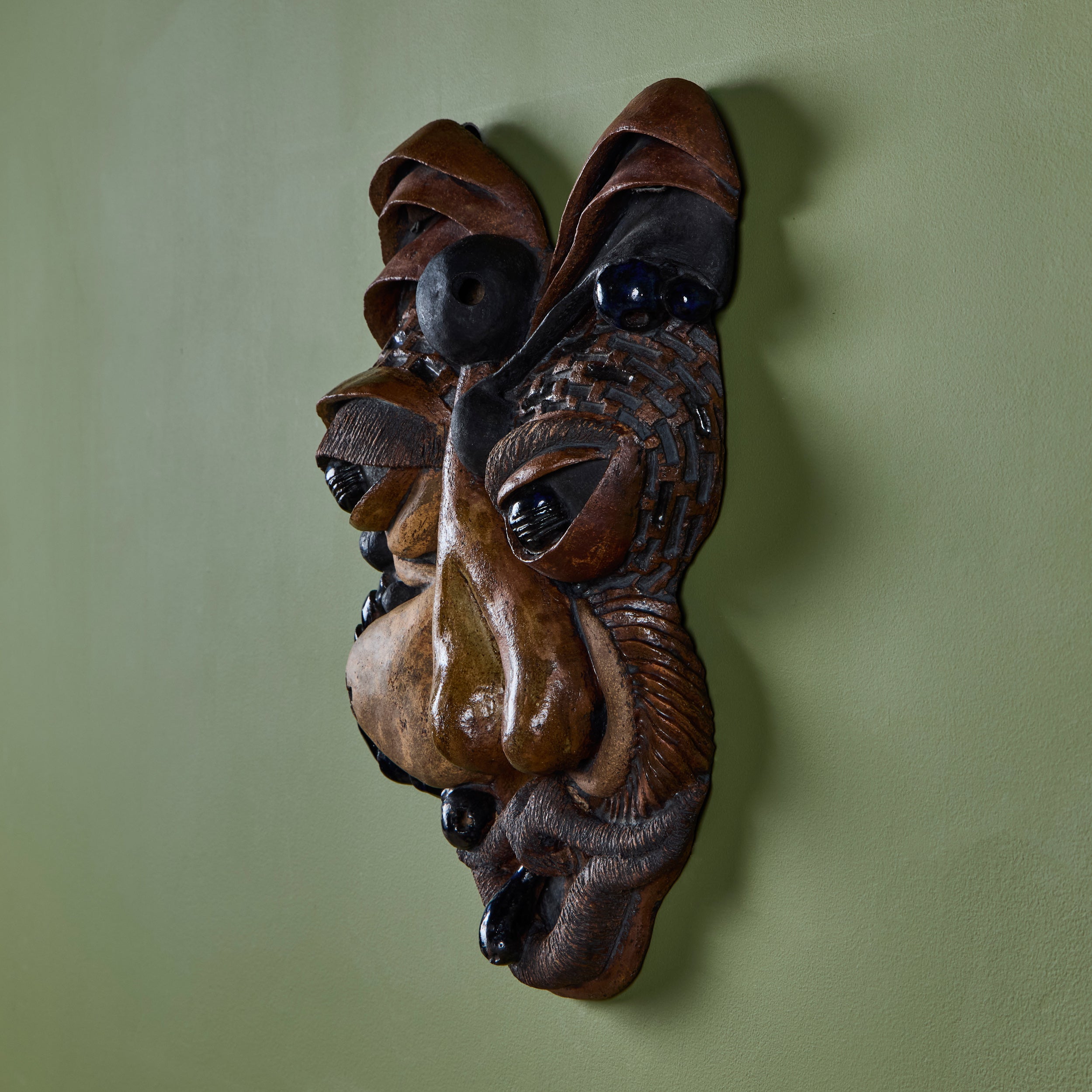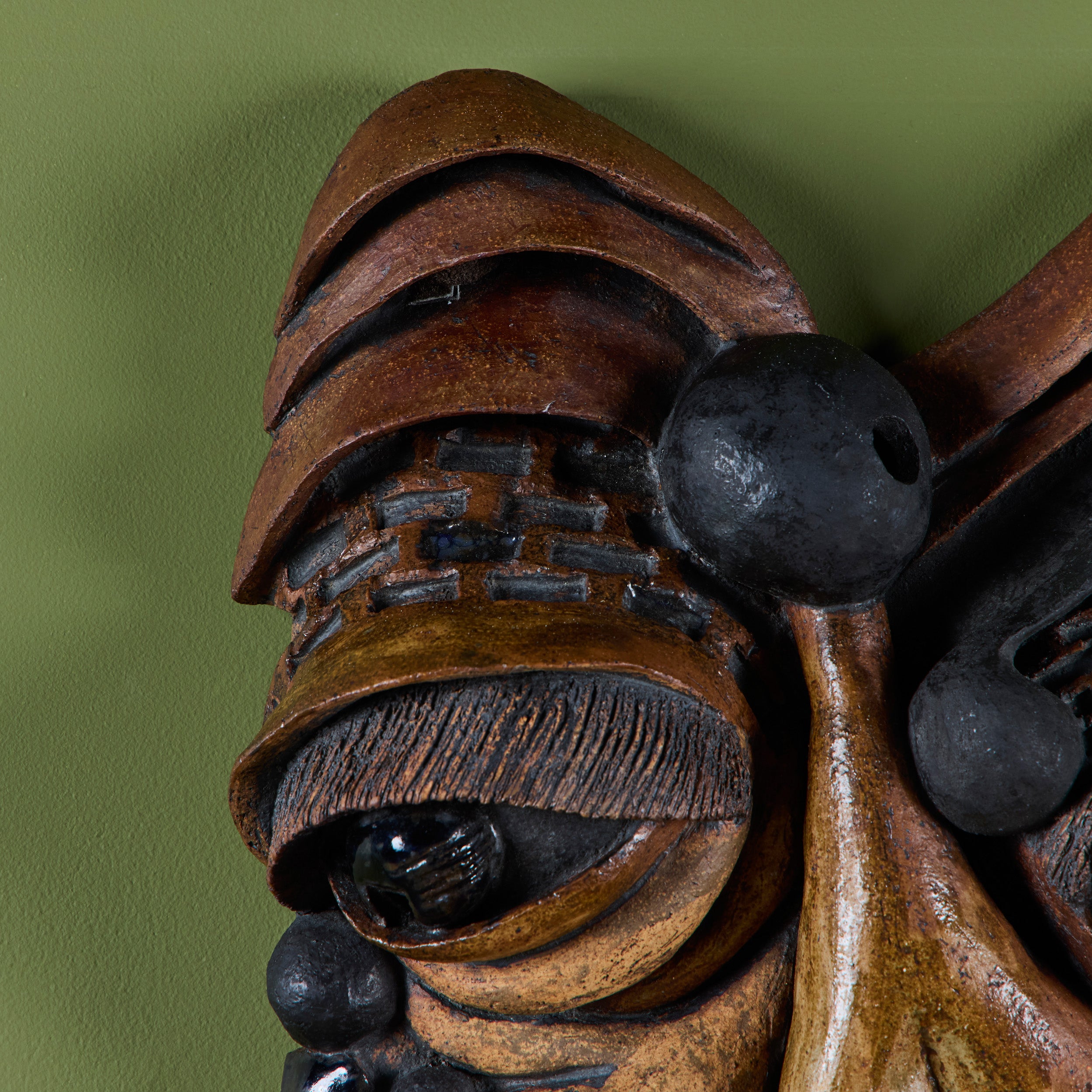 An archival piece from contemporary artist, Dale Wolfield. Wolfield is a New York native currently creating her one of a kind pieces in the Hudson Valley. She self describes her art as using "colored clay engobes in conjunction with relief carving & sgraffito on durable stoneware clay." This piece Looks like a face with a "butt" nose and has two leather straps which can be worn or wall mounted.