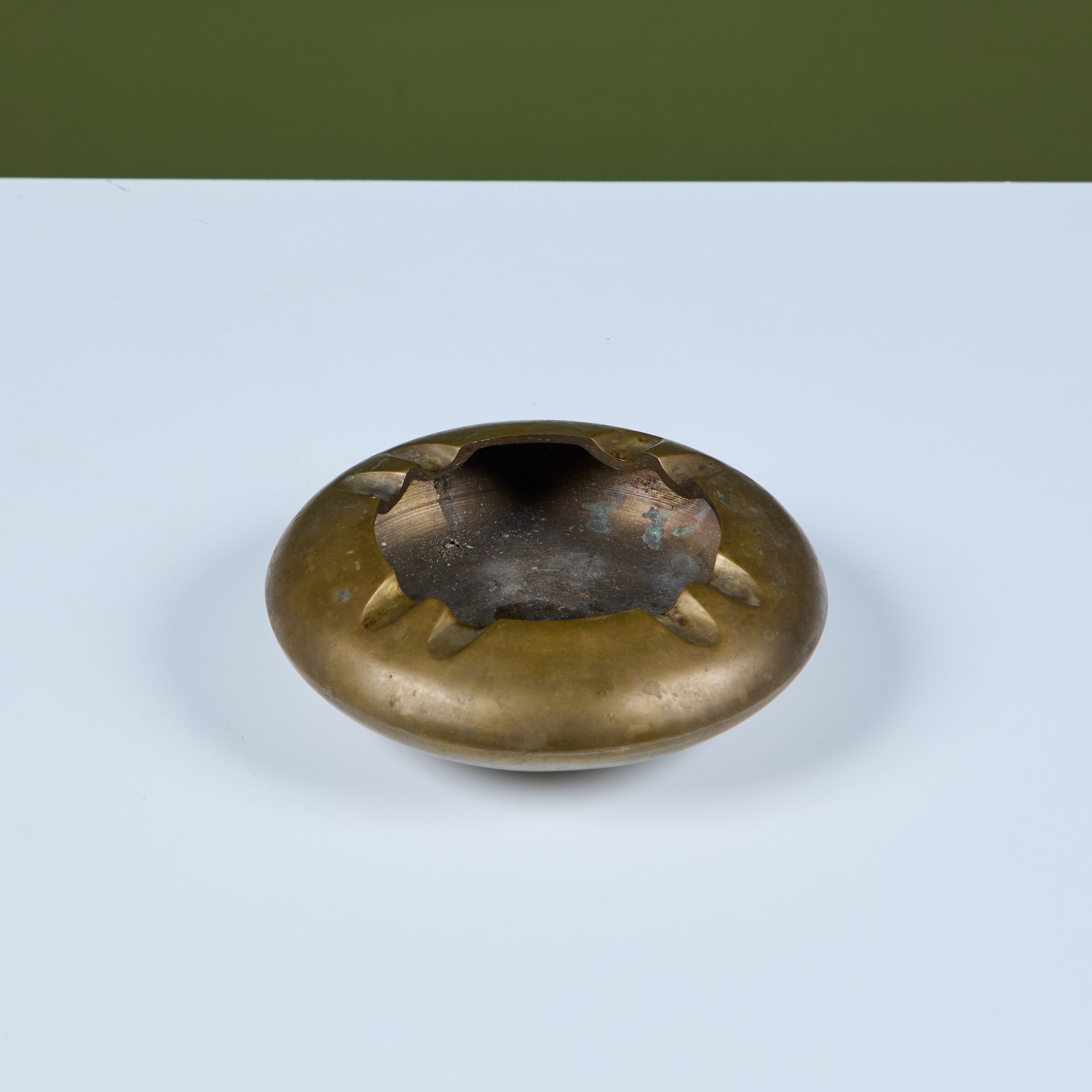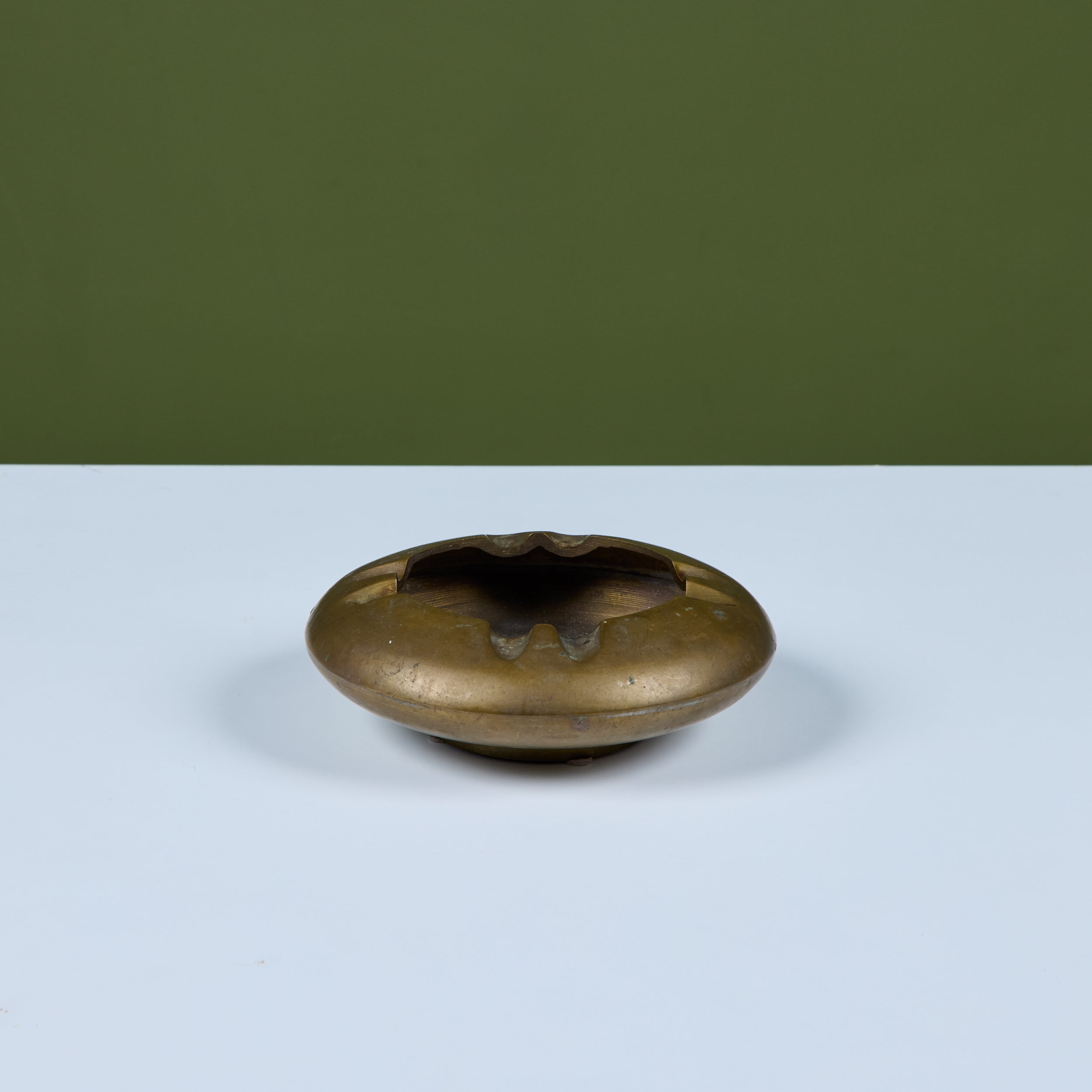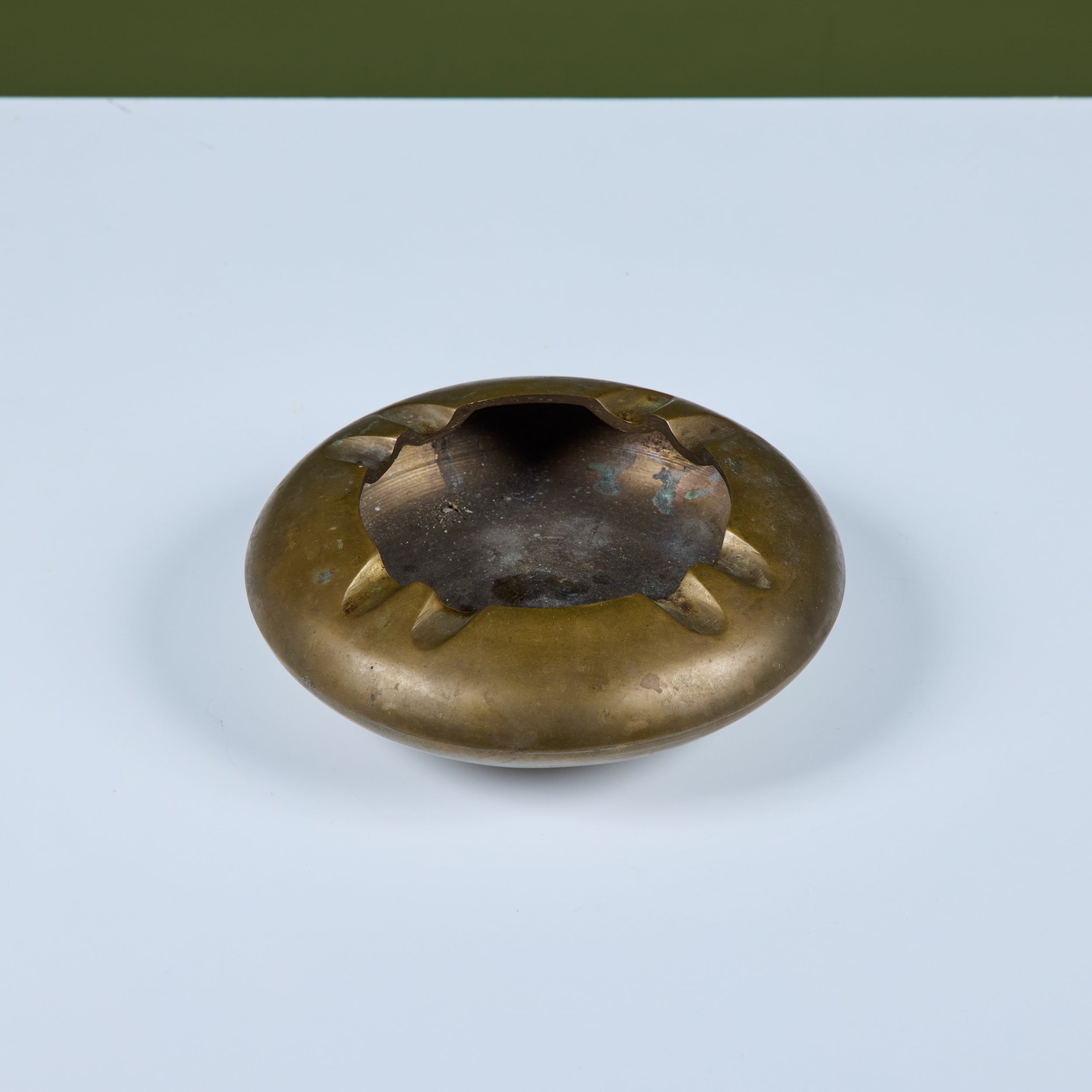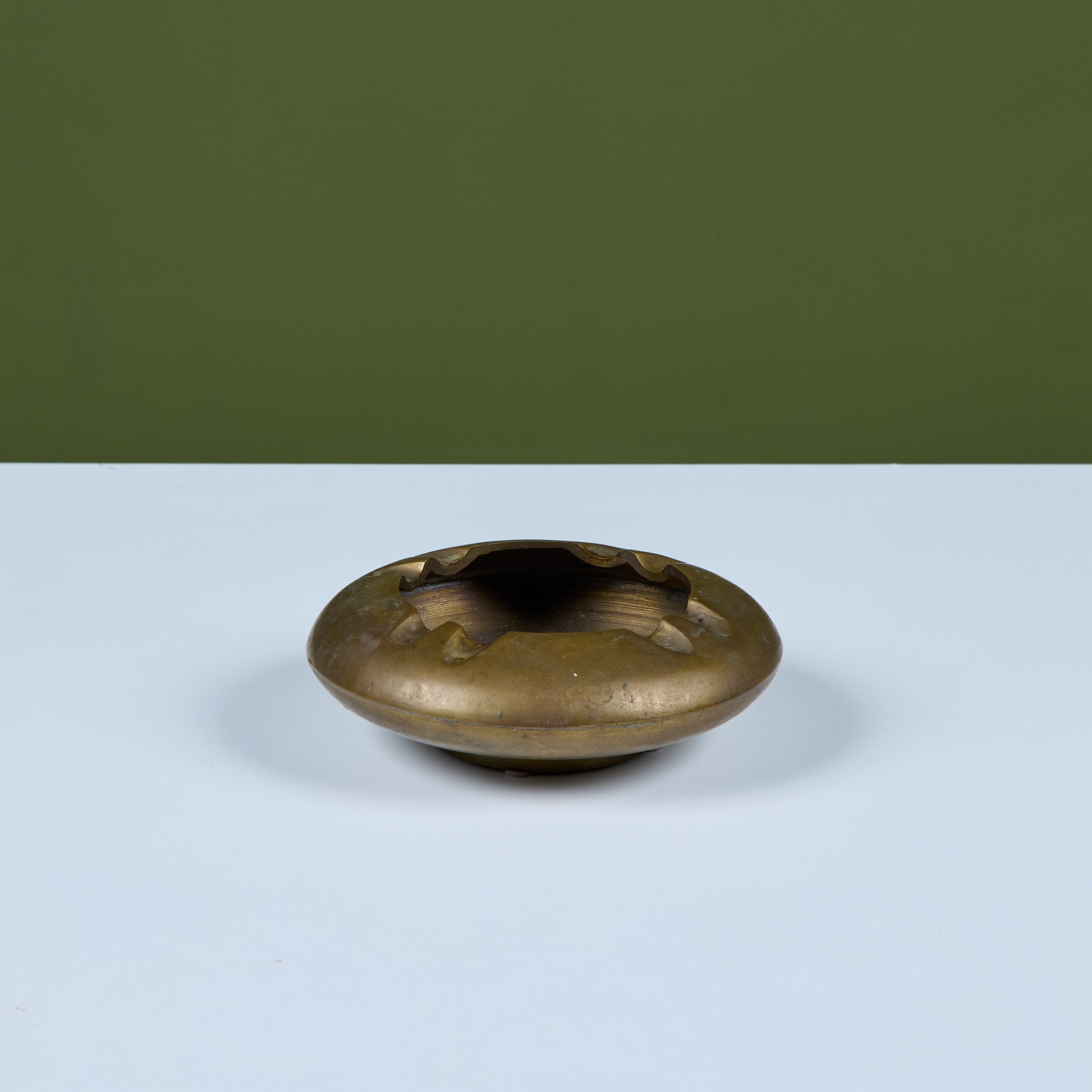 Round brass ashtray that could be used to hold a myriad of things. This ashtray showcases its age in its patina and has eight divots around the mouth.