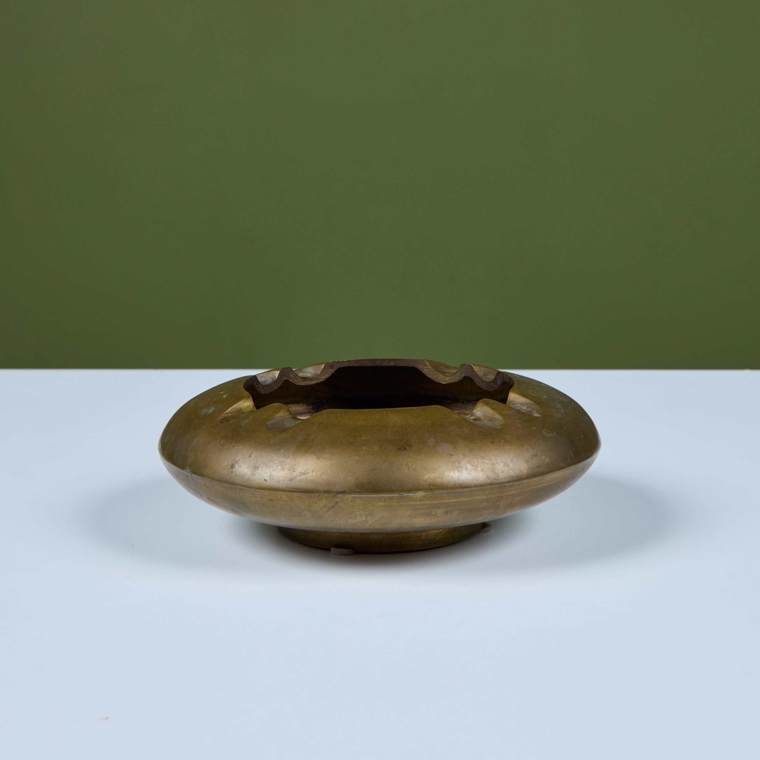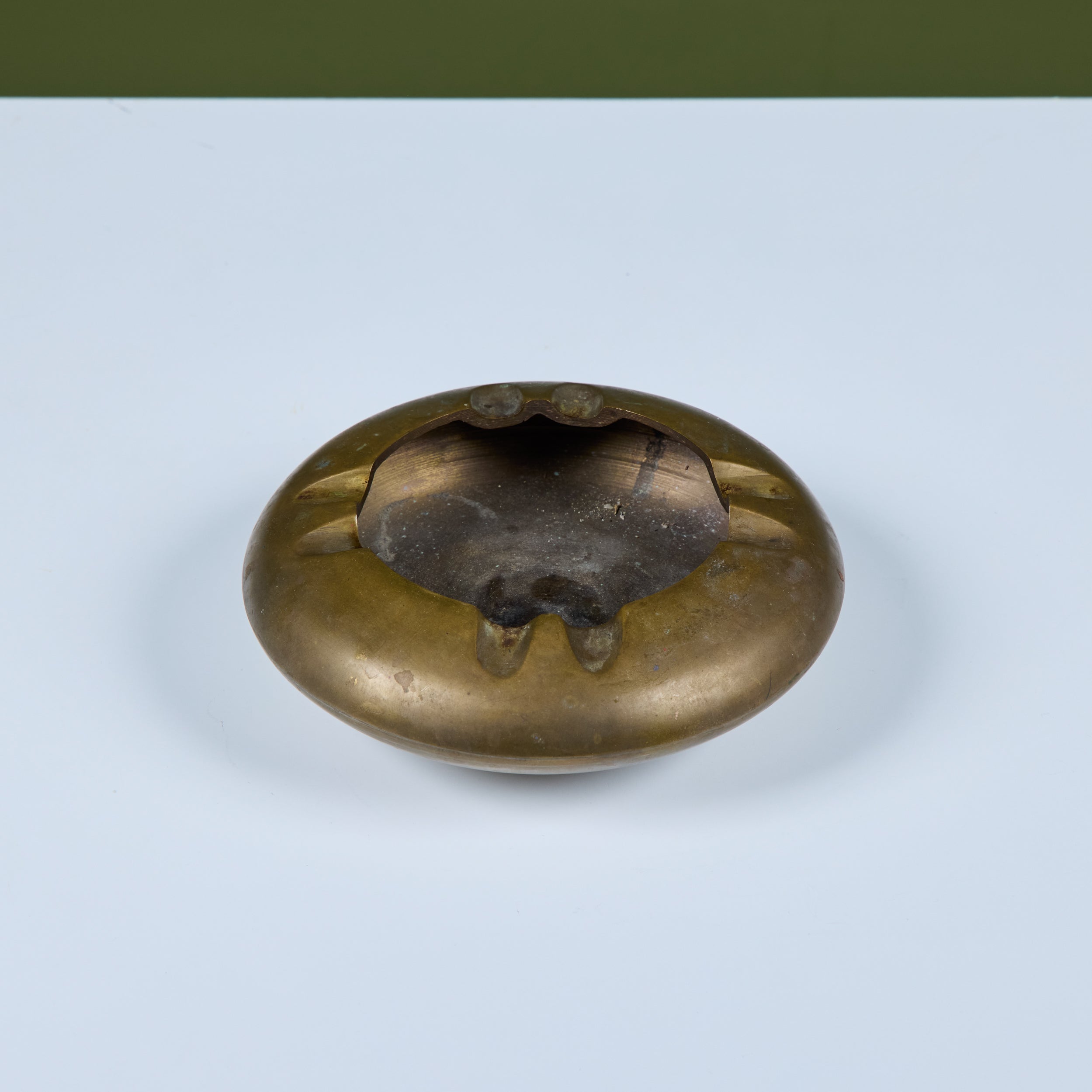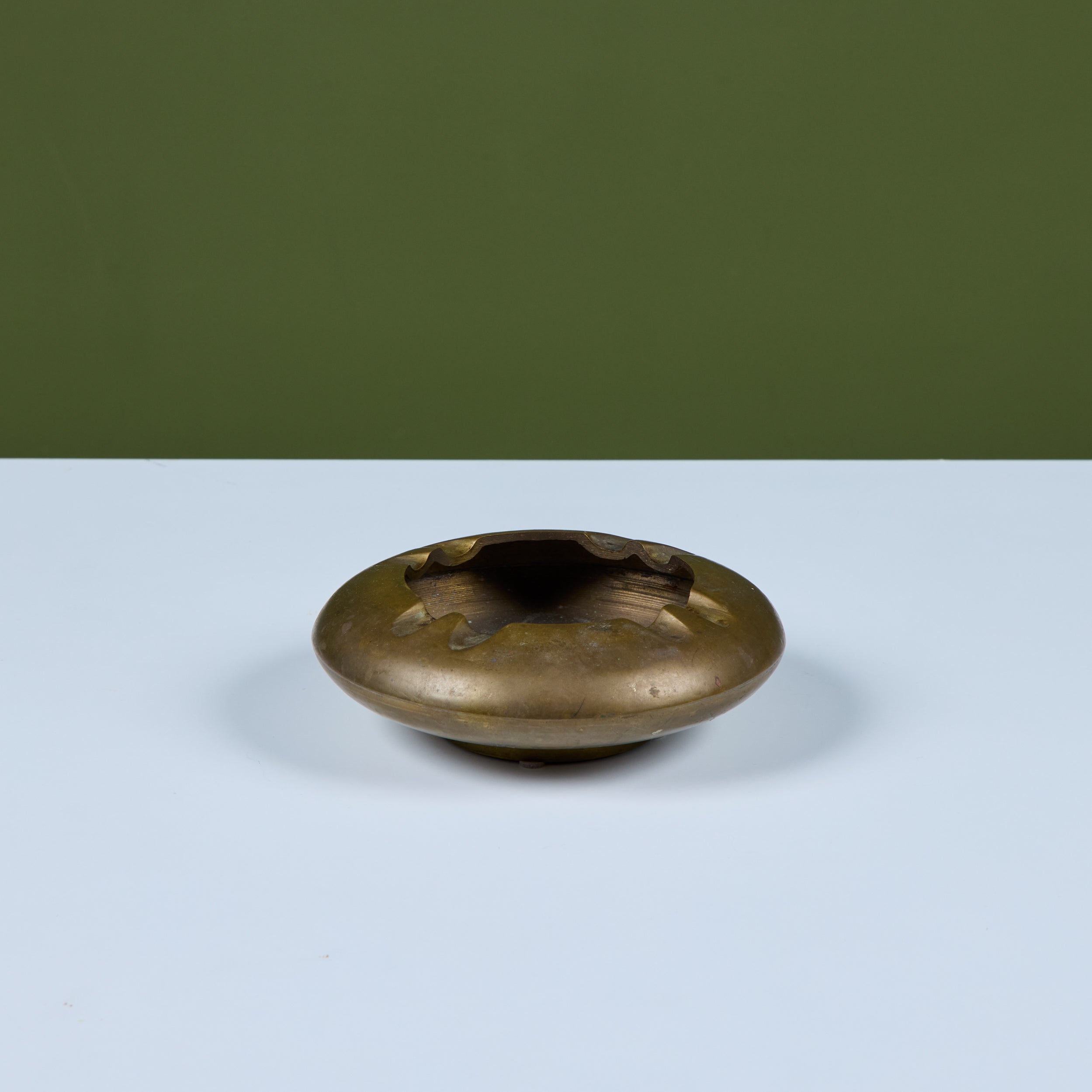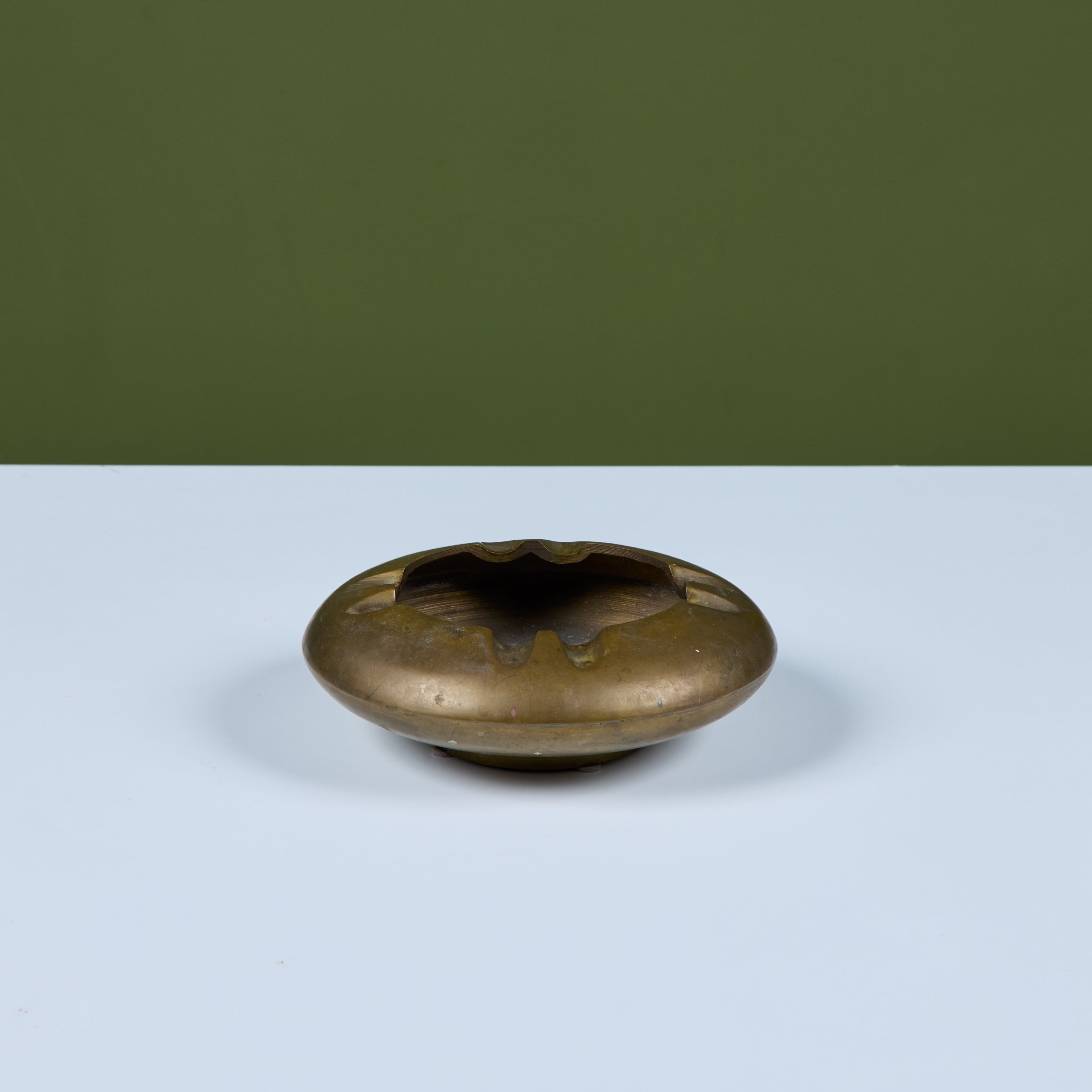 Round brass ashtray that could be used to hold a myriad of things. This ashtray showcases its age in its patina and has eight divots around the mouth.