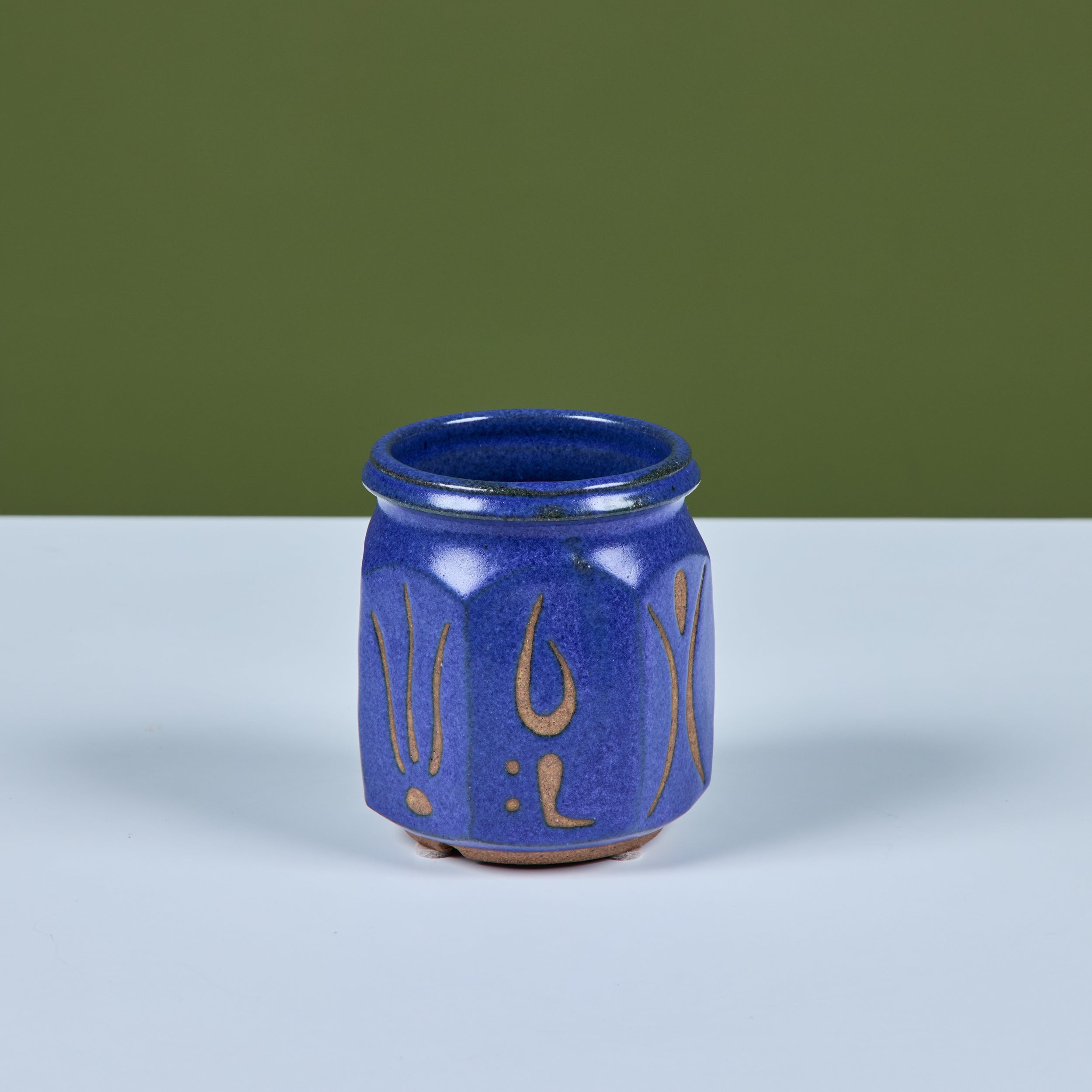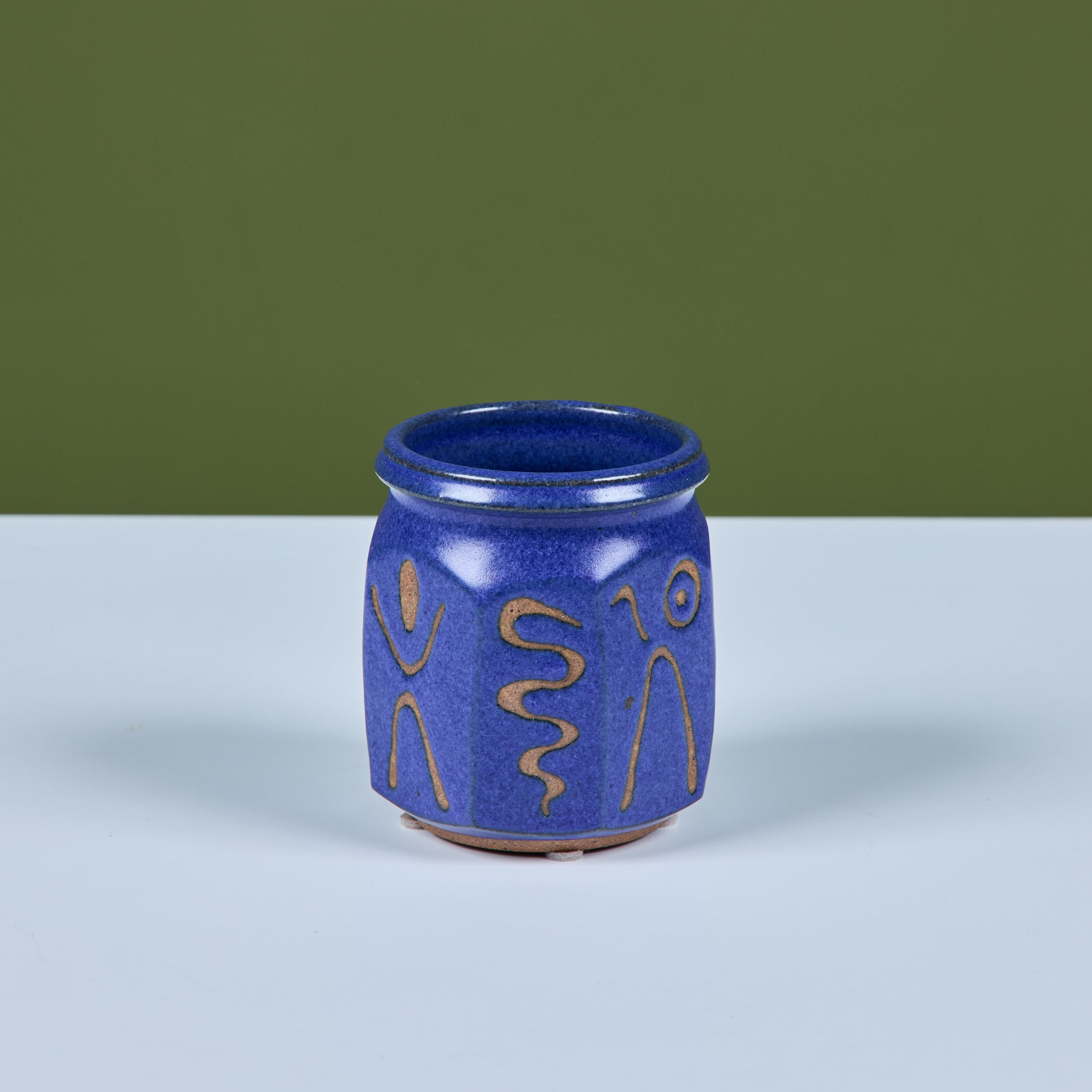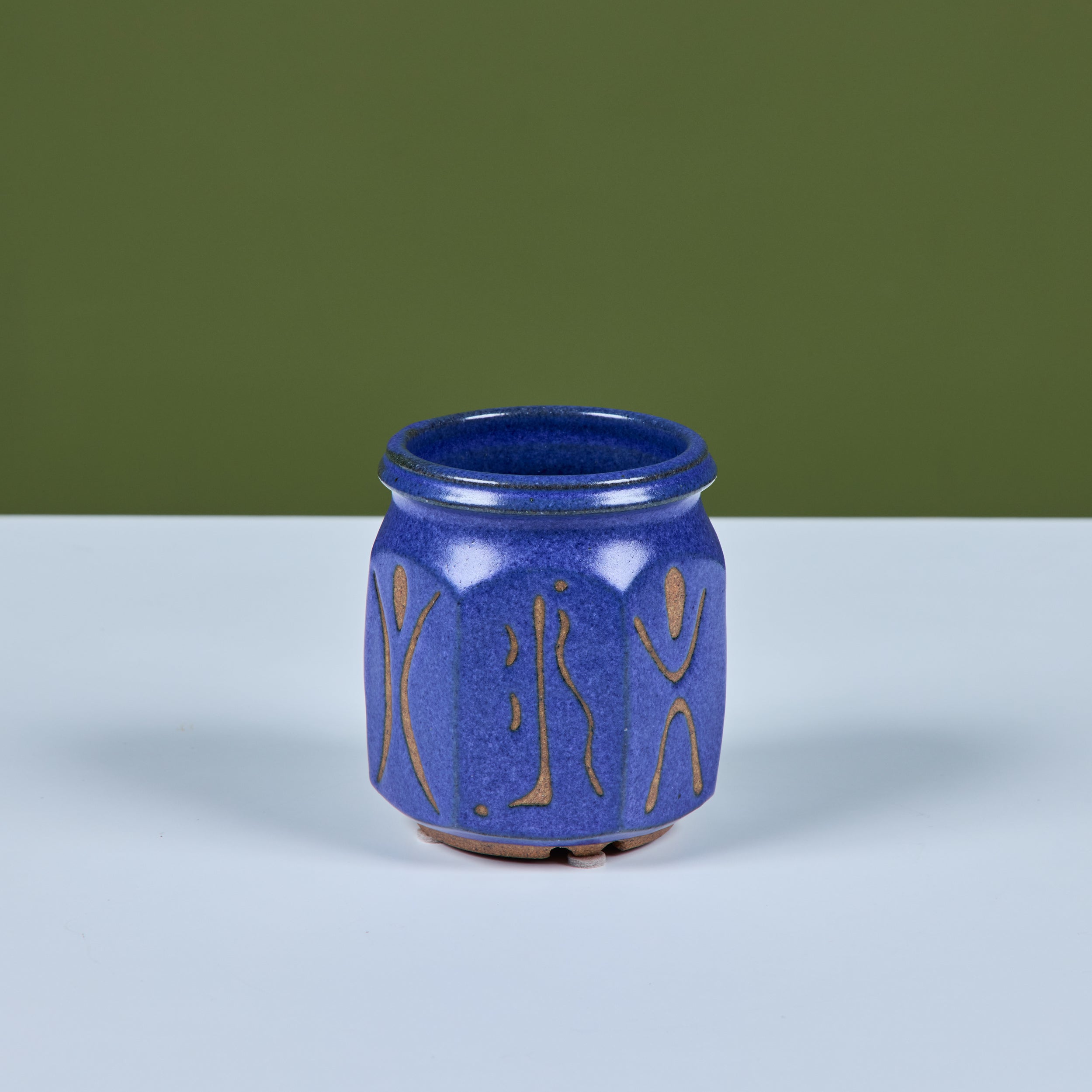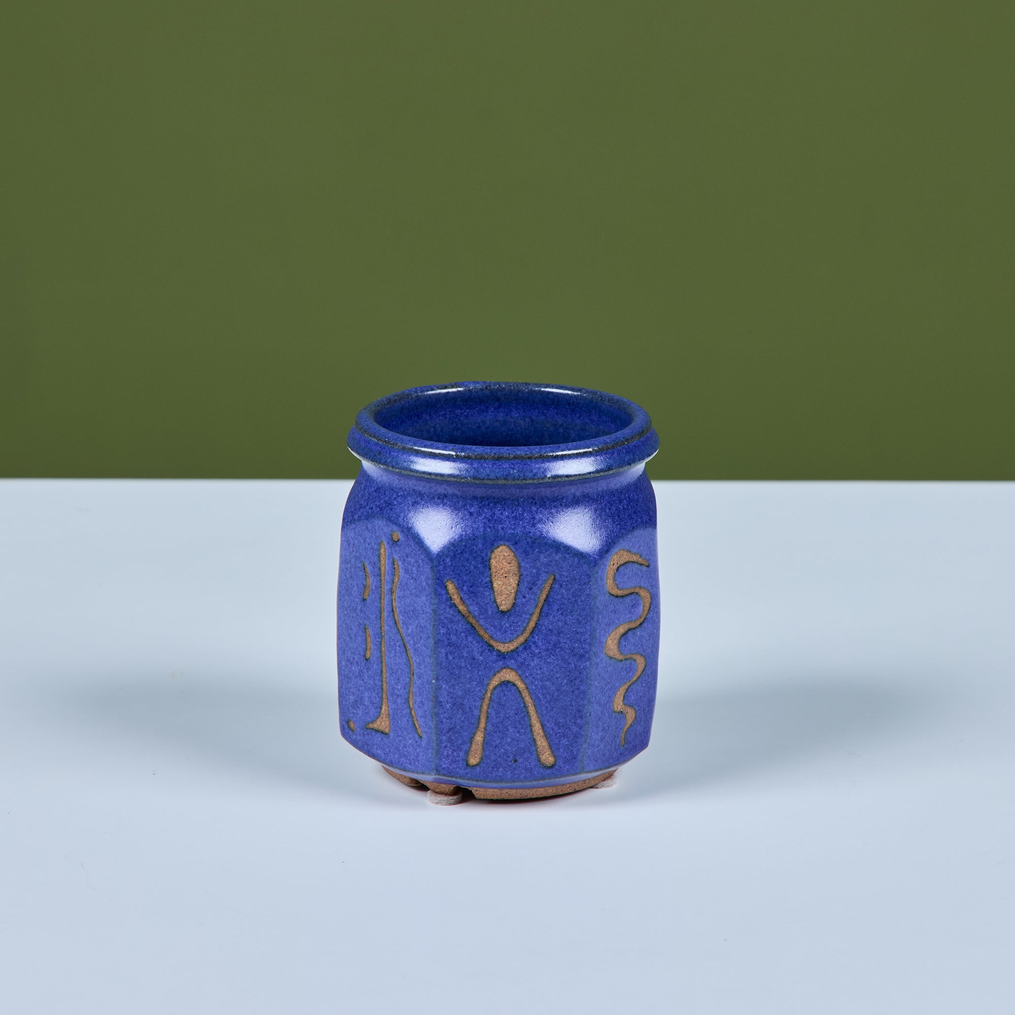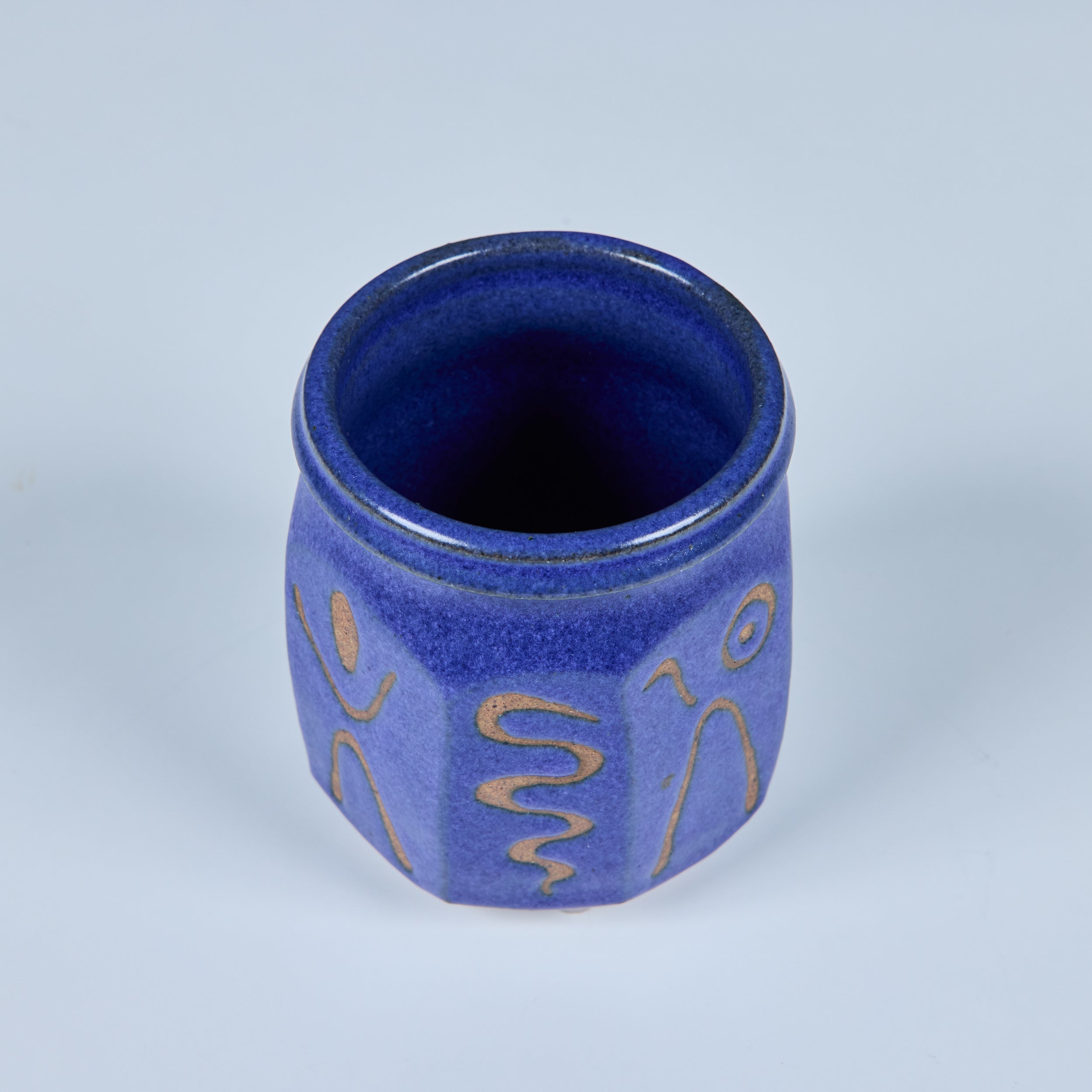Blue glazed stoneware cup or vase with etched figures on each side. Signed by the artist.