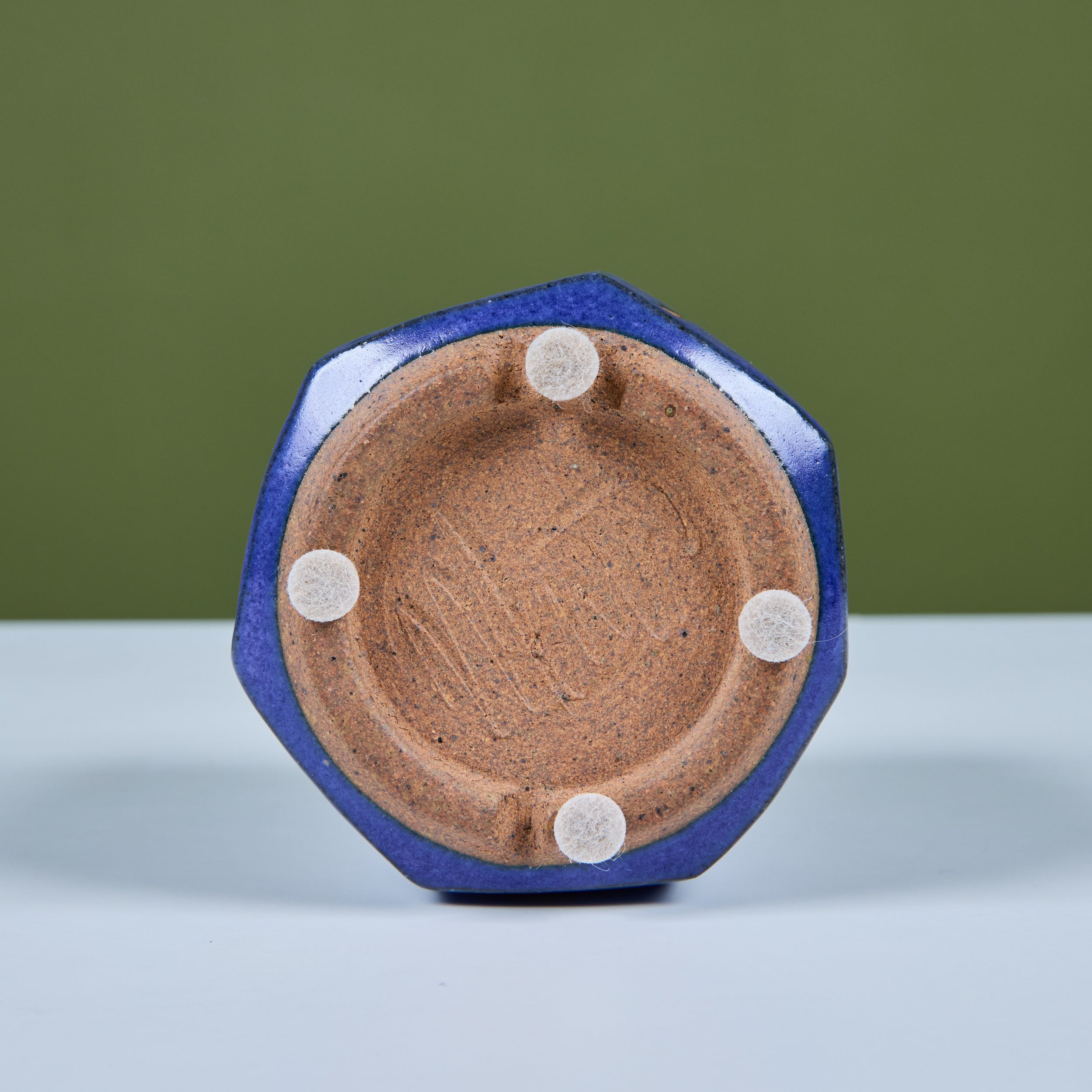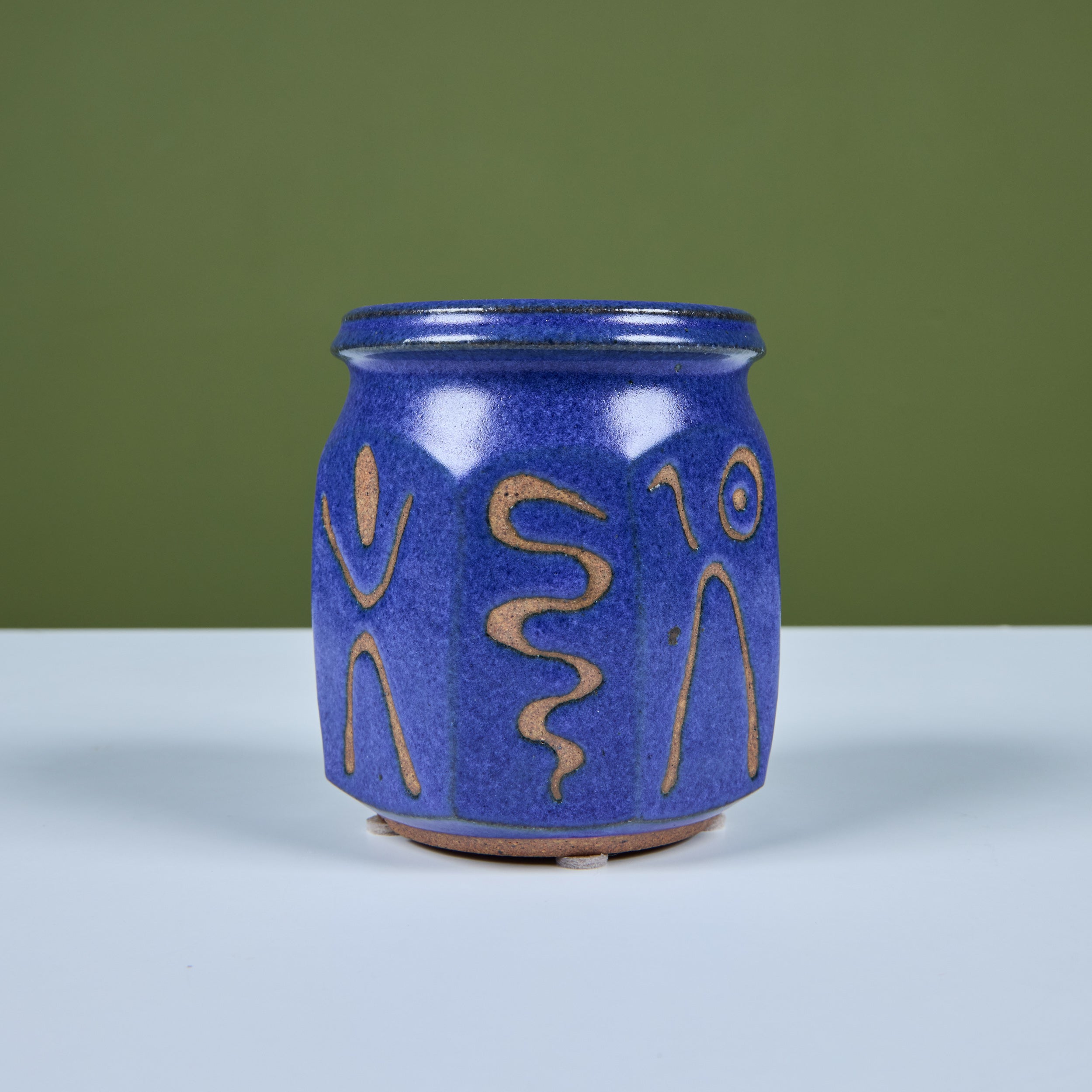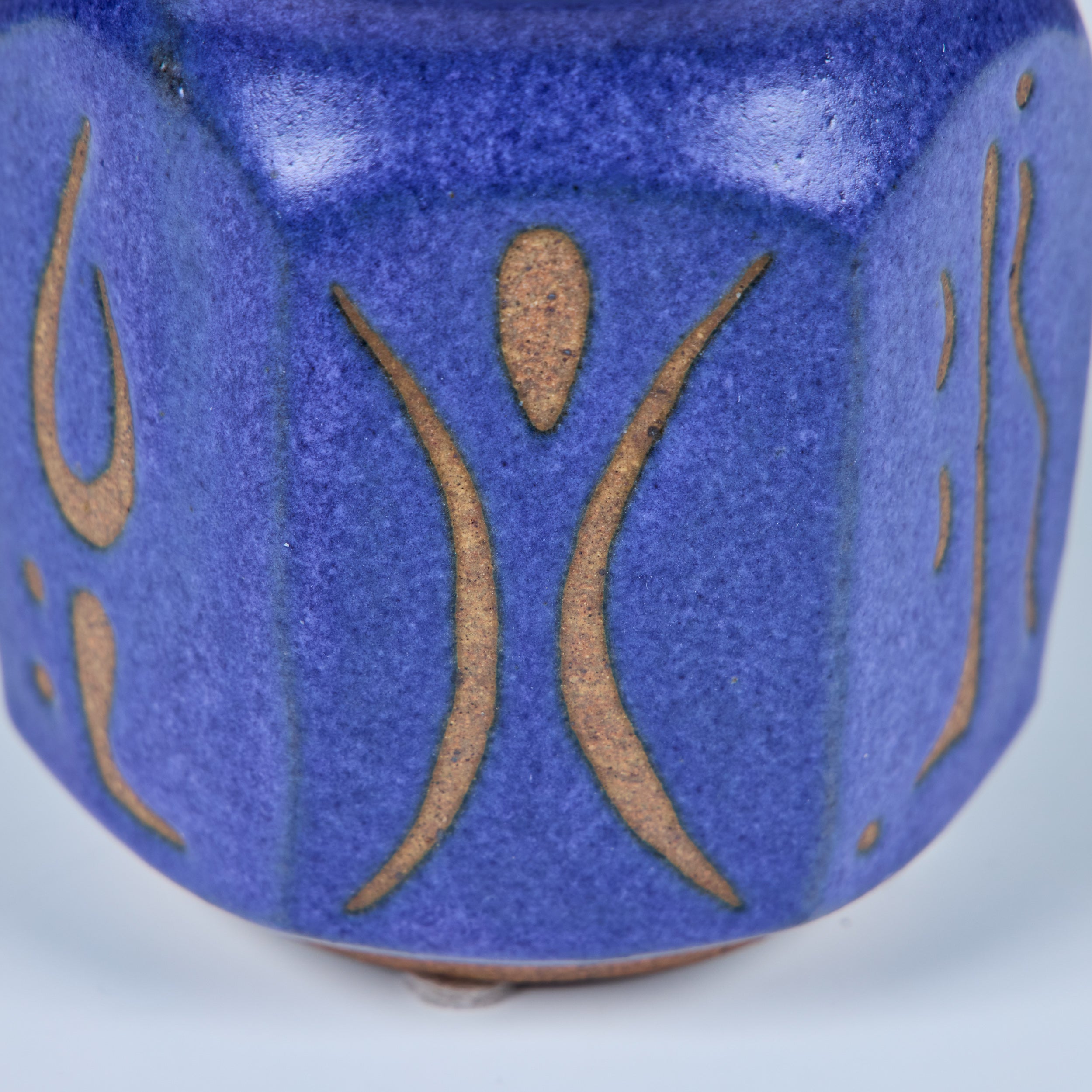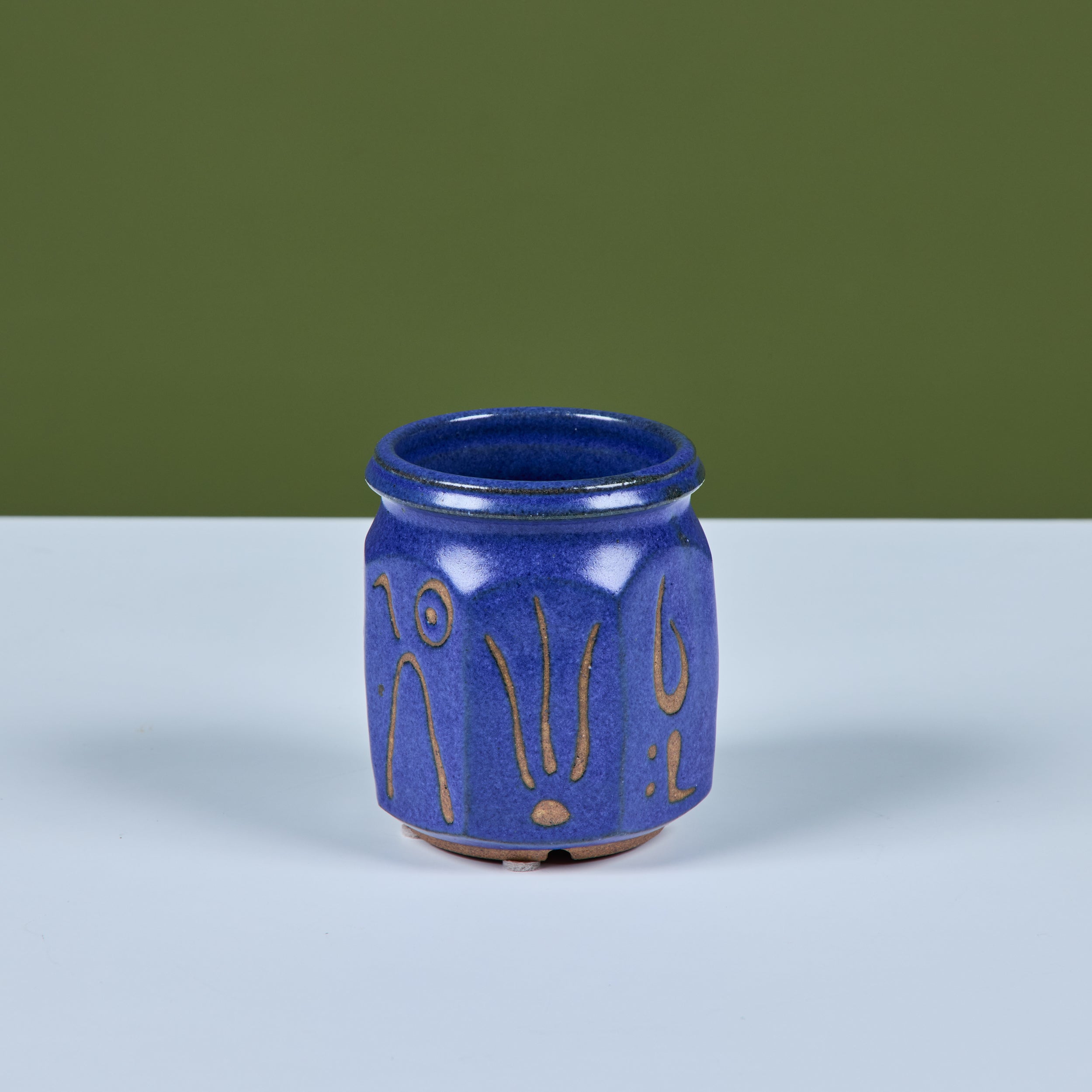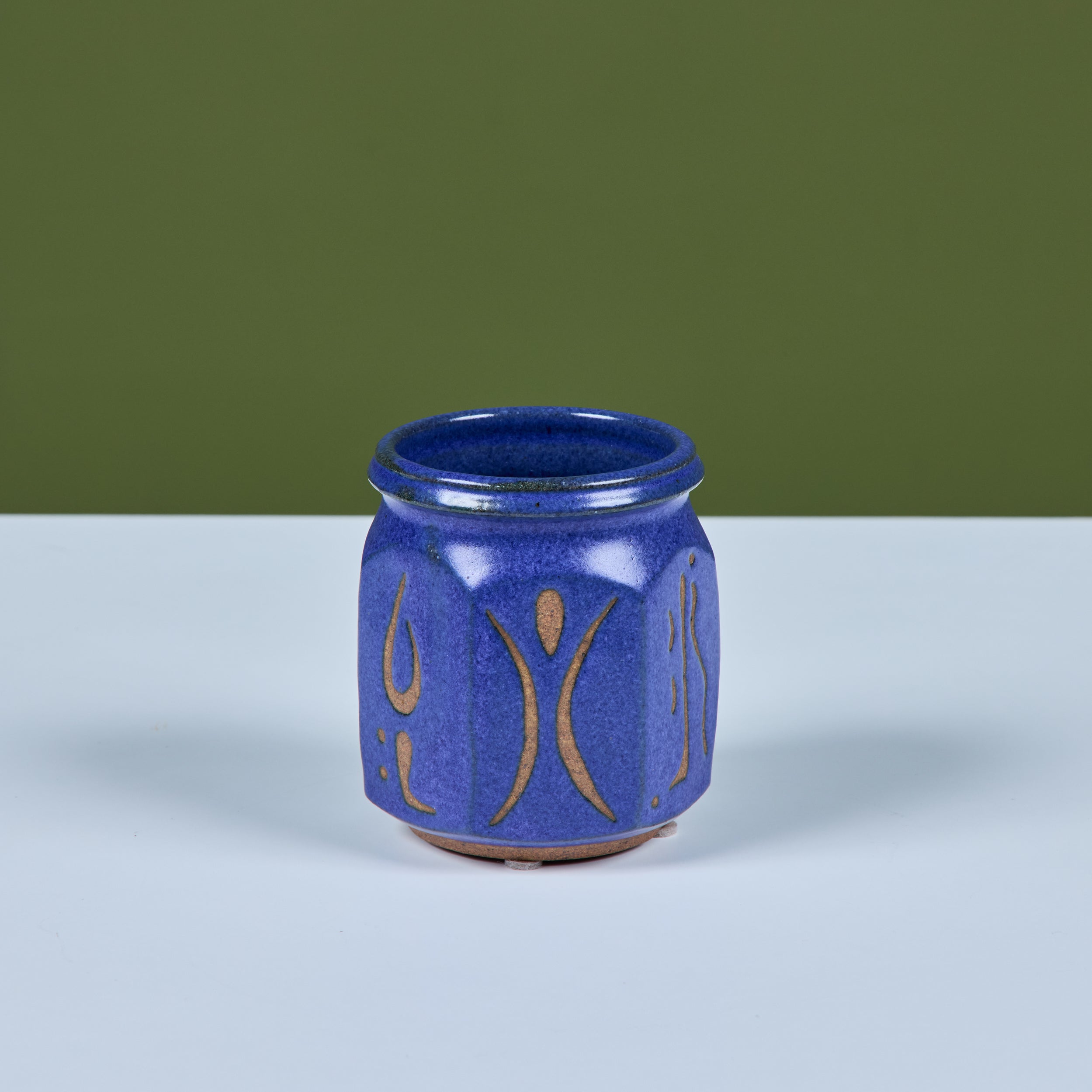 Blue glazed stoneware cup or vase with etched figures on each side. Signed by the artist.