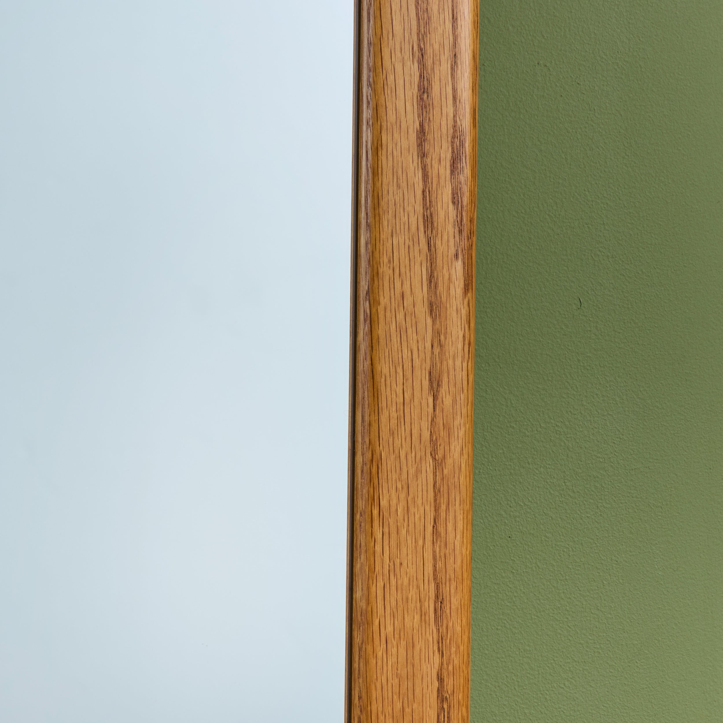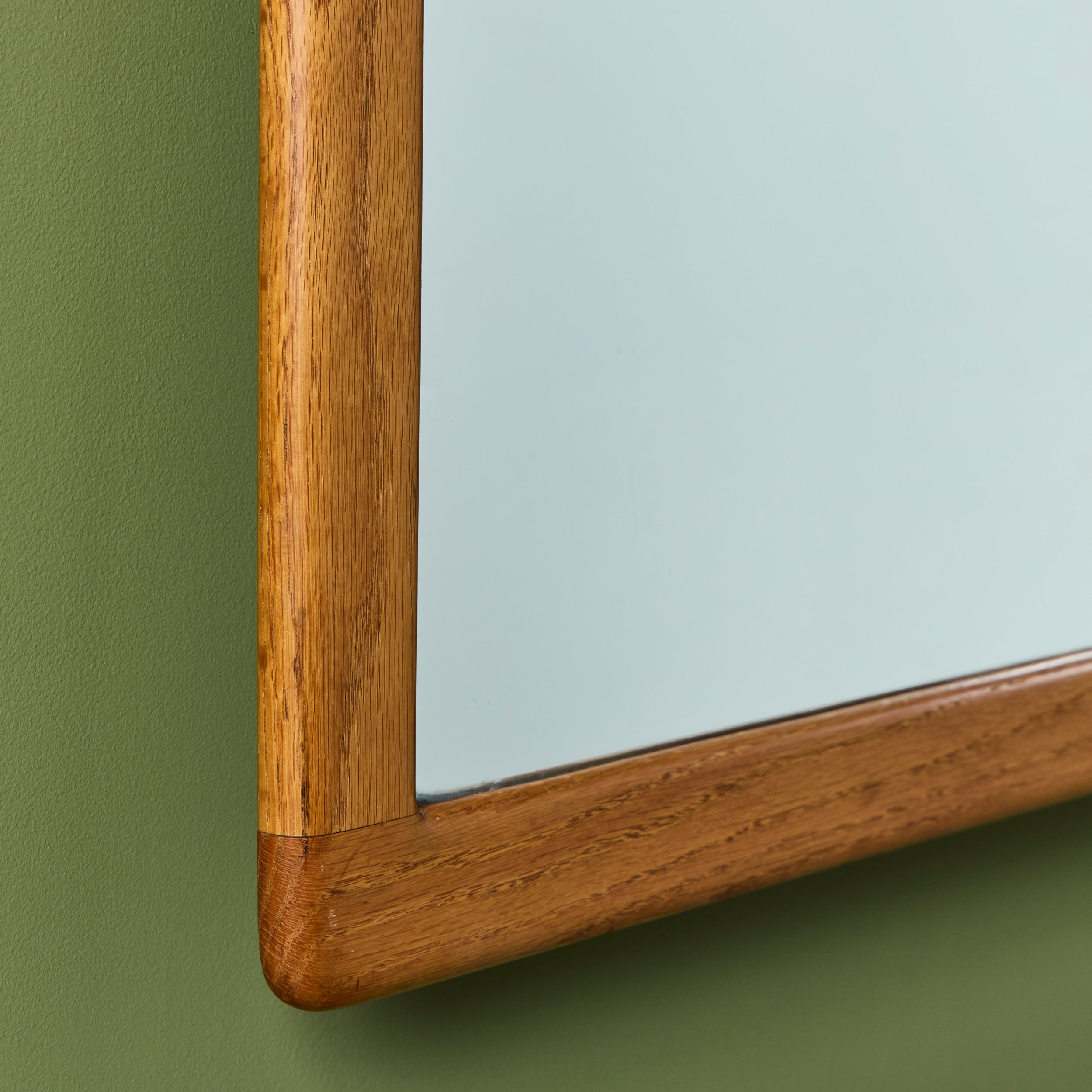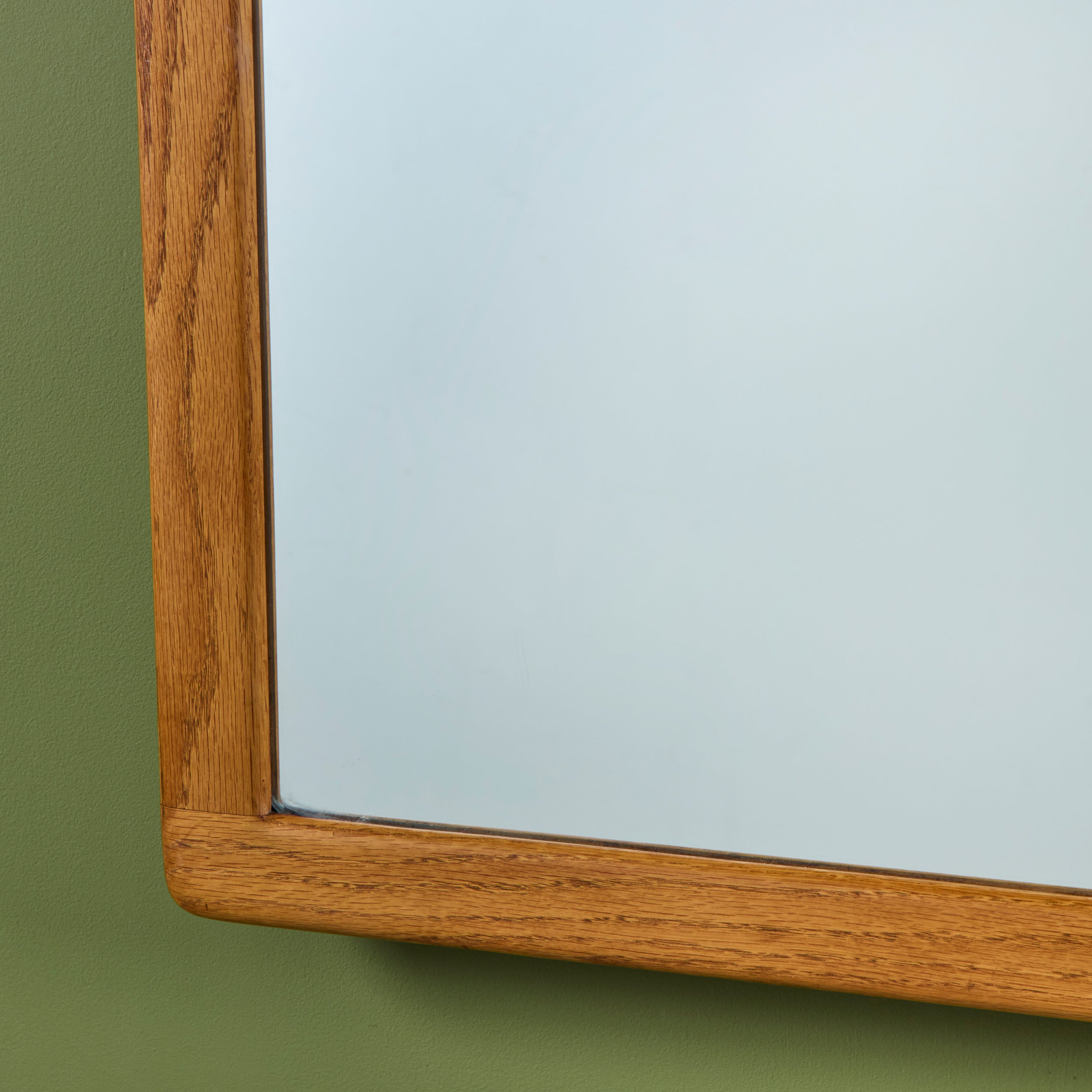 Oak mirror from American designer Gerald McCabe for Eon Furniture, c.1970s. The large scale mirror can be mounted both vertically and horizontally to a wall. Original glass in mirror.