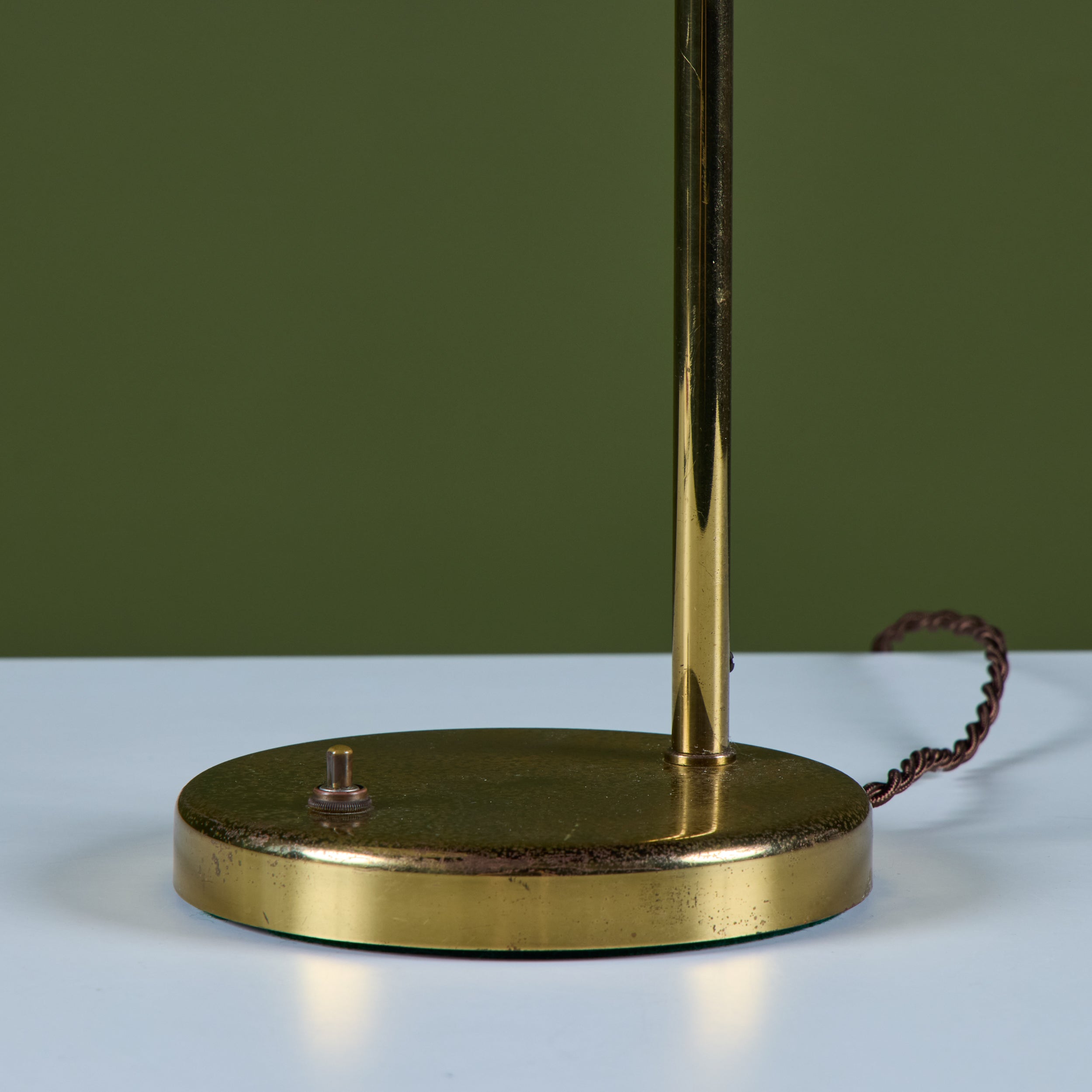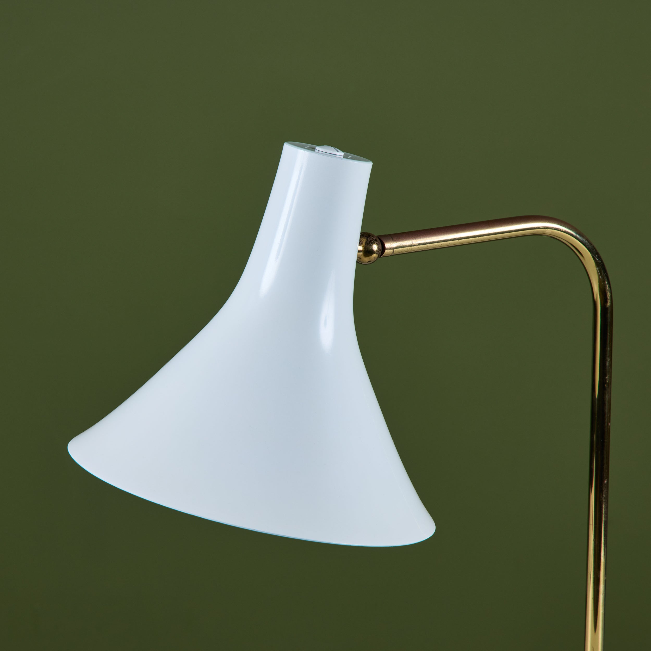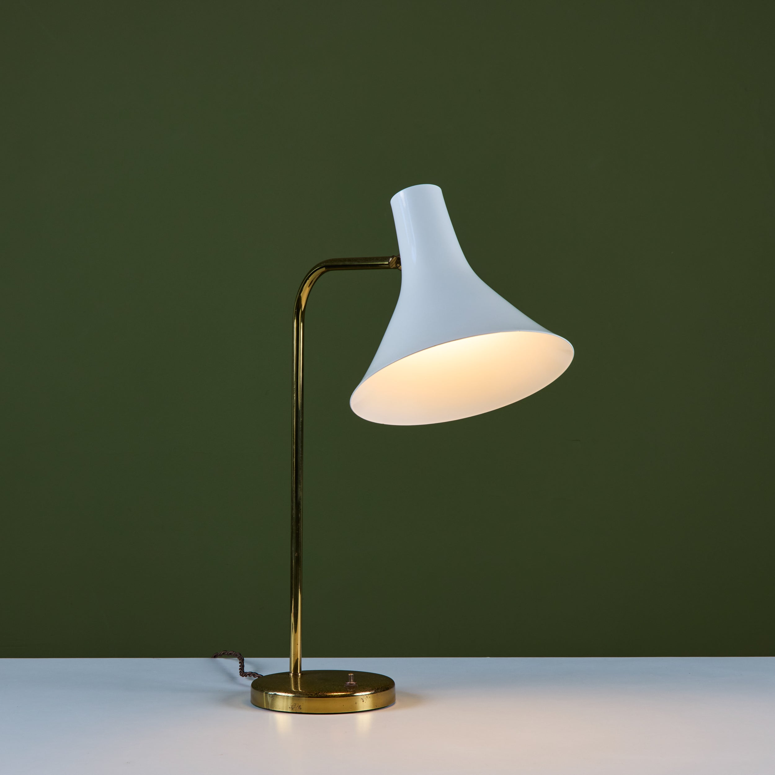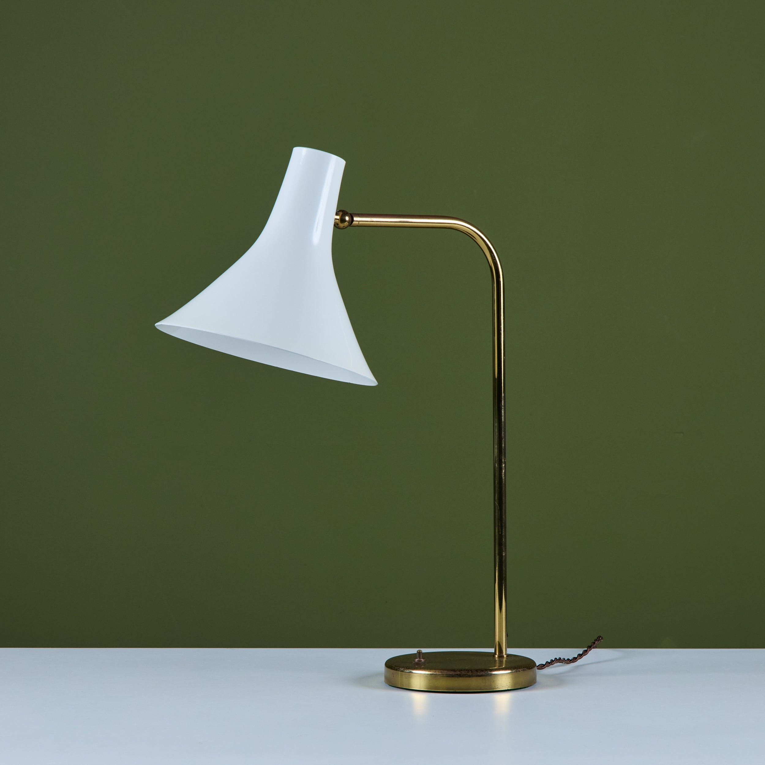 Desk lamp designed by Greta von Nessen c.1960s, USA, for Nessen Studios. The lamp features a white enameled trumpet shade that pivots up and down, with a curved brass arm that rotates left and right 90 degrees, set on a round base. On/Off switch on base.