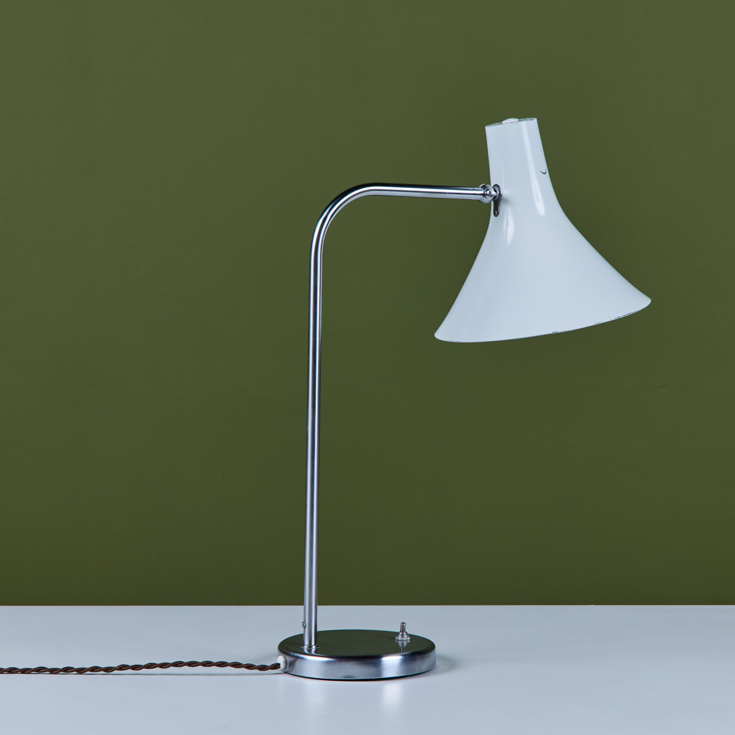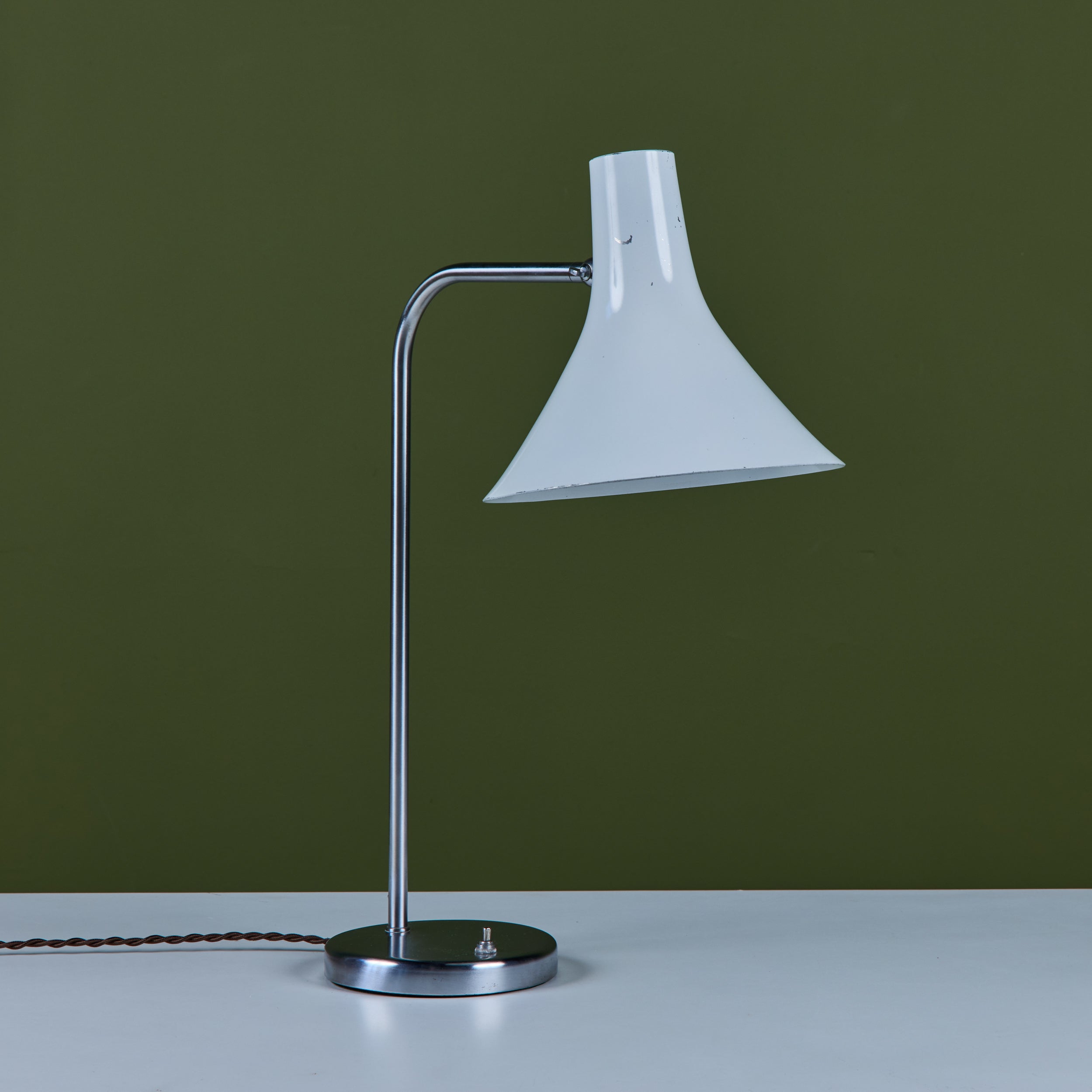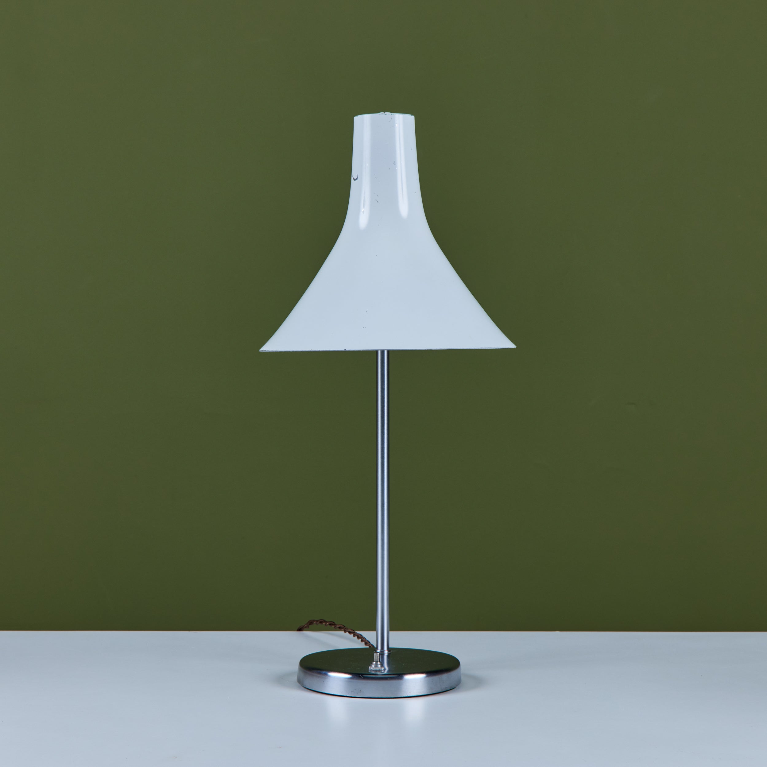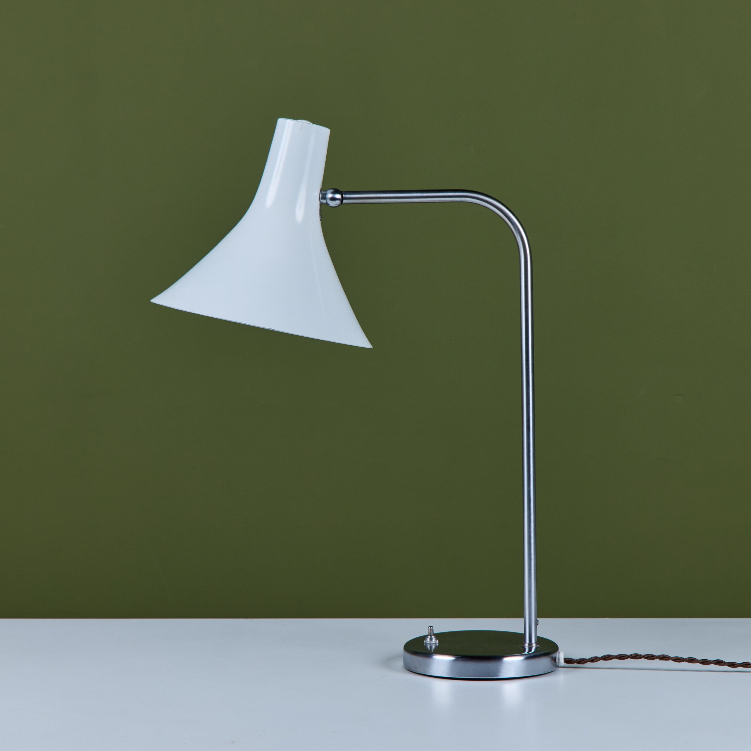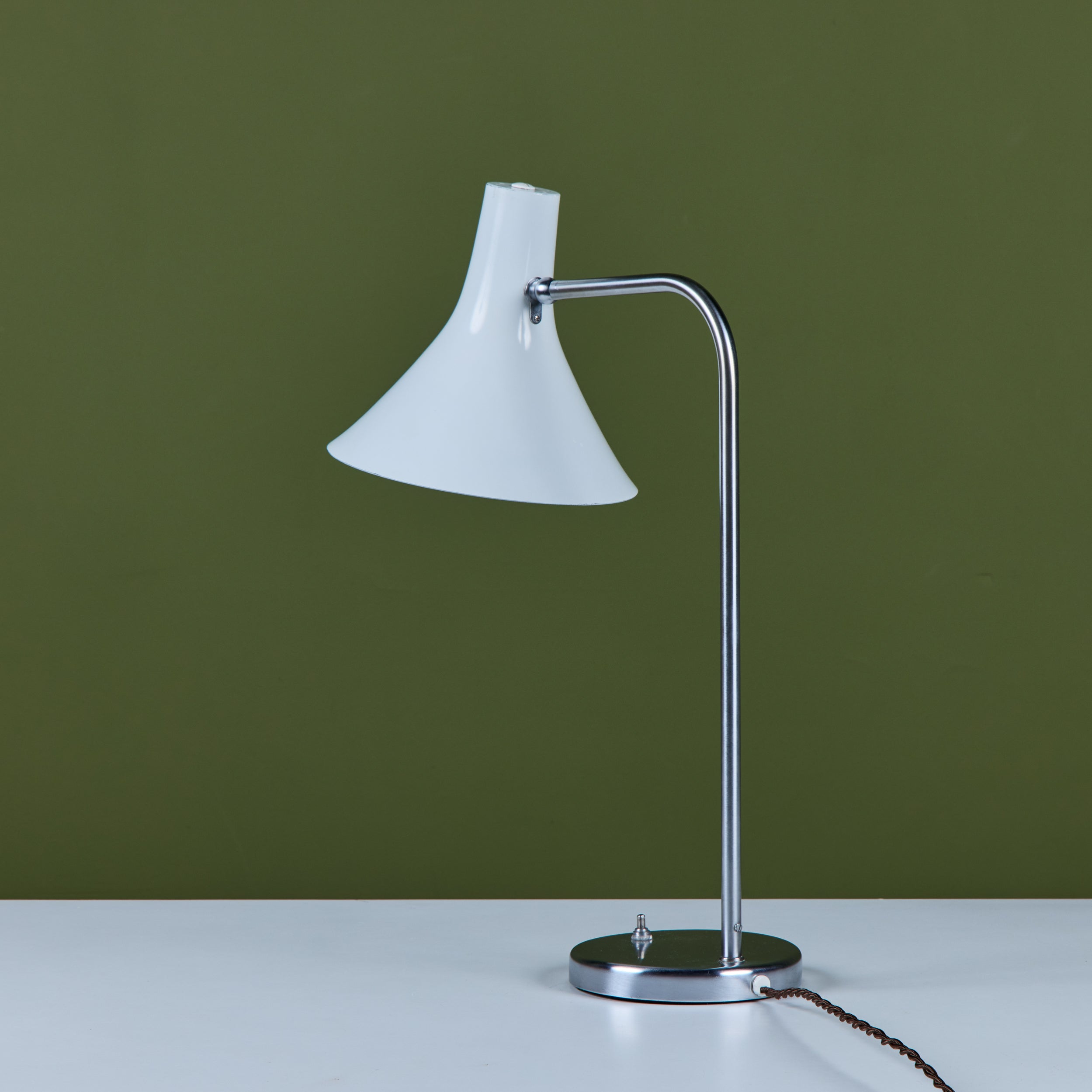 Desk lamp designed by Greta von Nessen c.1960s, USA, for Nessen Studios. The lamp features a white enameled trumpet shade that pivots up and down, with a curved steel arm that rotates left and right 90 degrees, set on a round base. On/Off switch on base.