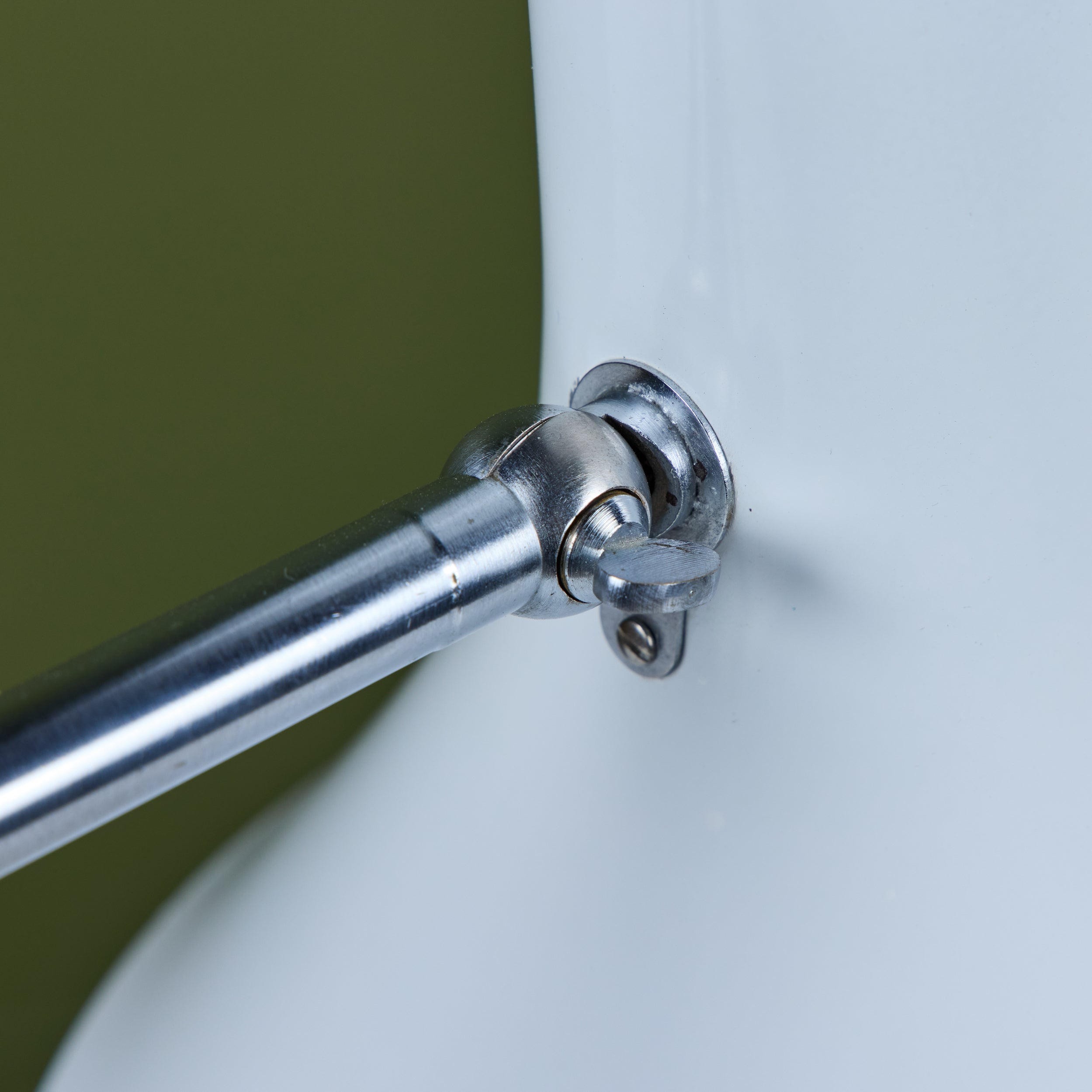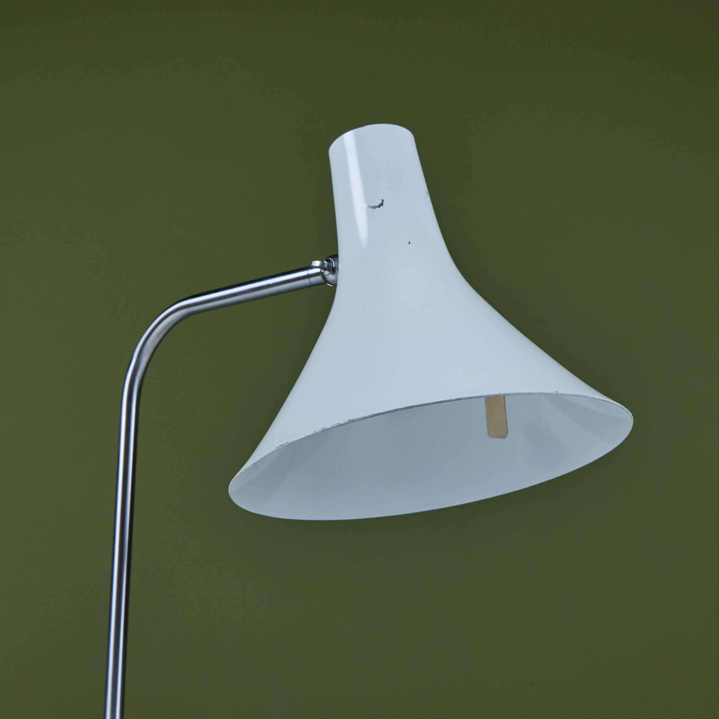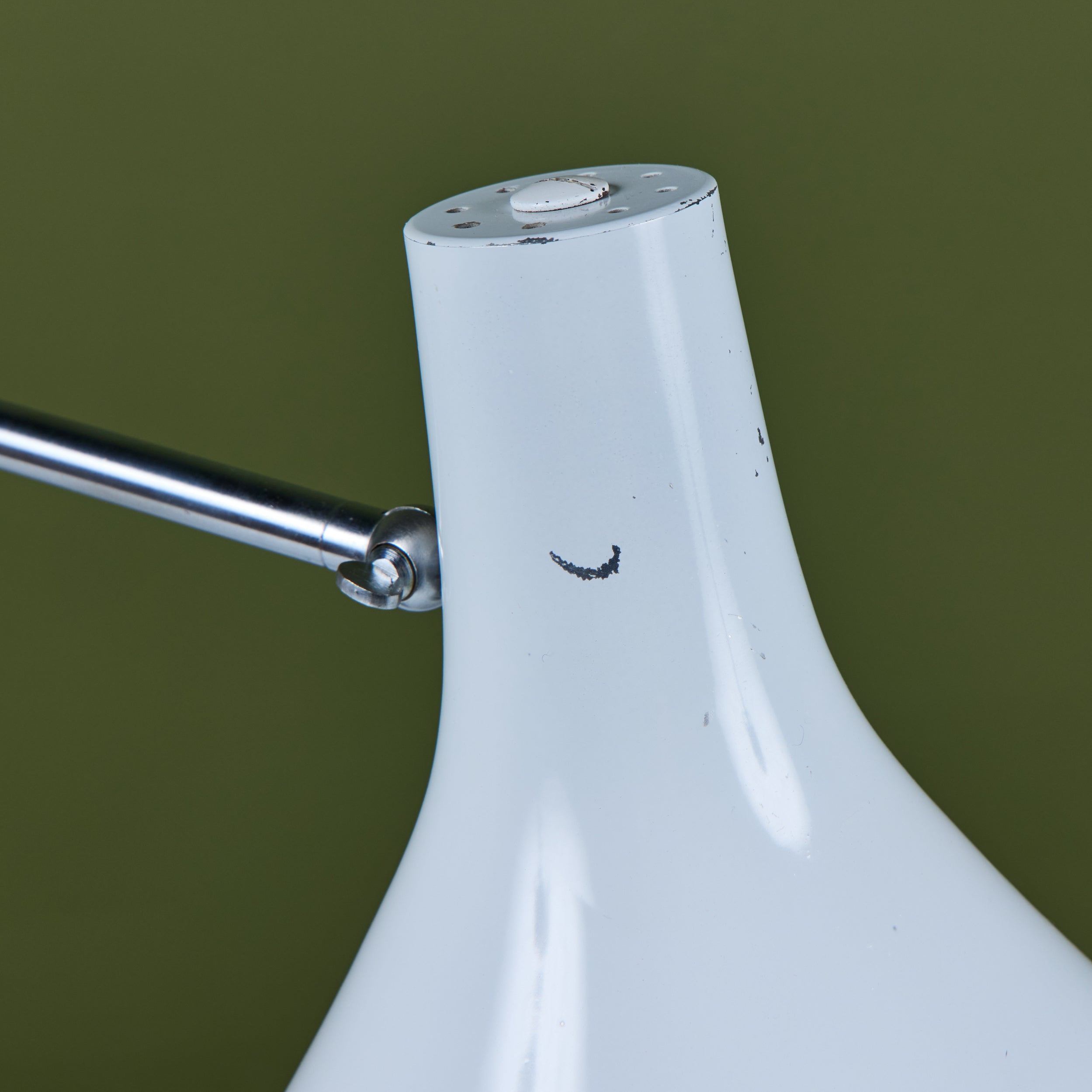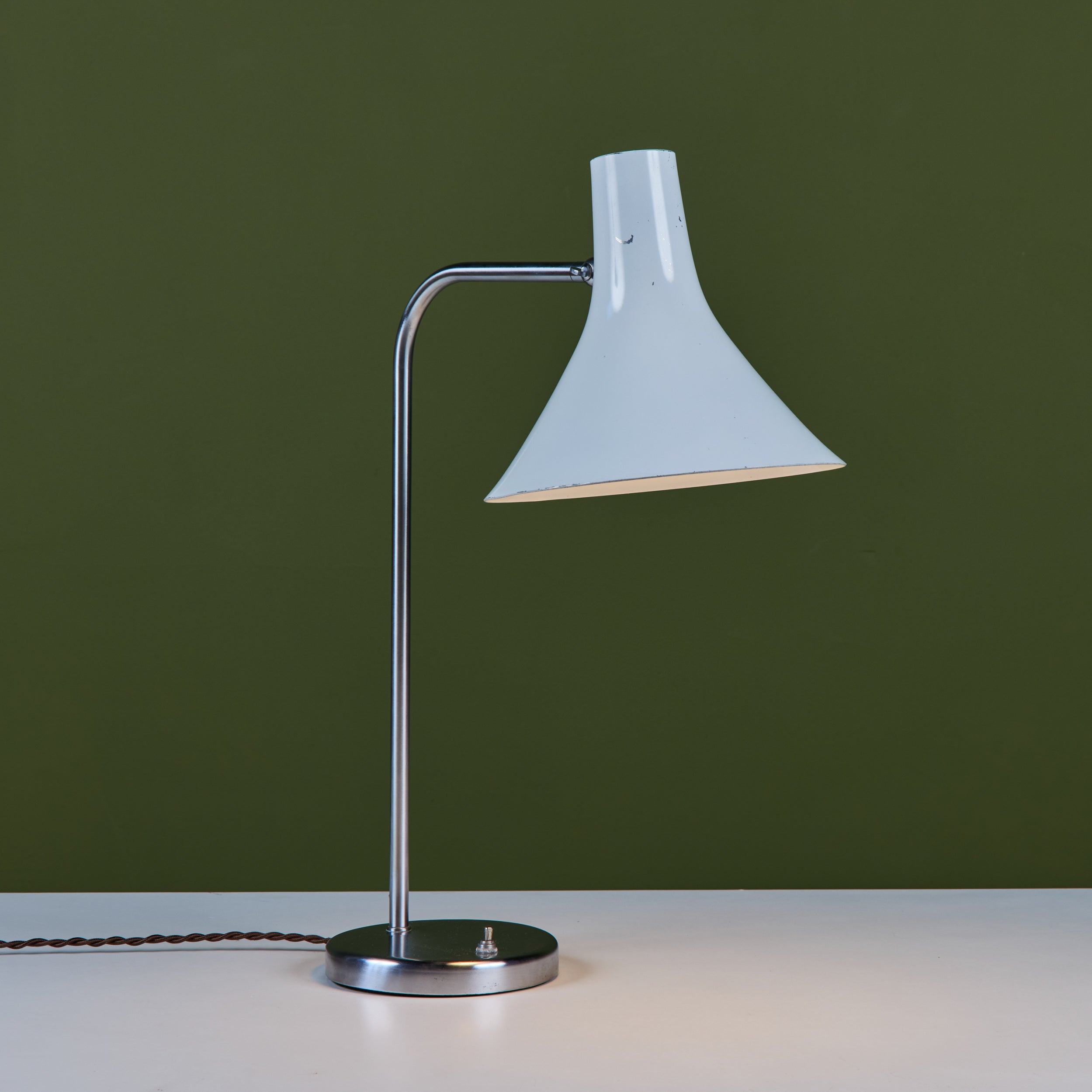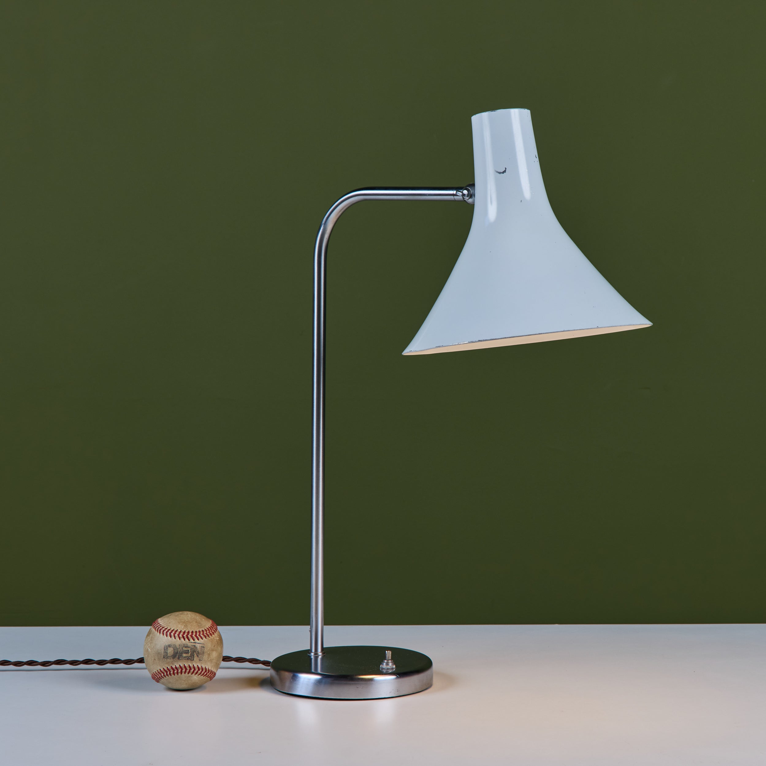 Desk lamp designed by Greta von Nessen c.1960s, USA, for Nessen Studios. The lamp features a white enameled trumpet shade that pivots up and down, with a curved steel arm that rotates left and right 90 degrees, set on a round base. On/Off switch on base.
