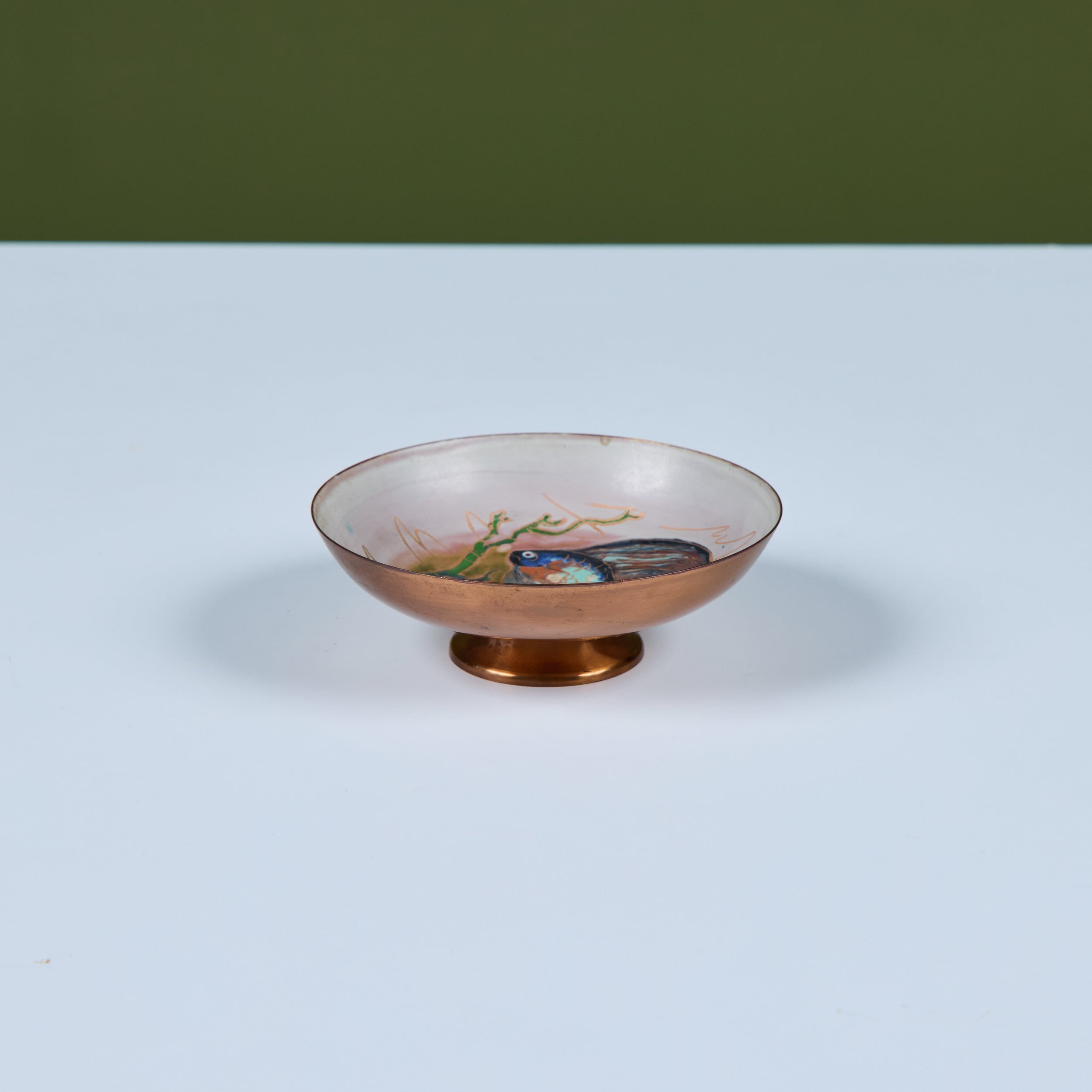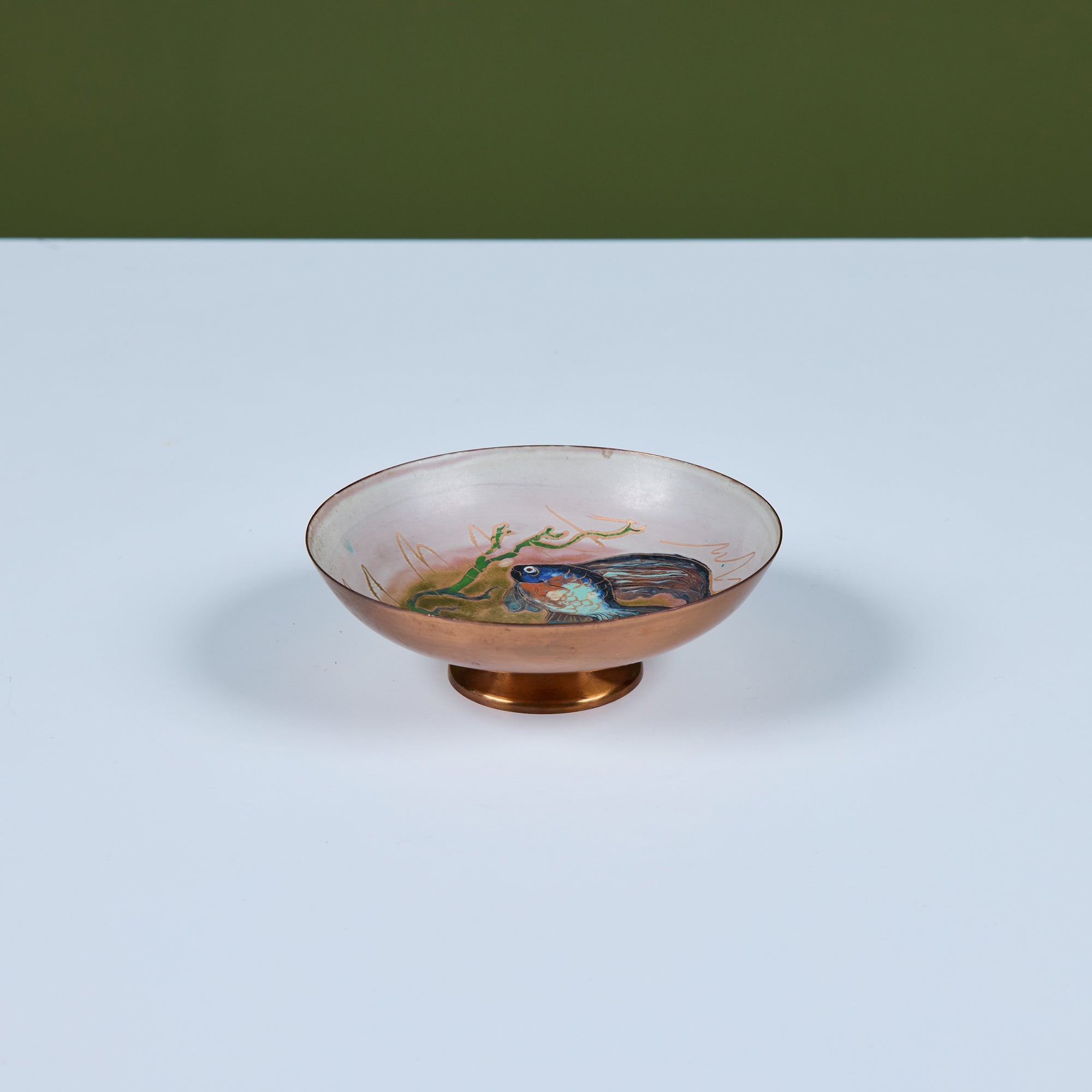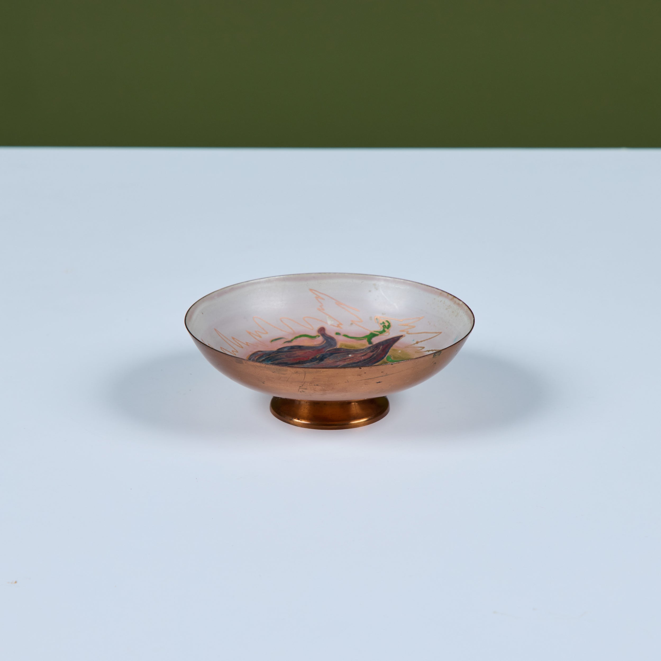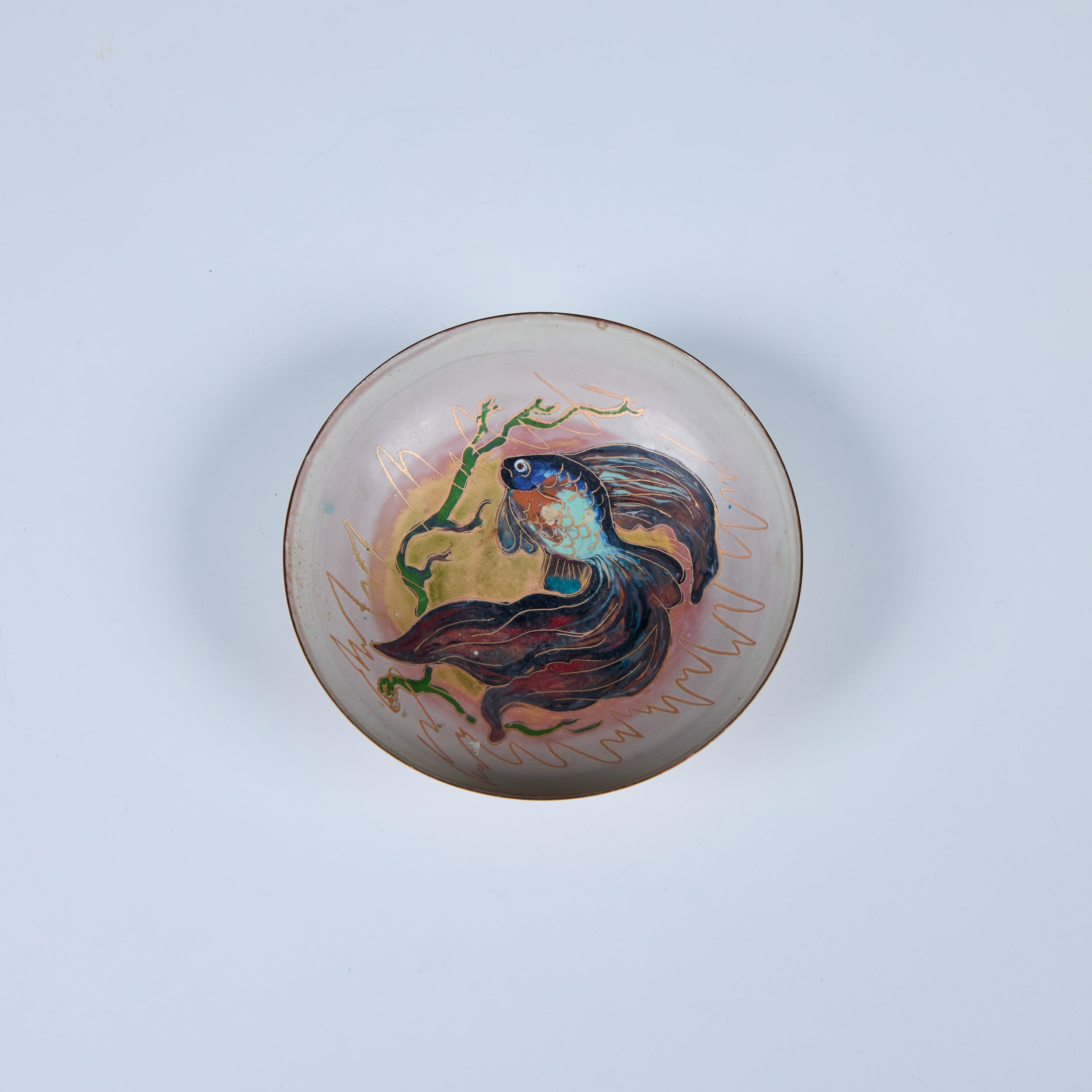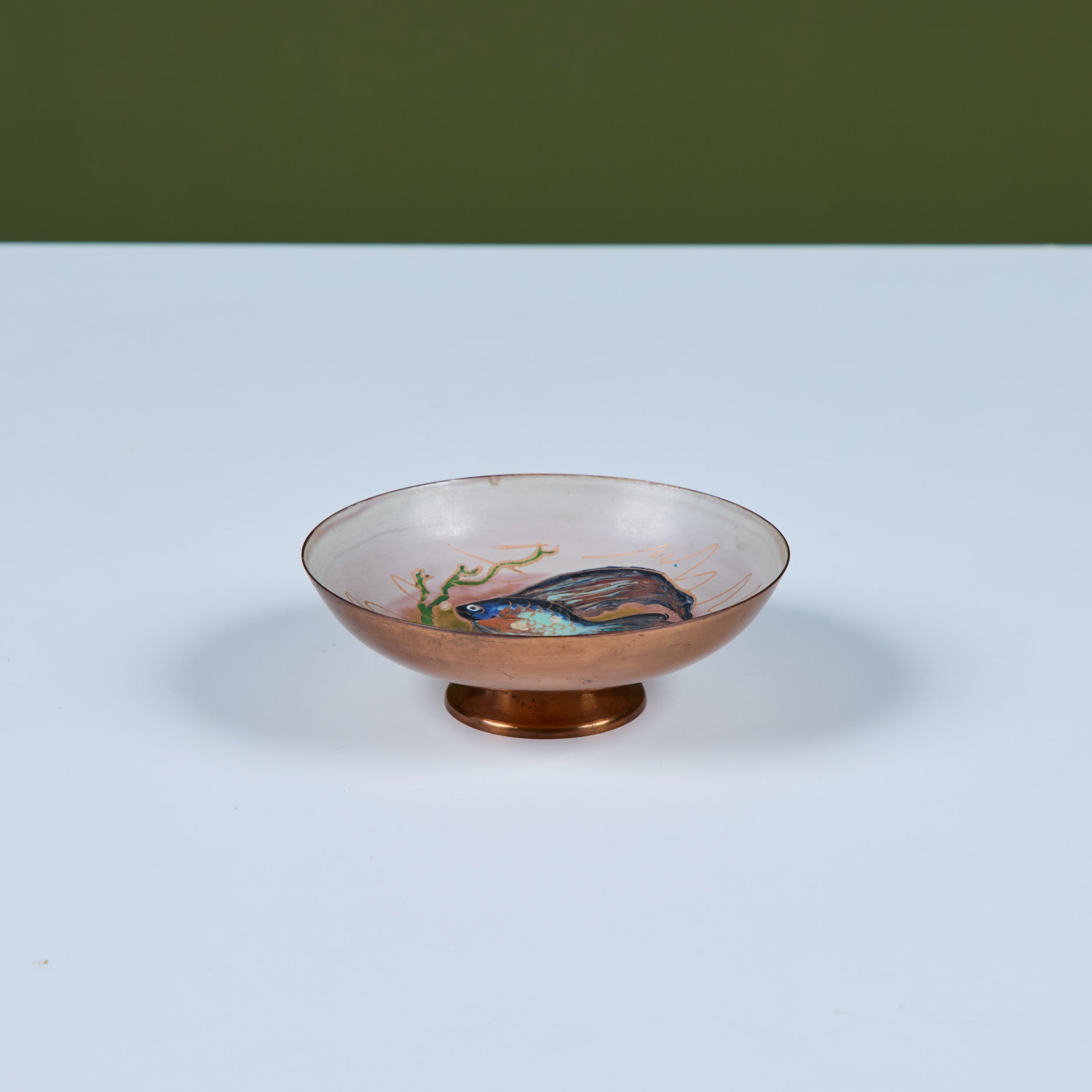 Copper enameled bowl by Krelage c.1960s, Holland. The bowl features a copper footed bowl with a hand painted enamel basin showcasing a fighting fish.