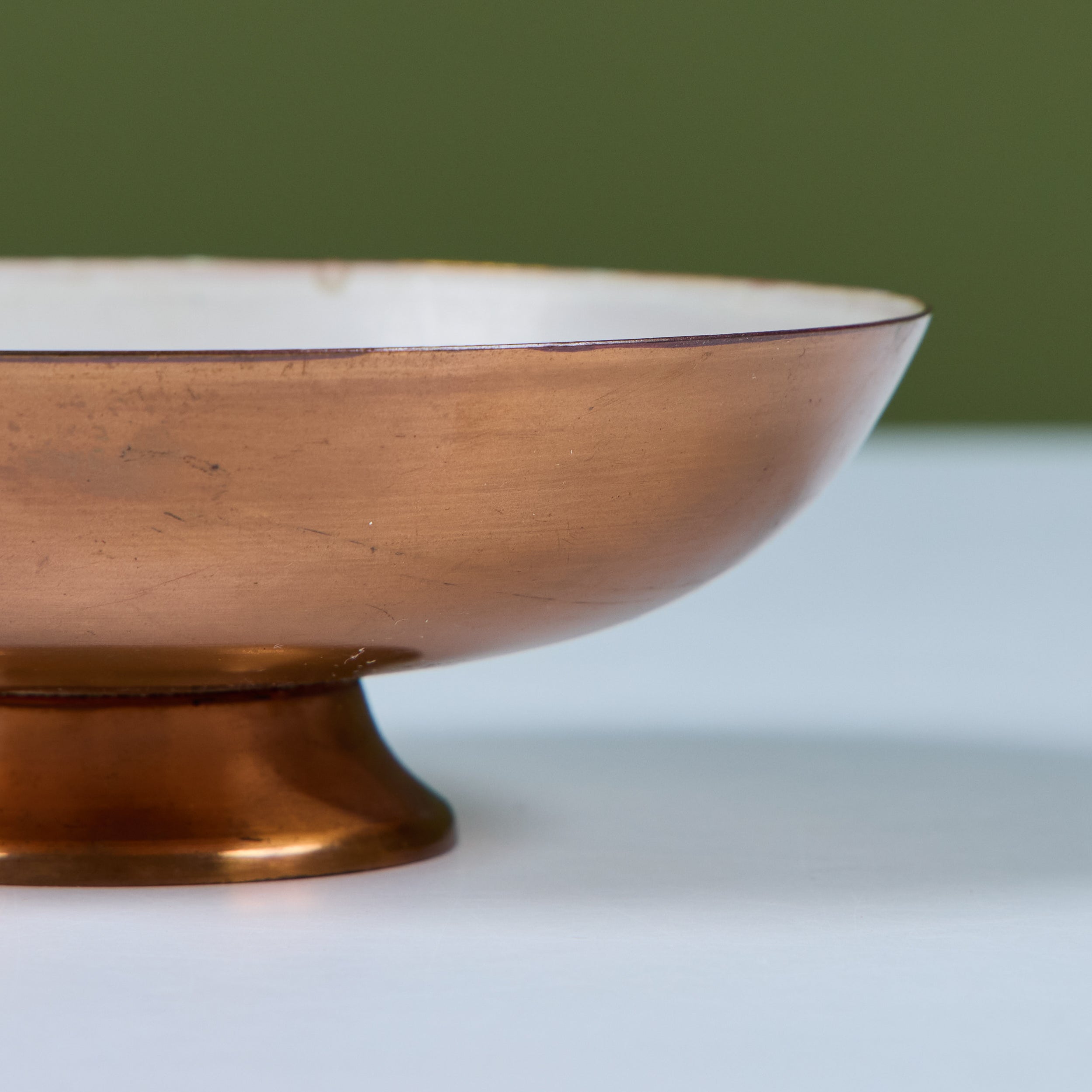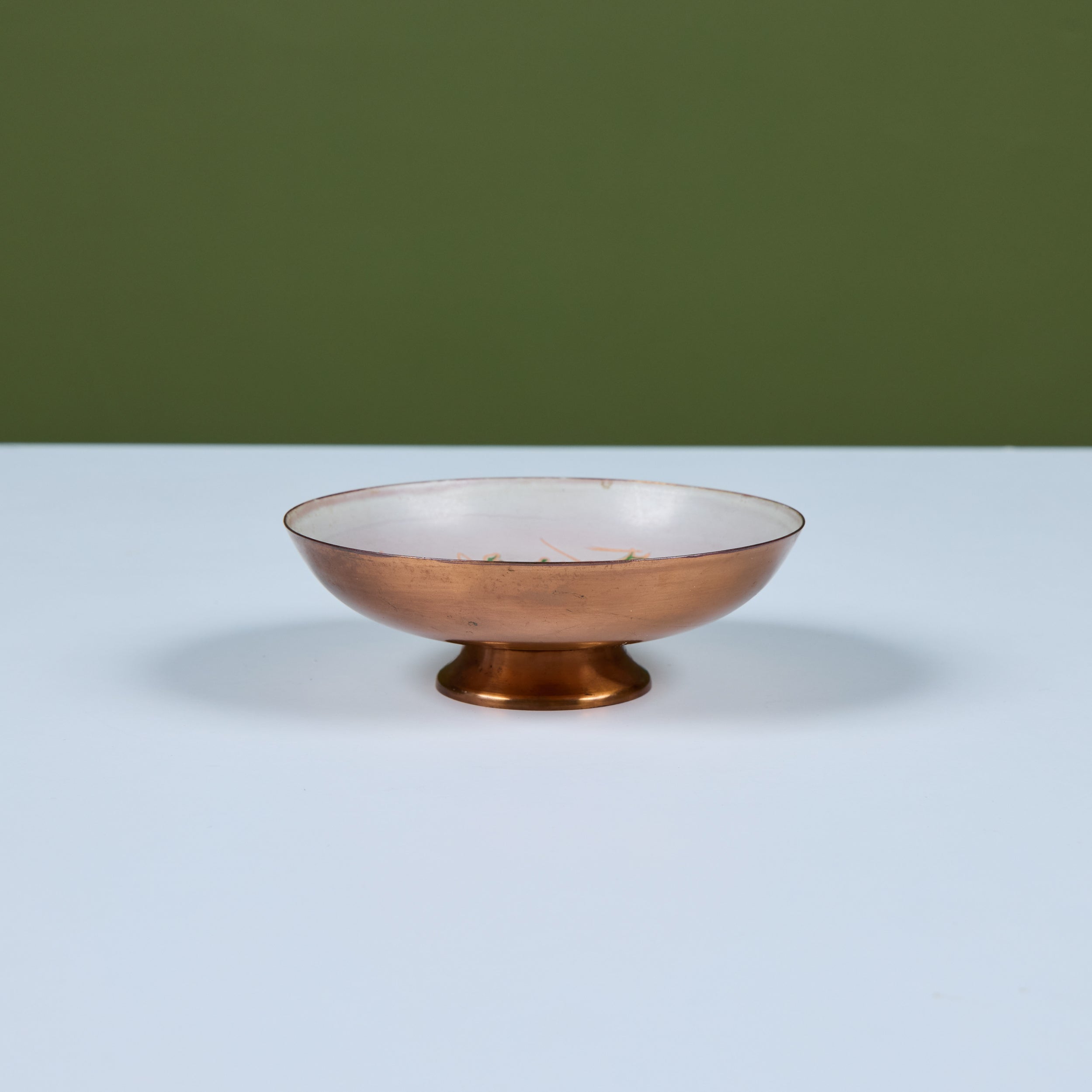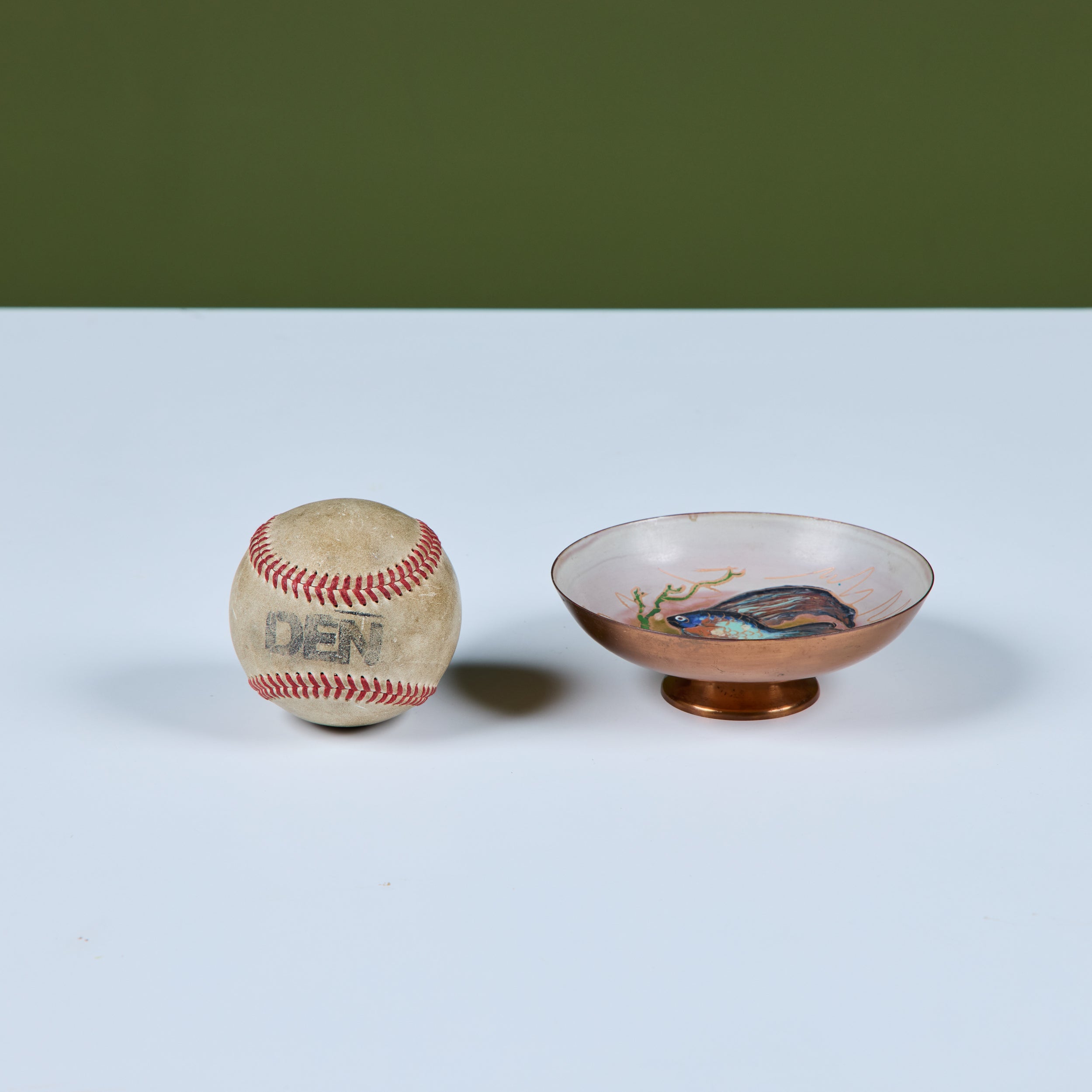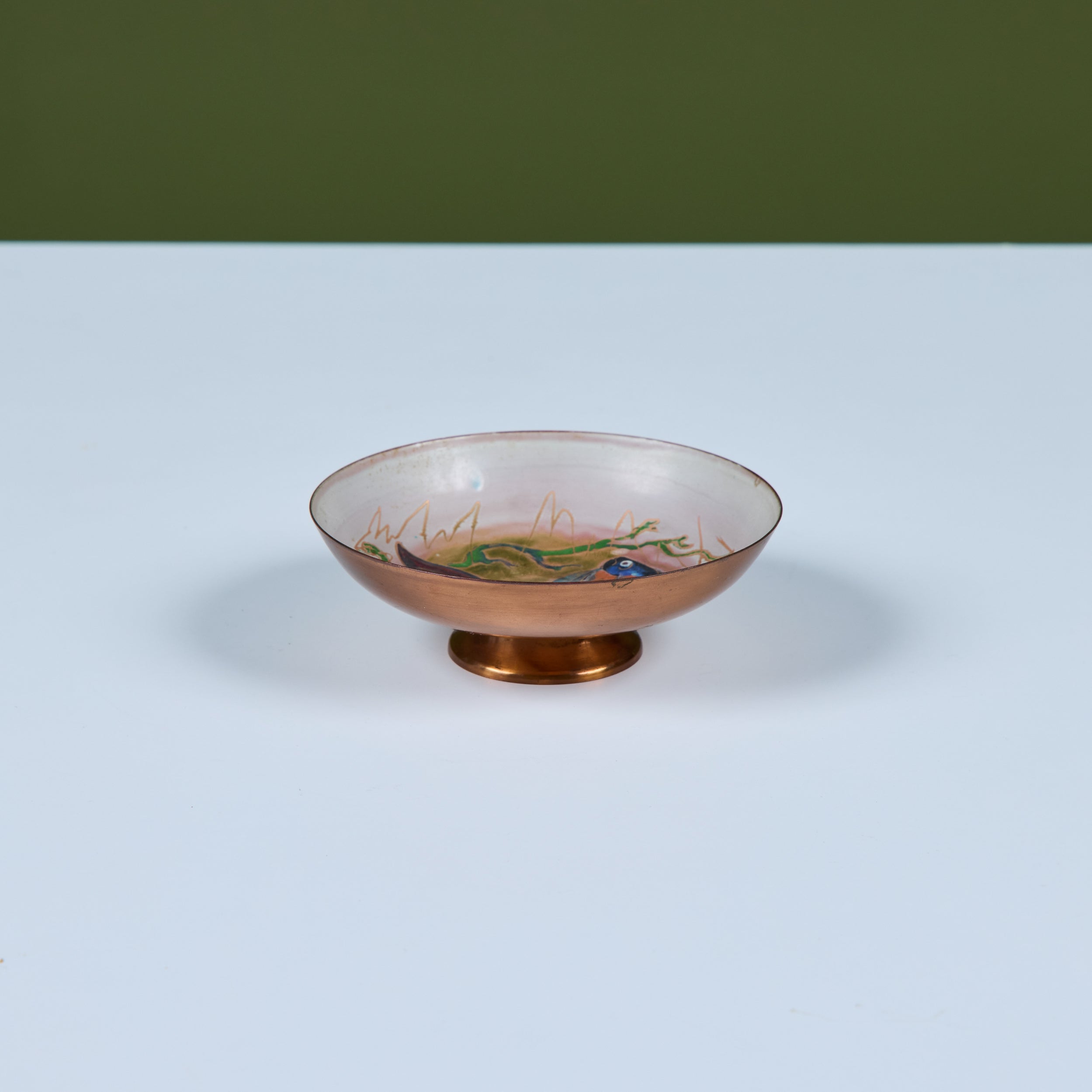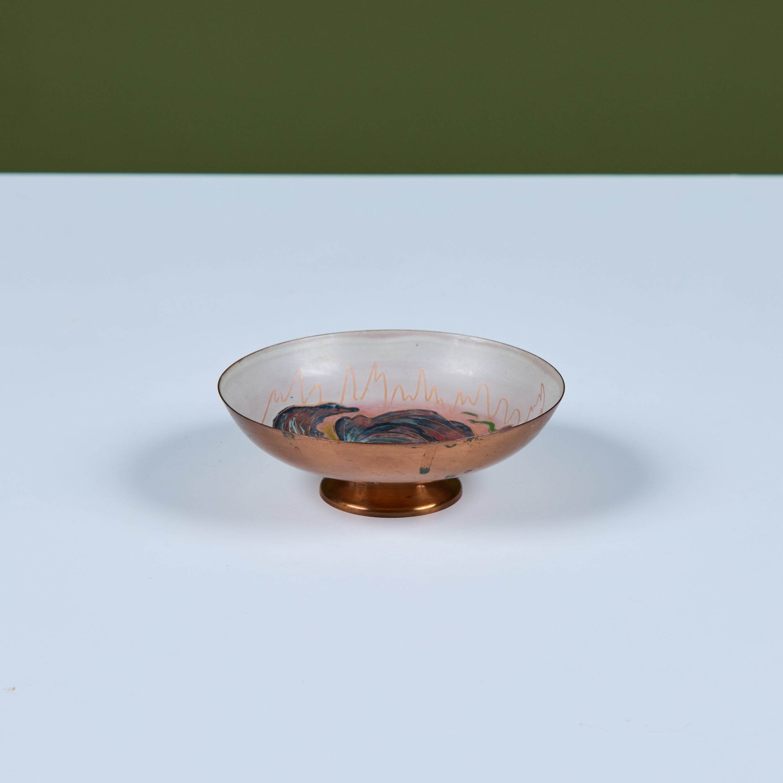 Copper enameled bowl by Krelage c.1960s, Holland. The bowl features a copper footed bowl with a hand painted enamel basin showcasing a fighting fish.