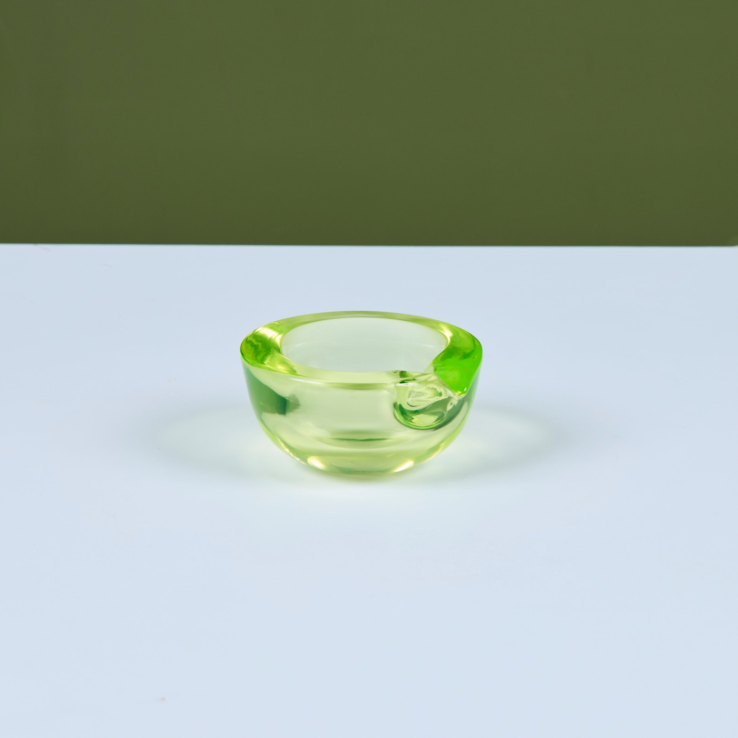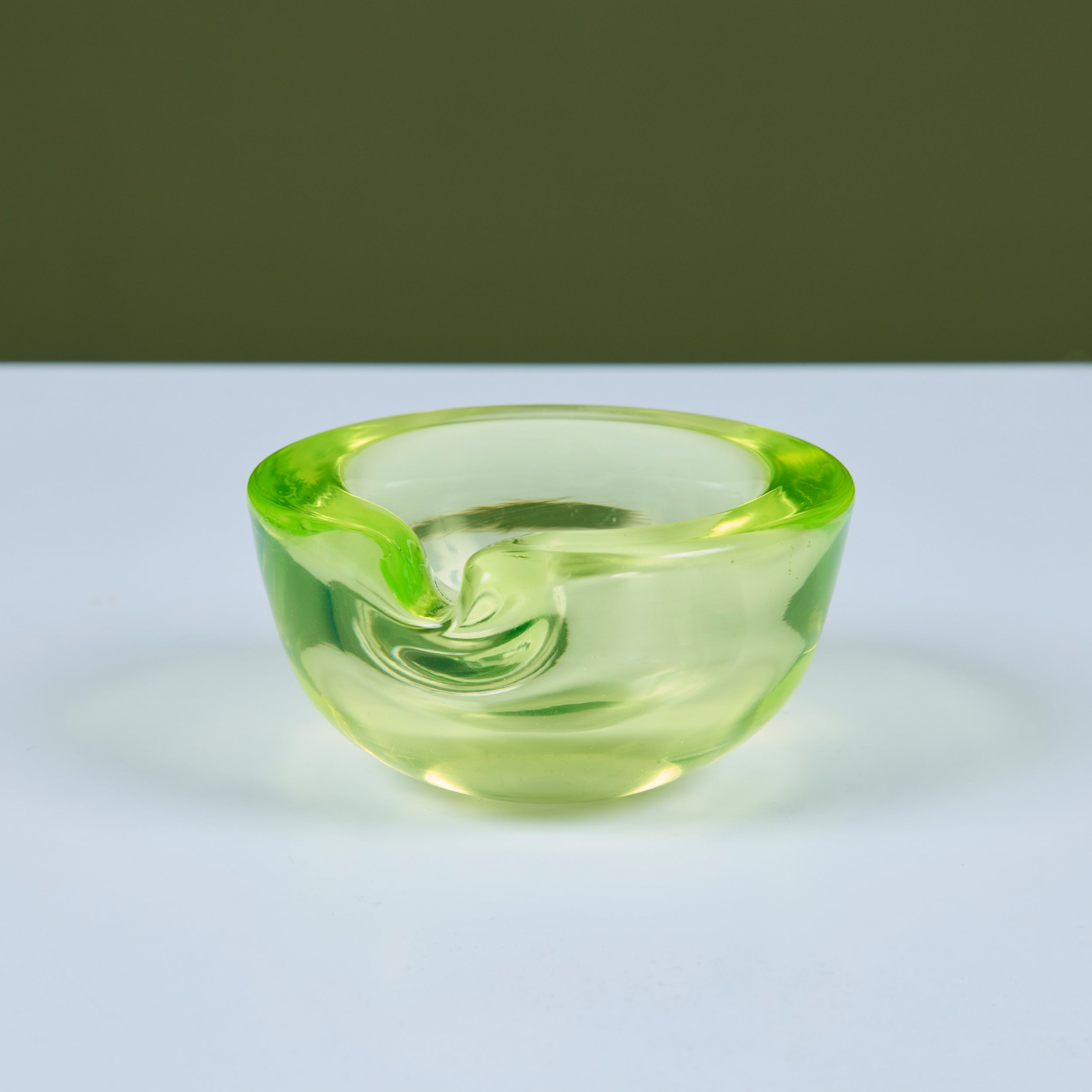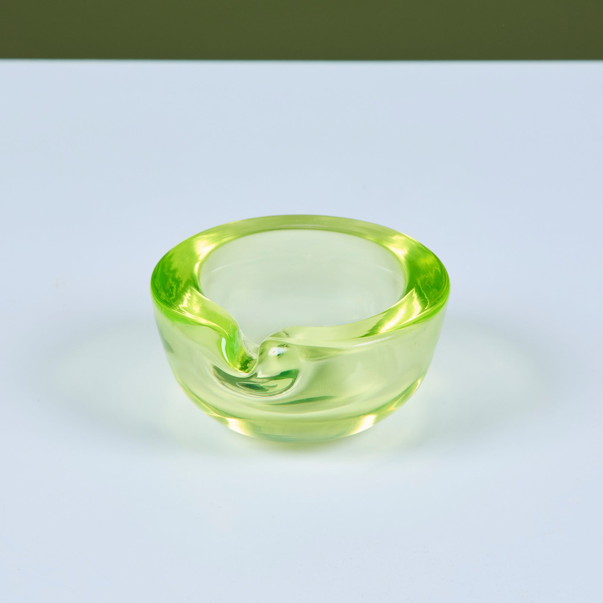 Circular pinched-glass bowl or ashtray. Featuring an exquisite uranium glass, radiating a neon yellowish-green, makes for a bold statement. Made of thick glass this sculptural piece can be used as a vide poche, decorative dish, paper weight or ashtray.