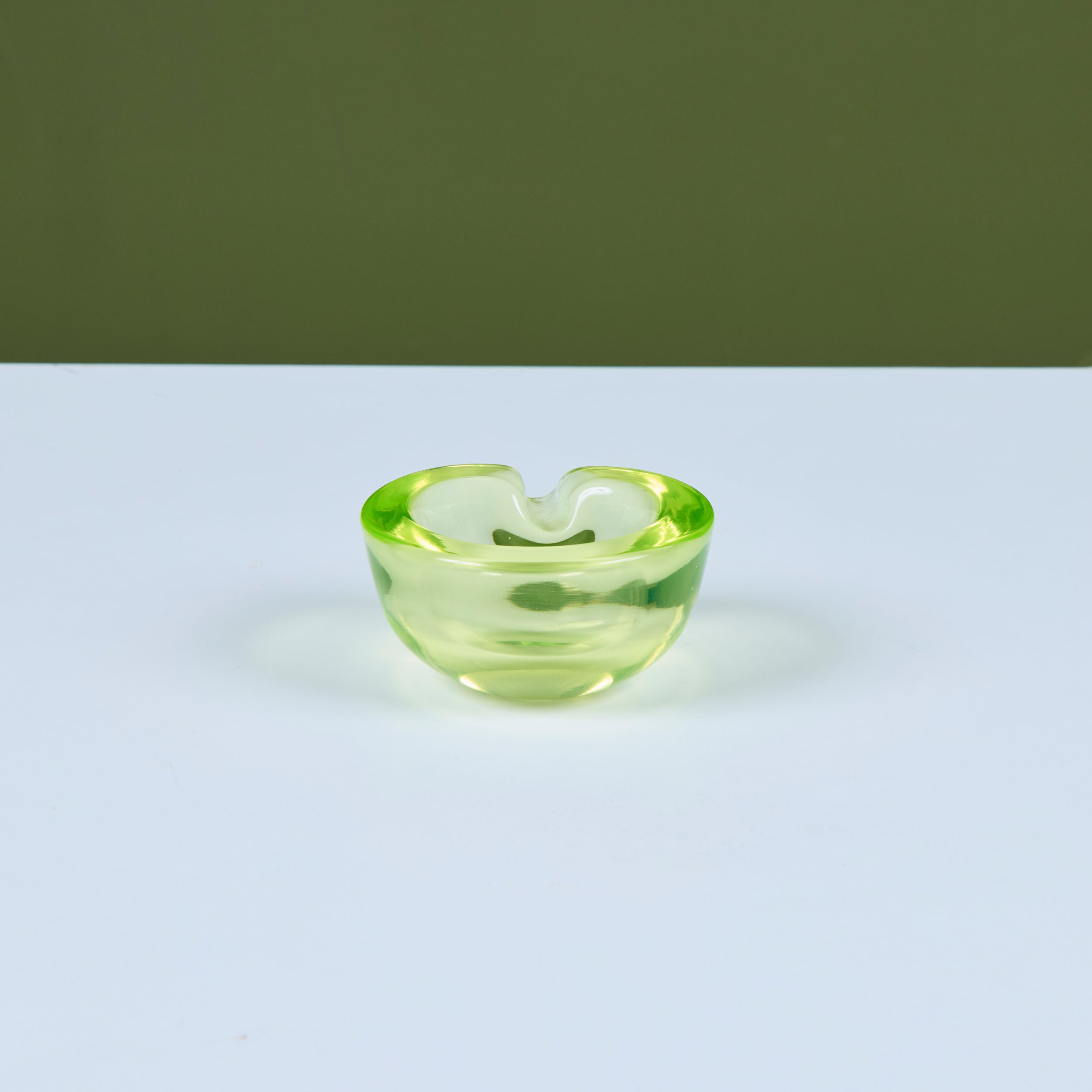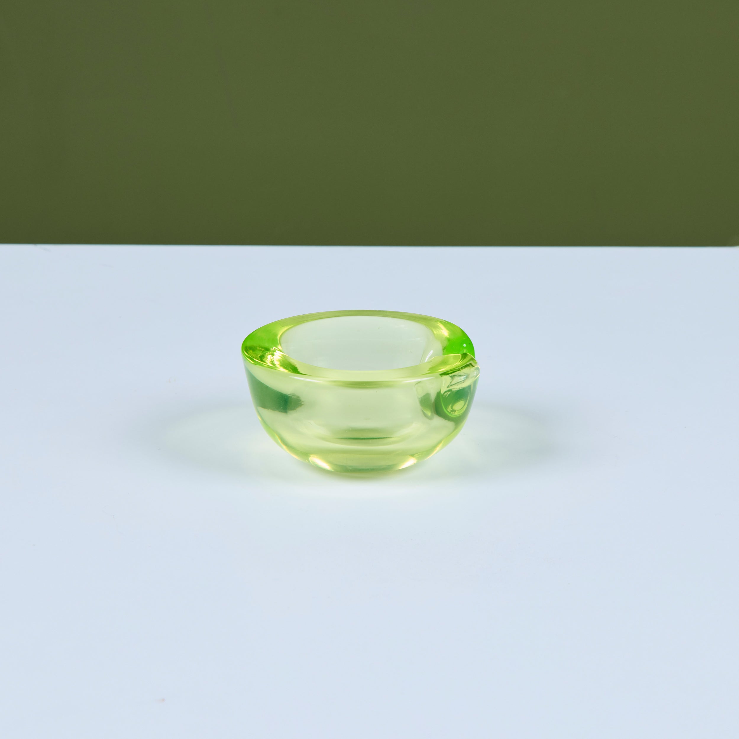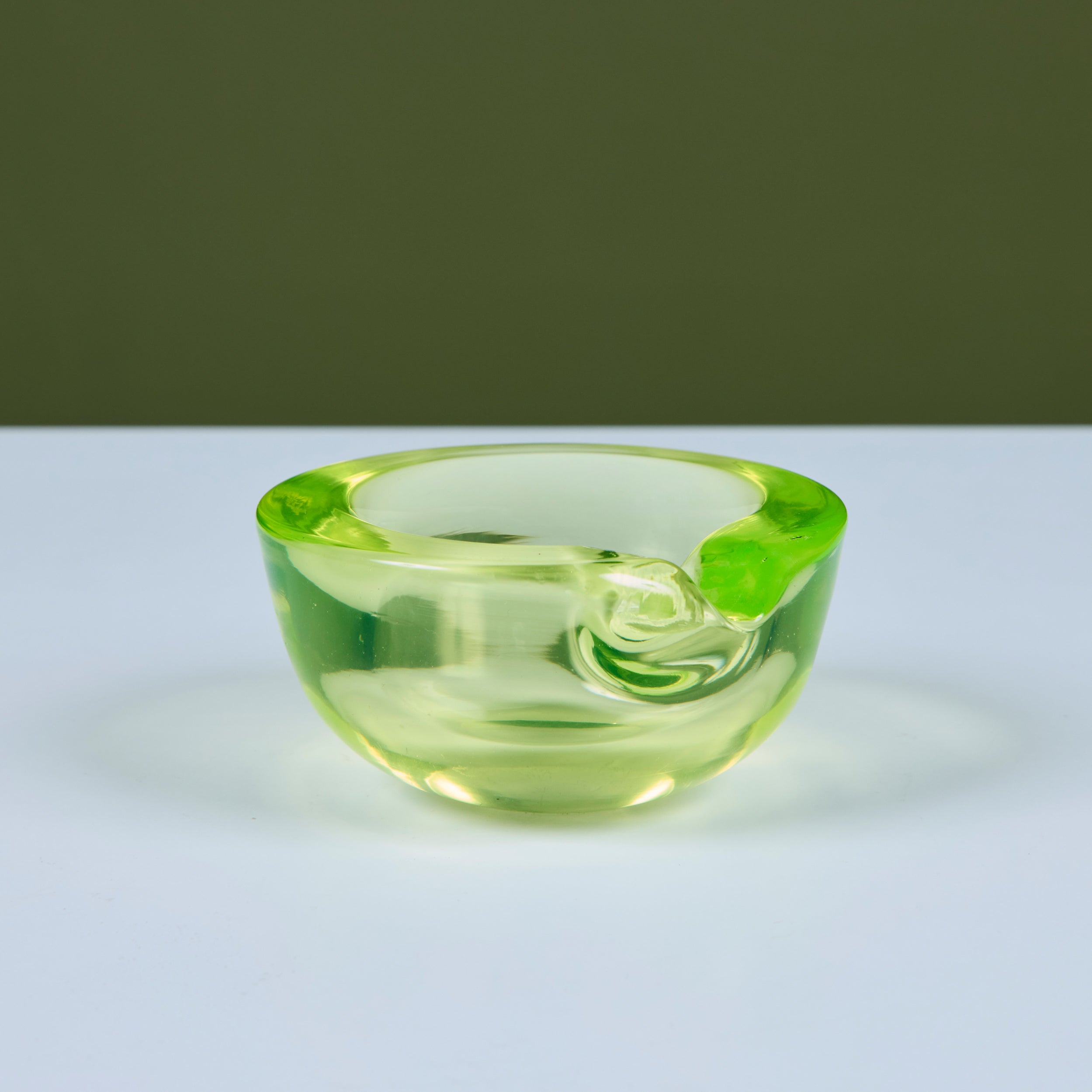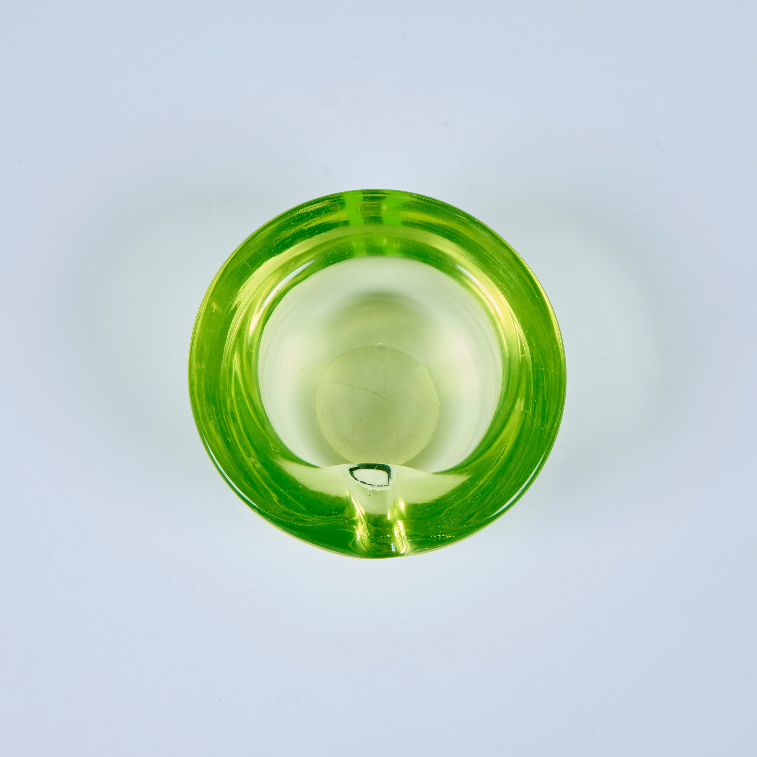 Circular pinched-glass bowl or ashtray. Featuring an exquisite uranium glass, radiating a neon yellowish-green, makes for a bold statement. Made of thick glass this sculptural piece can be used as a vide poche, decorative dish, paper weight or ashtray.