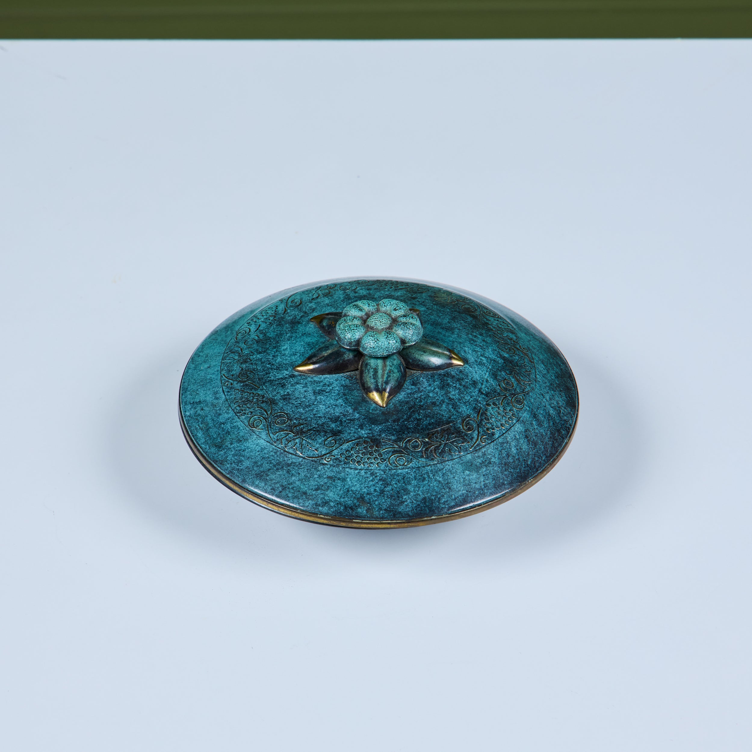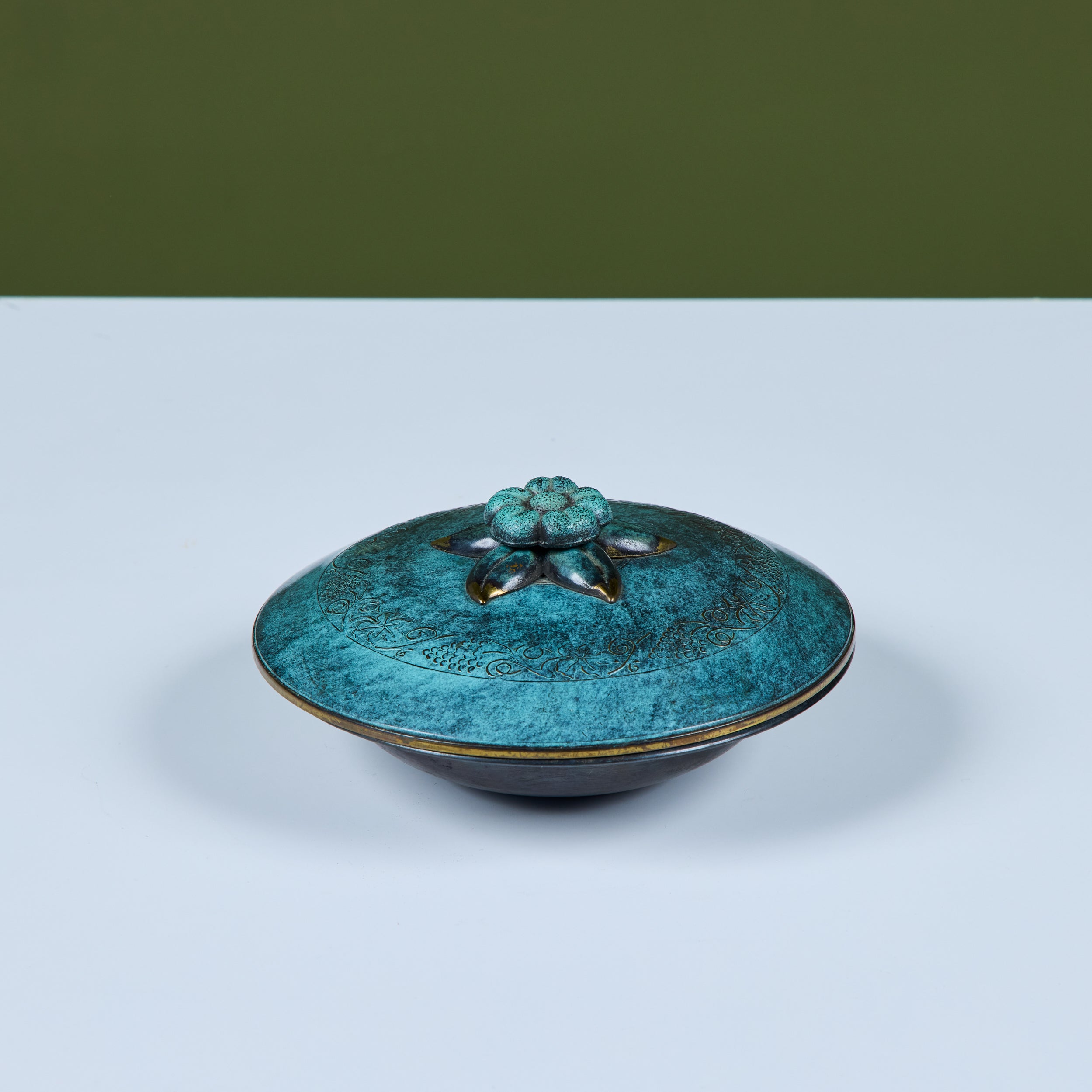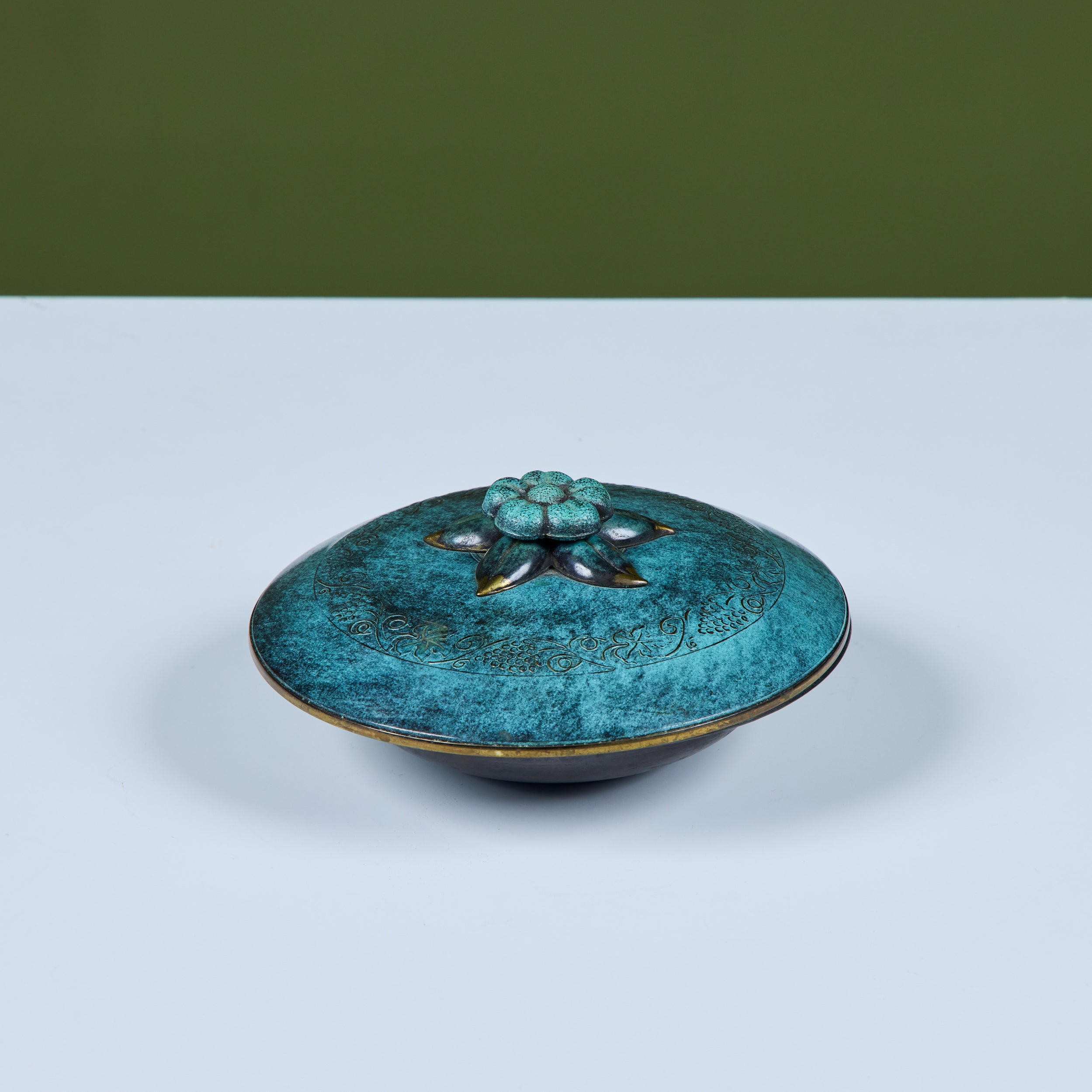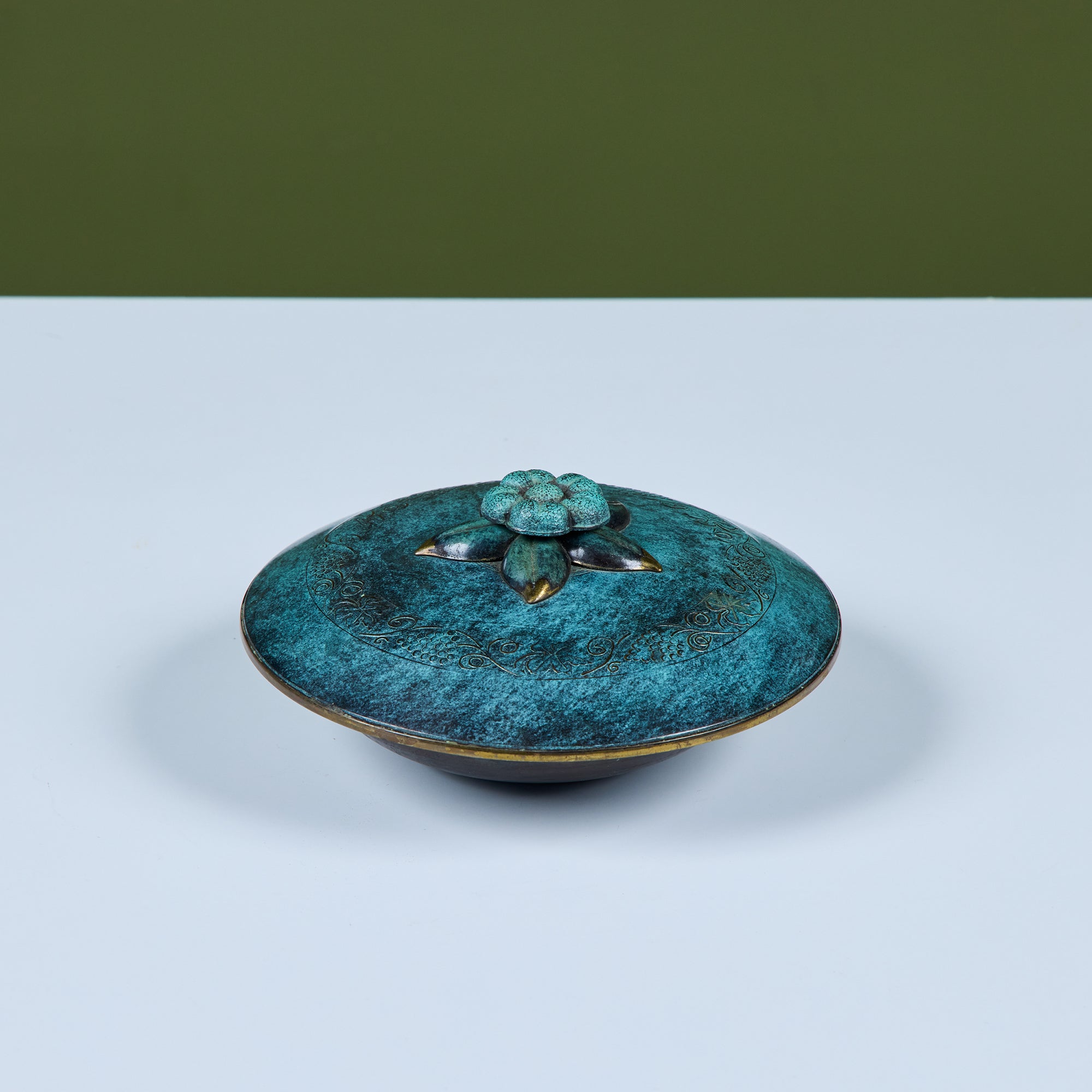 Pal-Bell round bowl with lid. This piece features a verdigris bronze bowl and lid with floral detailed knob with brass tips. Perfect for stashing keys, jewels or potpourri. An embossed stamp on the underside of the bowl reads PAL BELL - Made in Israel.