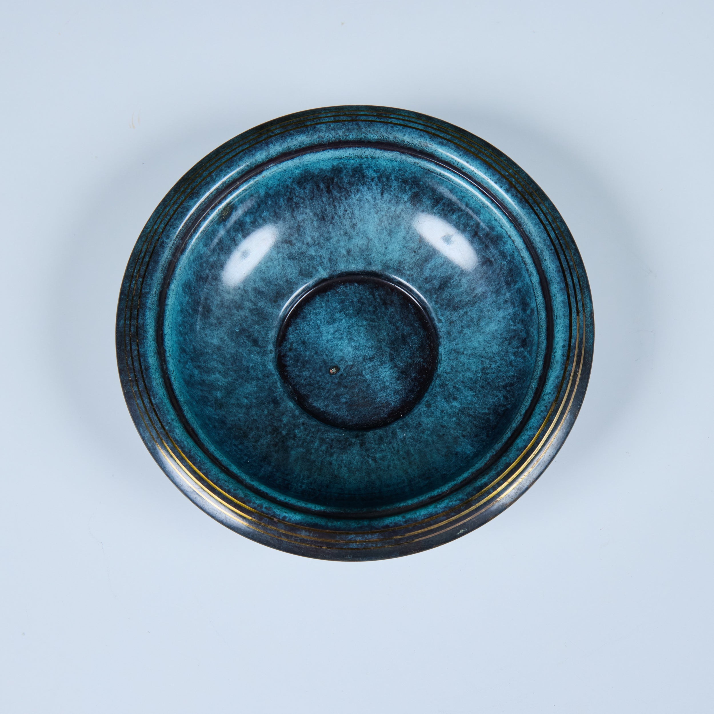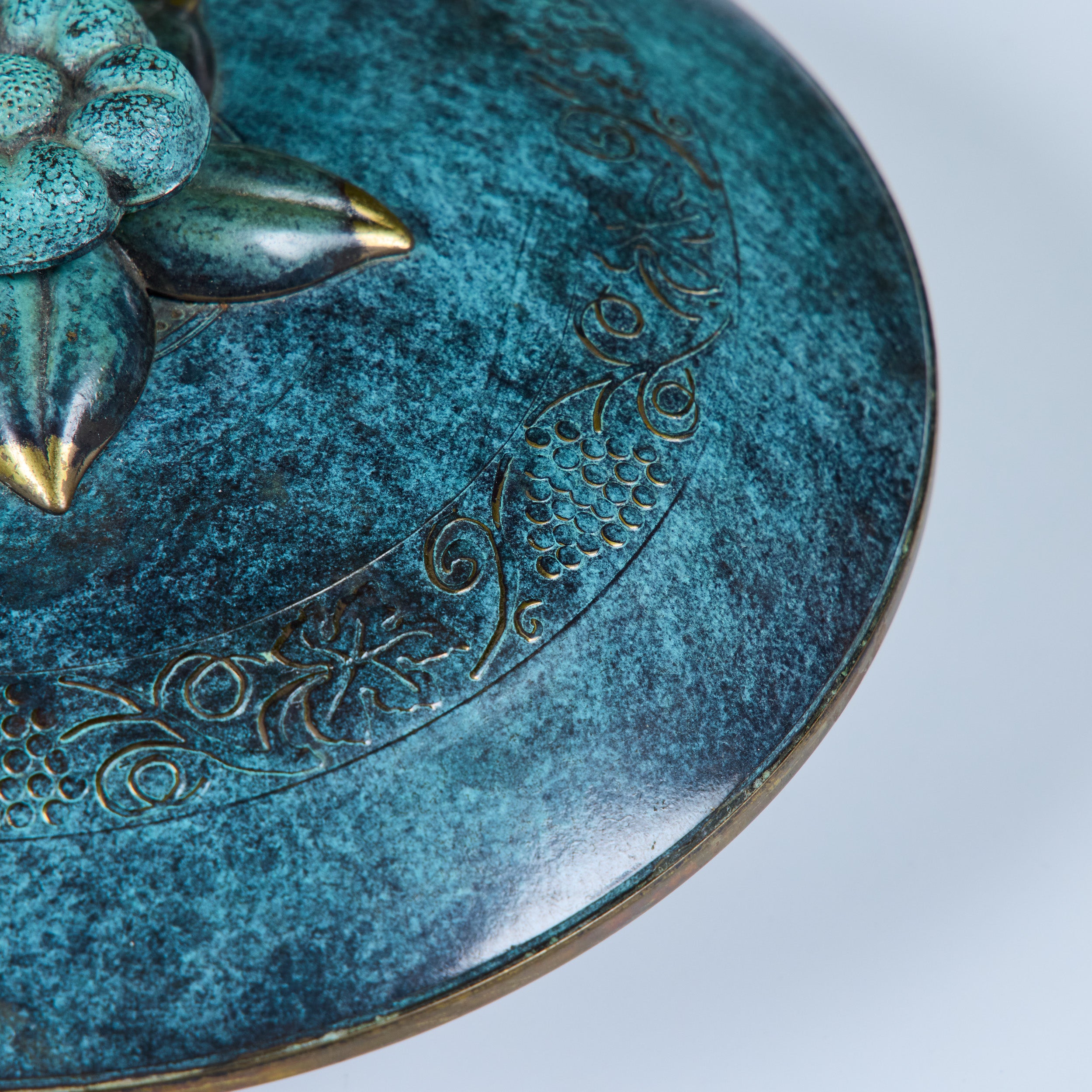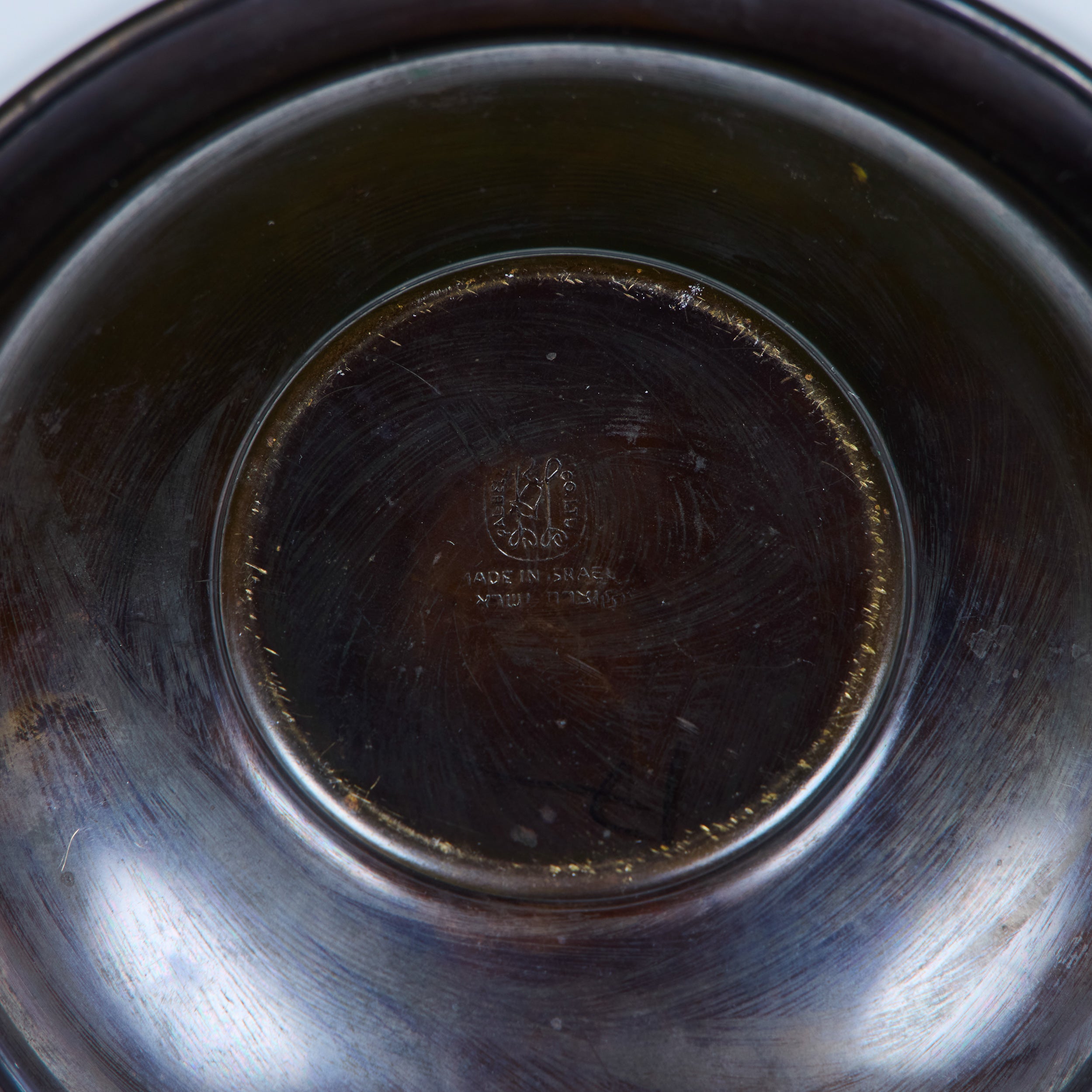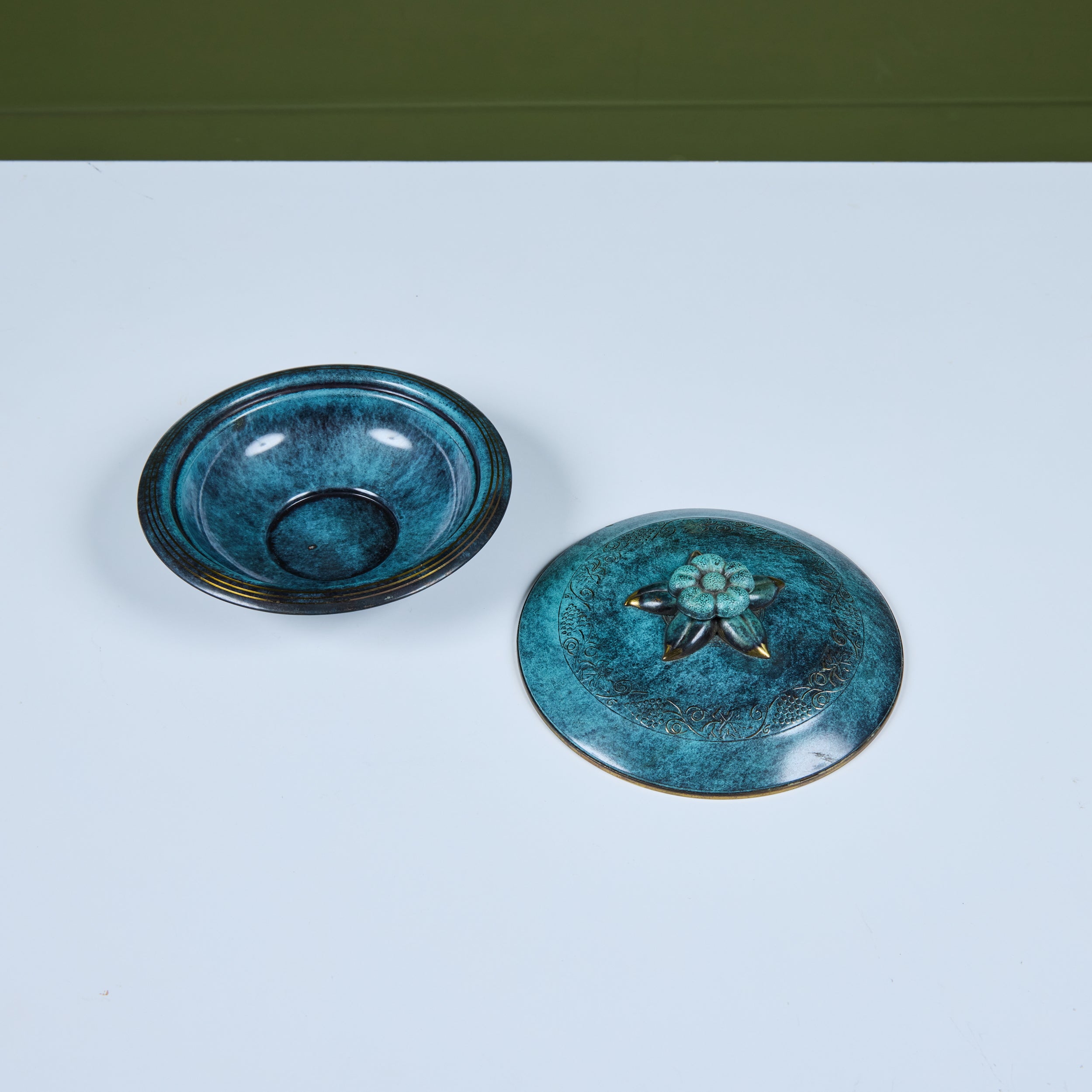 Pal-Bell round bowl with lid. This piece features a verdigris bronze bowl and lid with floral detailed knob with brass tips. Perfect for stashing keys, jewels or potpourri. An embossed stamp on the underside of the bowl reads PAL BELL - Made in Israel.