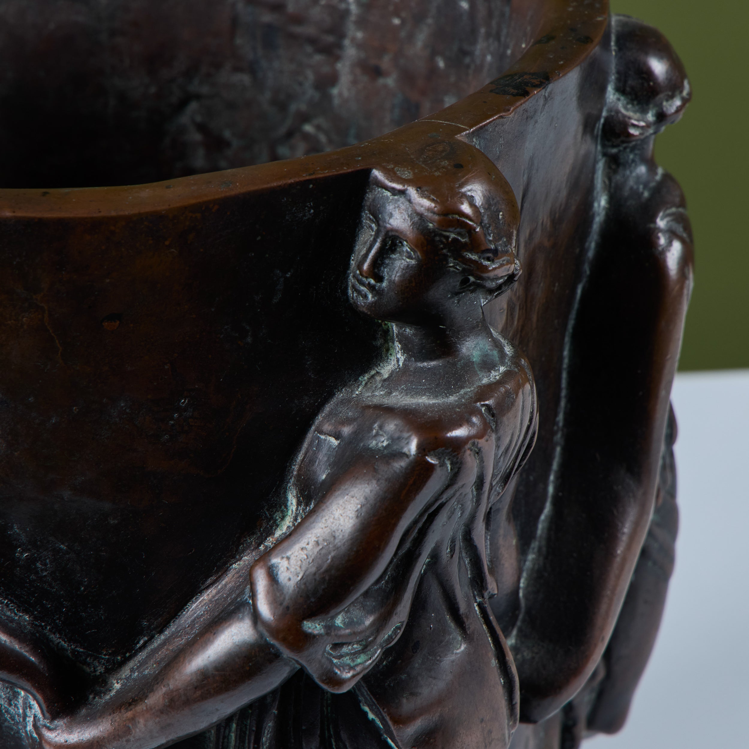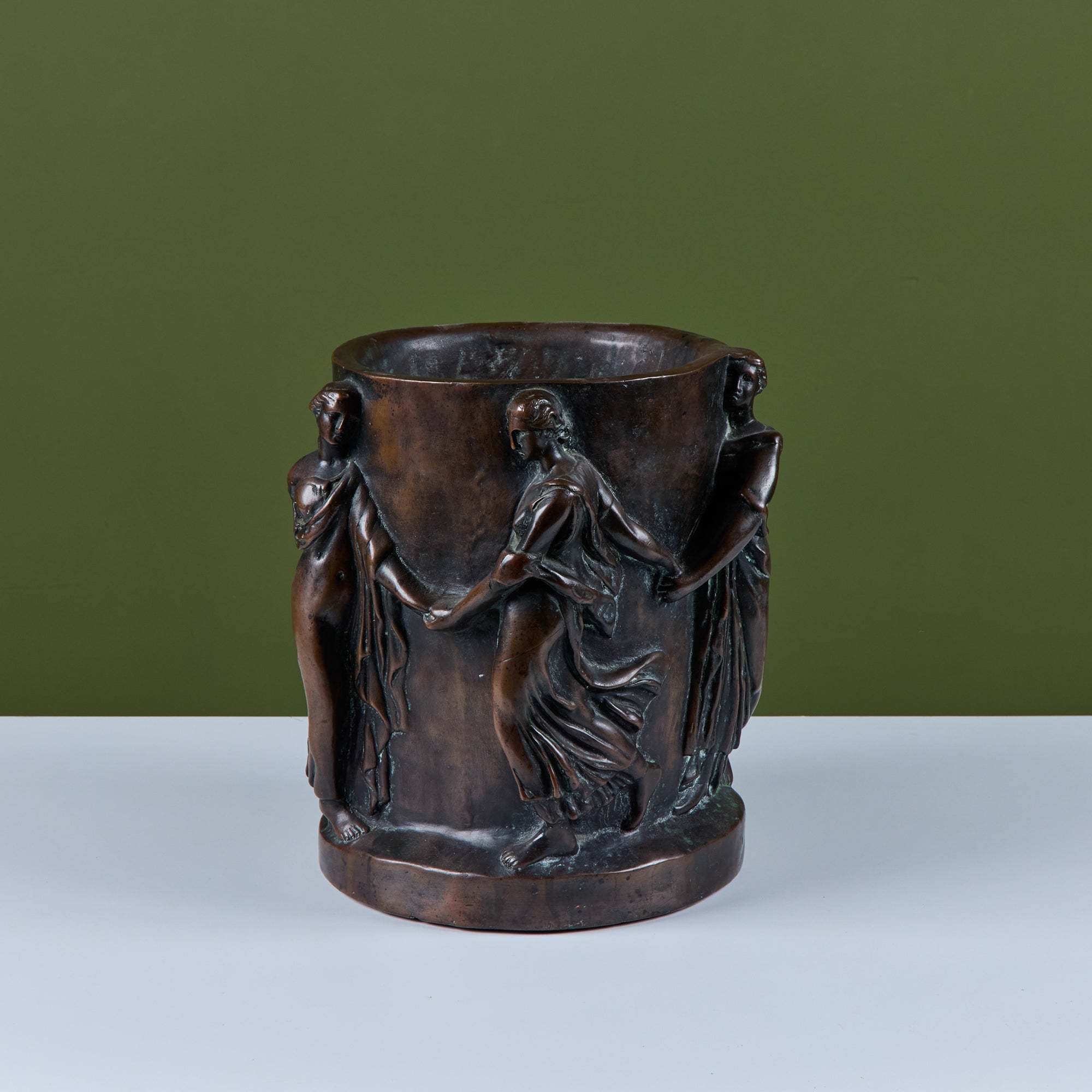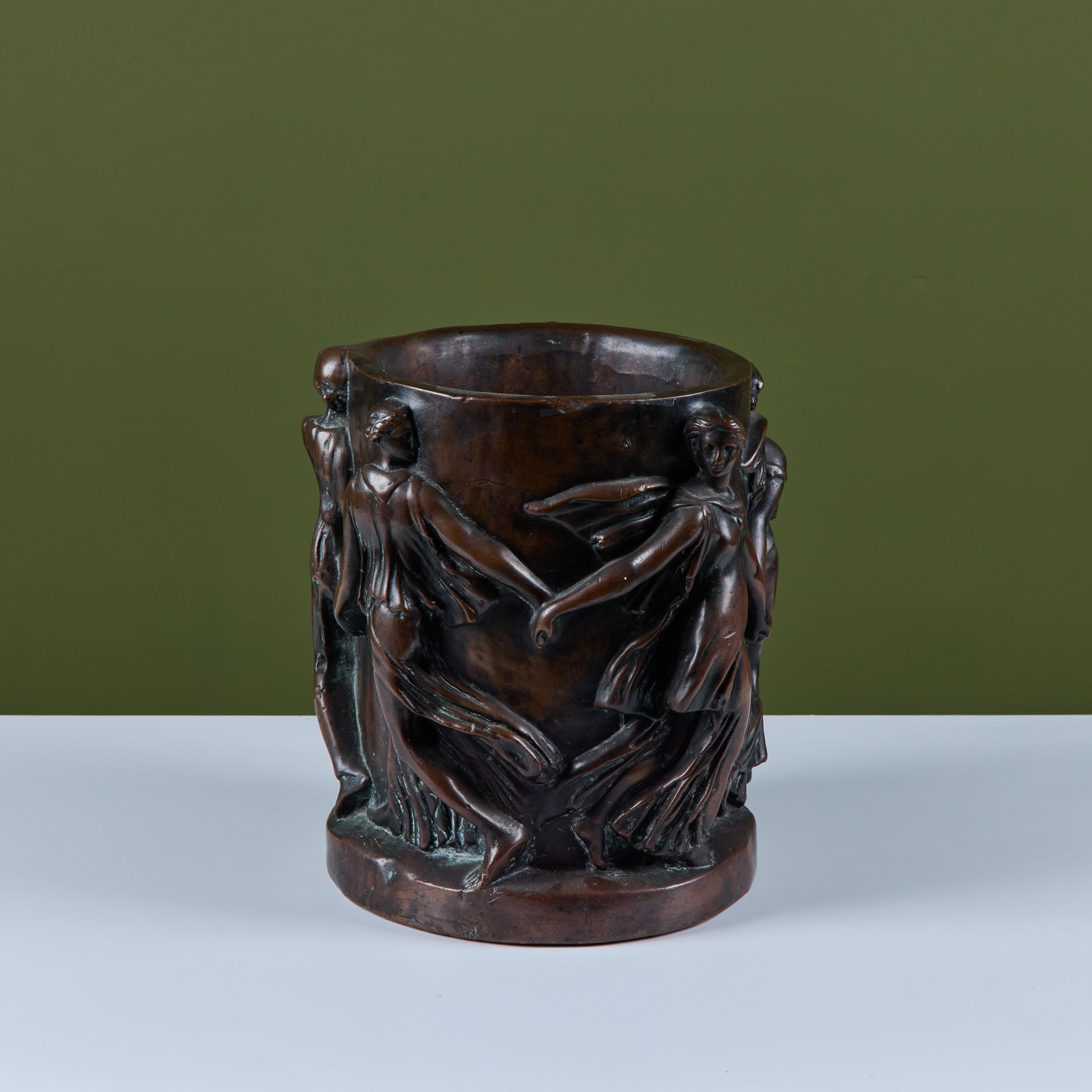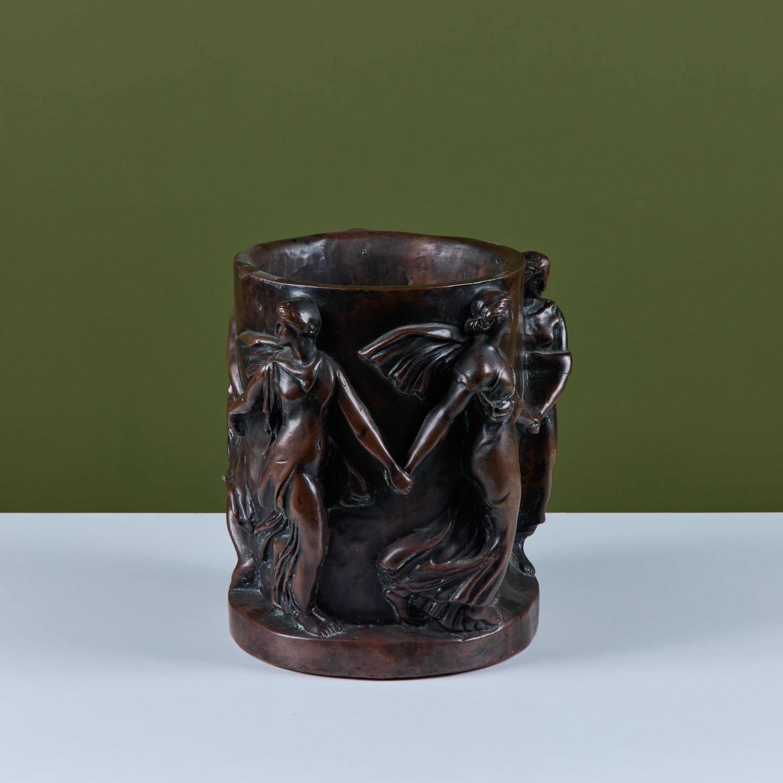 Plaster planter with a bronze colored coating. The planter depicts figures draped in cloth holding hands around the planter.