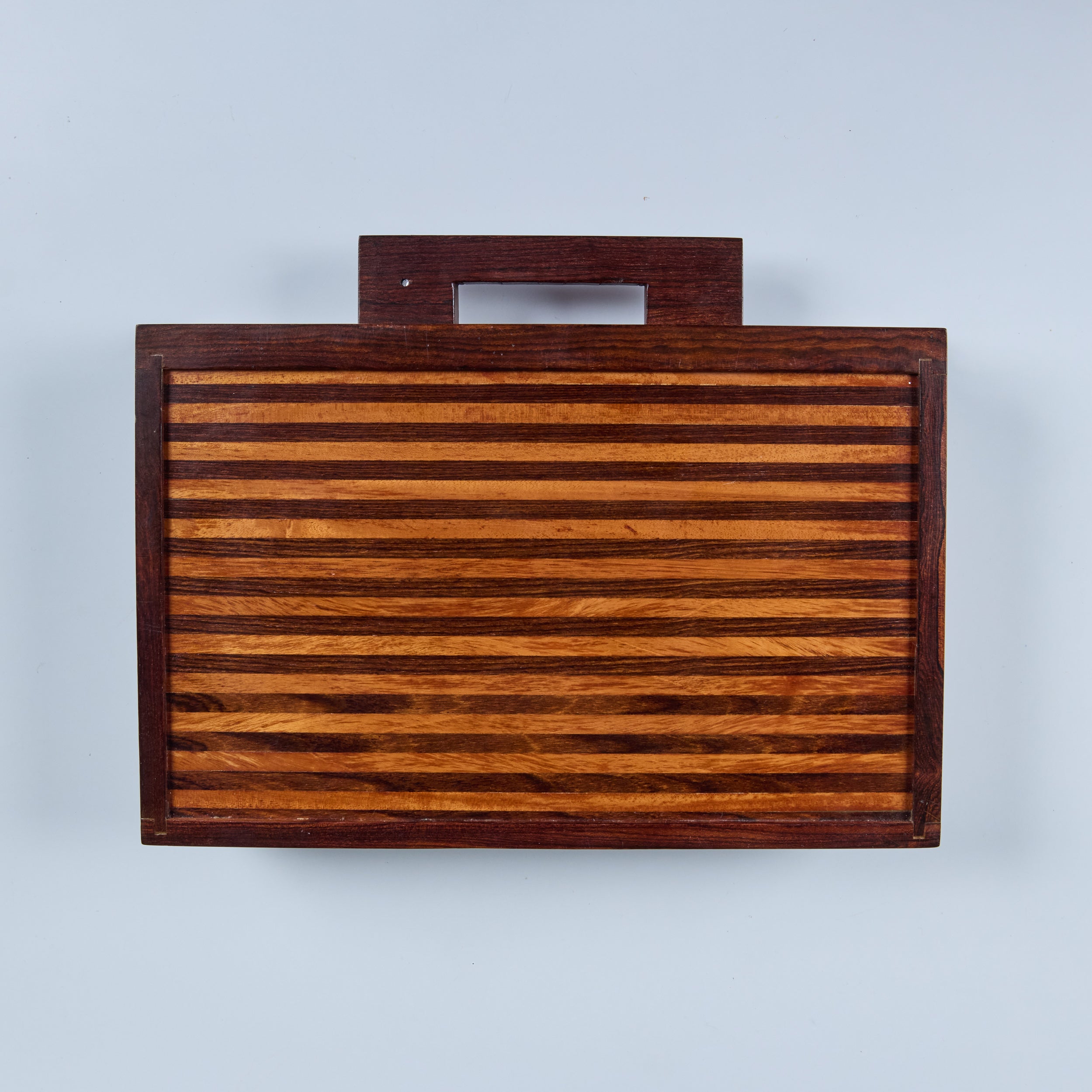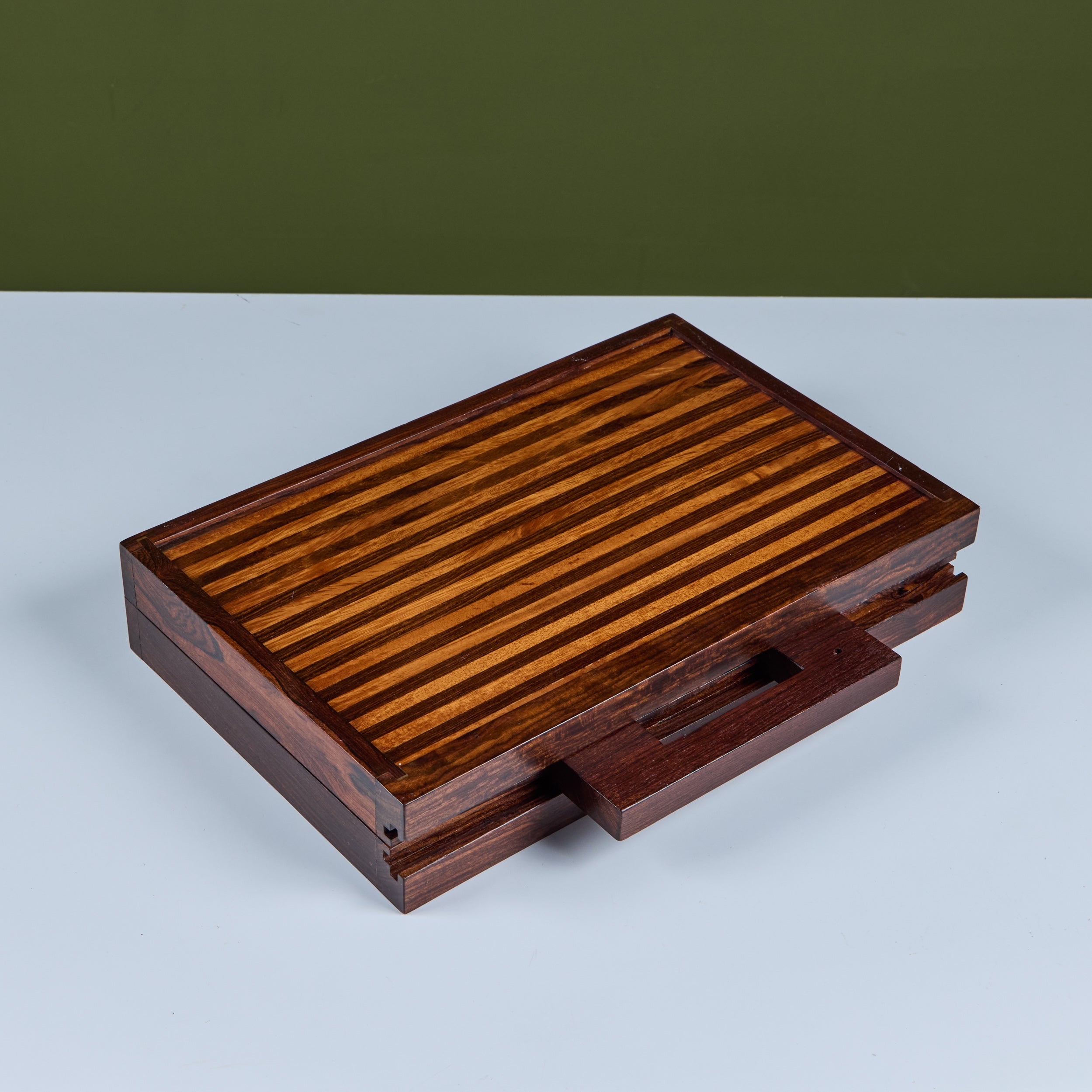 A modernist backgammon set by US-born, Mexico-based designer Don Shoemaker for his company Señal. This portable set includes the game board, which folds up into a carrying case, checkers, rolling dice, doubling dice and leather cups. Made from local hardwood trees, the points of the game board are formed by marquetry inlays. A removable rosewood handle slides into the grooves of the closed game board and fastens with a pin to secure the carrying case.