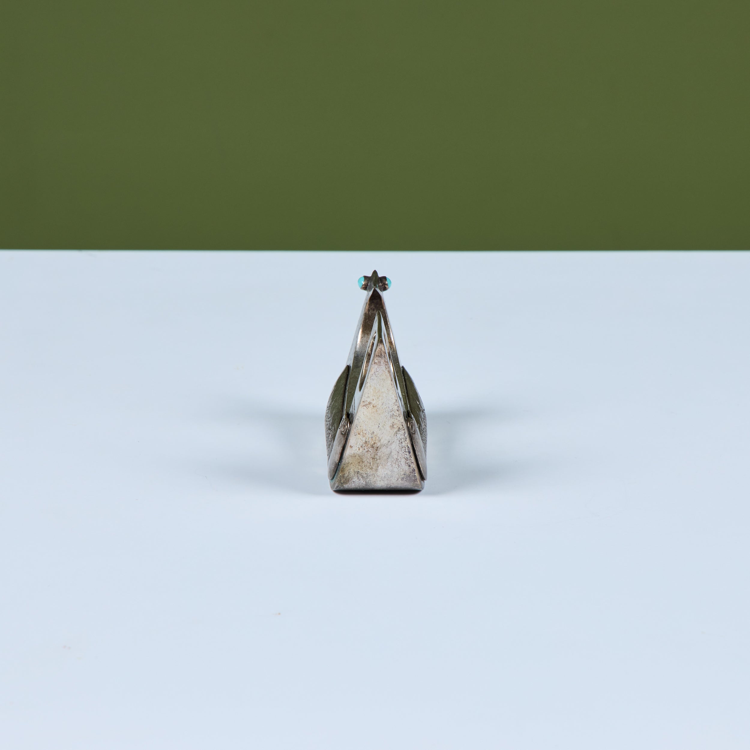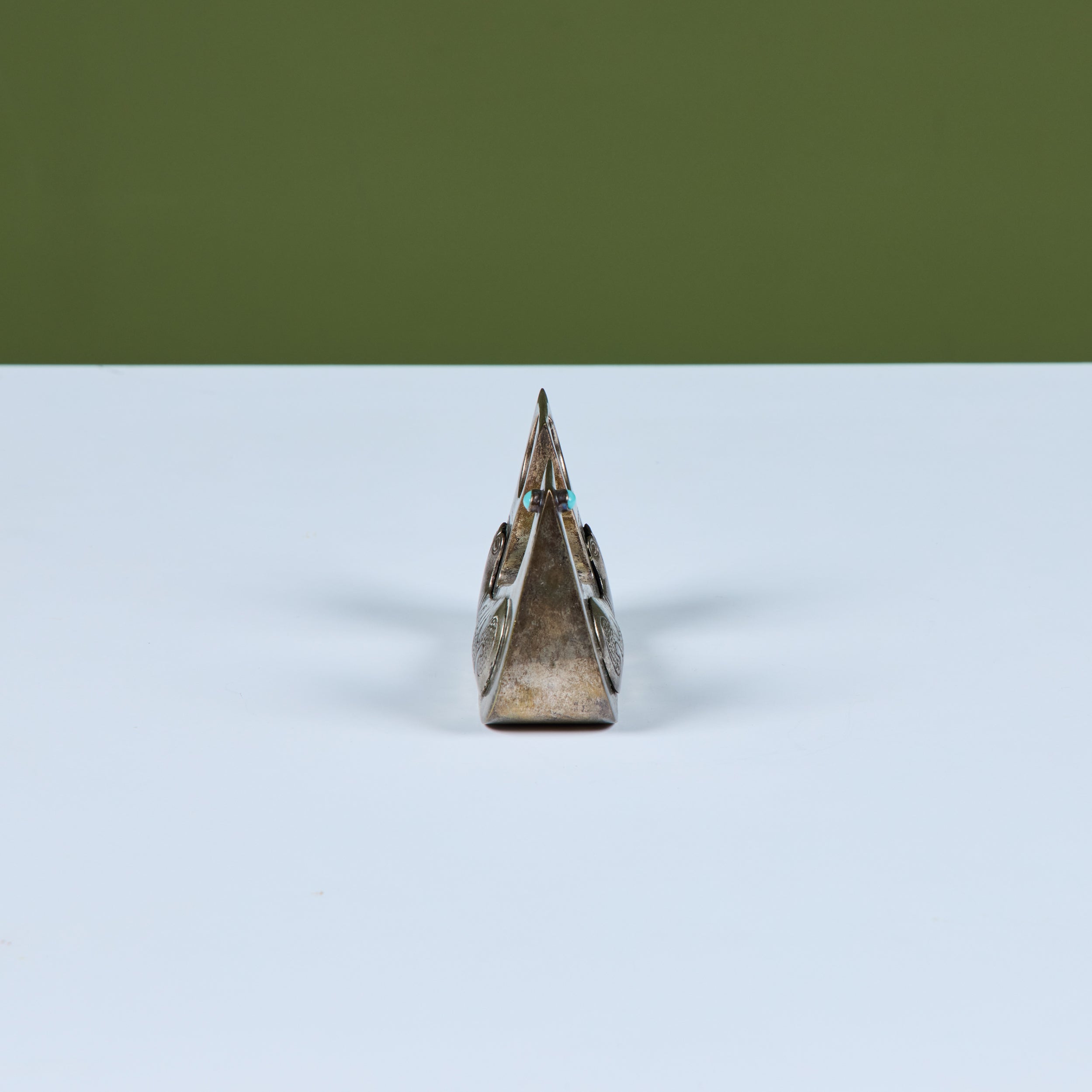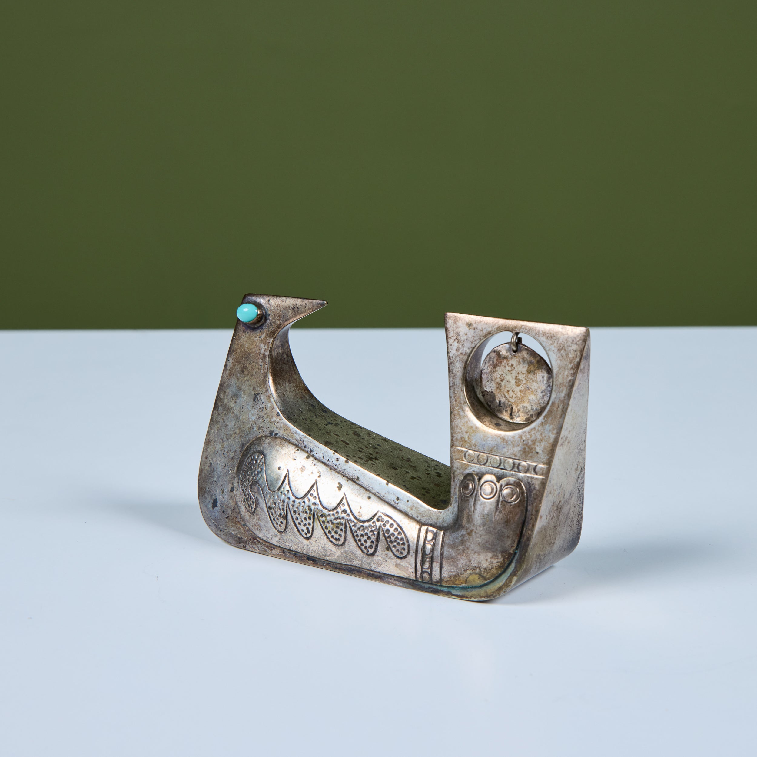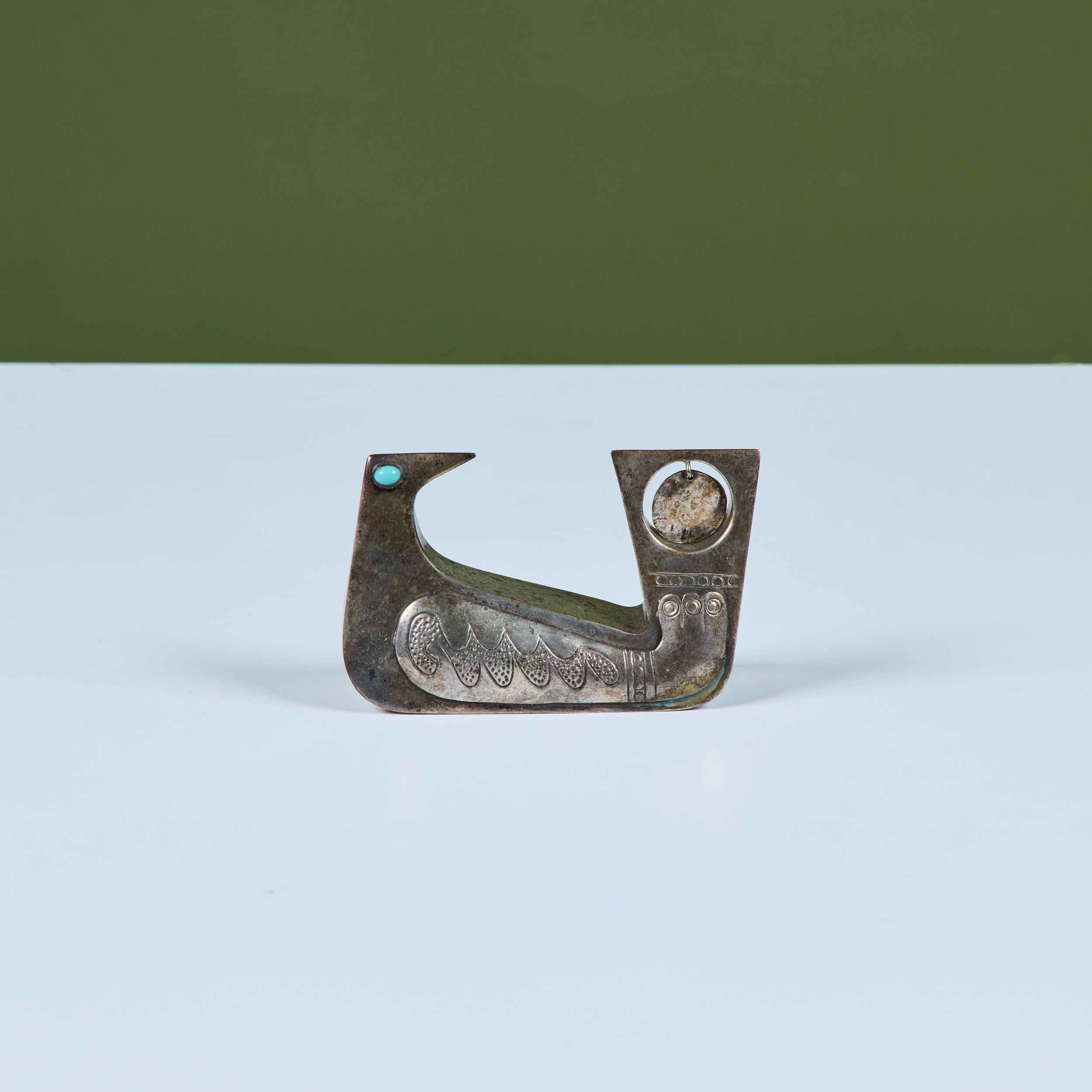 Silver bird sculpture by Ecuadoran silversmith, Joaquin Taller Tinta, c.1960s, Ecuador. This piece features a seated bird sculpture with cabochon Turquoise eyes and incised details along the wing and tail. The tail showcases a round cutout with a silver charm.