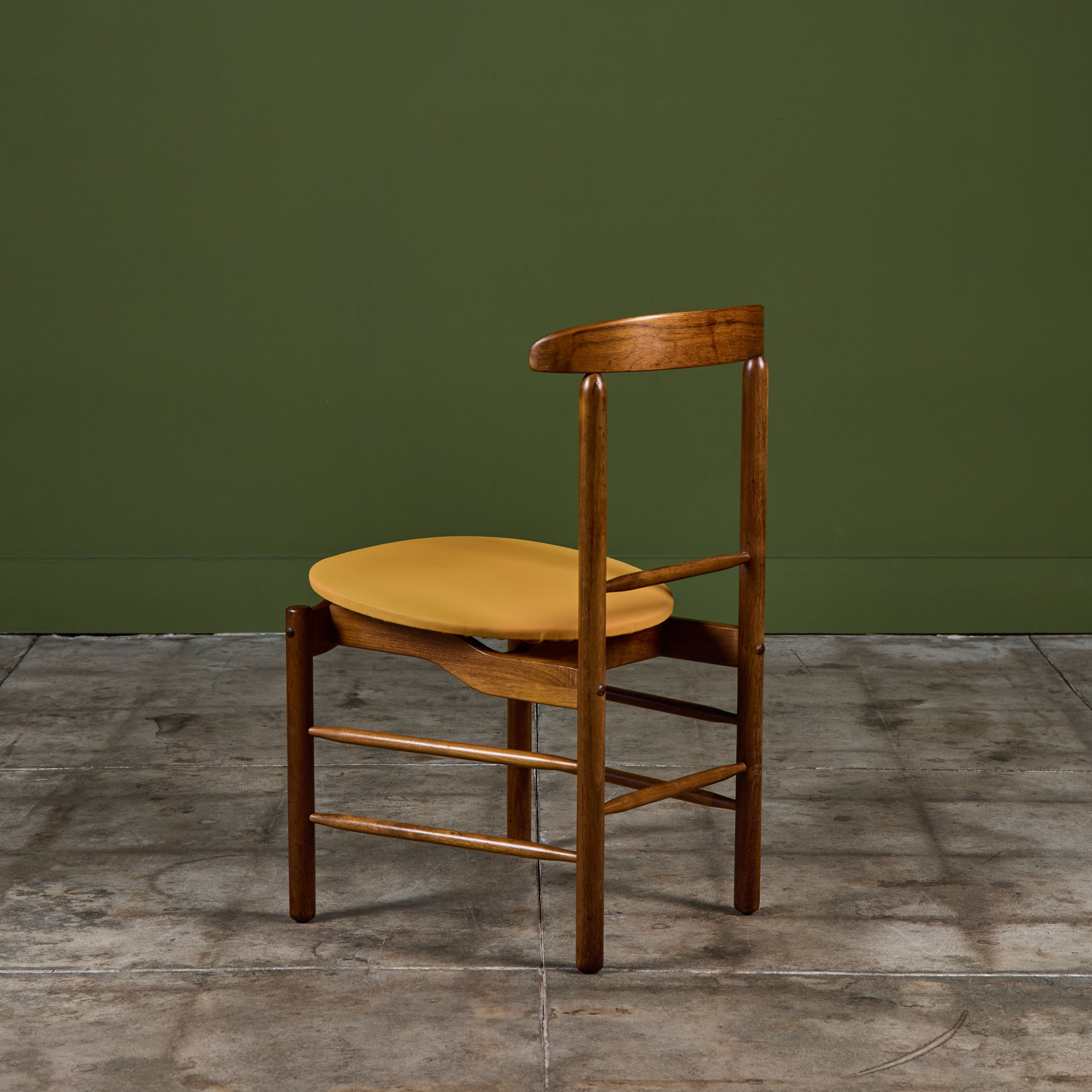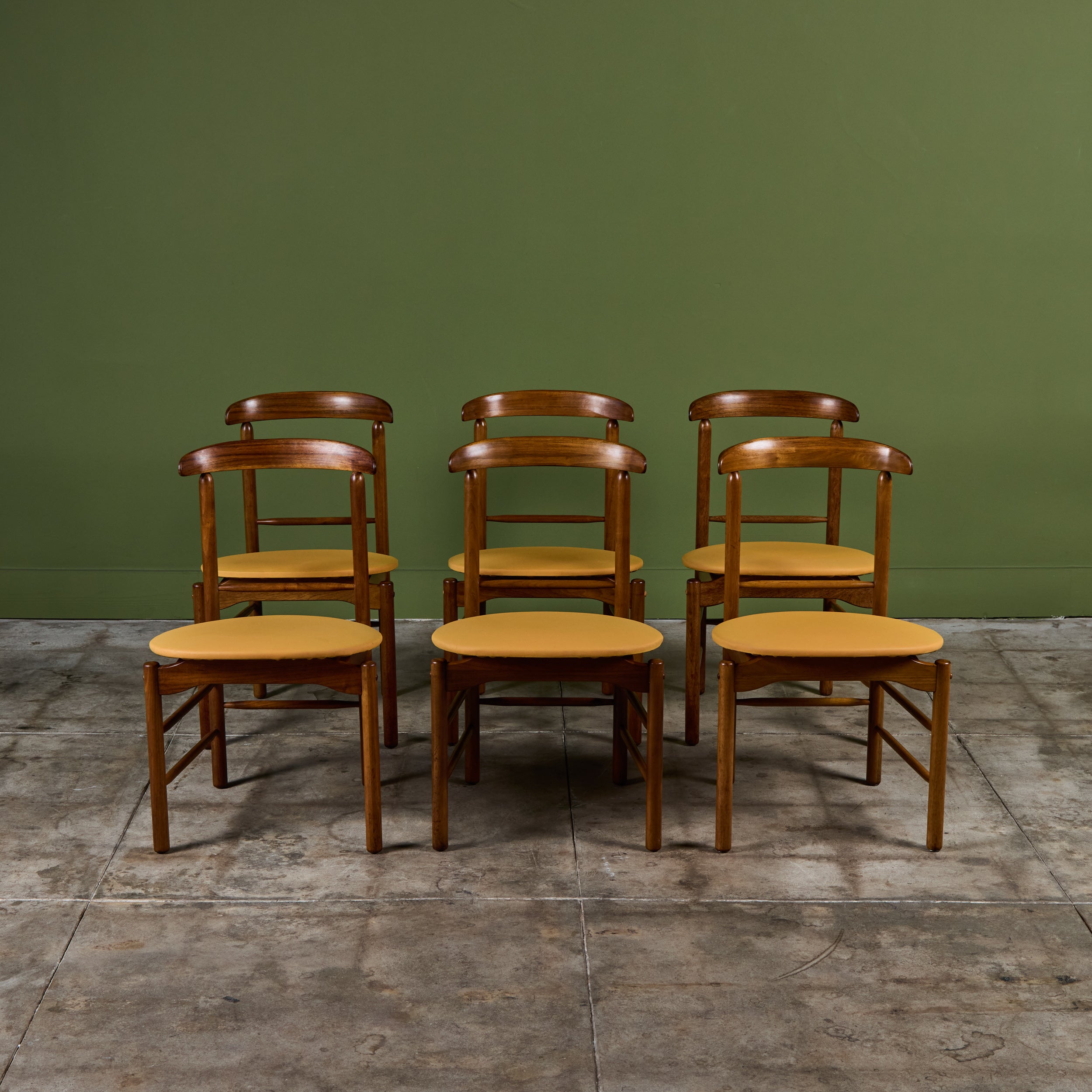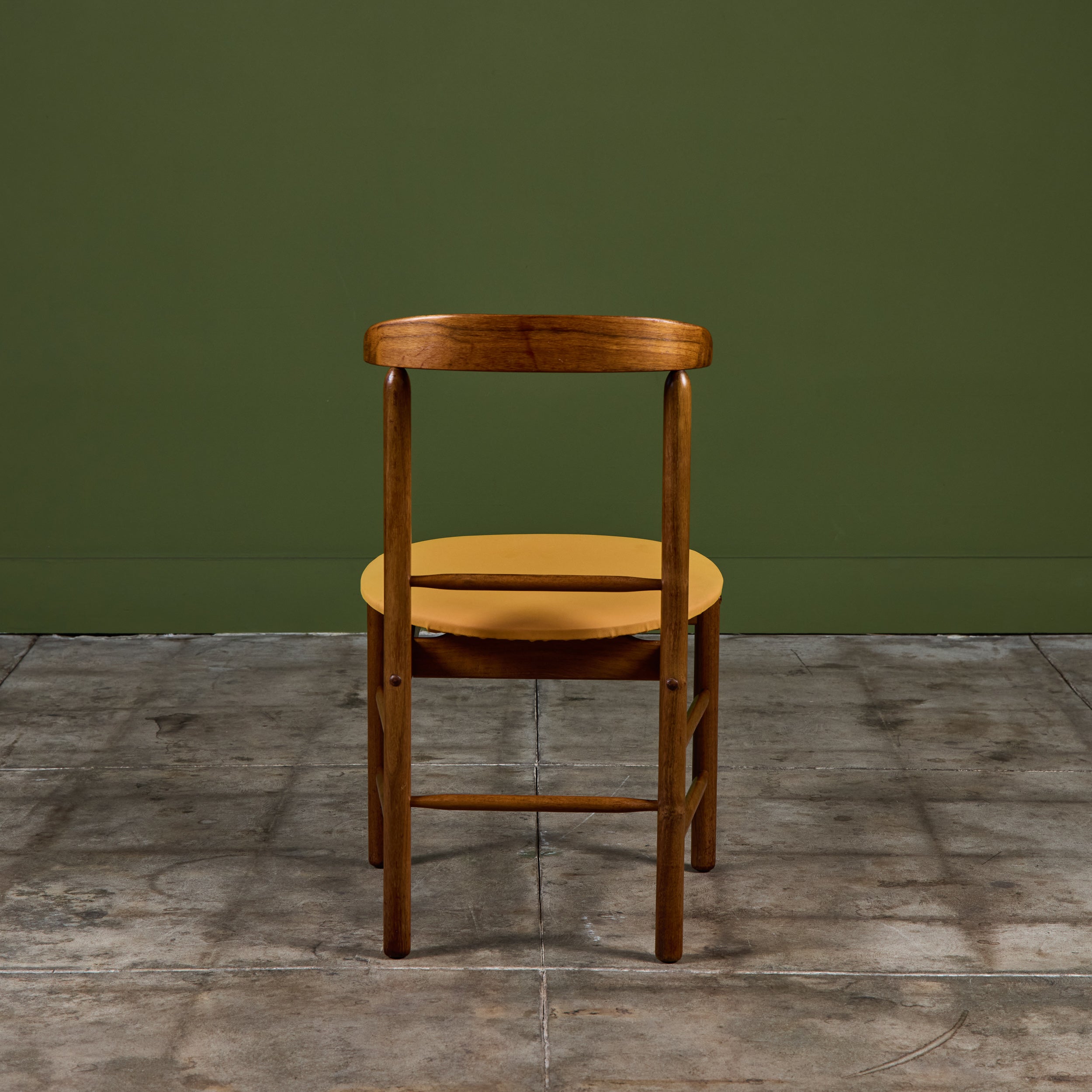 Set of six dining chairs by Greta M. Grossman for Glenn of California, c.1956, USA. The chairs feature a solid walnut wood frame with a golden yellow upholstered seat.