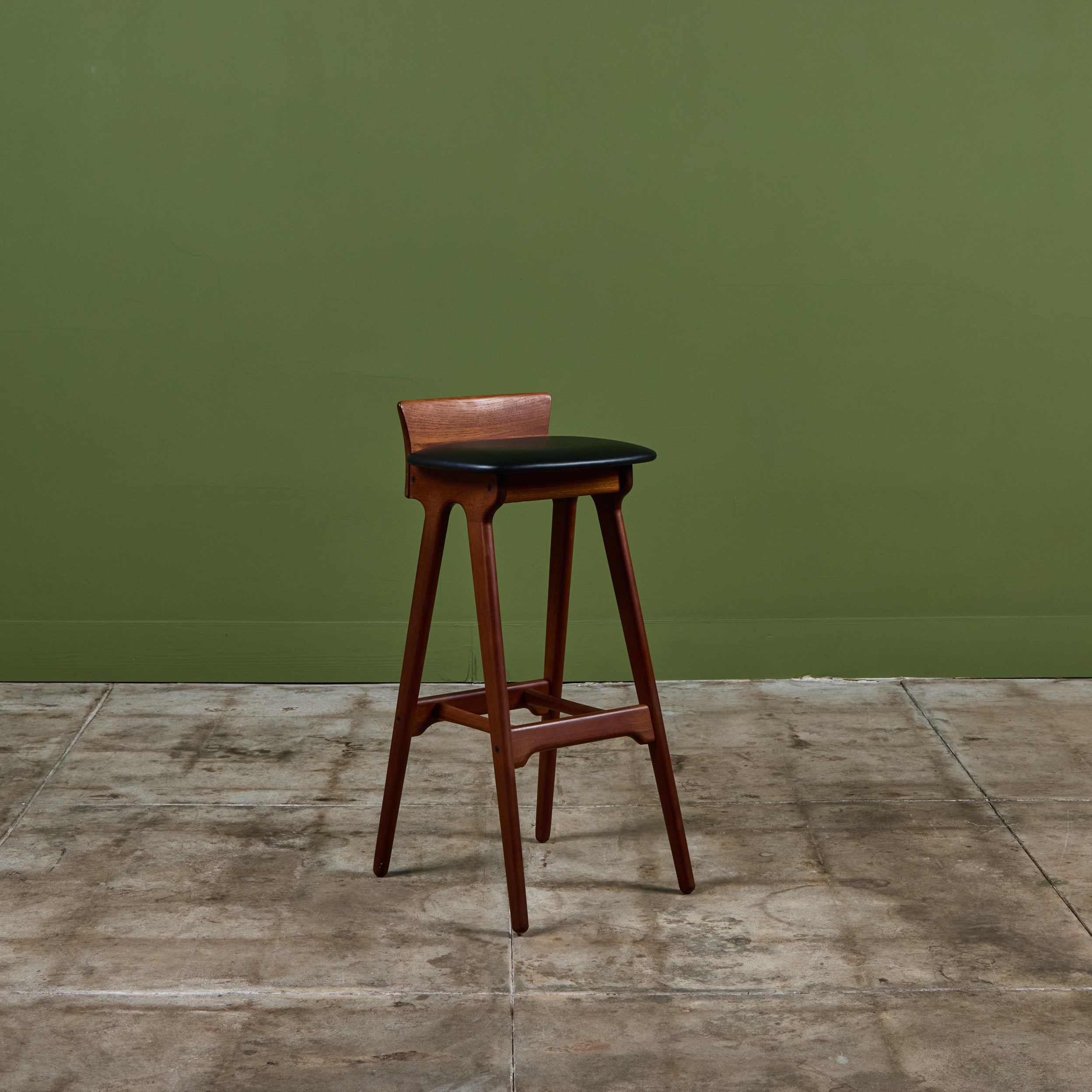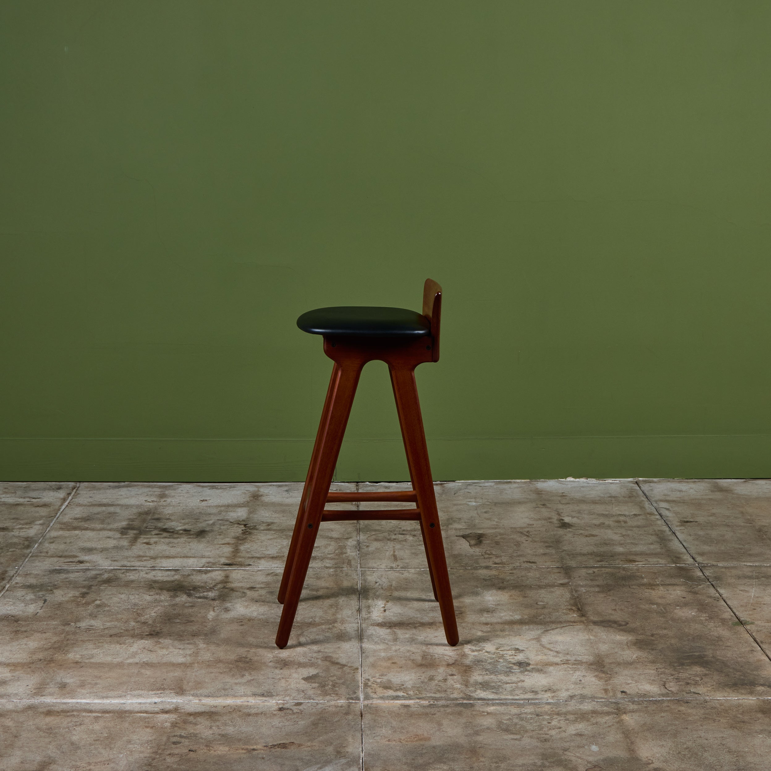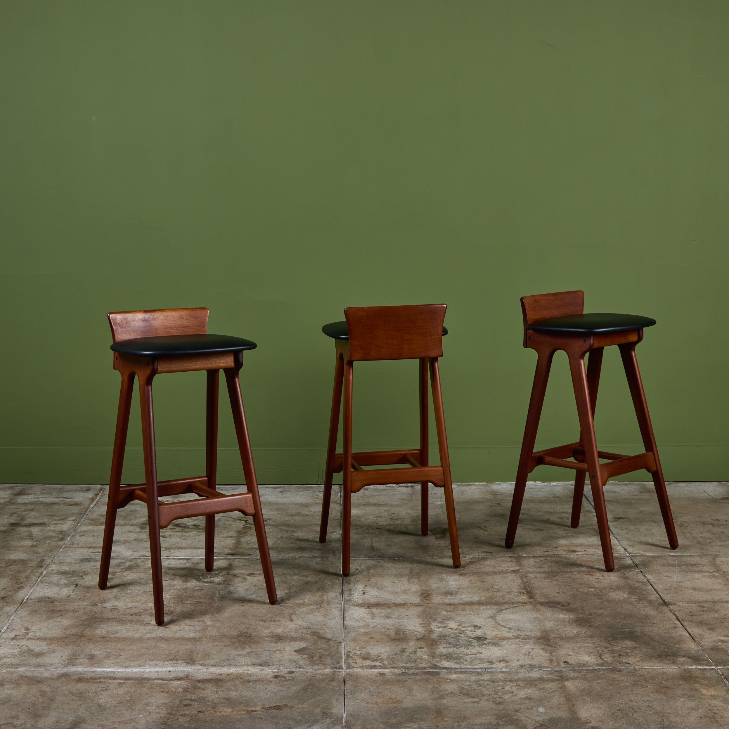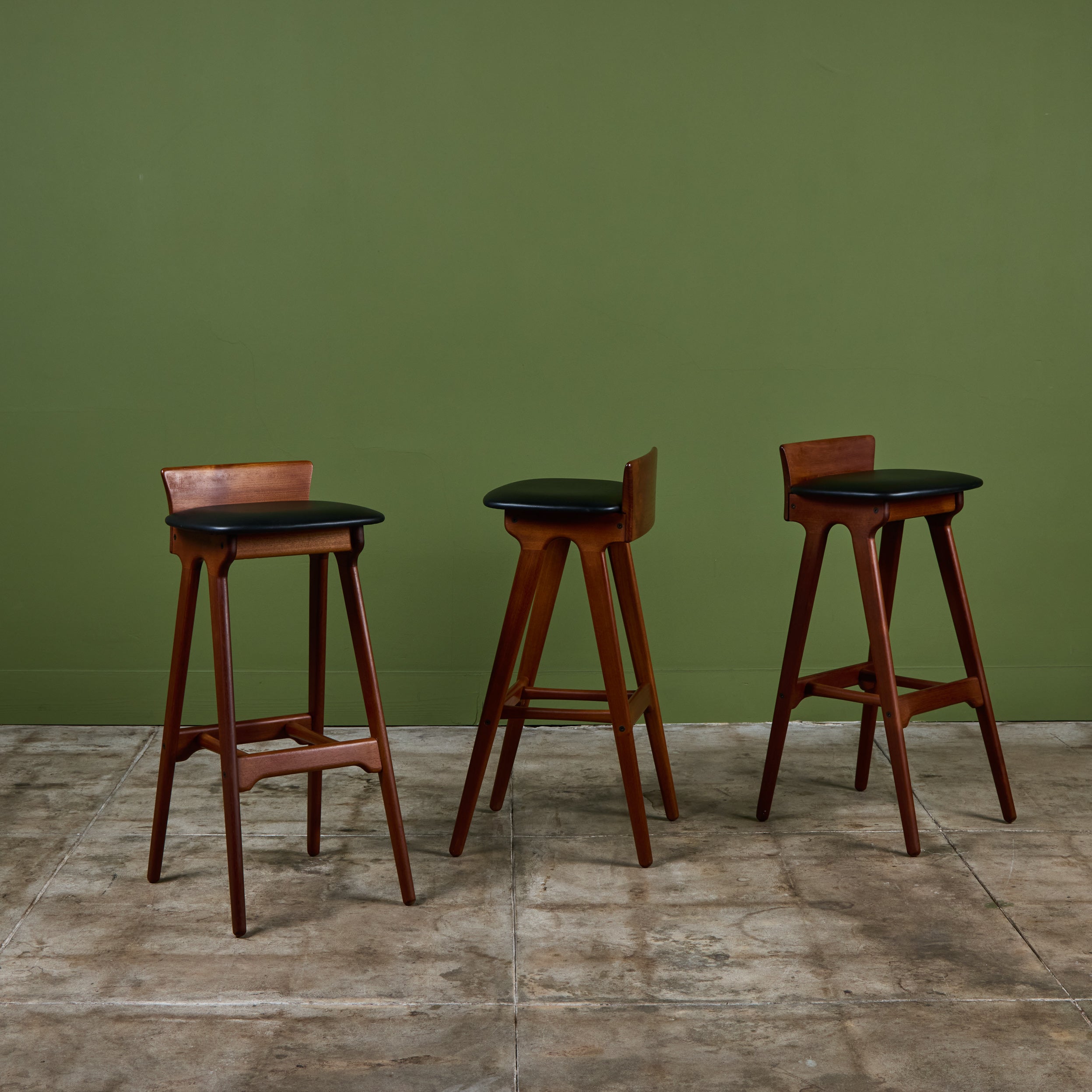 Set of three teak stools by Danish designer Erik Buch for Christian Christiansen Møbelfabrik, c.1960s, Denmark. The stools showcase a teak frame with stout seaback and black naugahyde upholstered seat. Each bar stool has four long splayed legs with a foot bar.