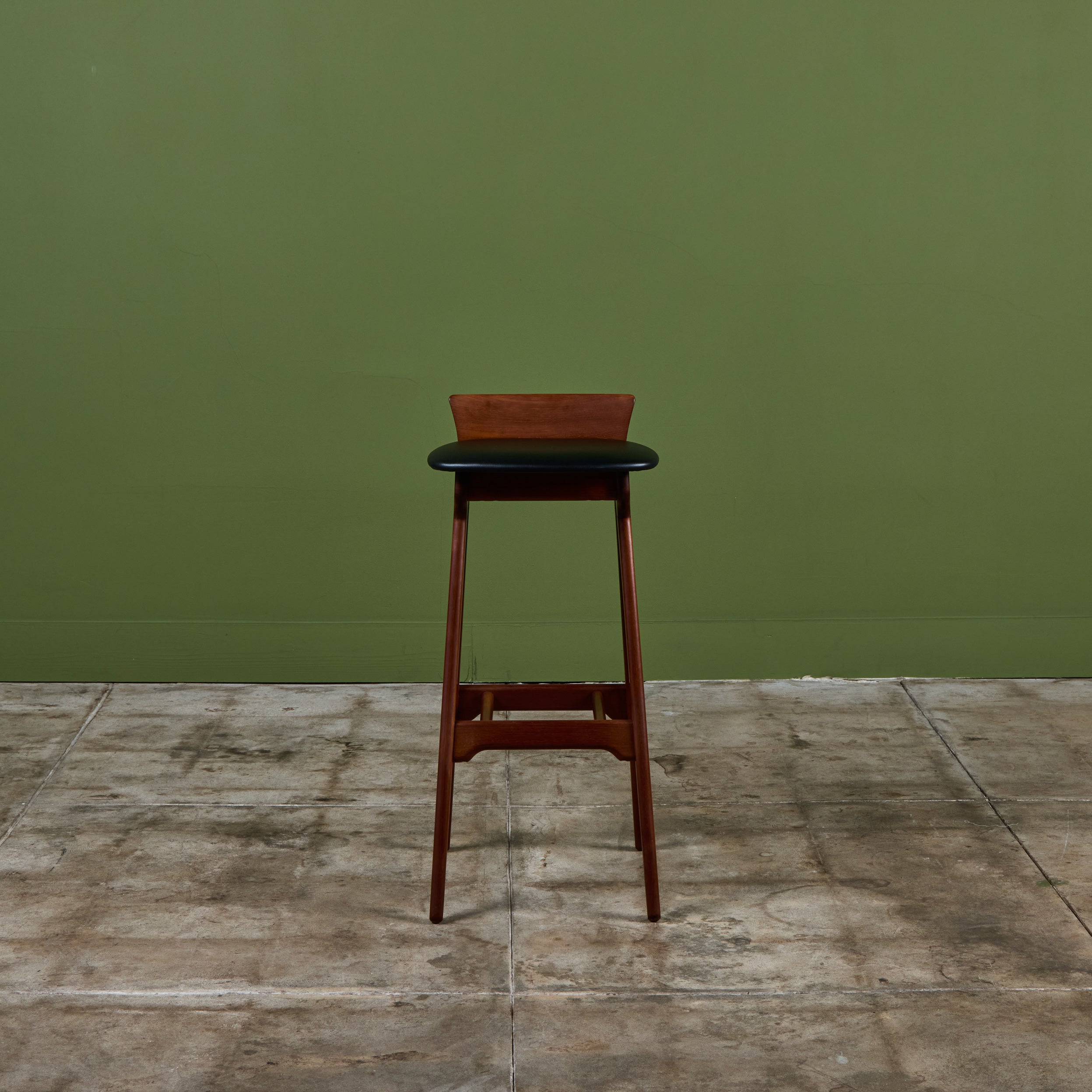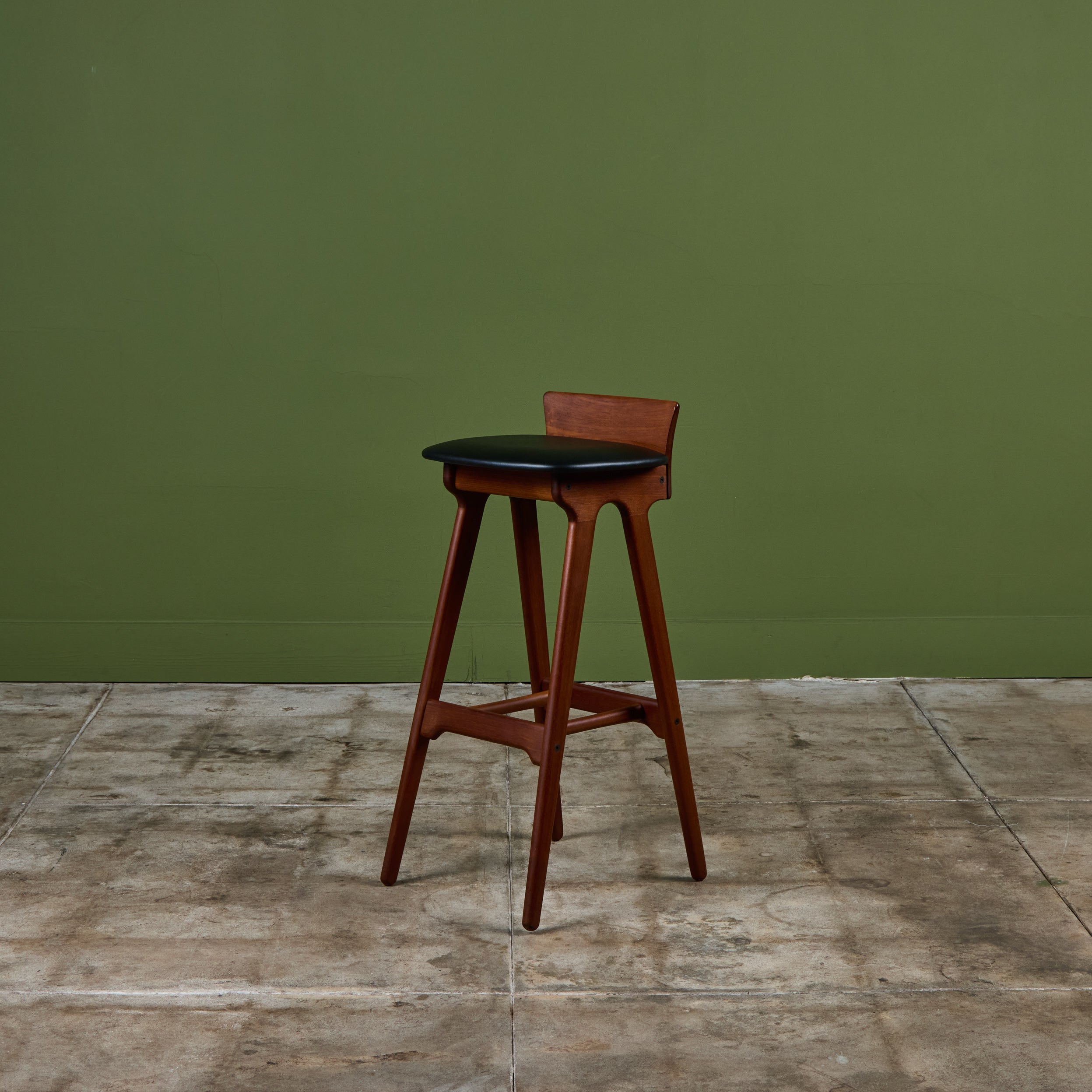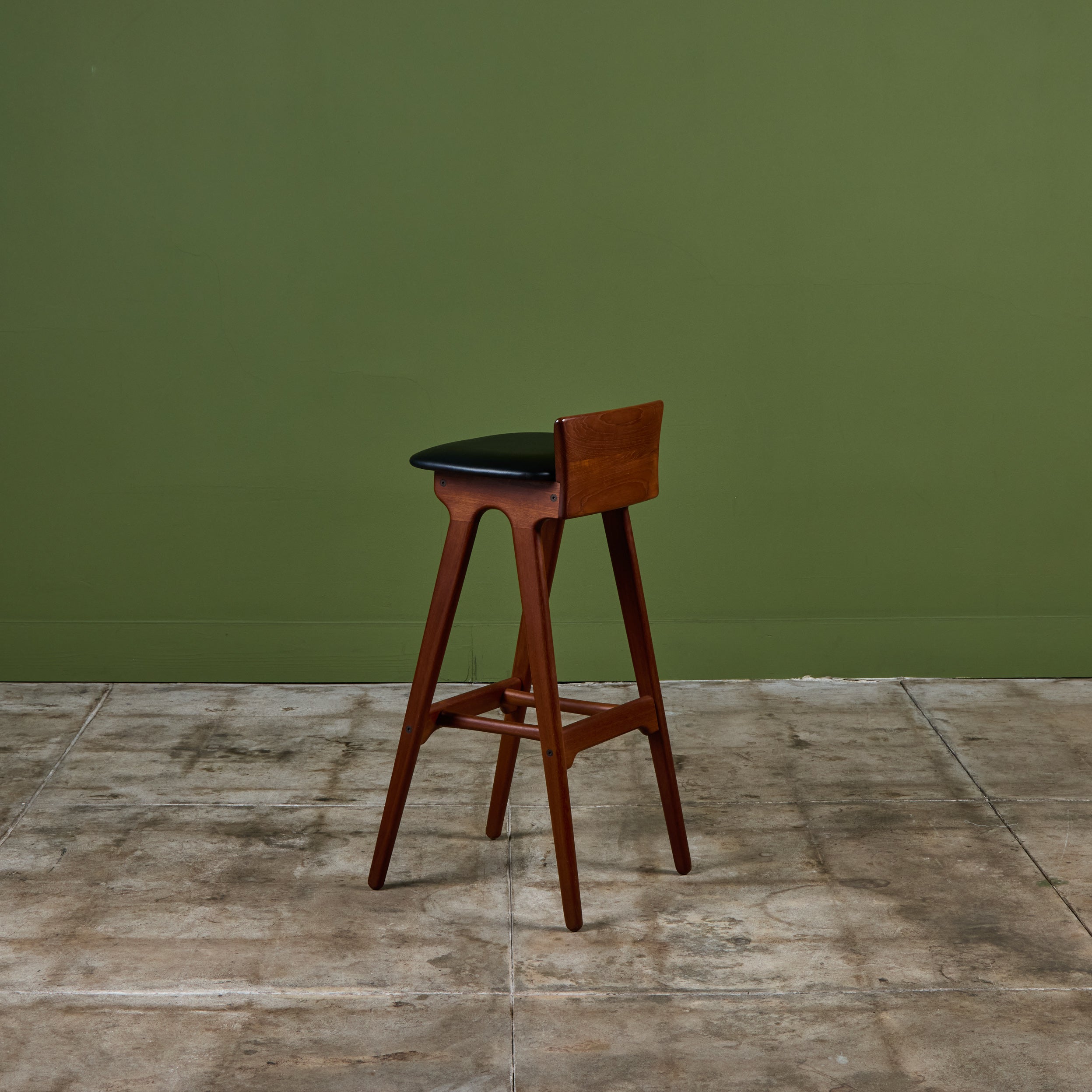 Set of three teak stools by Danish designer Erik Buch for Christian Christiansen Møbelfabrik, c.1960s, Denmark. The stools showcase a teak frame with stout seaback and black naugahyde upholstered seat. Each bar stool has four long splayed legs with a foot bar.