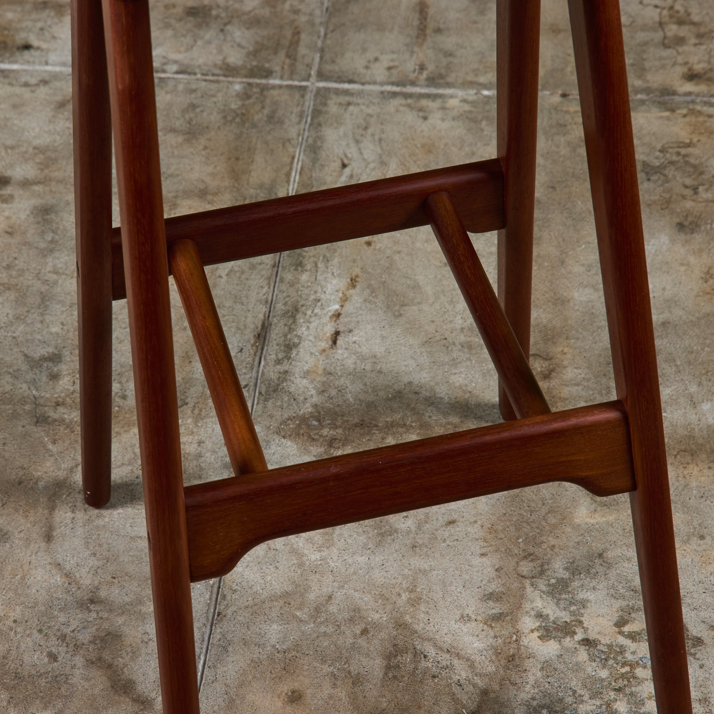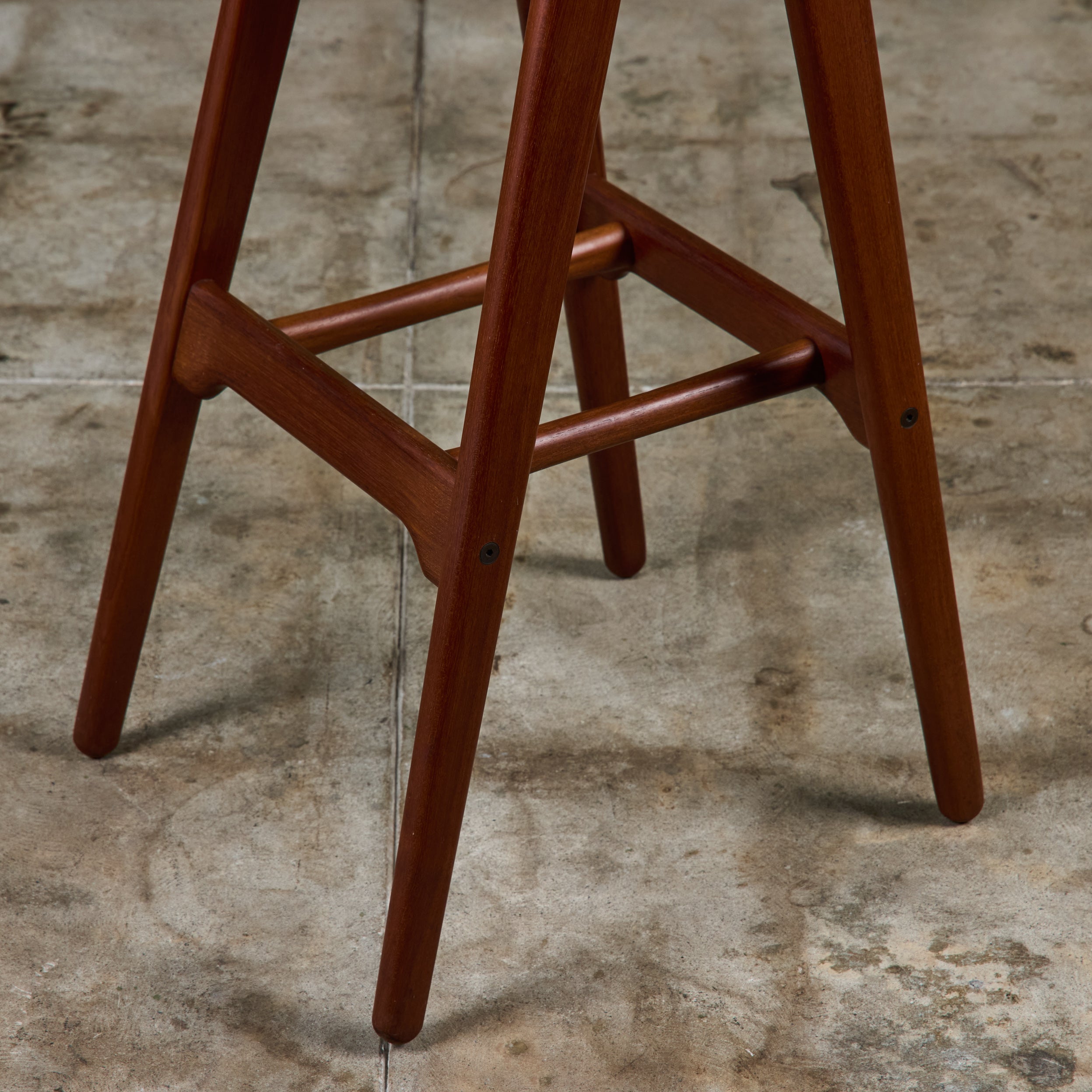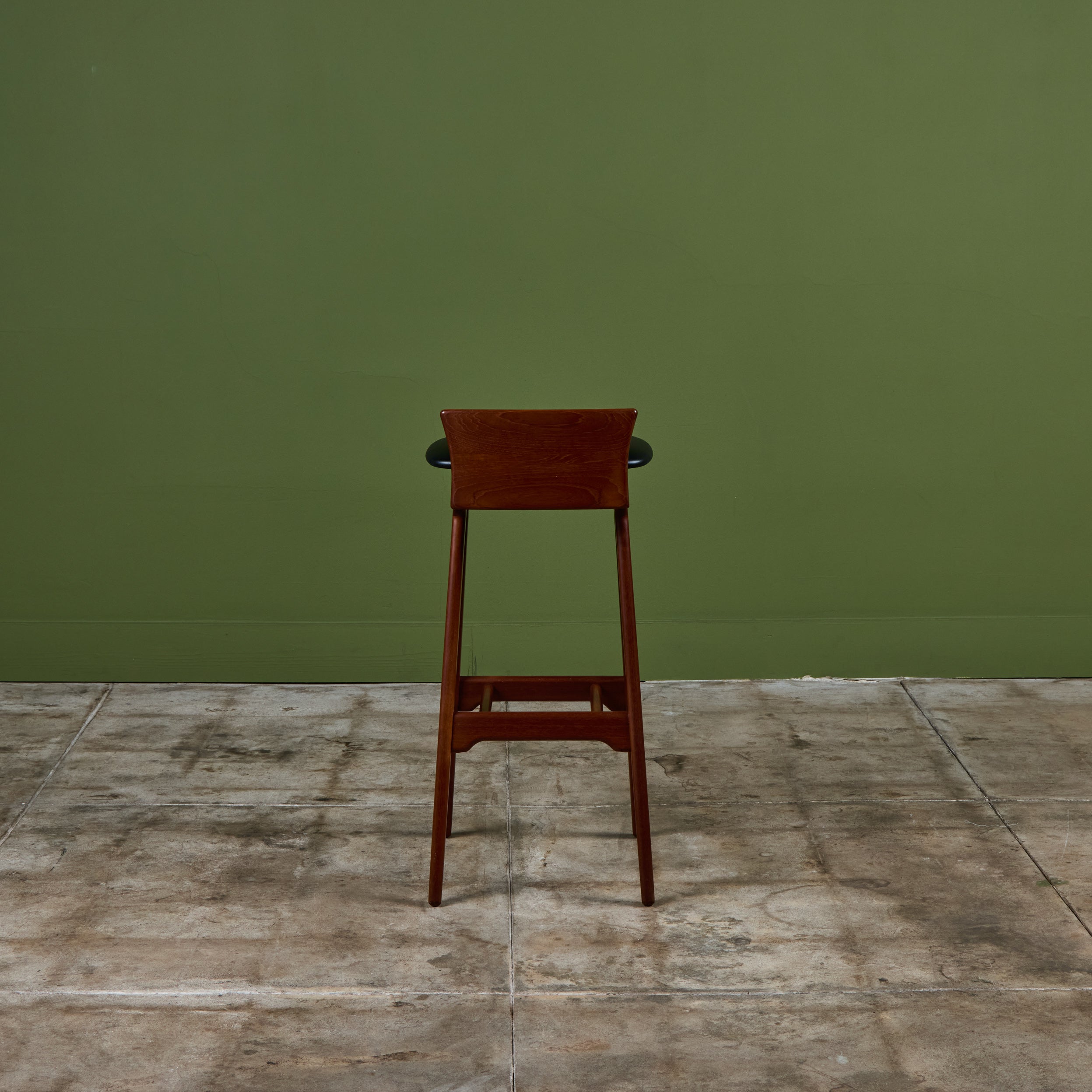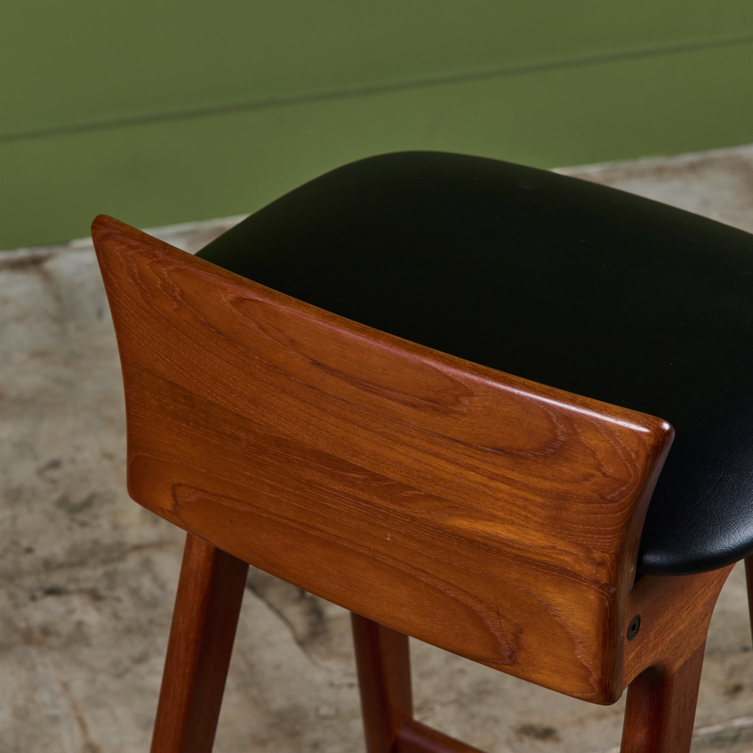 Set of three teak stools by Danish designer Erik Buch for Christian Christiansen Møbelfabrik, c.1960s, Denmark. The stools showcase a teak frame with stout seaback and black naugahyde upholstered seat. Each bar stool has four long splayed legs with a foot bar.