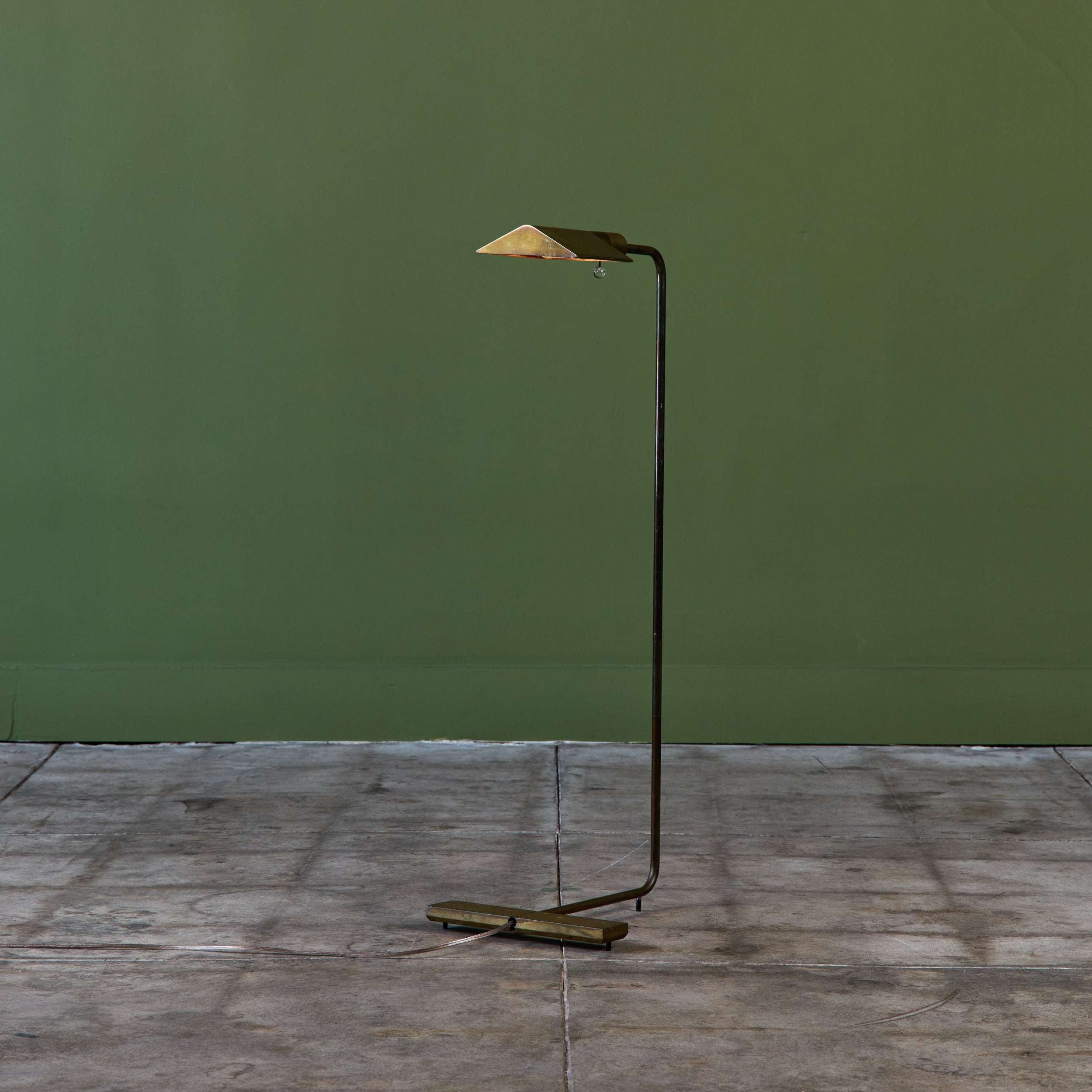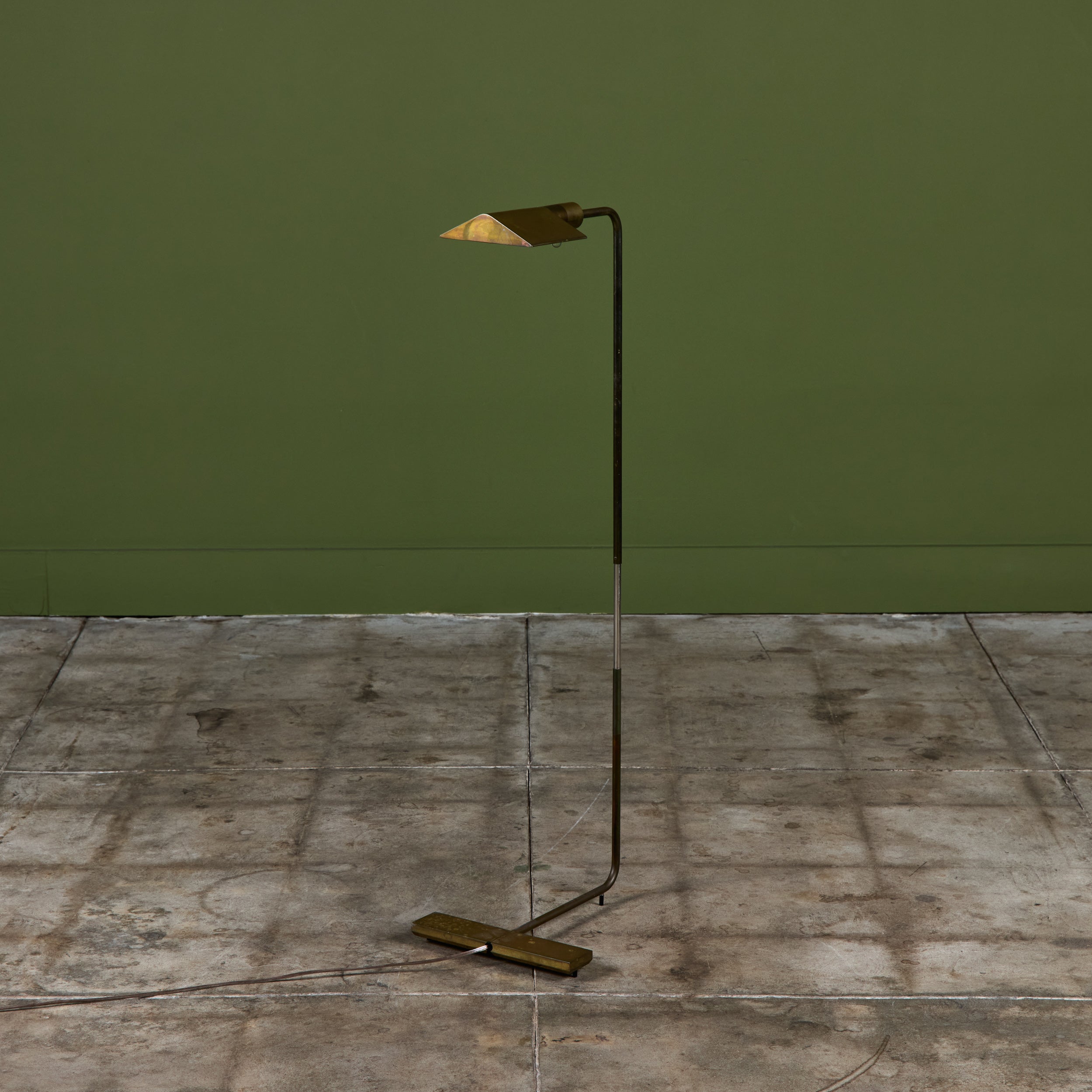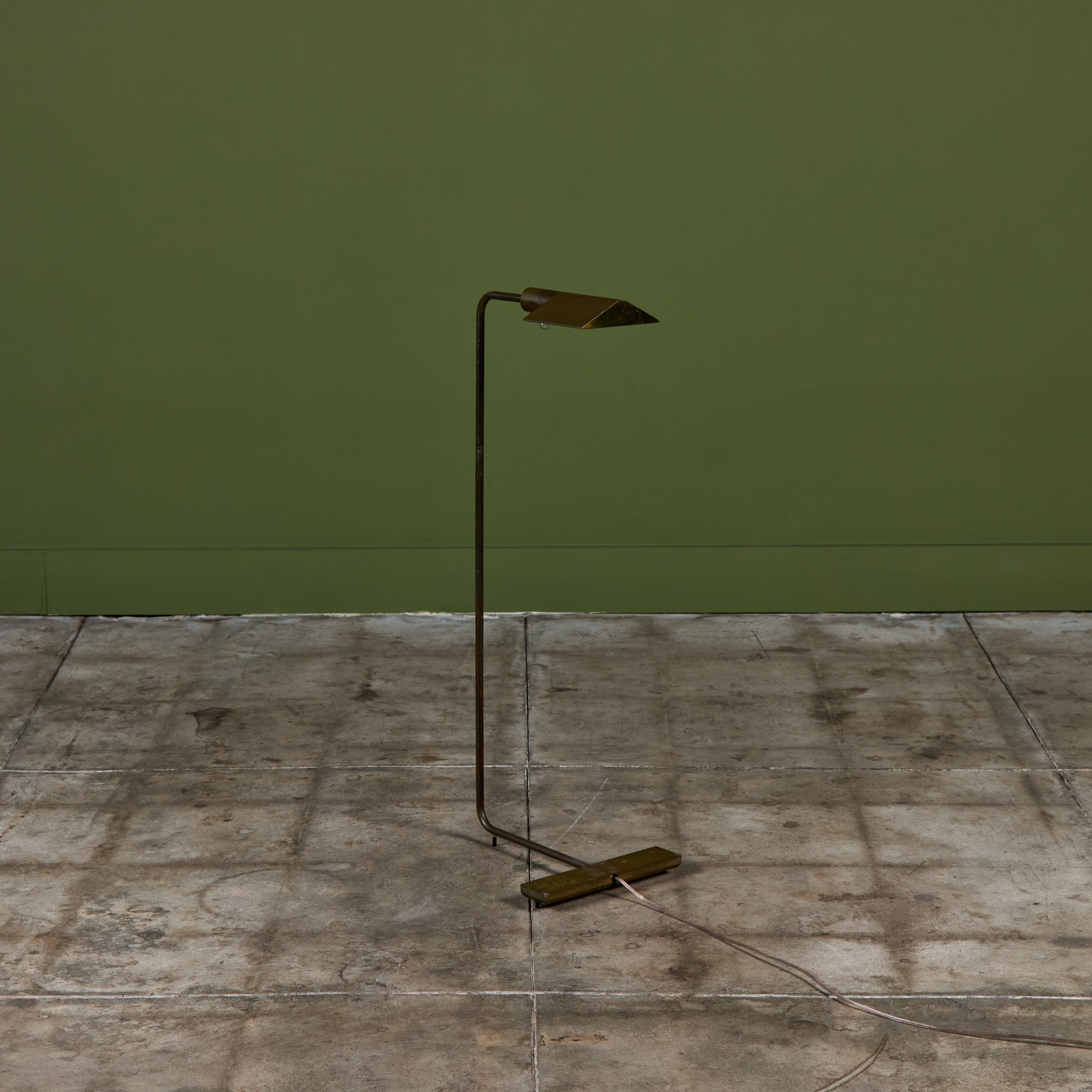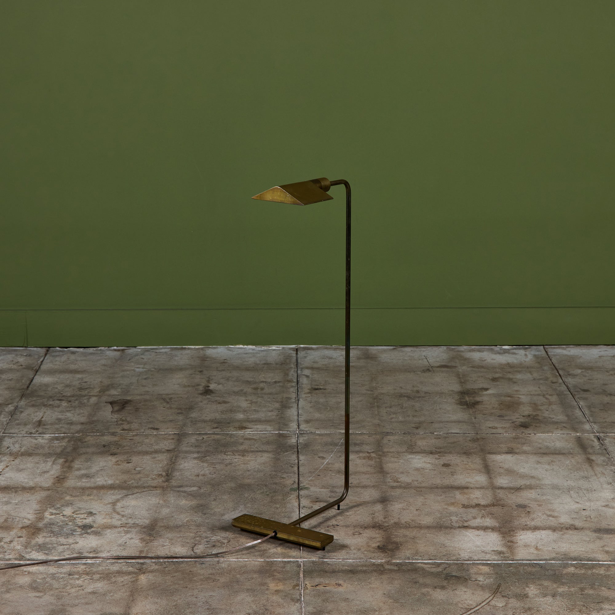 Designed in the 1970s, this brass floor lamp by Cedric Hartman is an enduring design classic. The modernist floor lamp features a triangular brass shade attached to a curved brass stem that offer focused task lighting. The arched pole terminates into a heavy brass t-base. Discreet legs allow the lamp to “hover” just above the floor, exaggerating the counterweighted arc of the central support. Underside of the lamp is signed with its serial number.