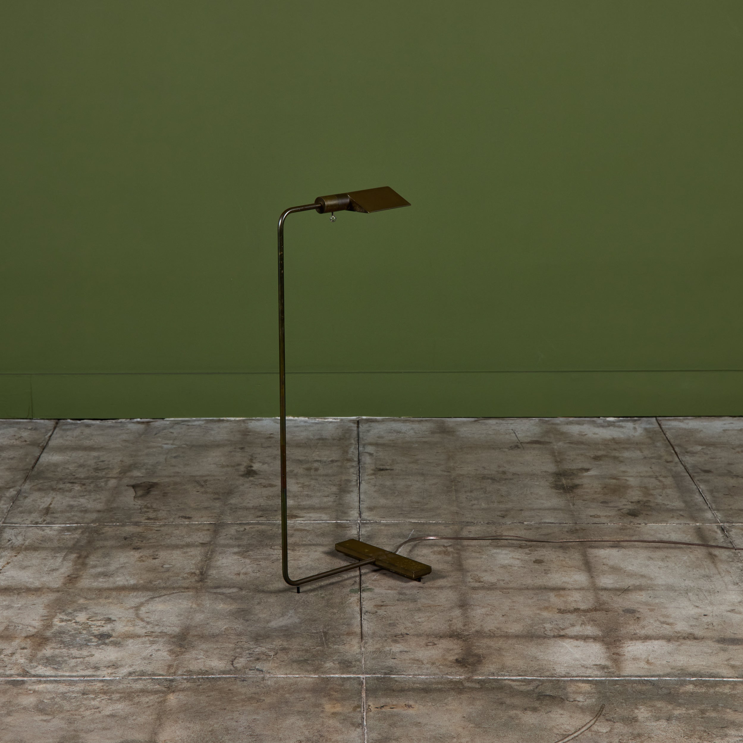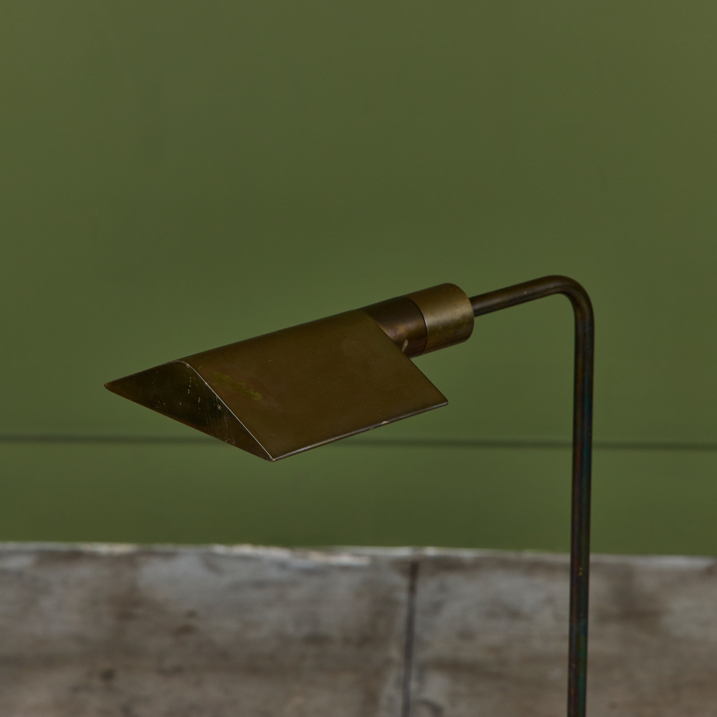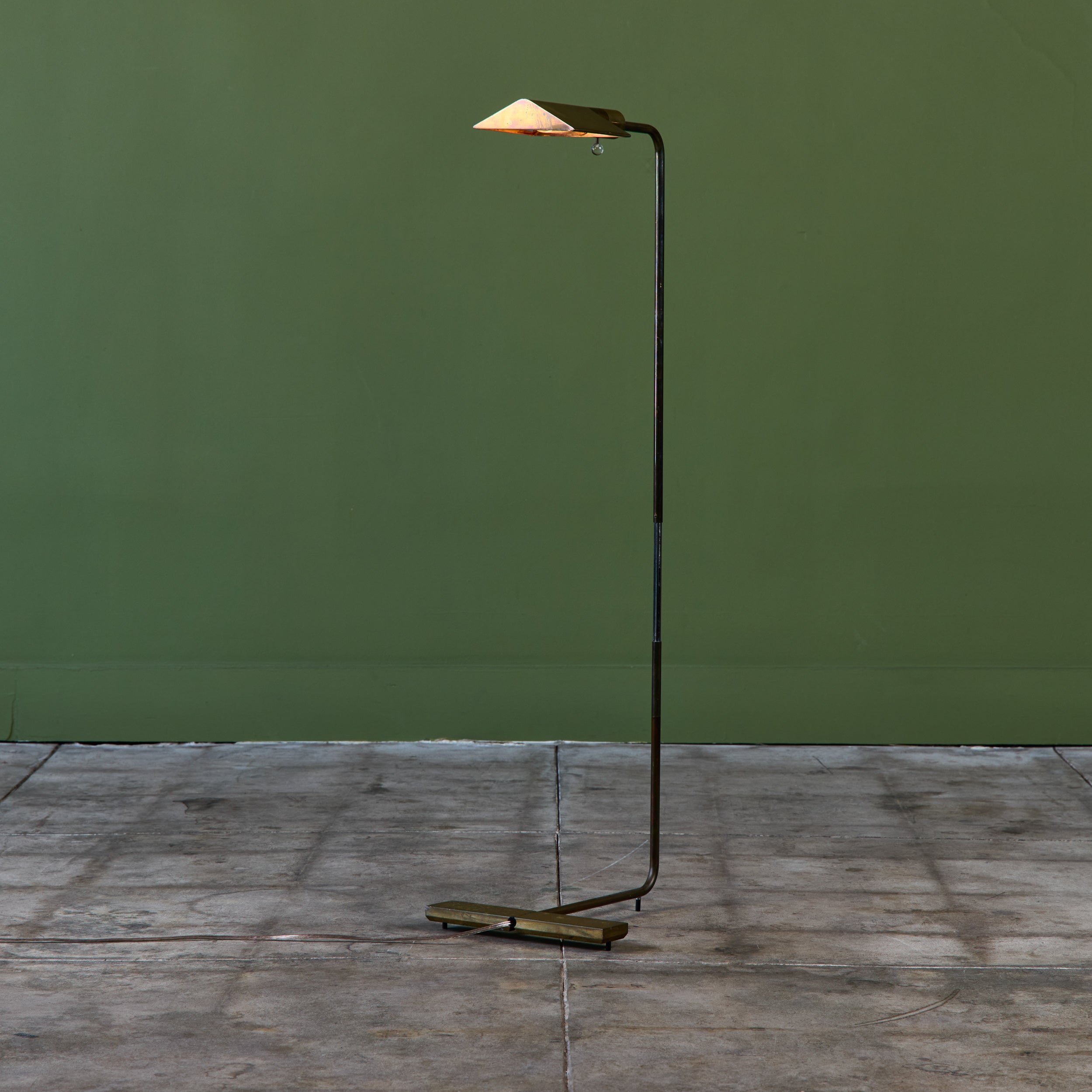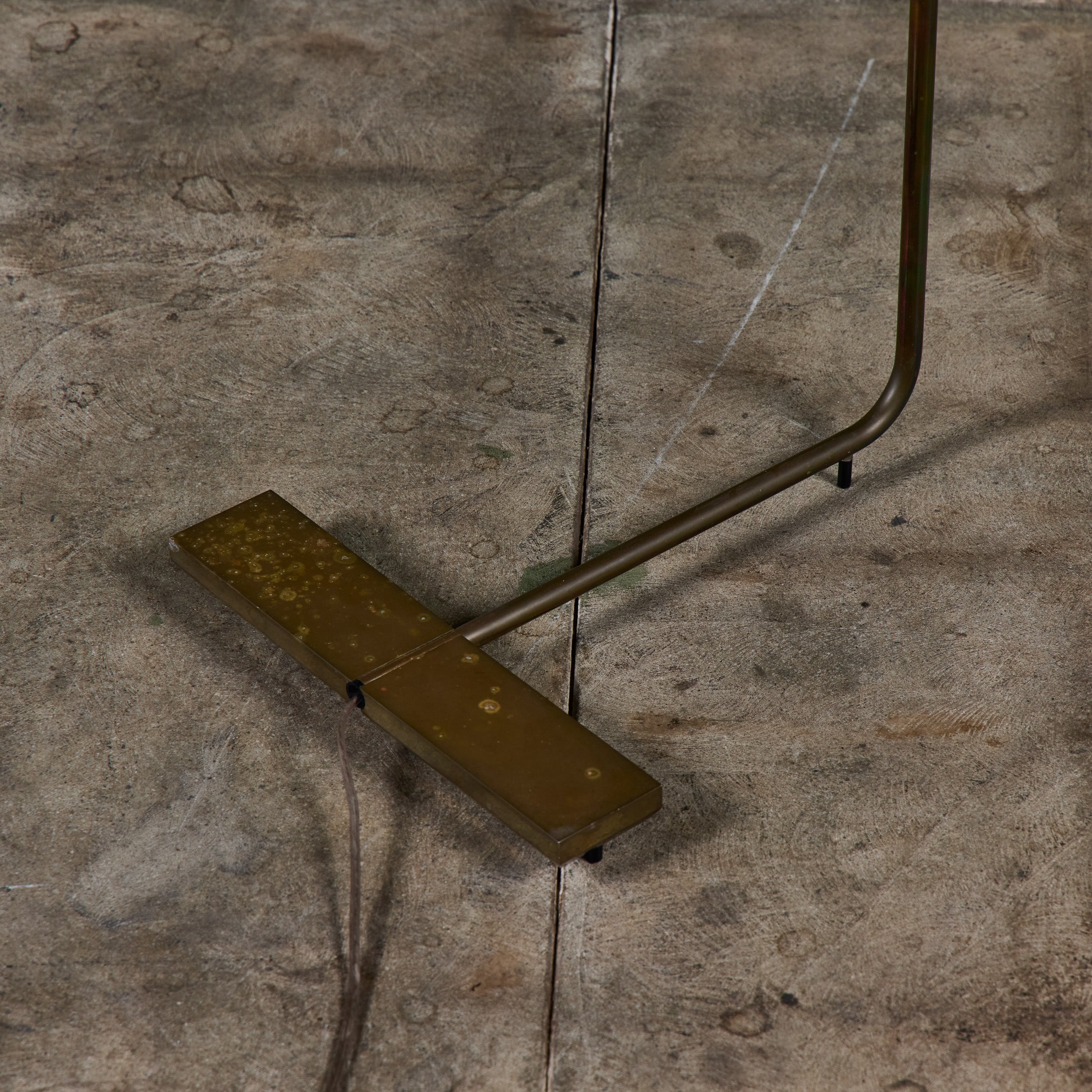 Designed in the 1970s, this brass floor lamp by Cedric Hartman is an enduring design classic. The modernist floor lamp features a triangular brass shade attached to a curved brass stem that offer focused task lighting. The arched pole terminates into a heavy brass t-base. Discreet legs allow the lamp to “hover” just above the floor, exaggerating the counterweighted arc of the central support. Underside of the lamp is signed with its serial number.