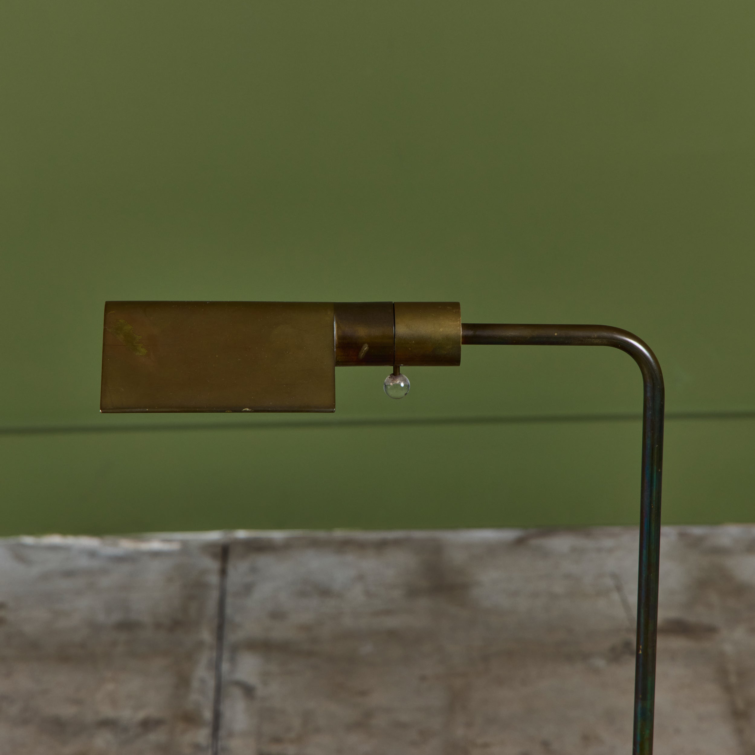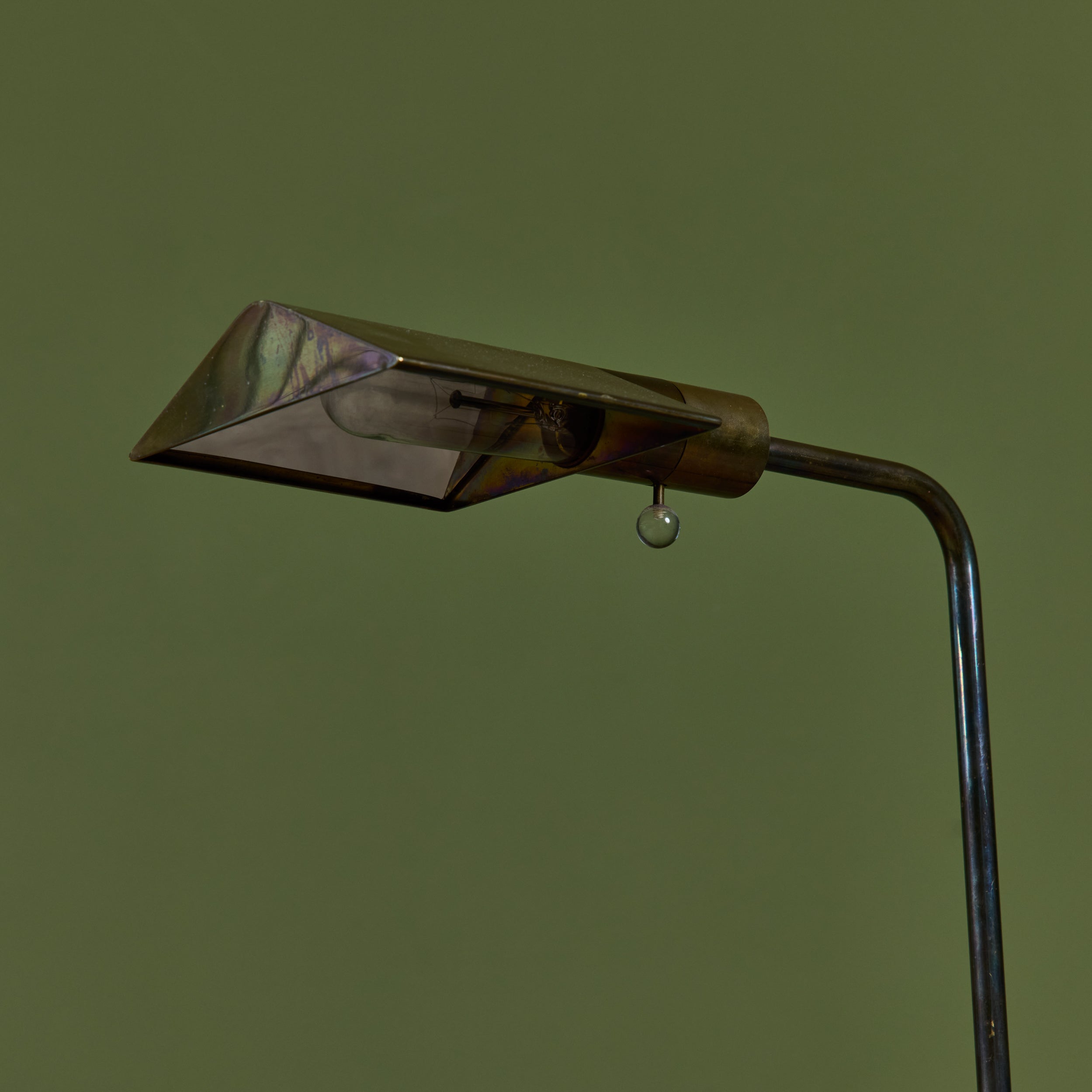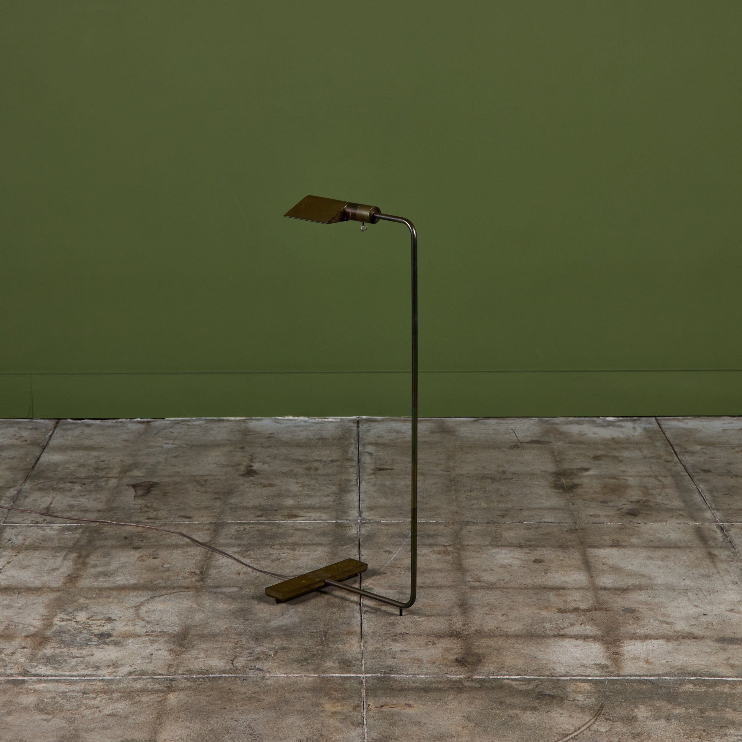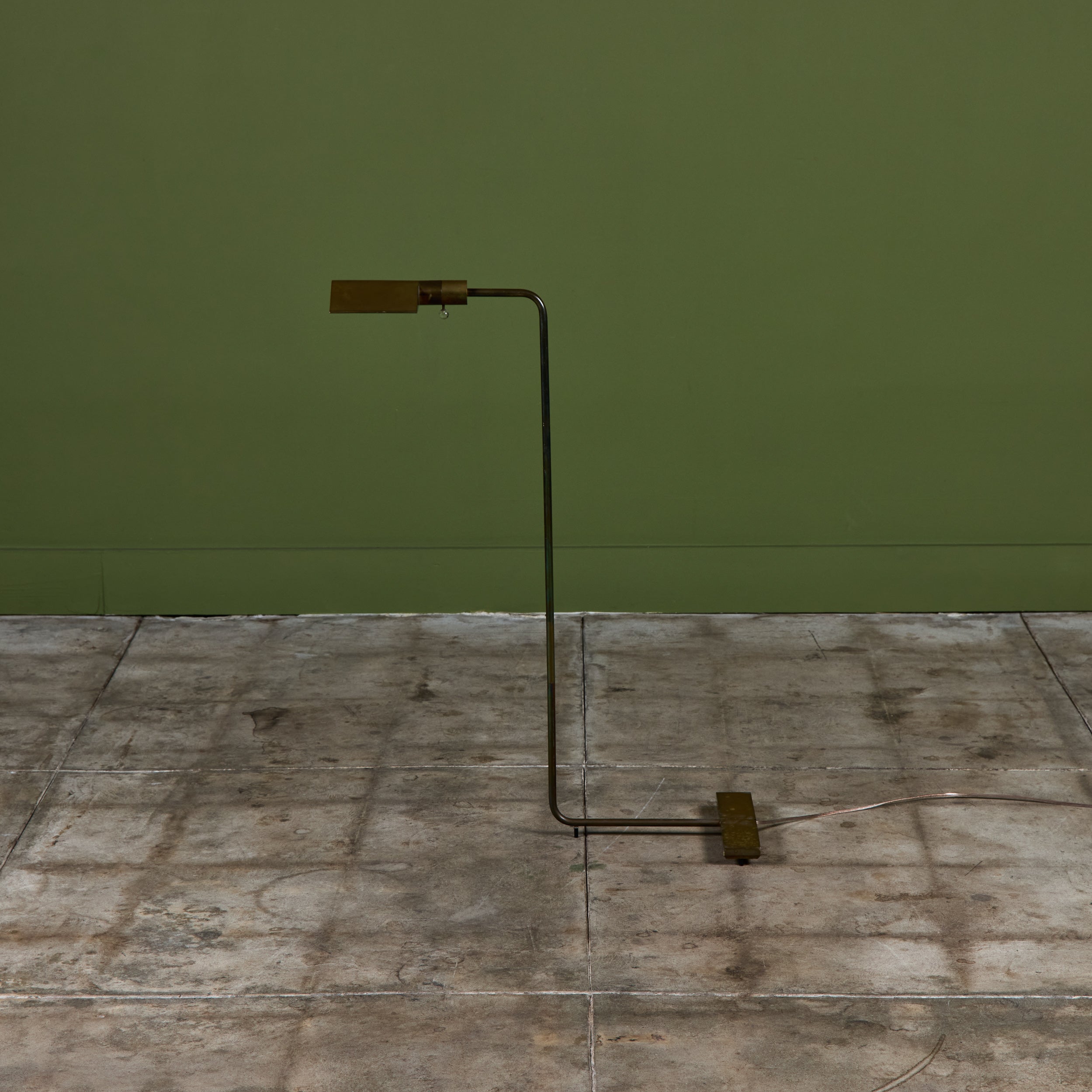 Designed in the 1970s, this brass floor lamp by Cedric Hartman is an enduring design classic. The modernist floor lamp features a triangular brass shade attached to a curved brass stem that offer focused task lighting. The arched pole terminates into a heavy brass t-base. Discreet legs allow the lamp to “hover” just above the floor, exaggerating the counterweighted arc of the central support. Underside of the lamp is signed with its serial number.